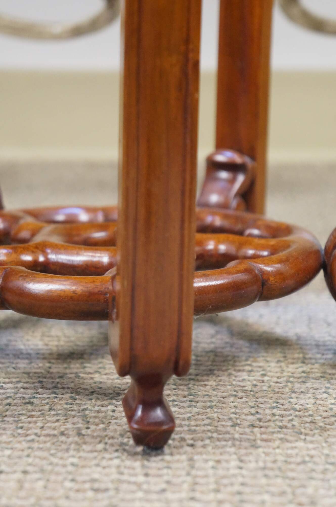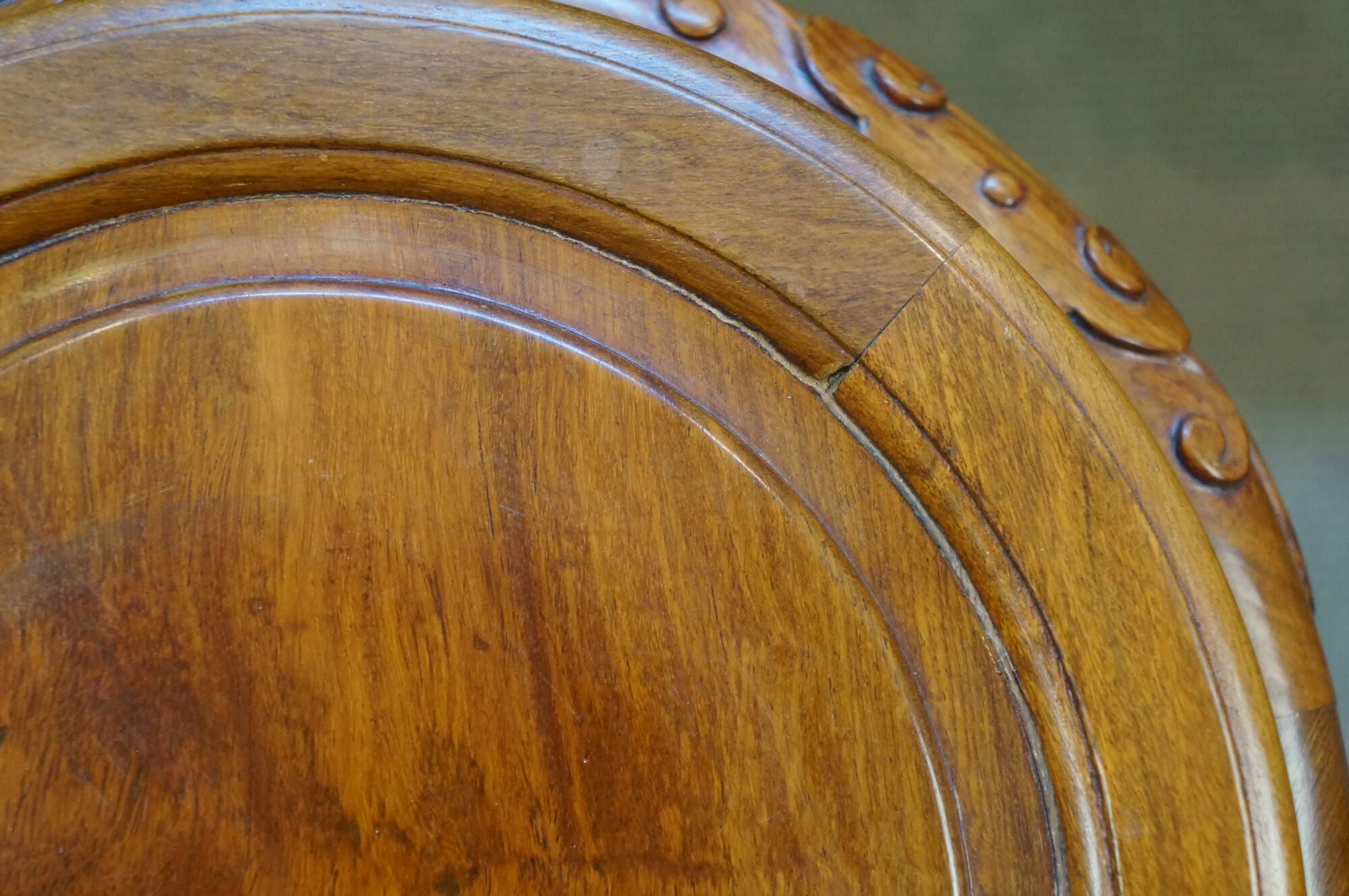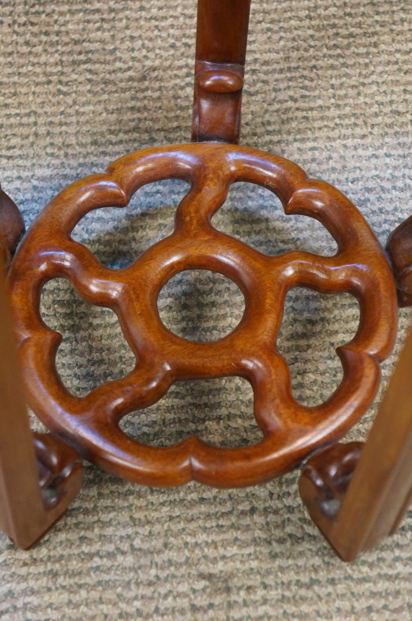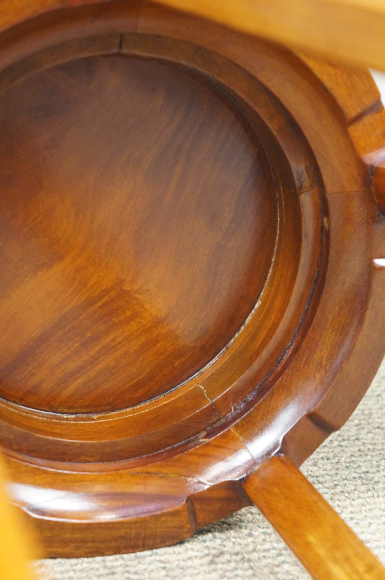 Vintage 20th century carved wooden Chinese plant stand / sculpture / statue pedestal. Round top trimmed with cloud shaped carvings around the upper edge and sun shaped medallion stretcher at the base.