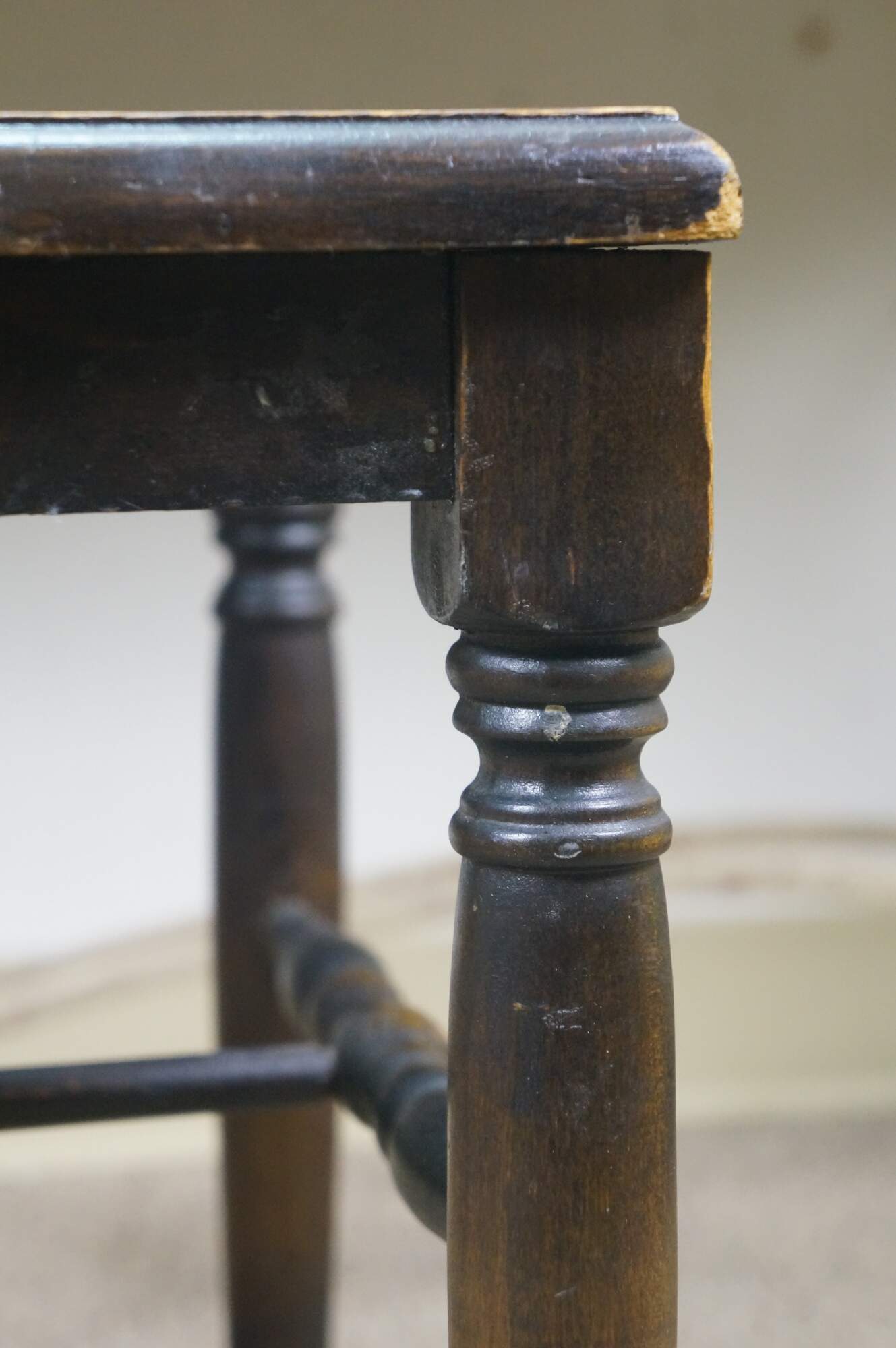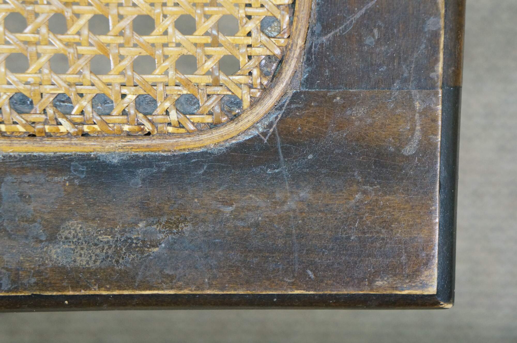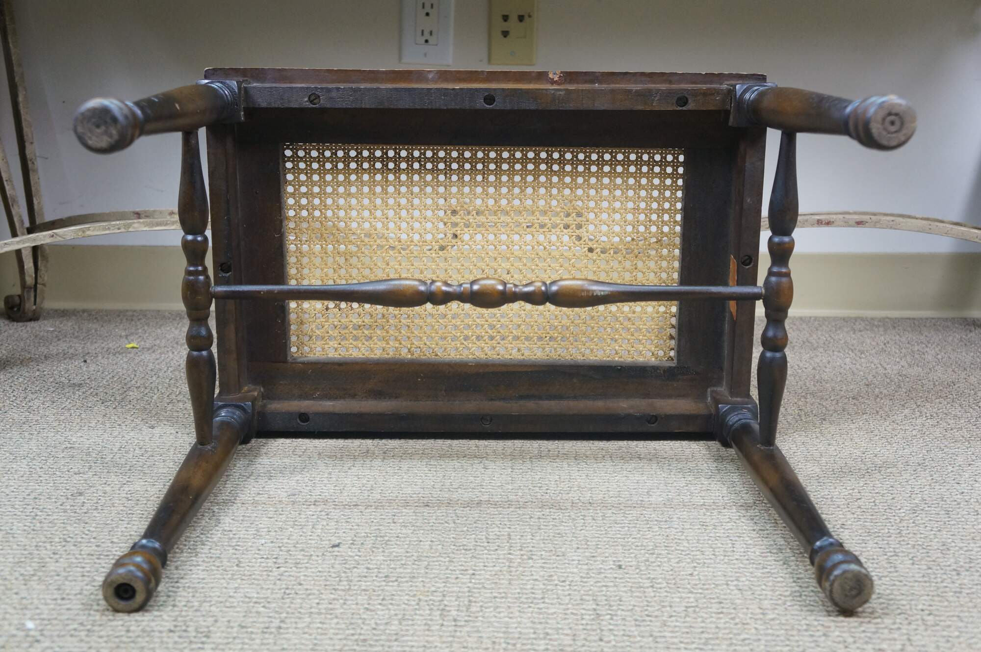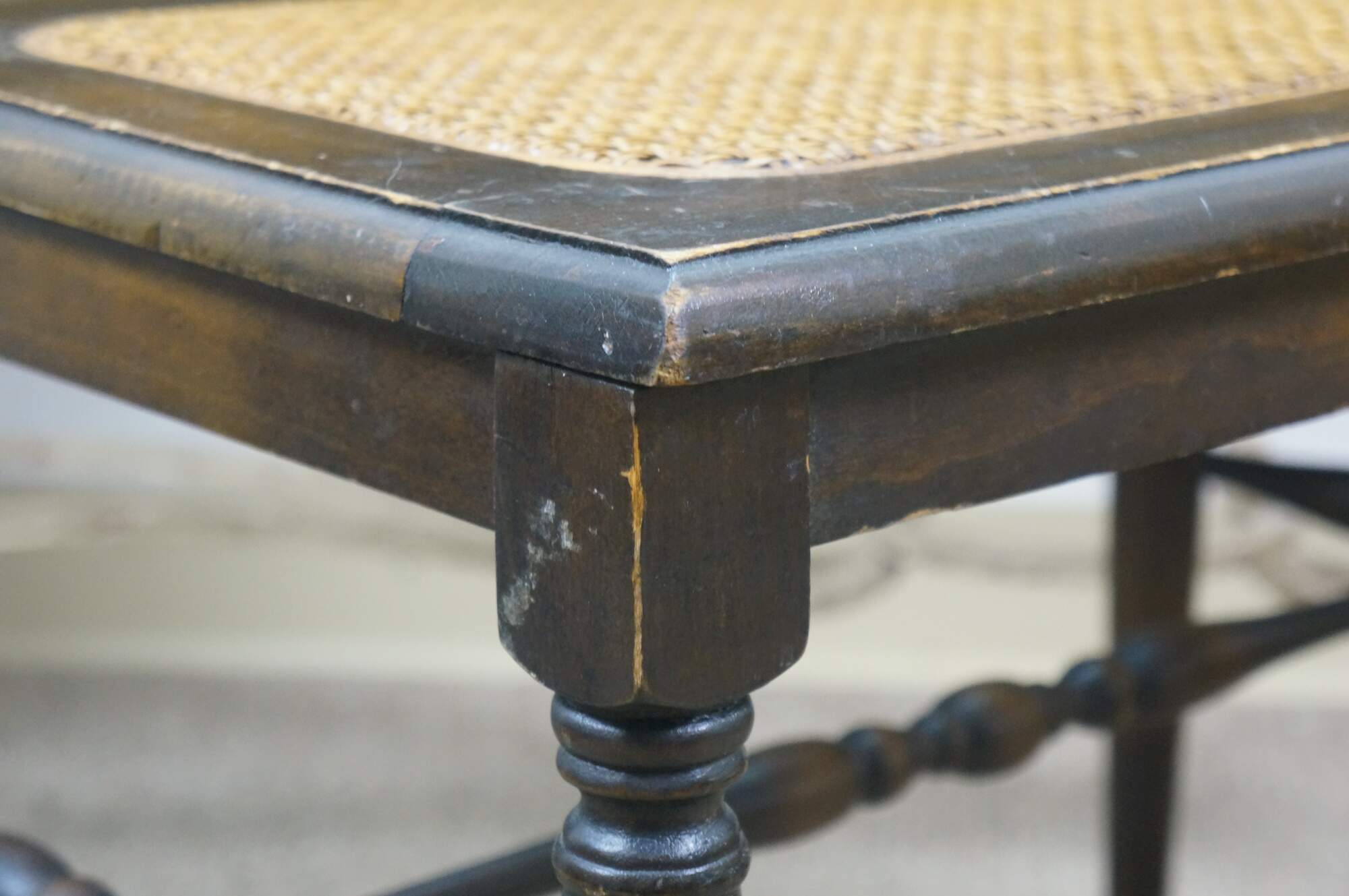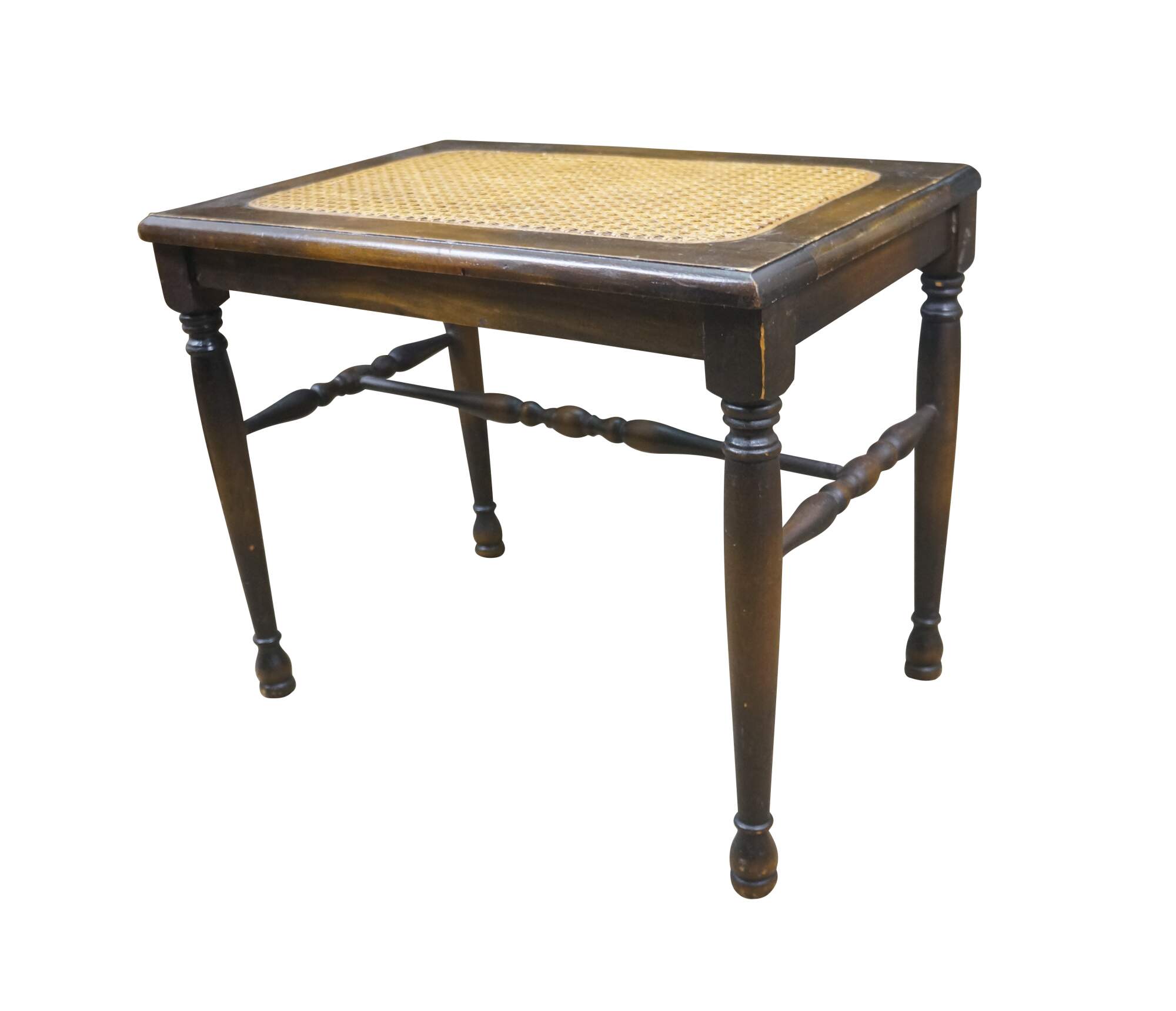 Circa mid 20th century hardwood piano / vanity bench / stool - rectangular form with turned legs and stretcher with caned seat.