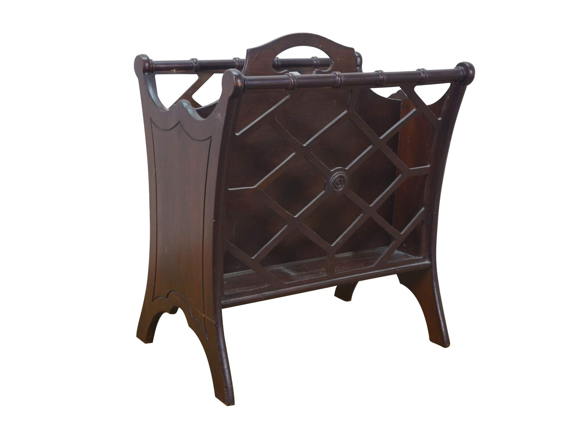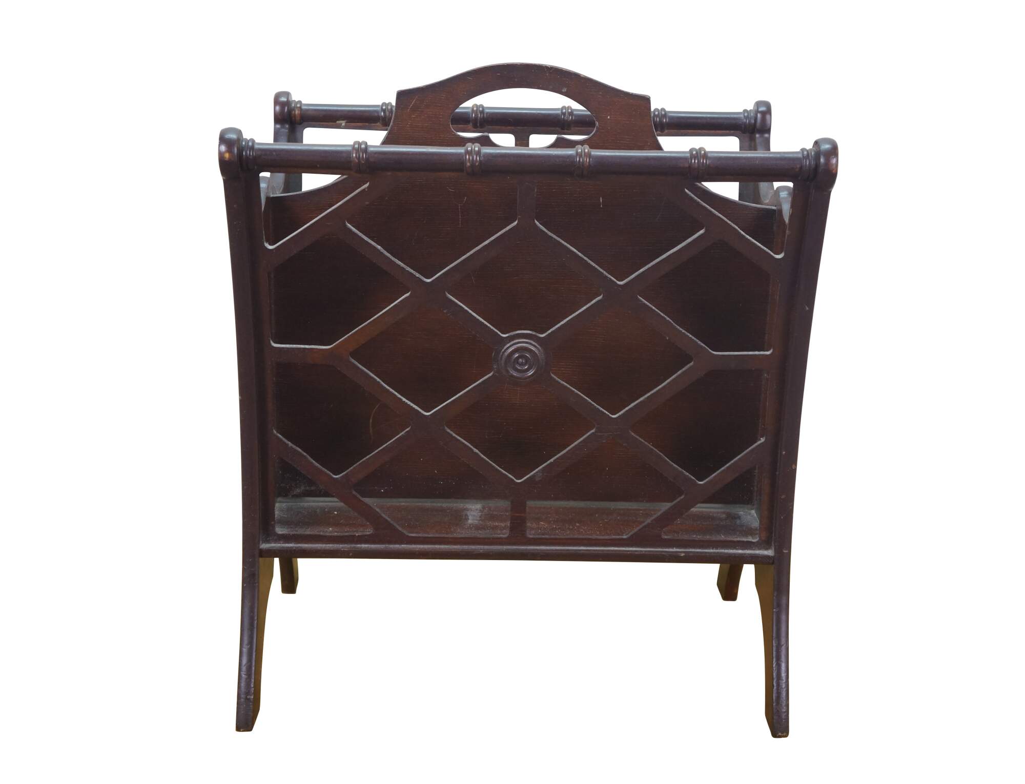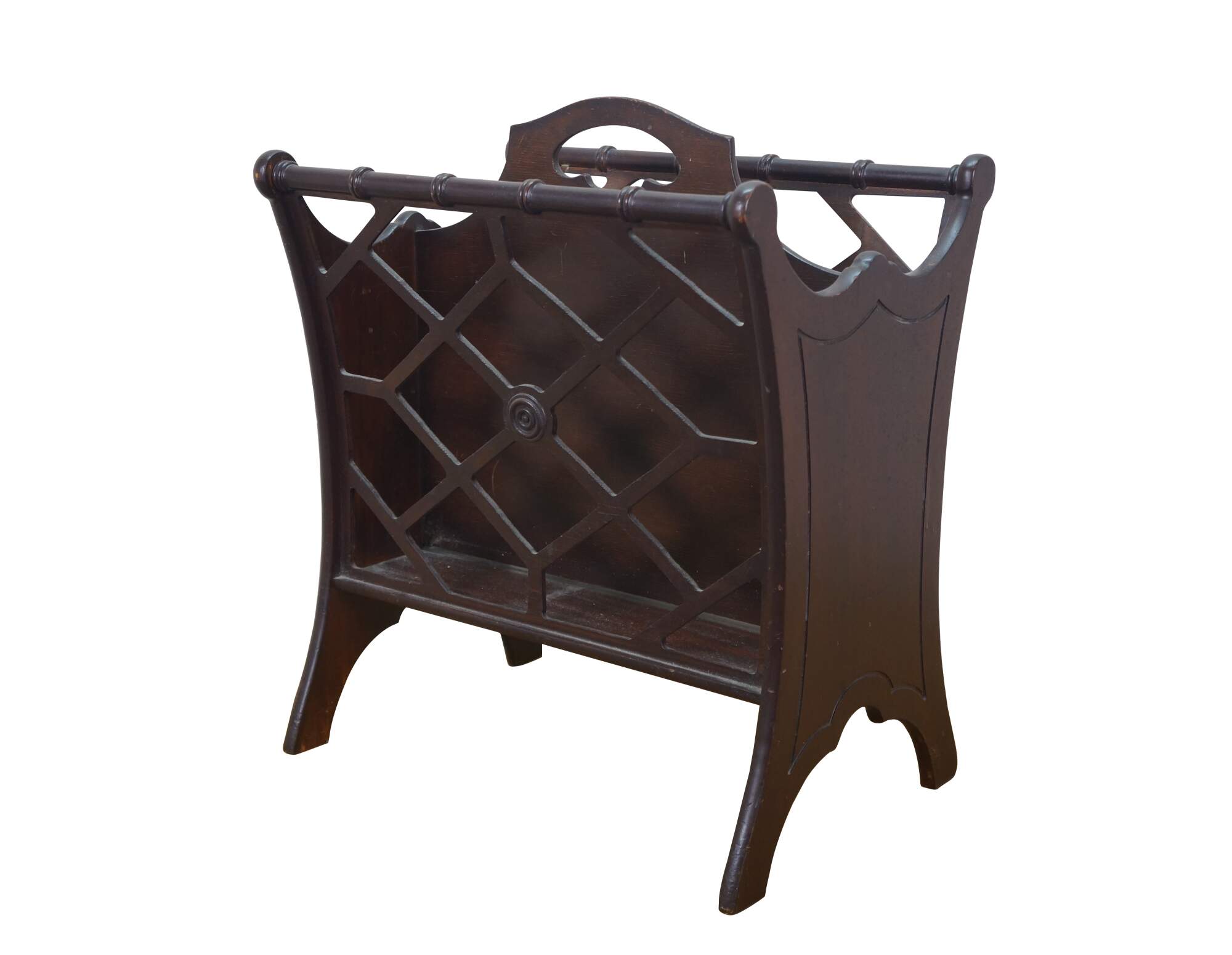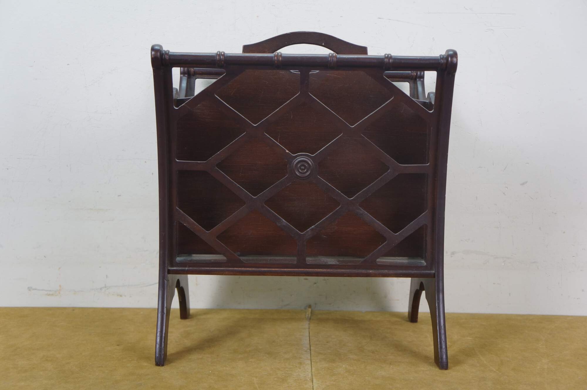 Circa mid 20th century Butler Style #766 wooden magazine rack - upswept rectangular form with faux bamboo edge and lattice sides.