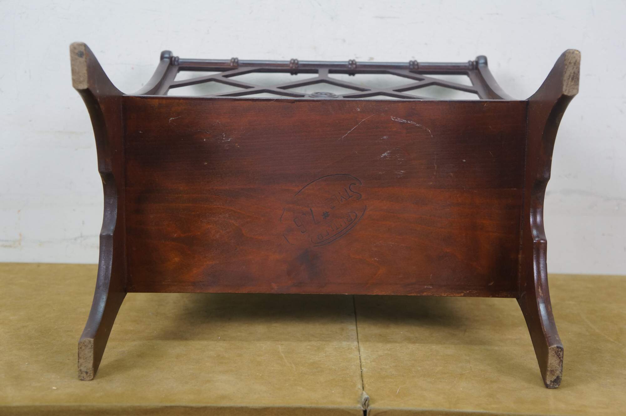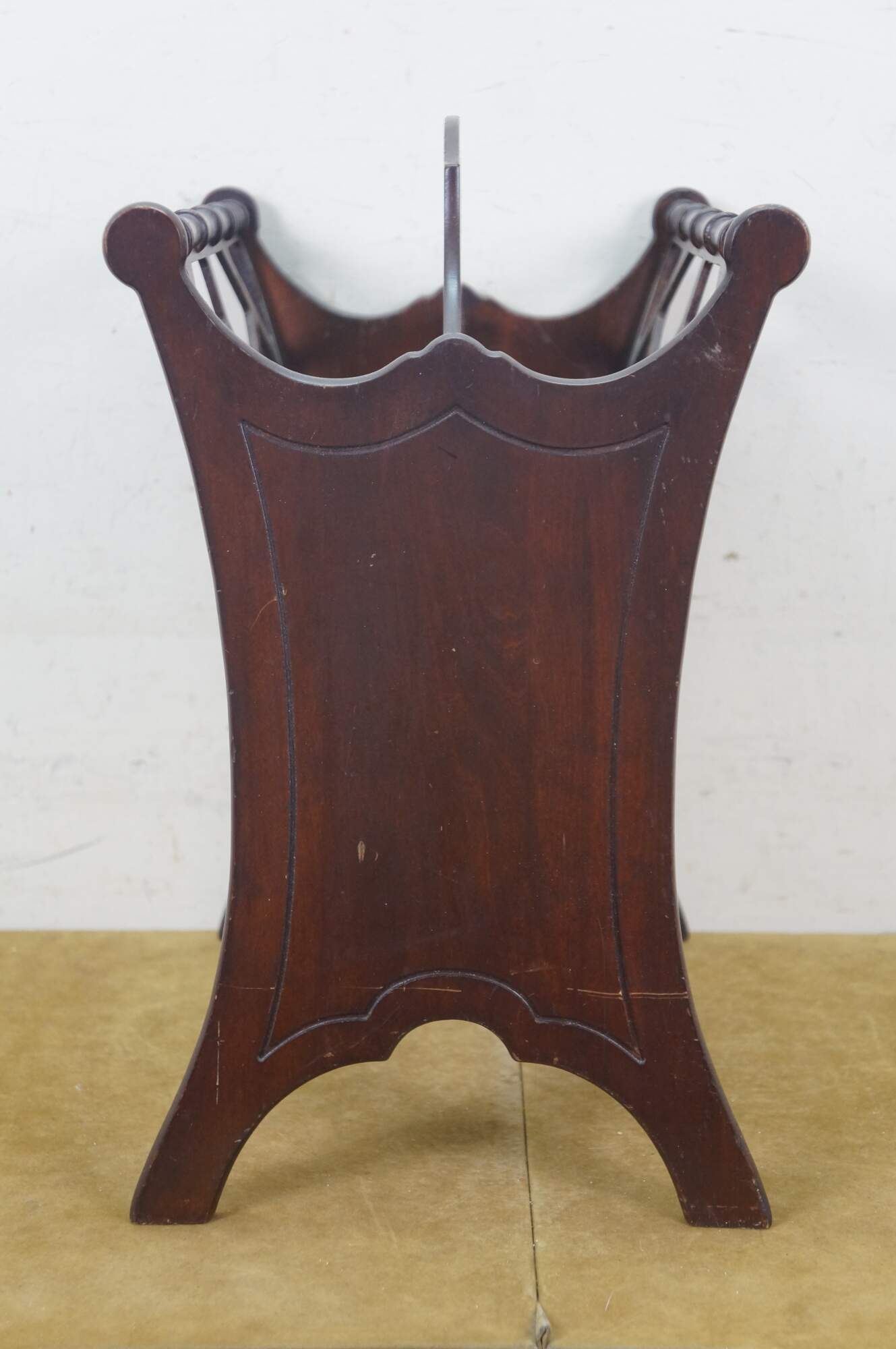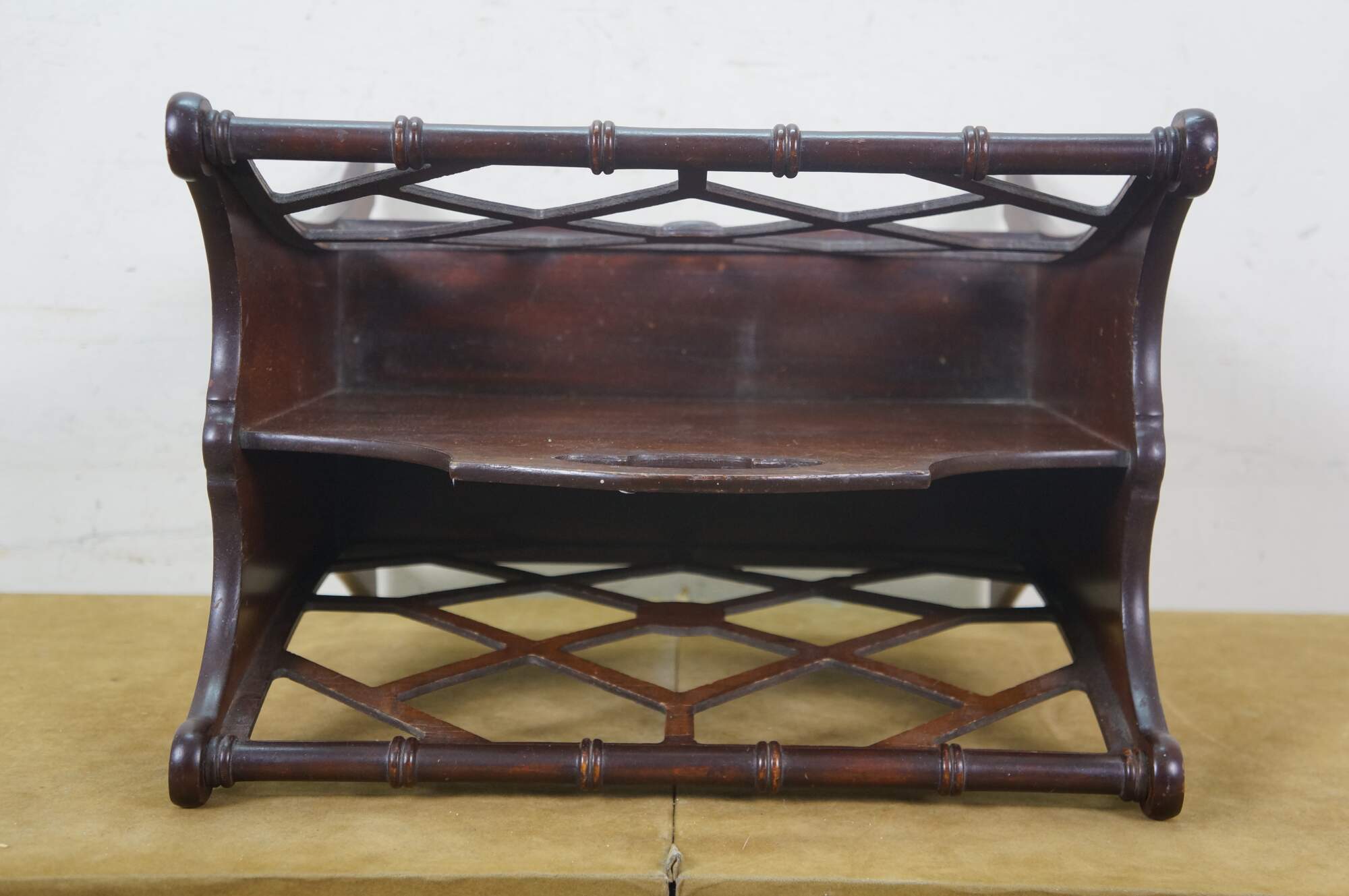 Circa mid 20th century Butler Style #766 wooden magazine rack - upswept rectangular form with faux bamboo edge and lattice sides.