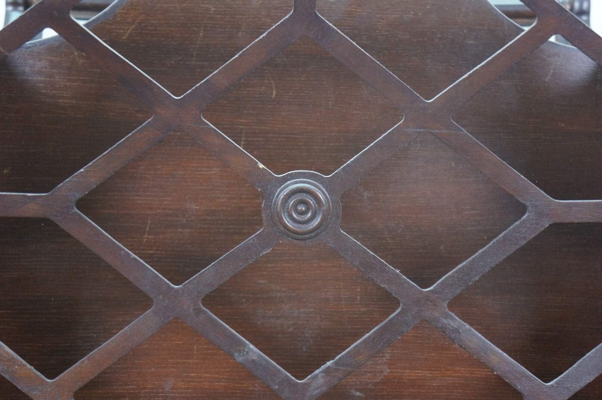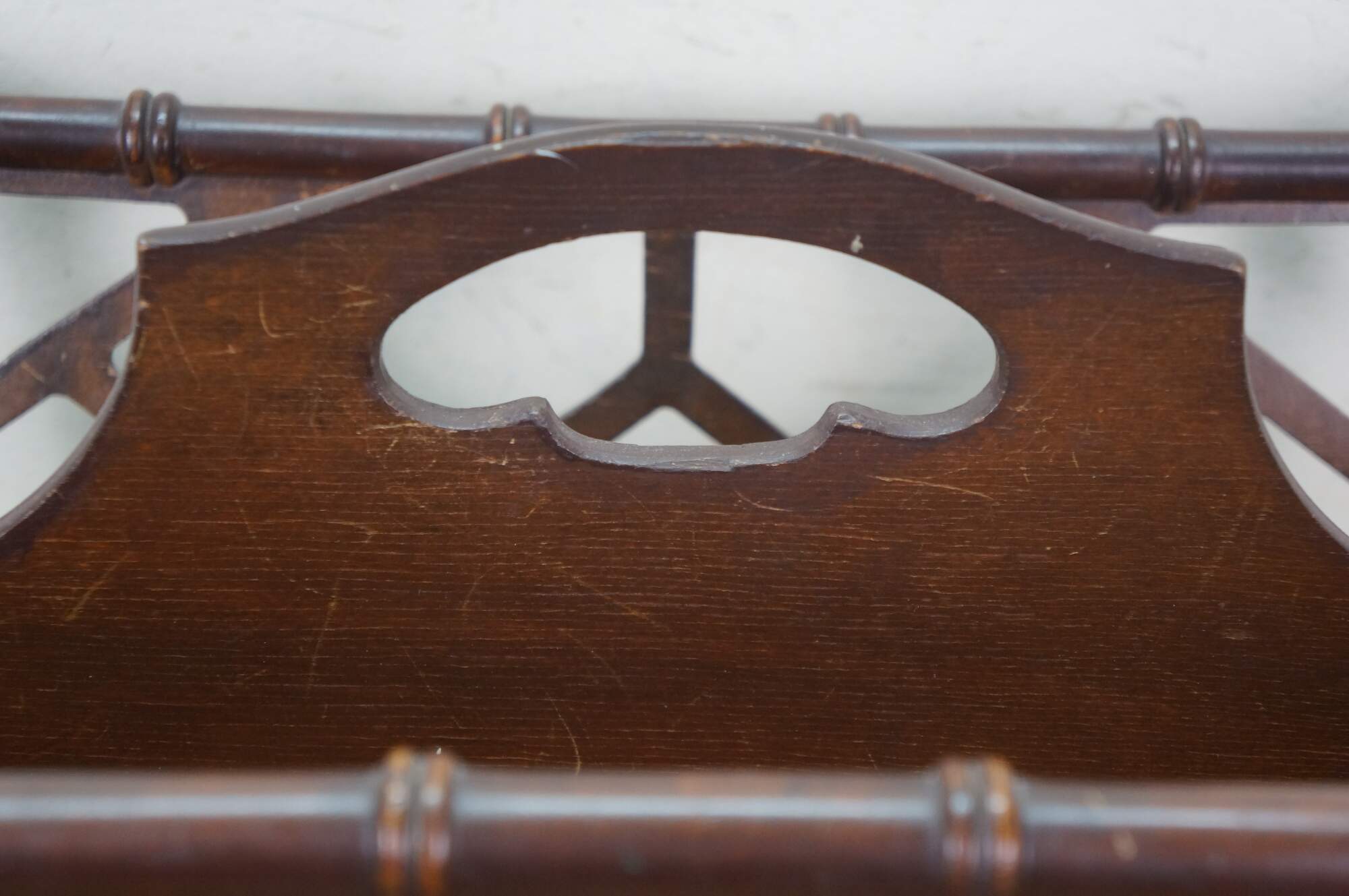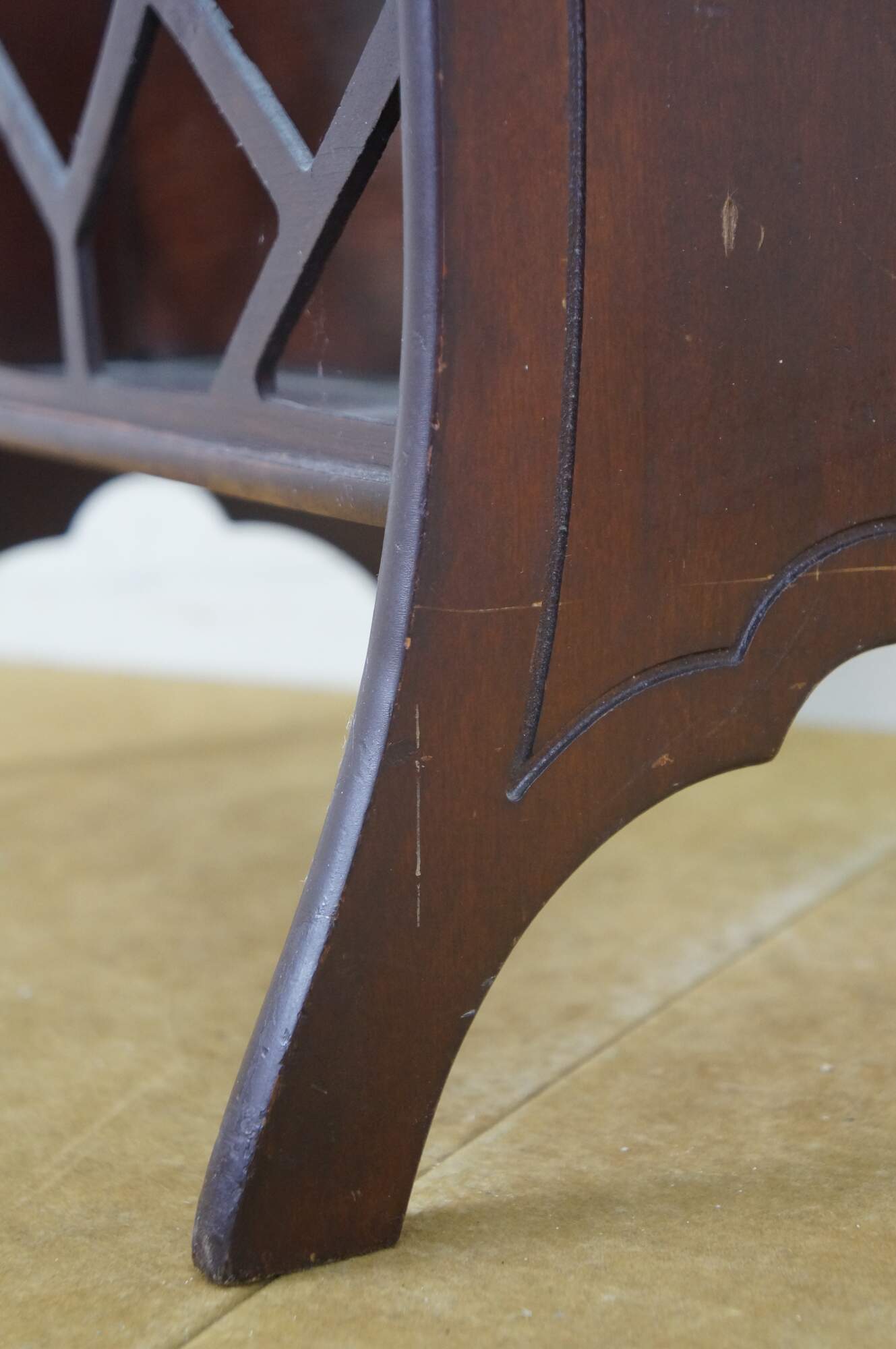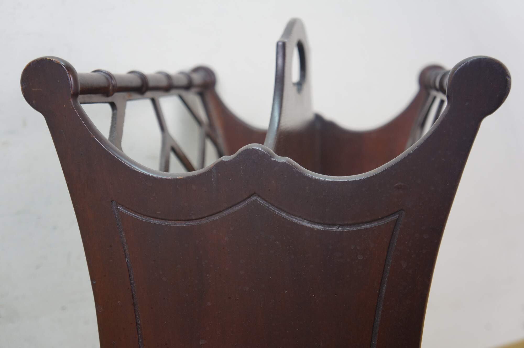 Circa mid 20th century Butler Style #766 wooden magazine rack - upswept rectangular form with faux bamboo edge and lattice sides.
