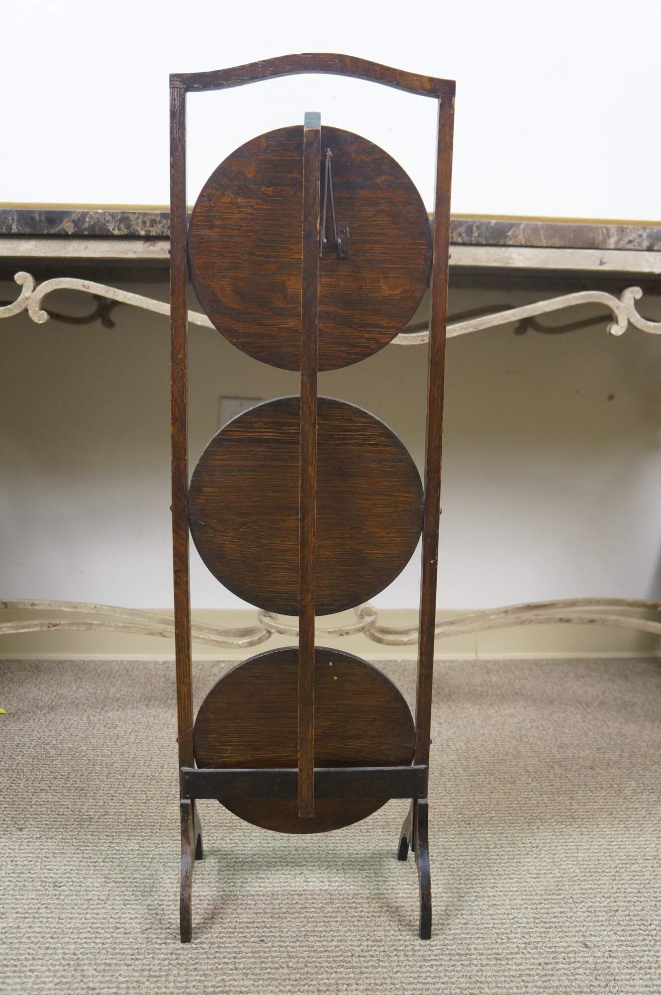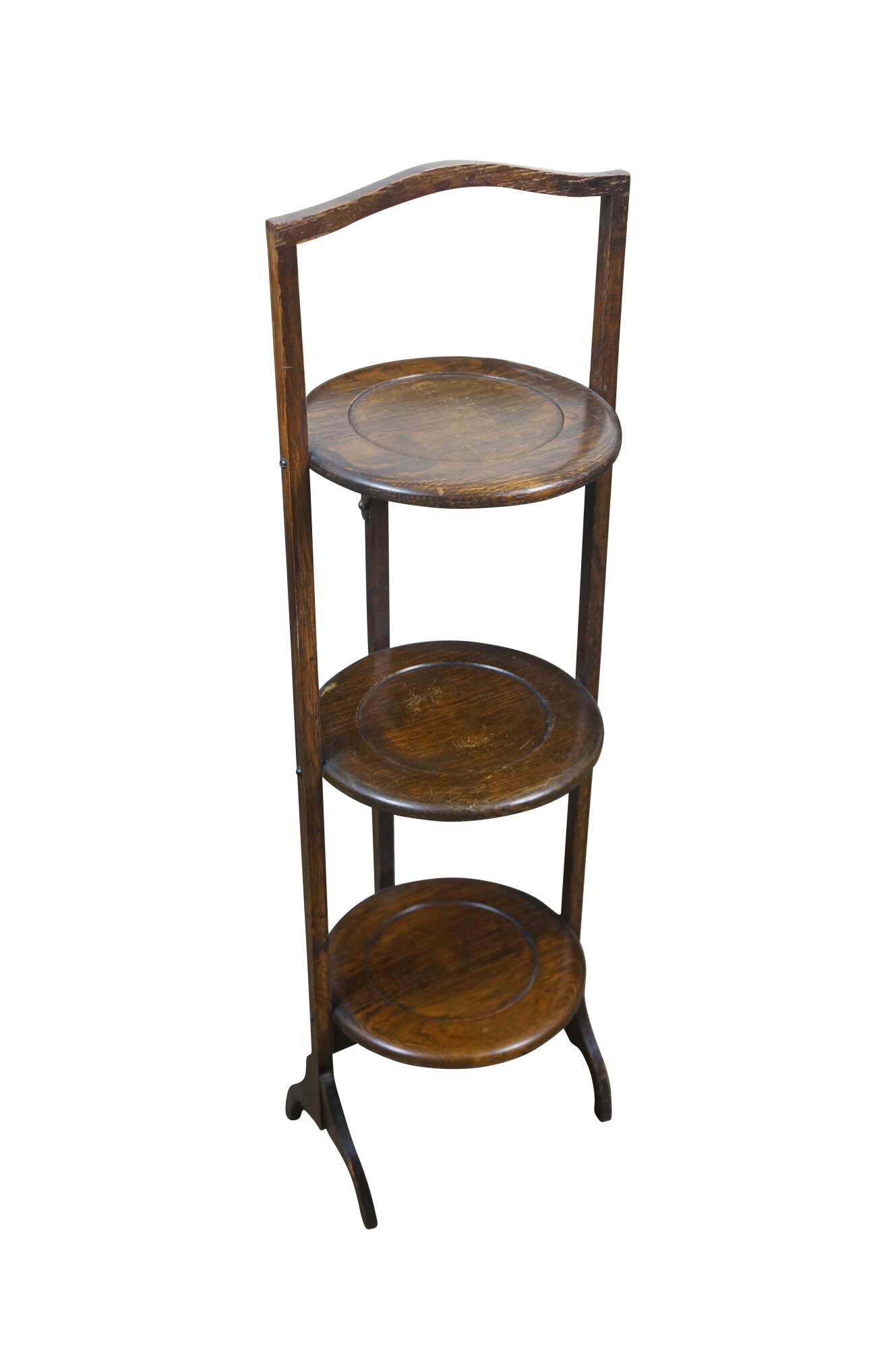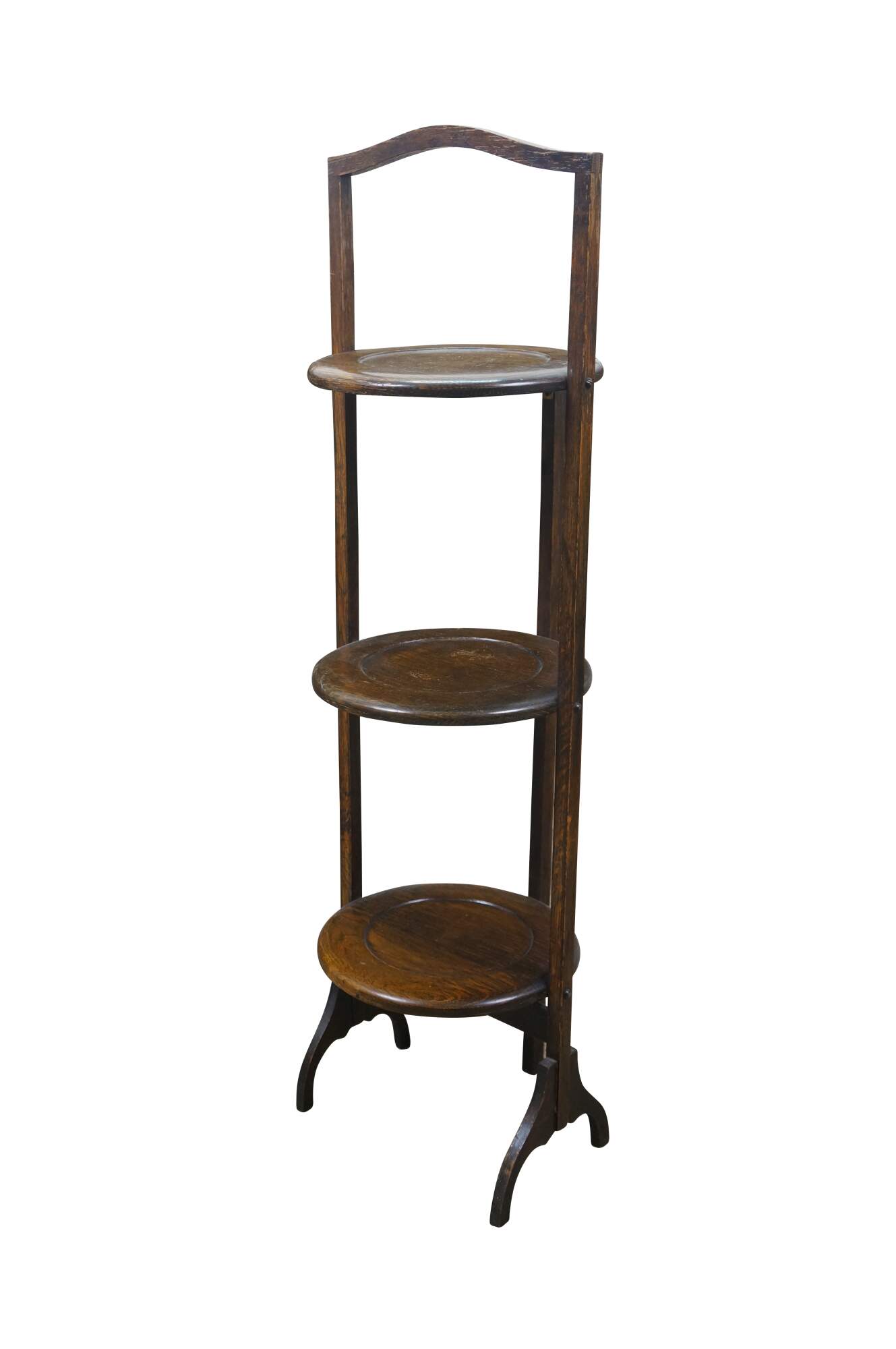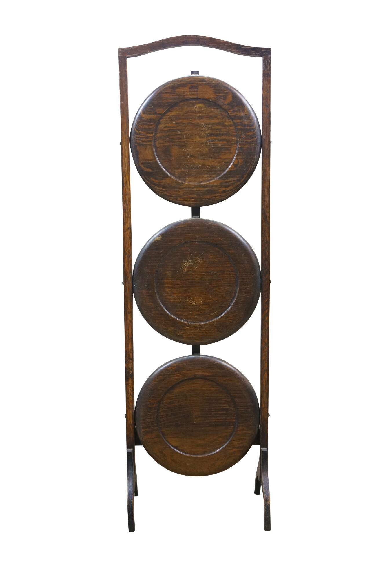 Late 19th to early 20th century Victorian / Edwardian three tier quartersawn oak dessert display stand. Rectangular frame with oxbow handle, with three round folding tiers.