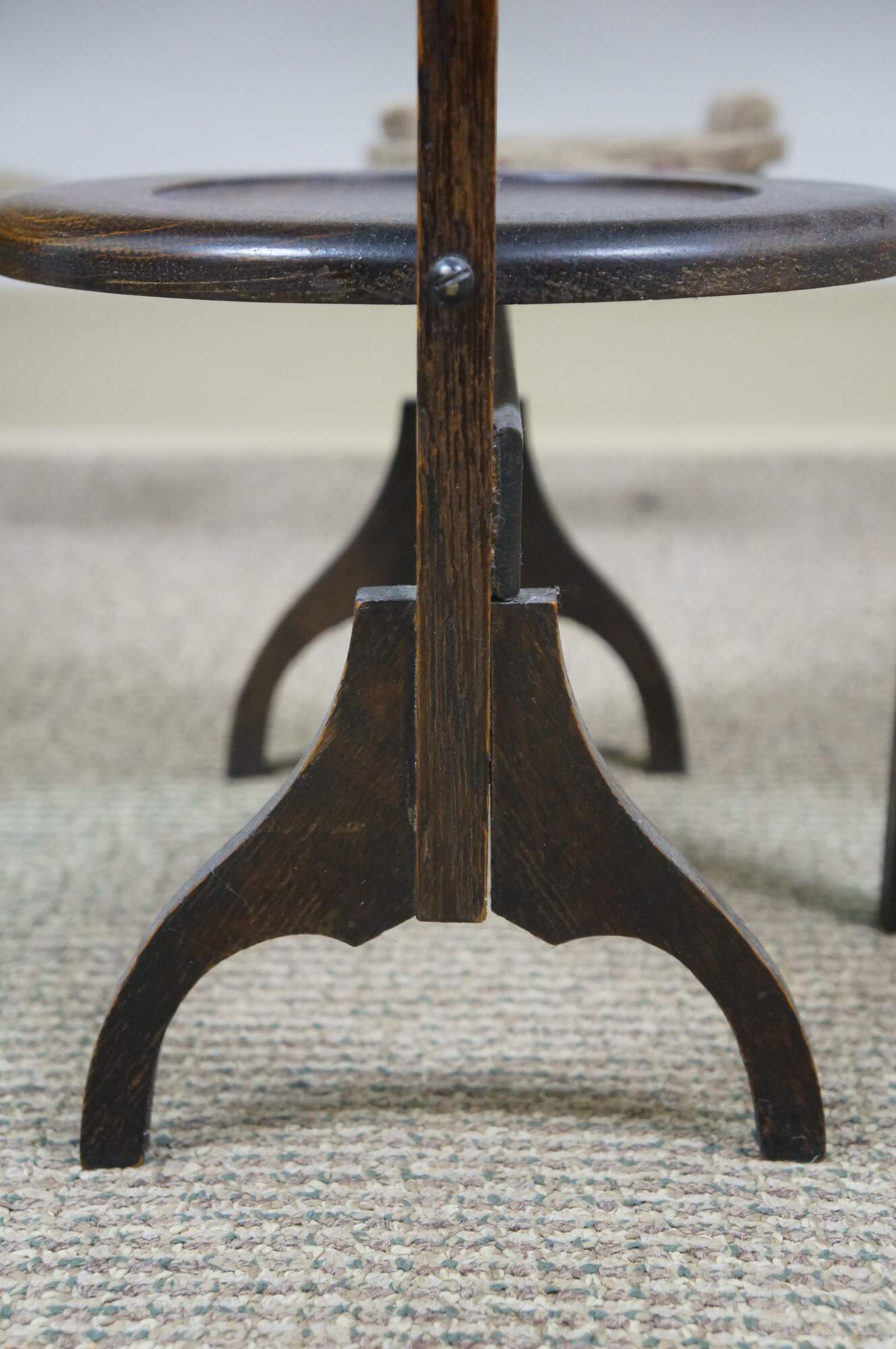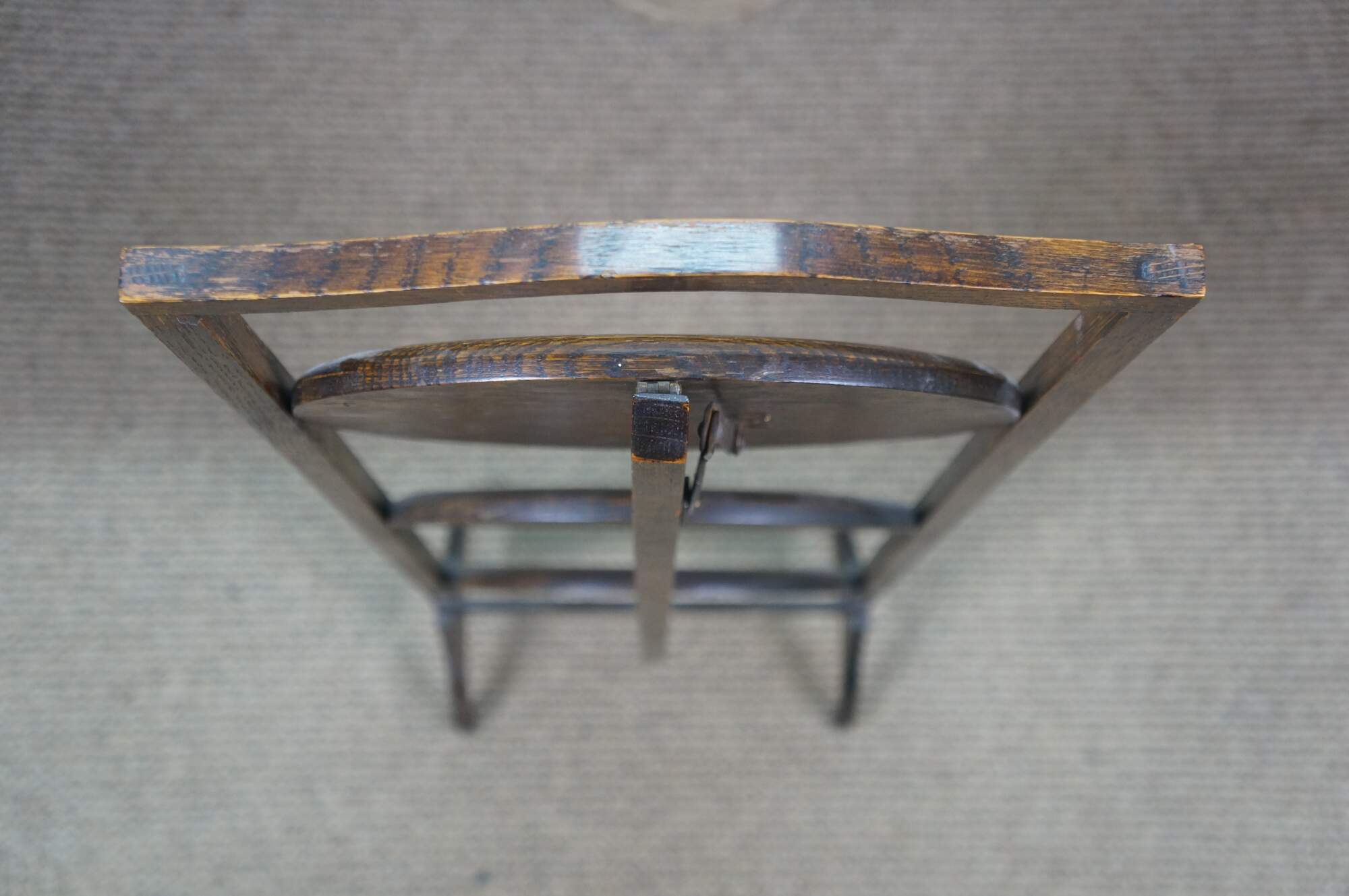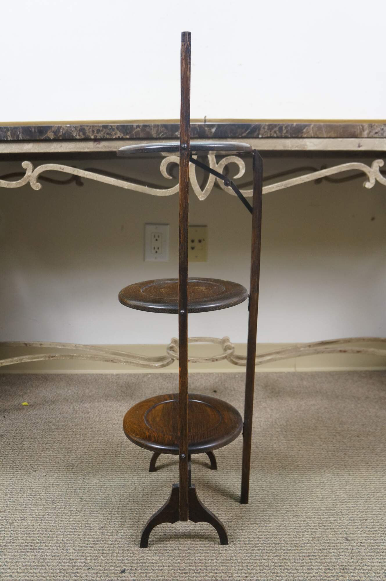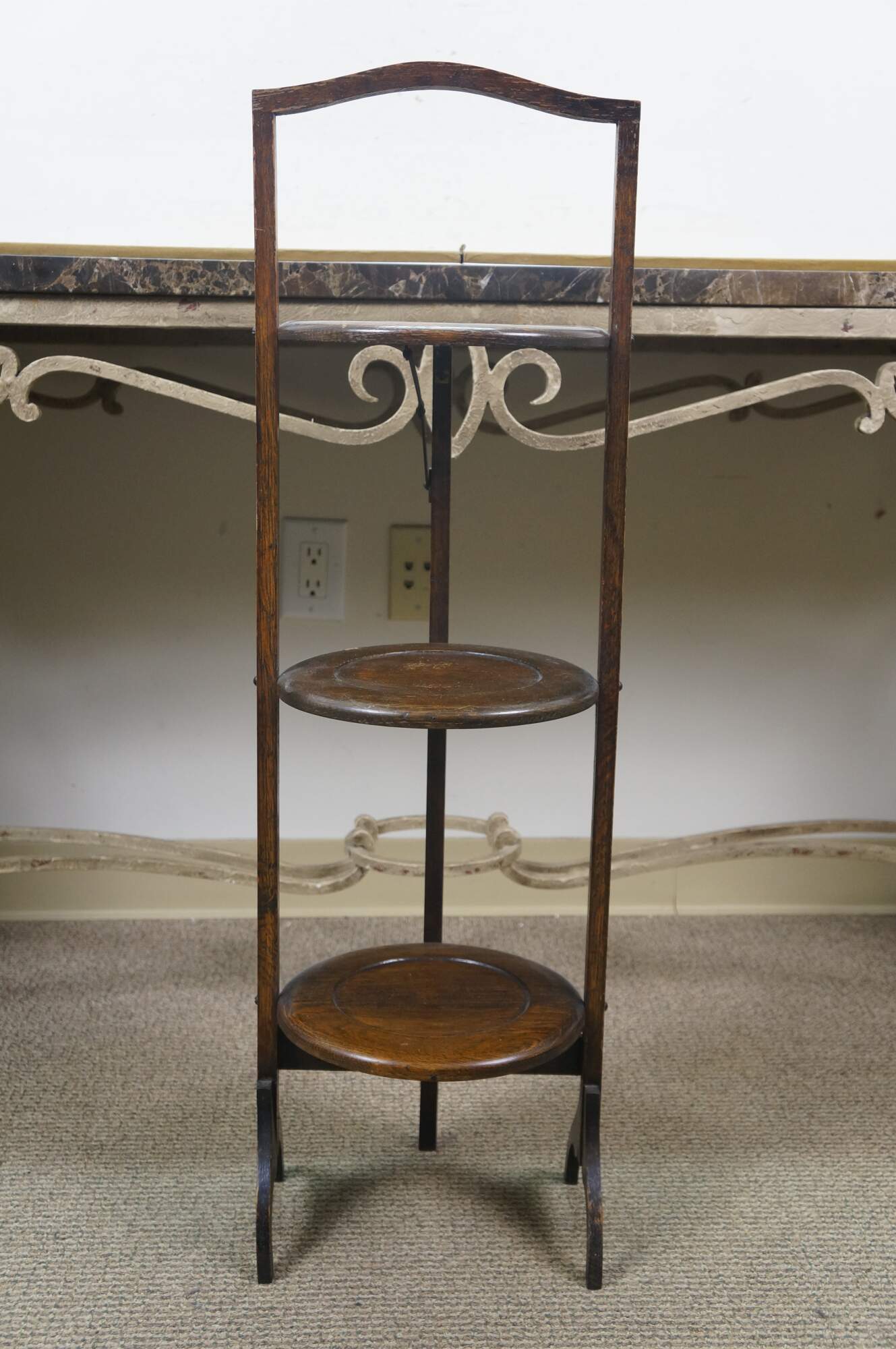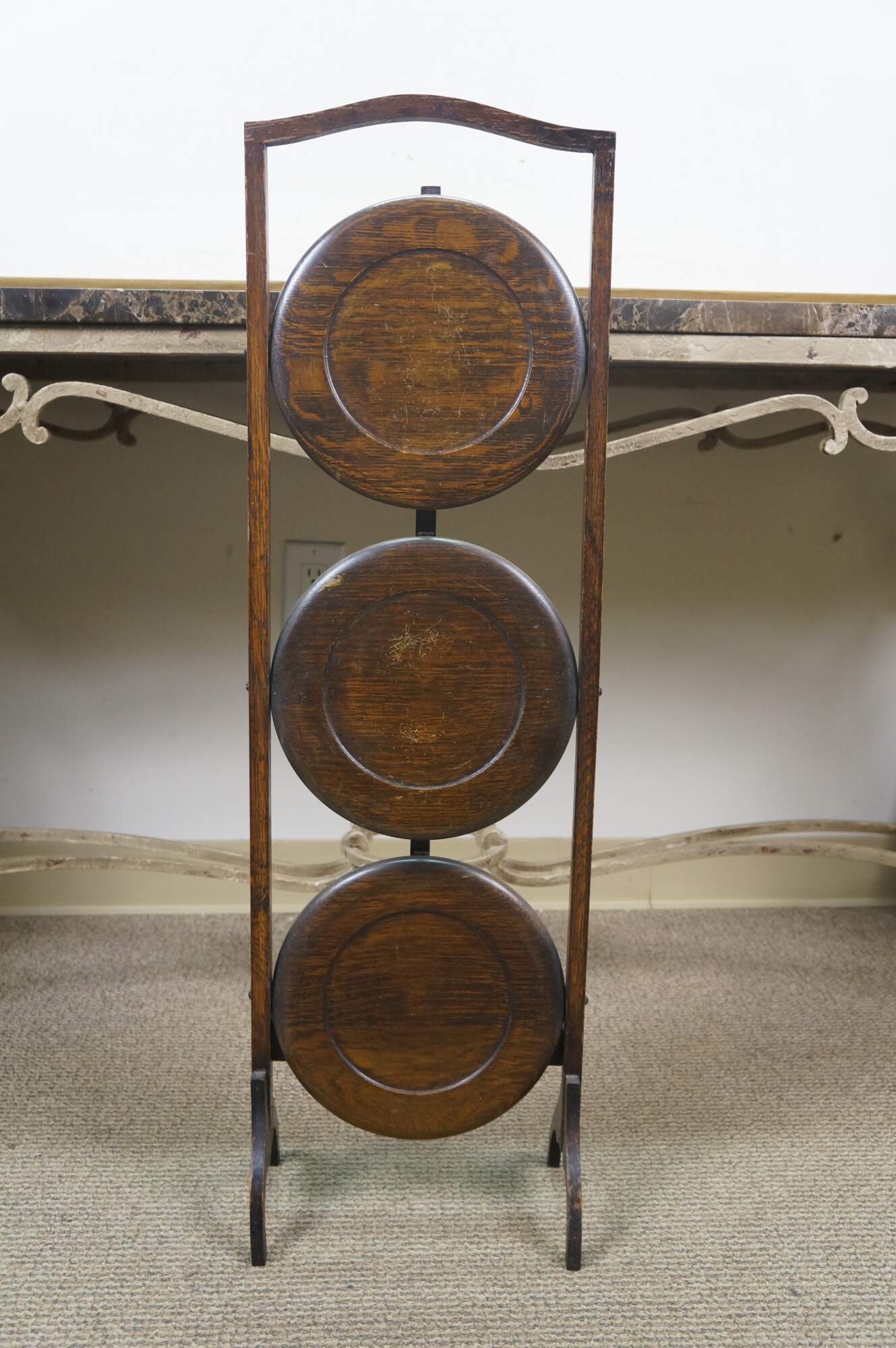 Late 19th to early 20th century Victorian / Edwardian three tier quartersawn oak dessert display stand. Rectangular frame with oxbow handle, with three round folding tiers.