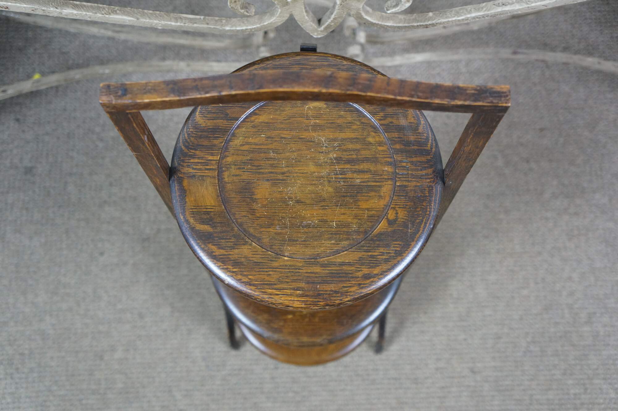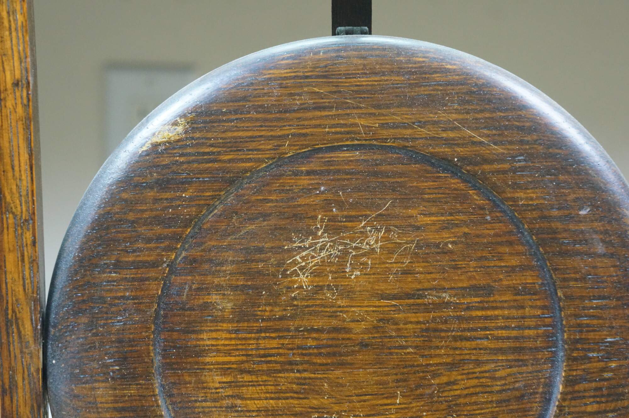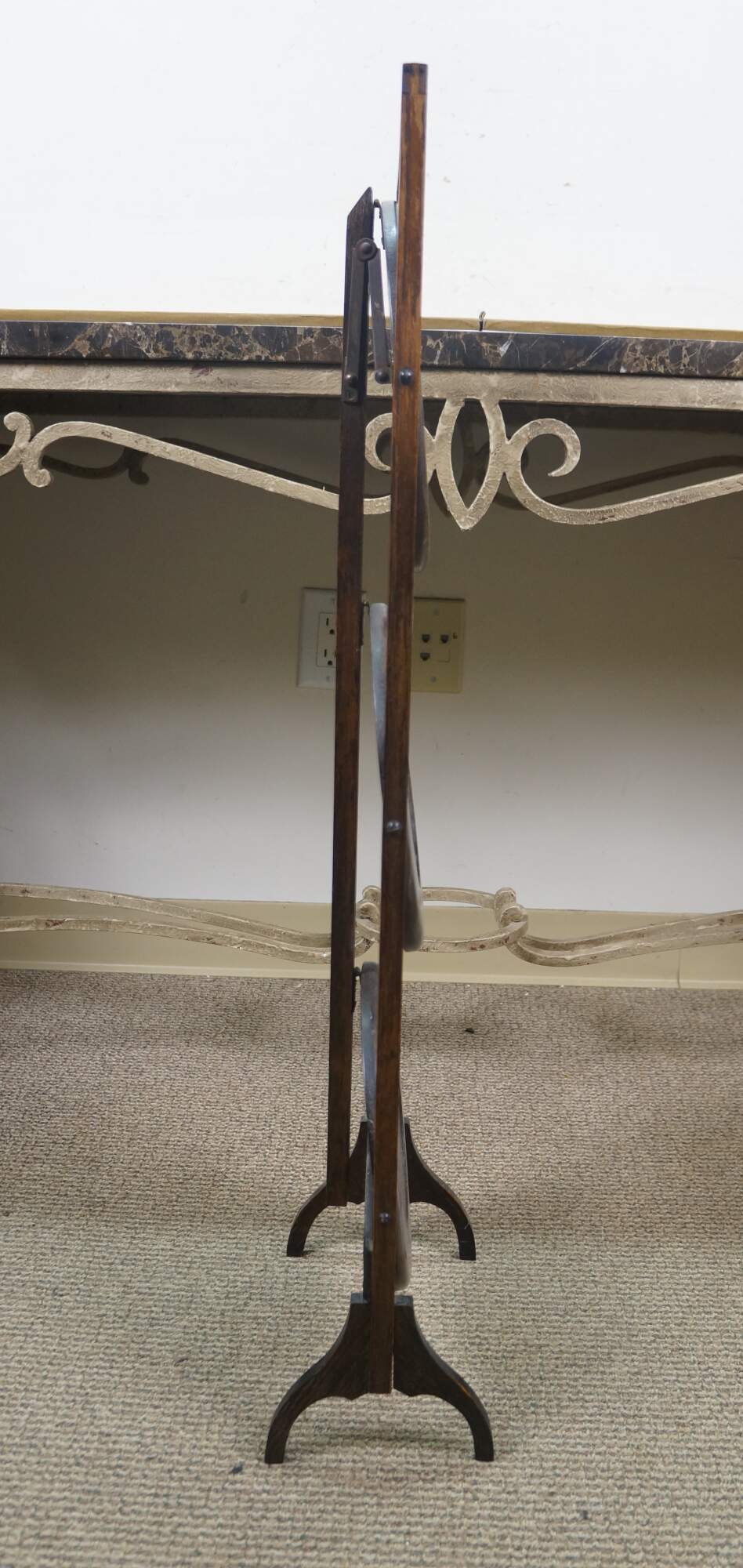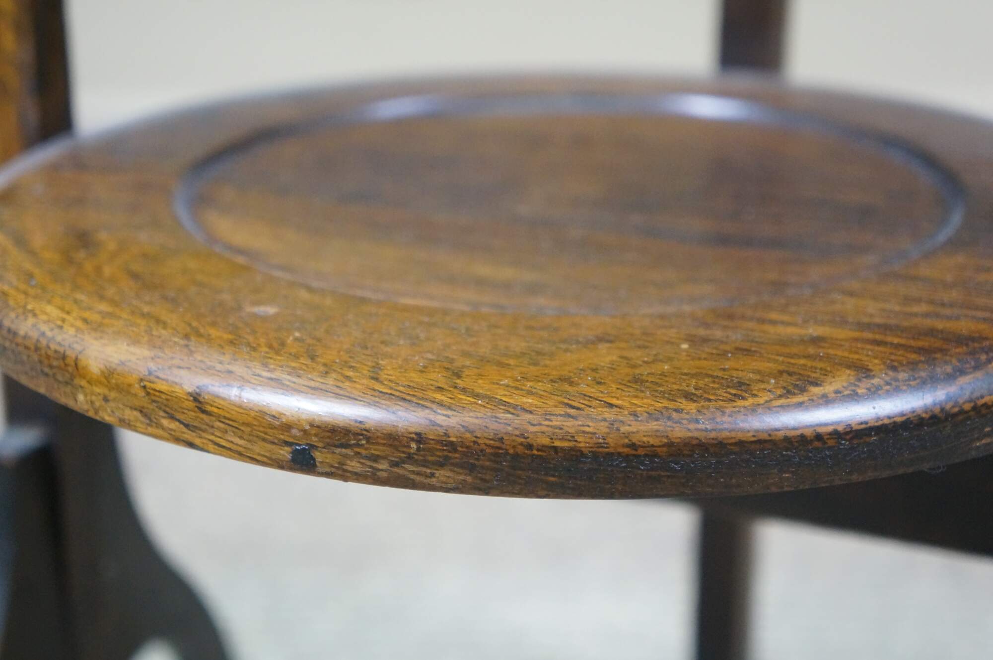 Late 19th to early 20th century Victorian / Edwardian three tier quartersawn oak dessert display stand. Rectangular frame with oxbow handle, with three round folding tiers.