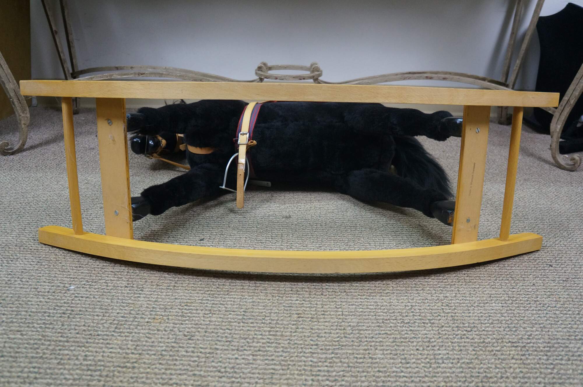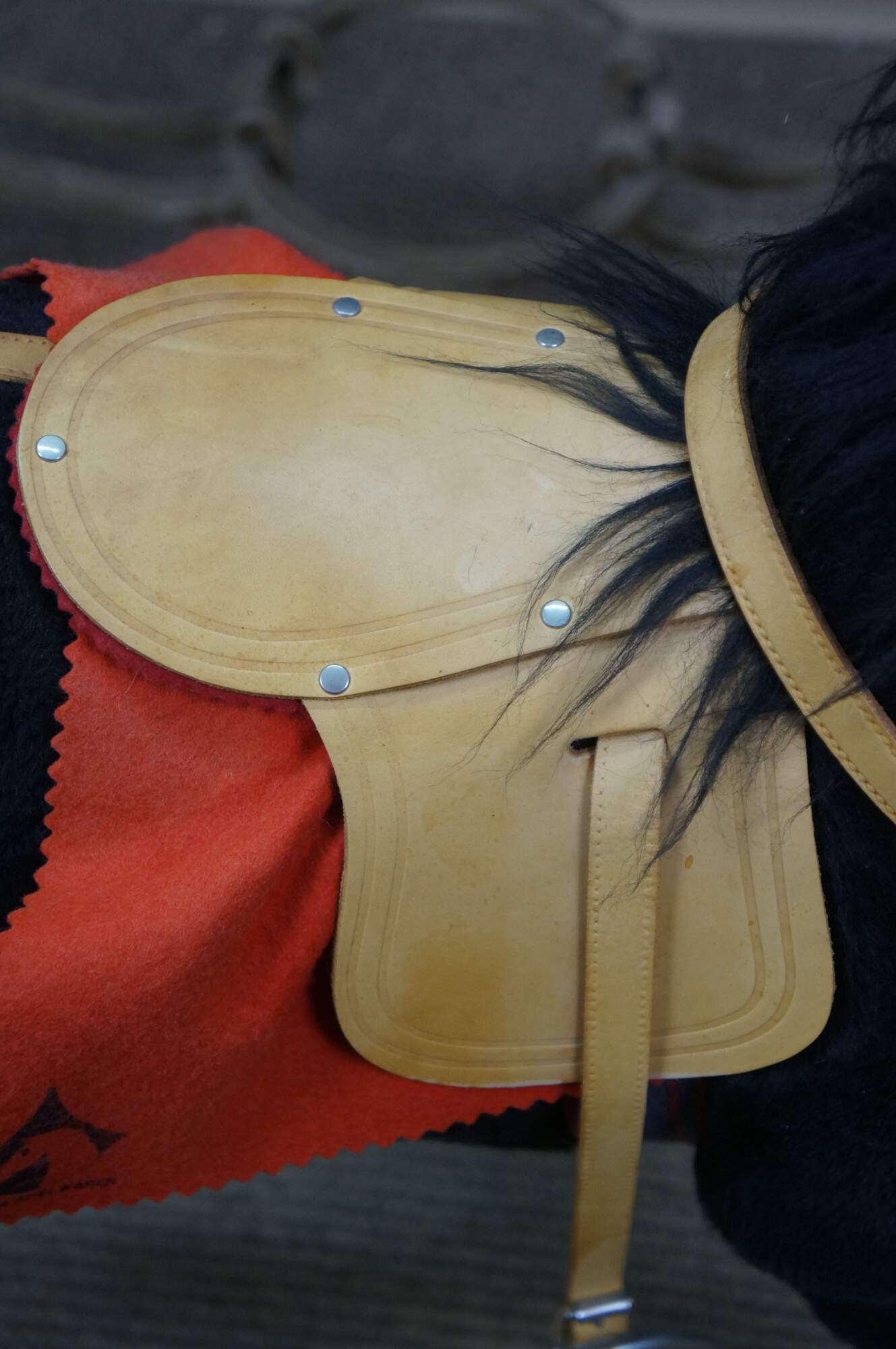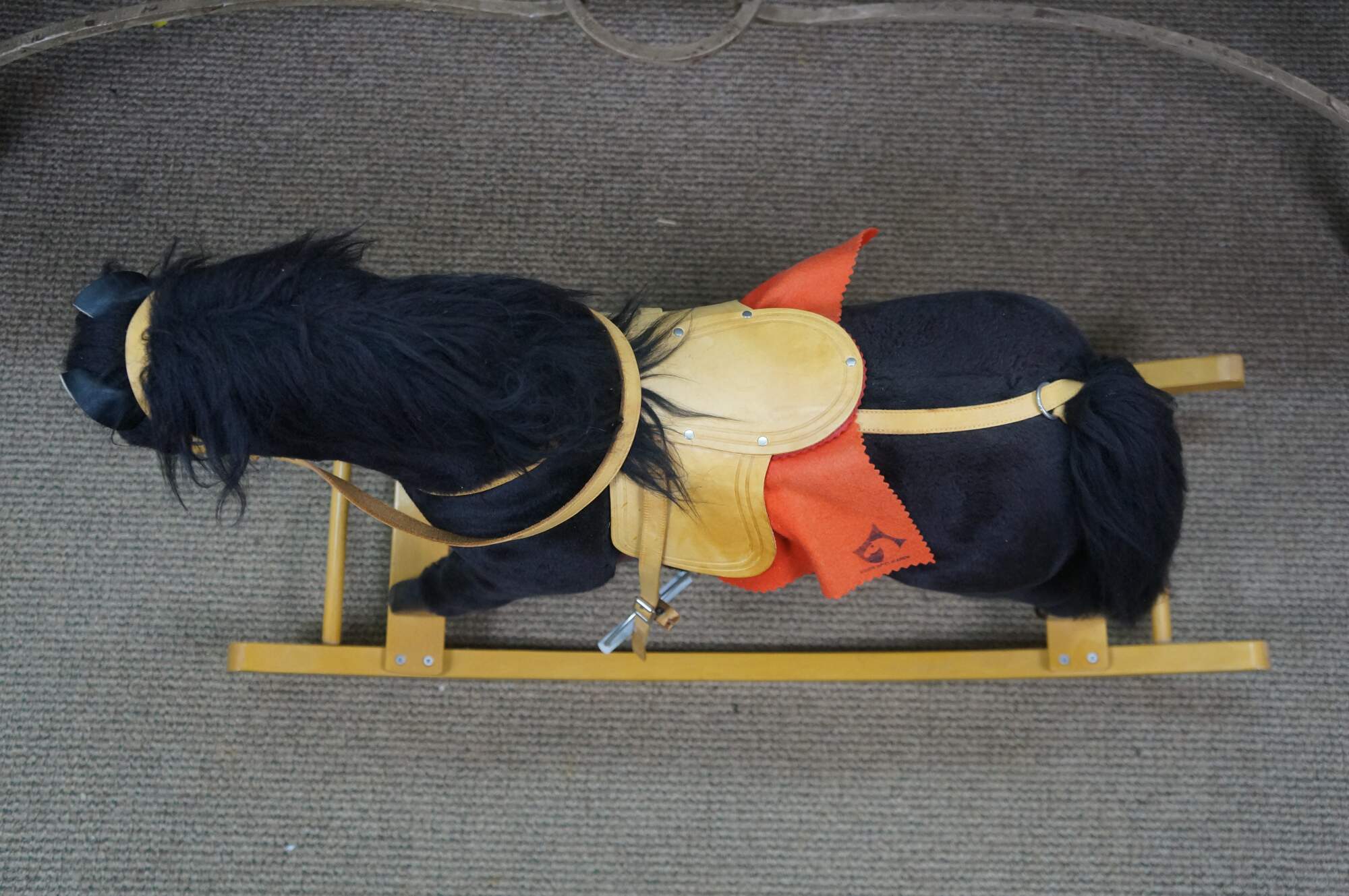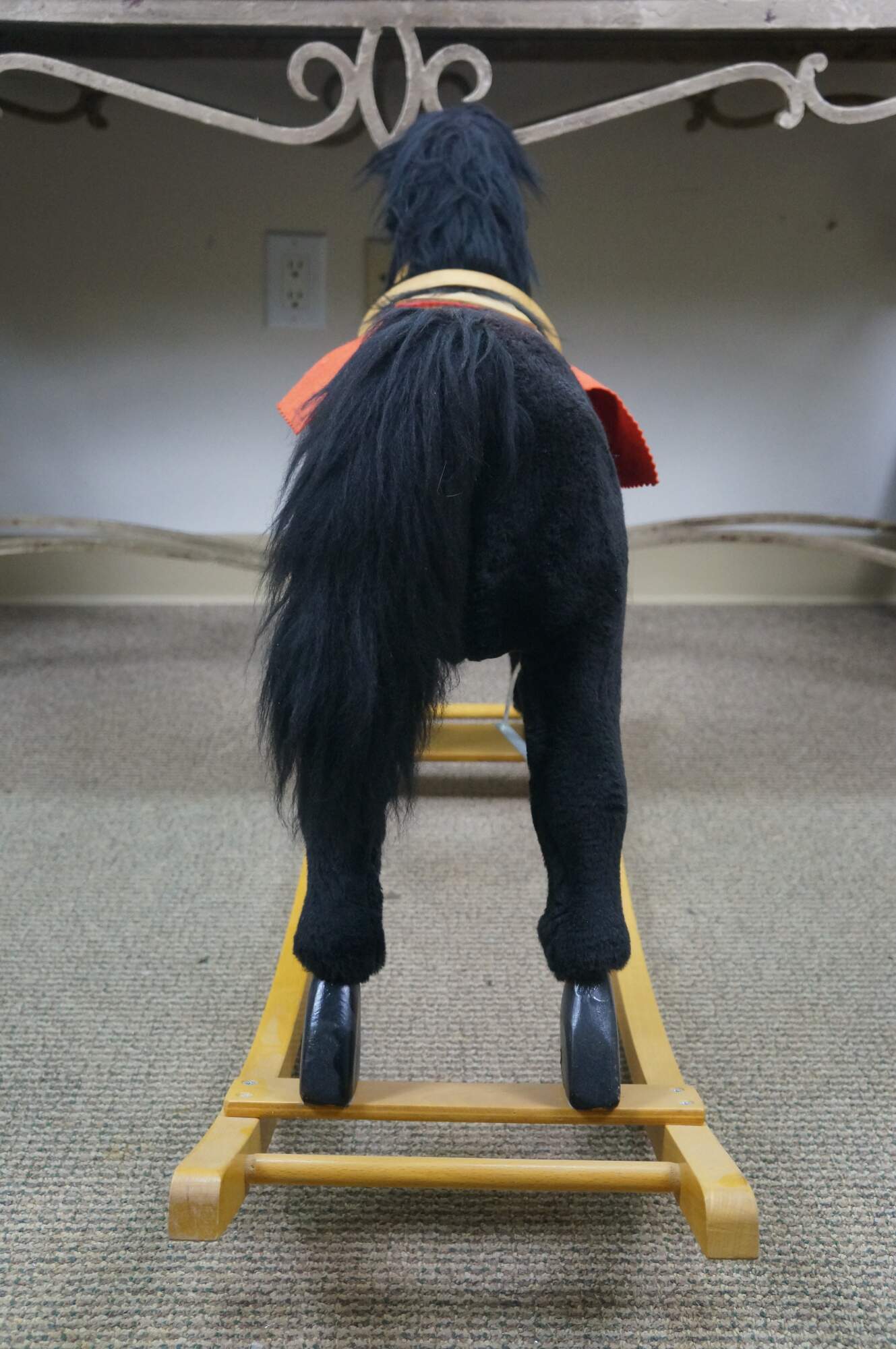 Mid to late 20th century Meier Spielwaren rocking horse toy. Wood frame and base, upholstered in black faux fur and mane with reddish brown eyes, red felt saddle blanket, and plain leather tack (saddle / reins). Made in Western Germany.