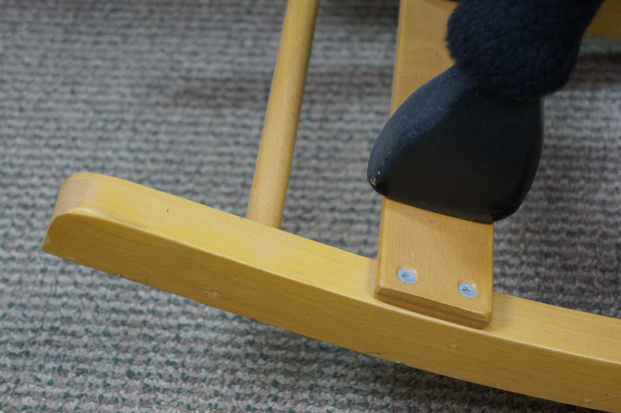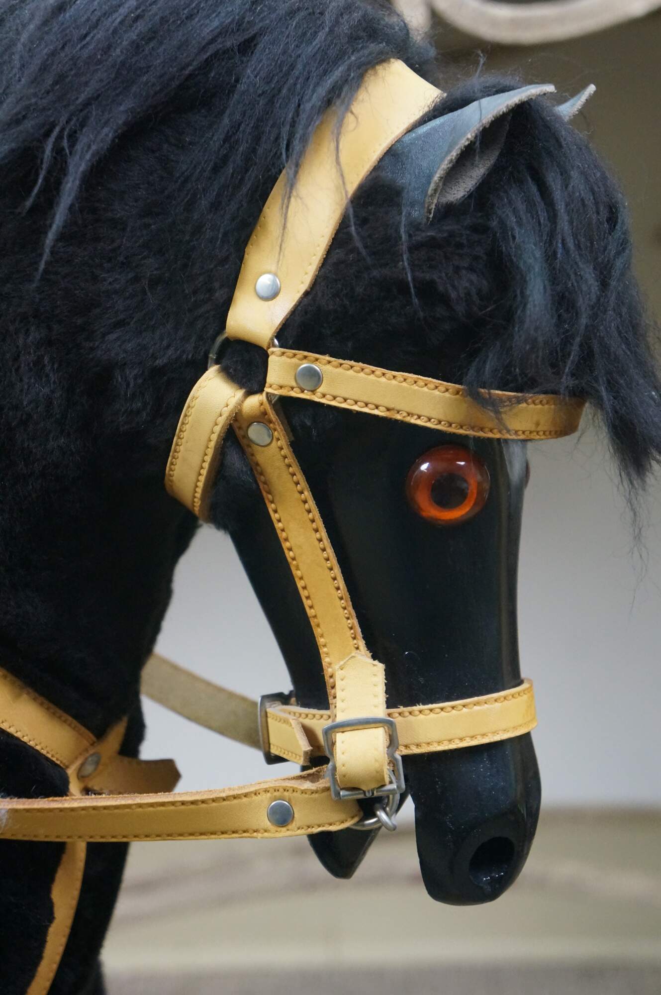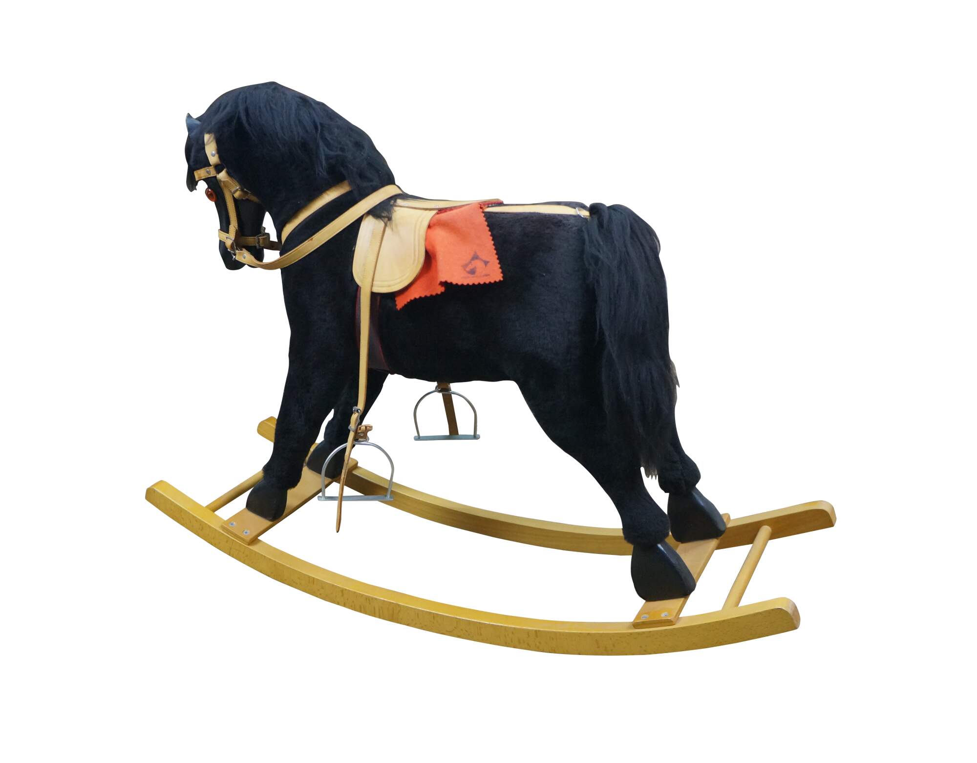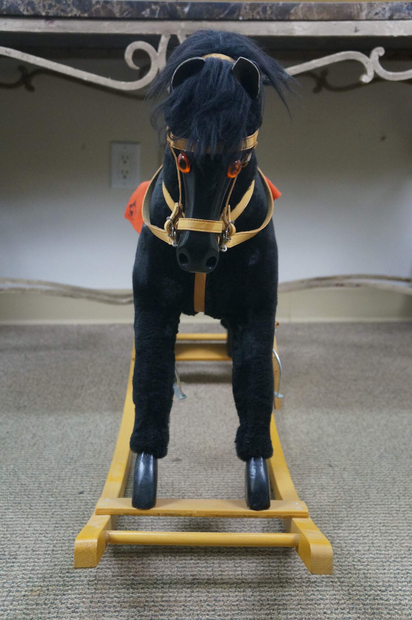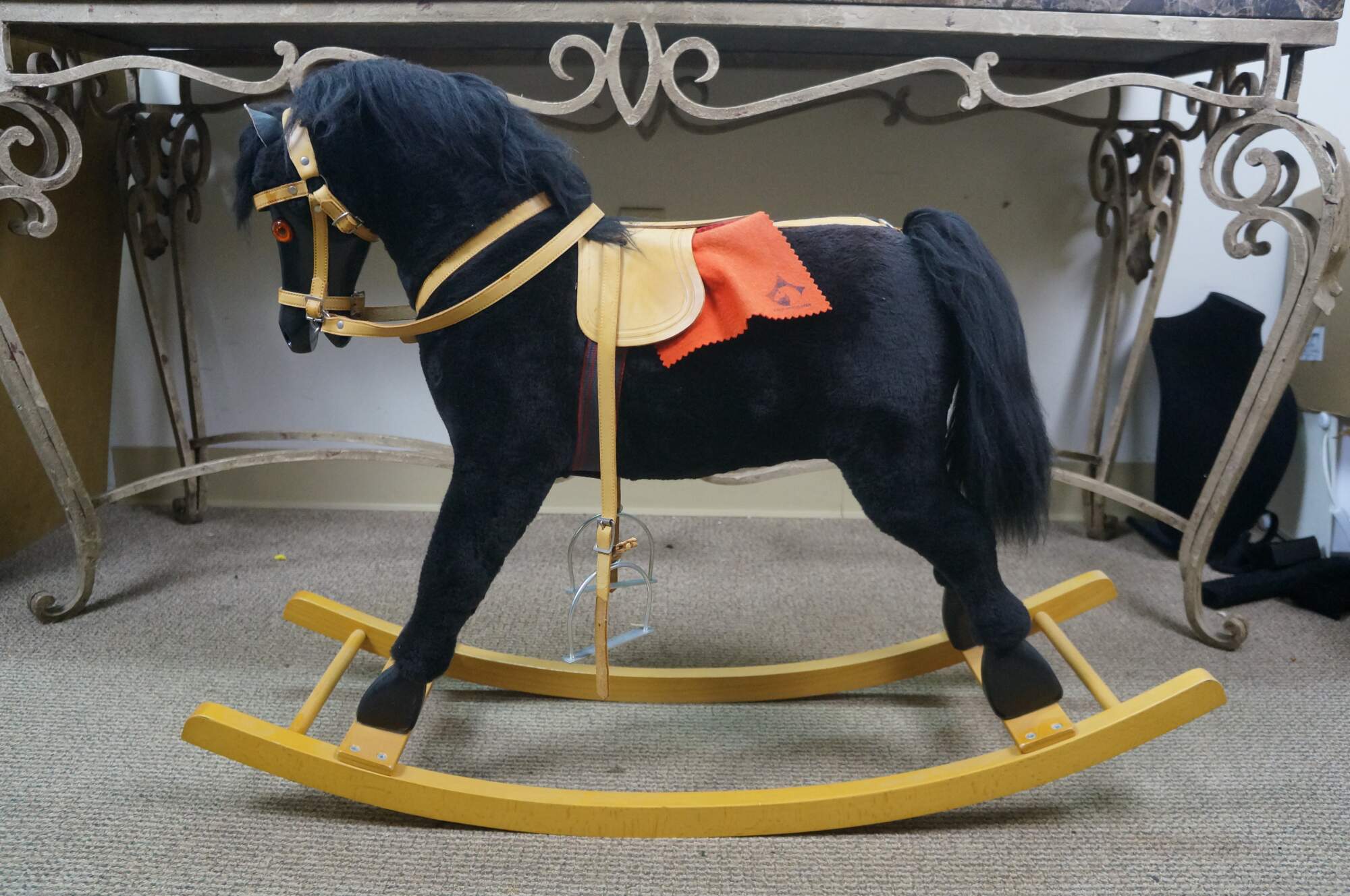 Mid to late 20th century Meier Spielwaren rocking horse toy. Wood frame and base, upholstered in black faux fur and mane with reddish brown eyes, red felt saddle blanket, and plain leather tack (saddle / reins). Made in Western Germany.