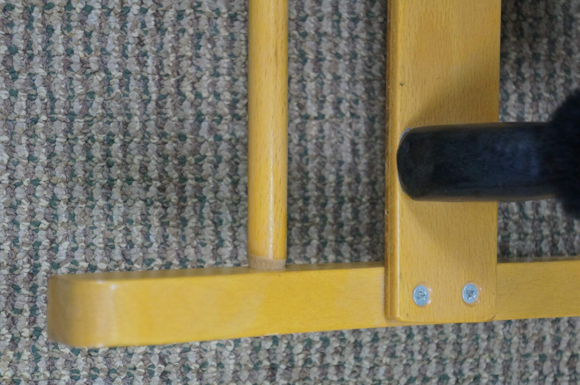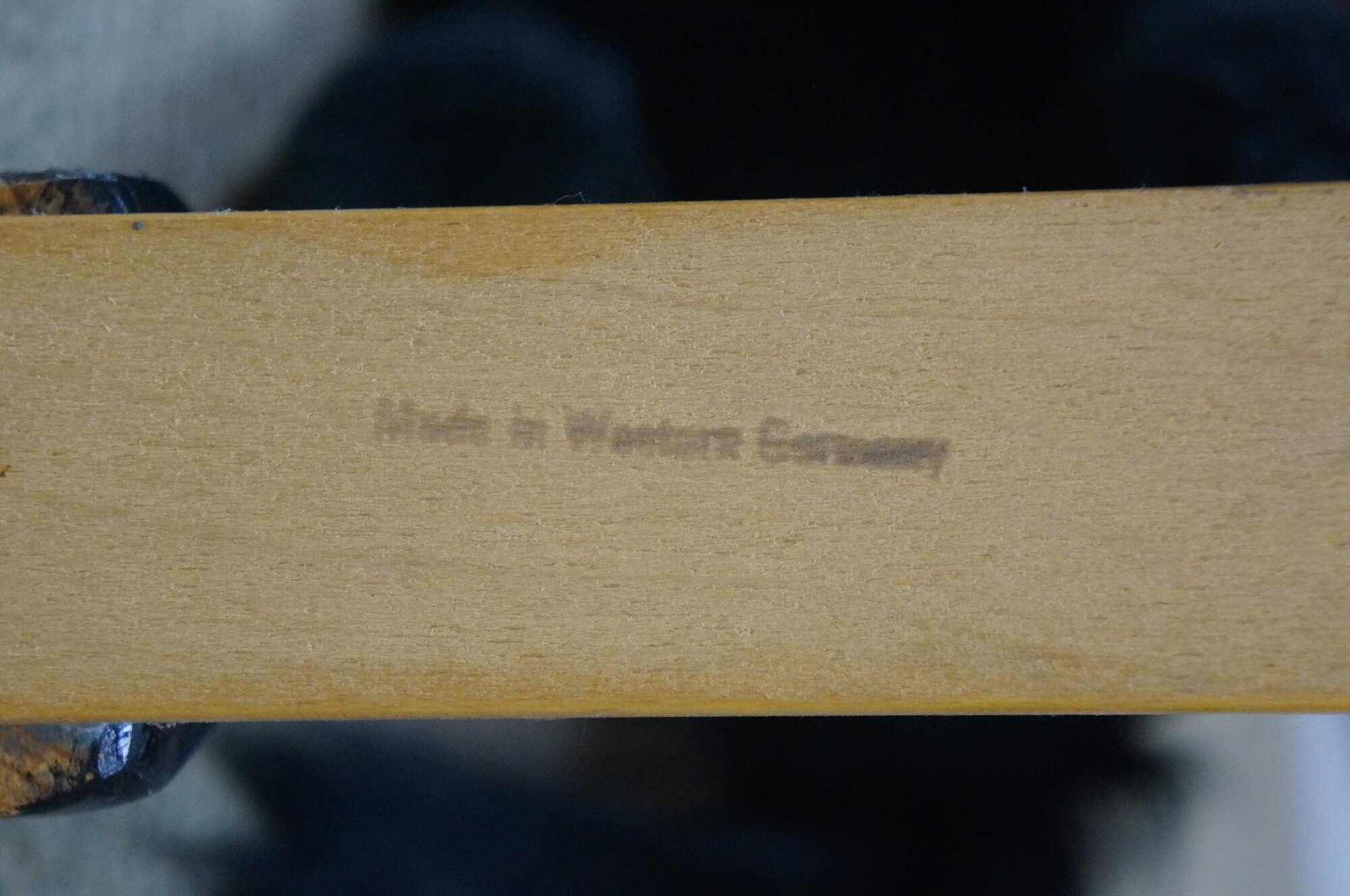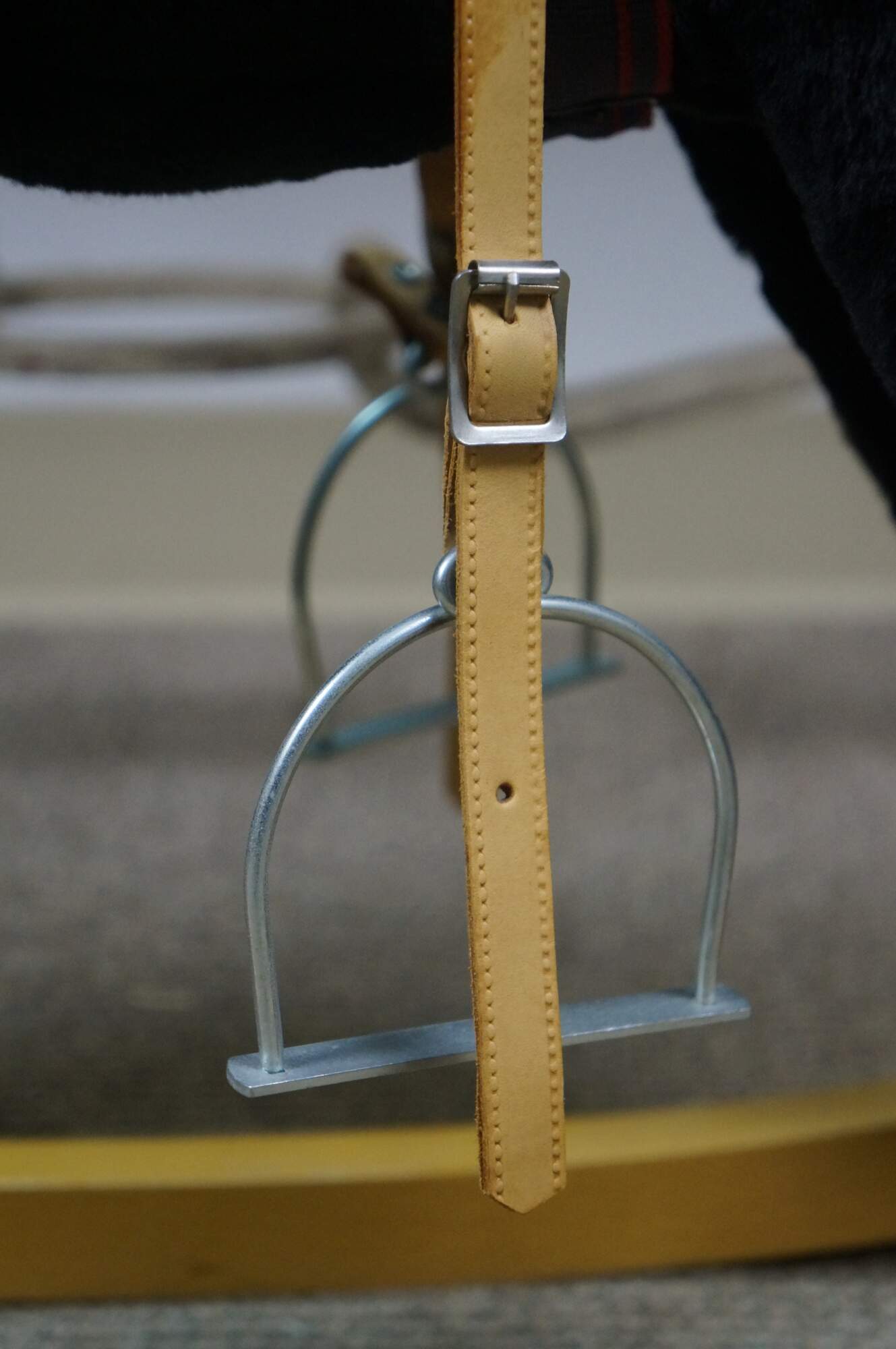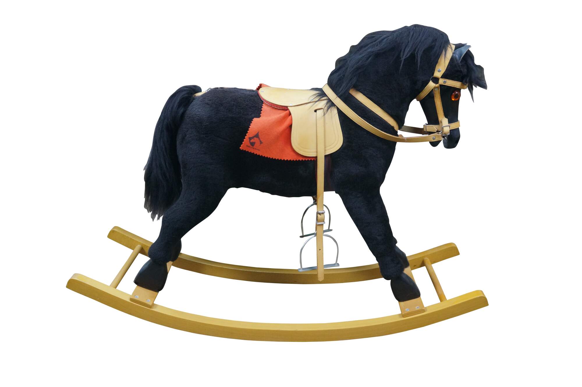 Mid to late 20th century Meier Spielwaren rocking horse toy. Wood frame and base, upholstered in black faux fur and mane with reddish brown eyes, red felt saddle blanket, and plain leather tack (saddle / reins). Made in Western Germany.