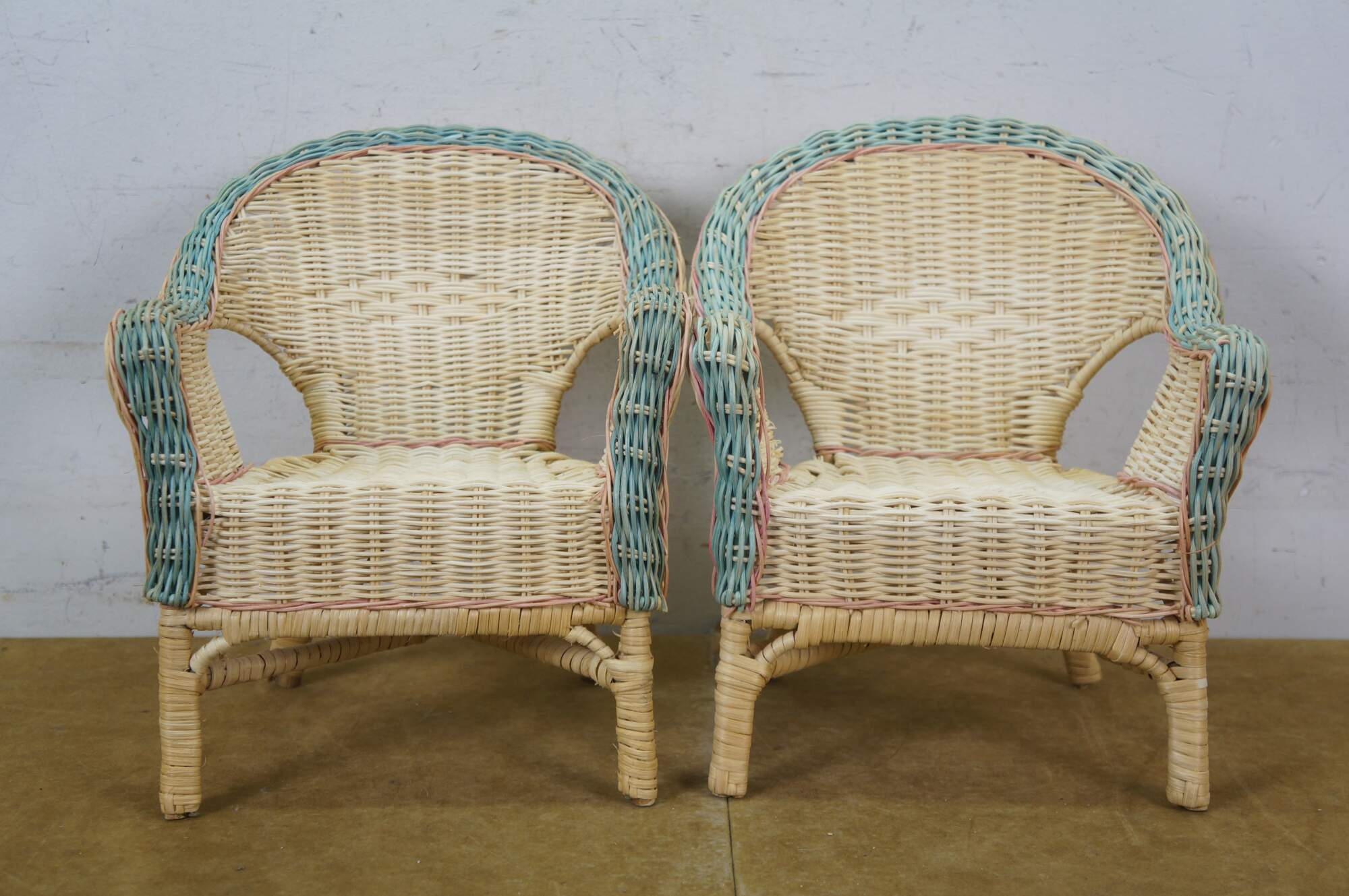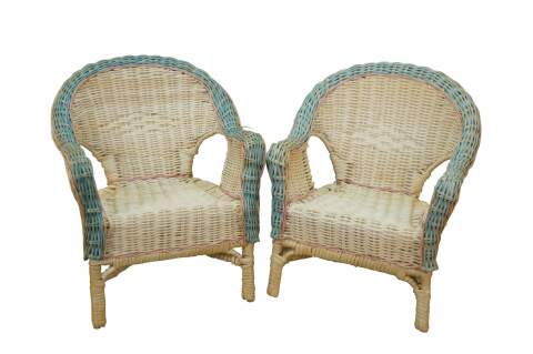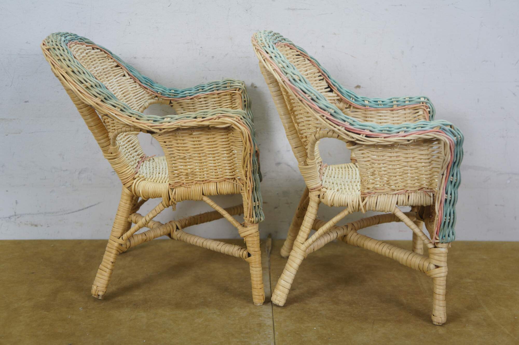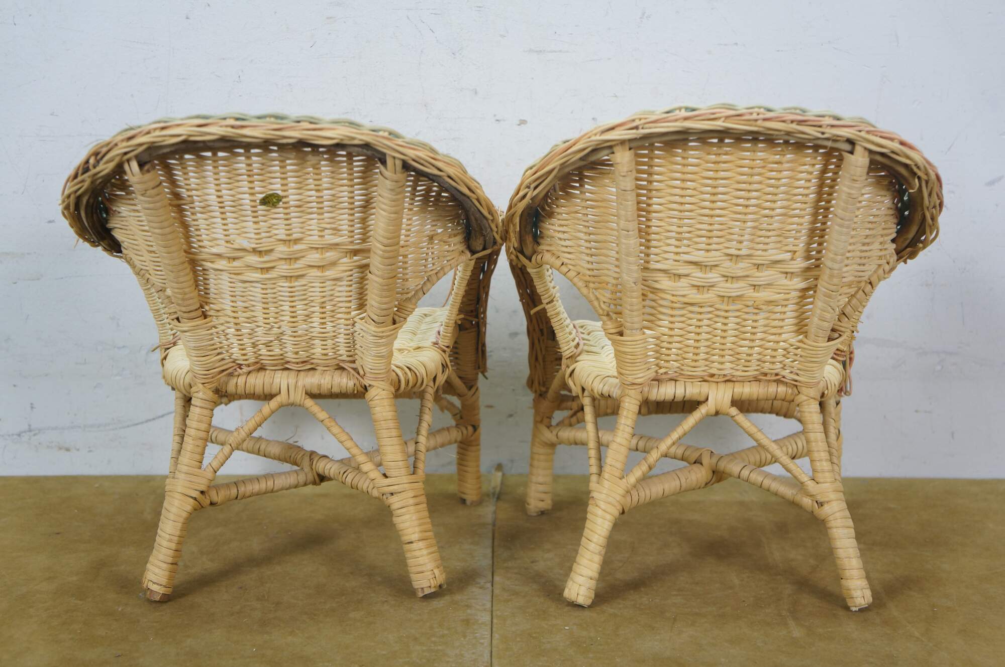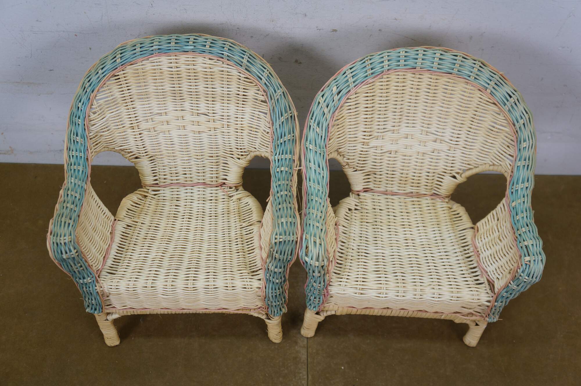 Pair of late 20th century doll sized woven wicker barrel back armchairs - white with pink and blue trim. Made in China.