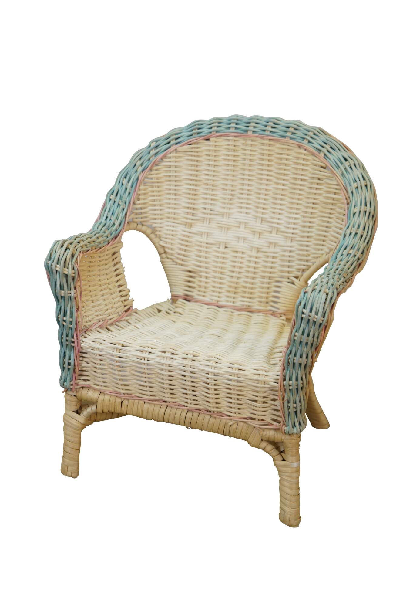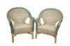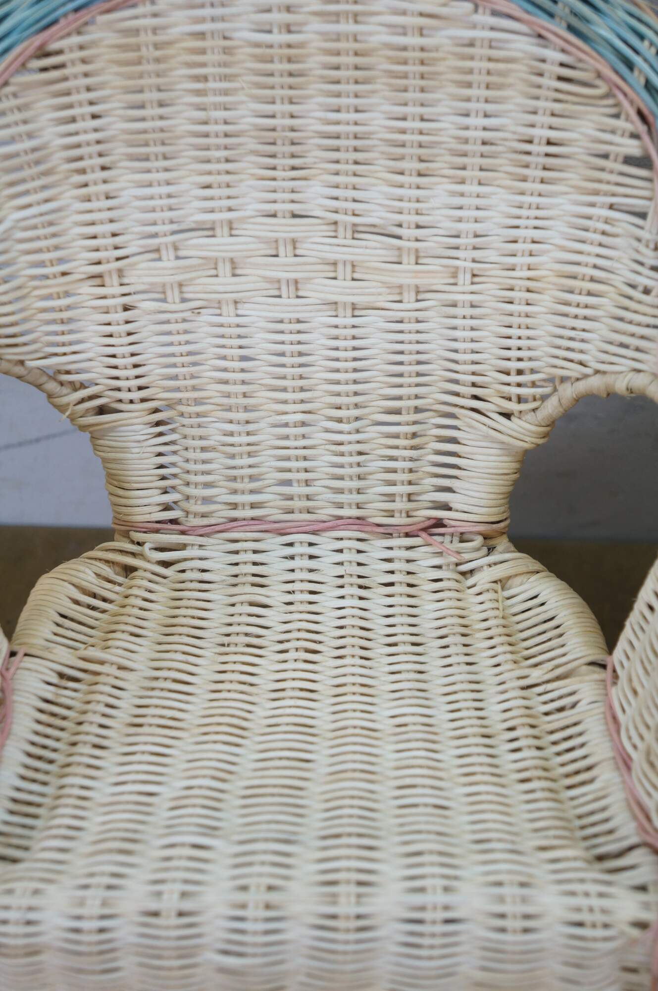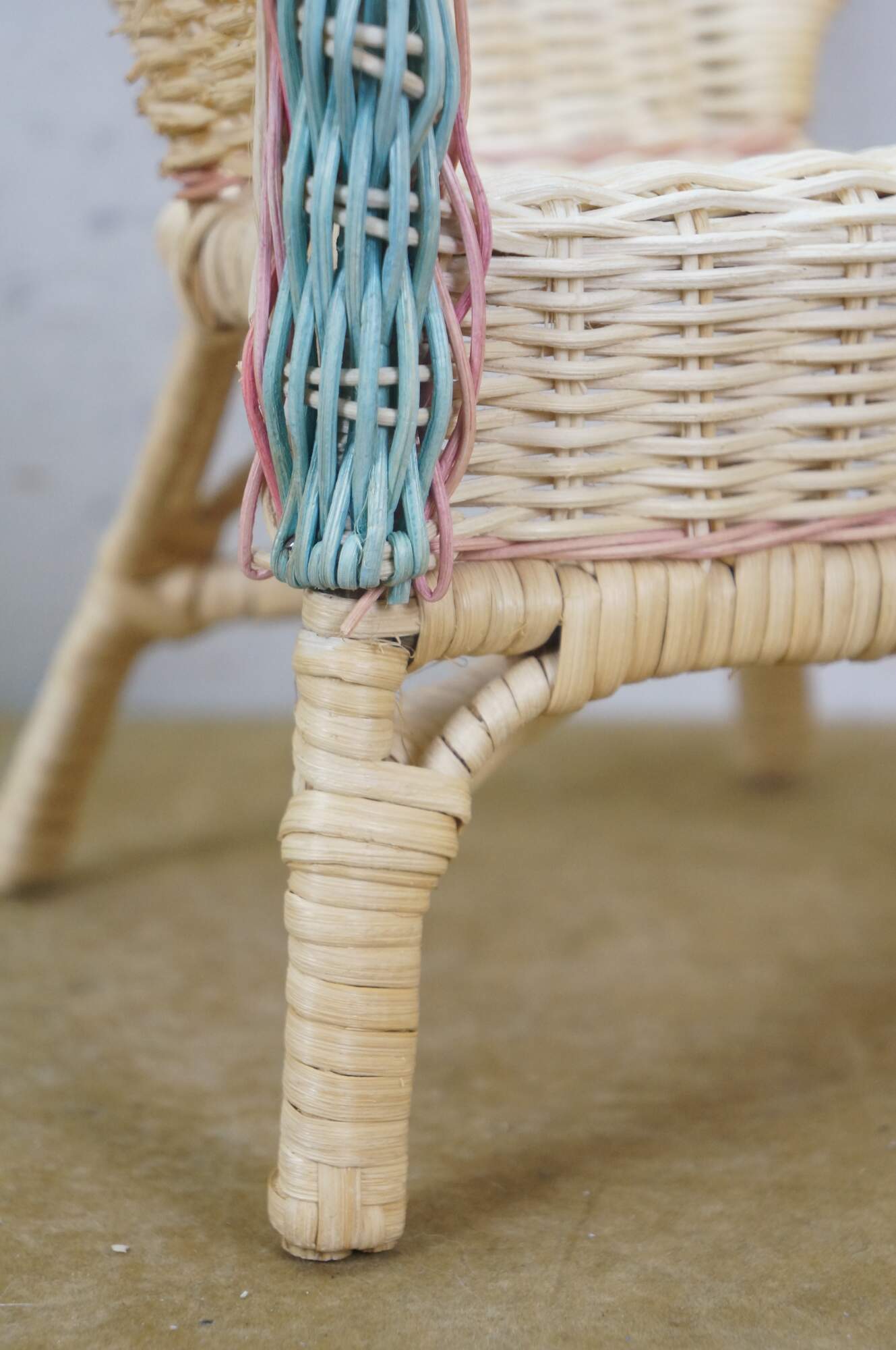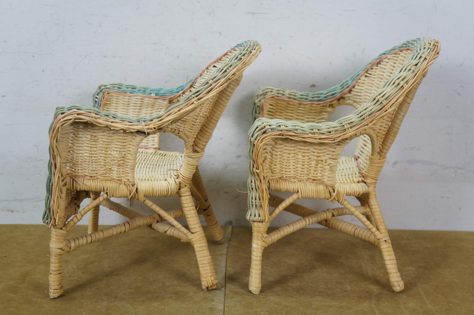 Pair of late 20th century doll sized woven wicker barrel back armchairs - white with pink and blue trim. Made in China.
