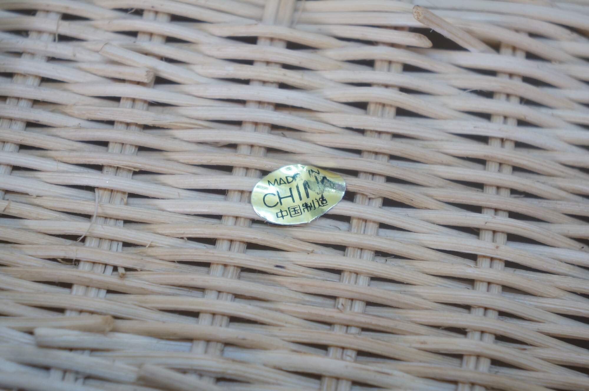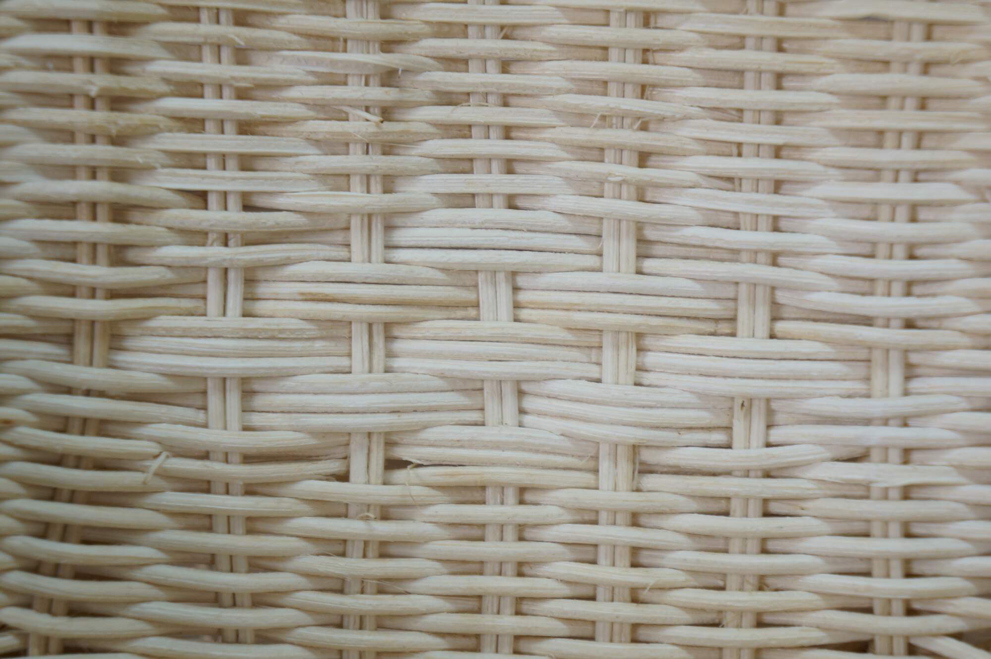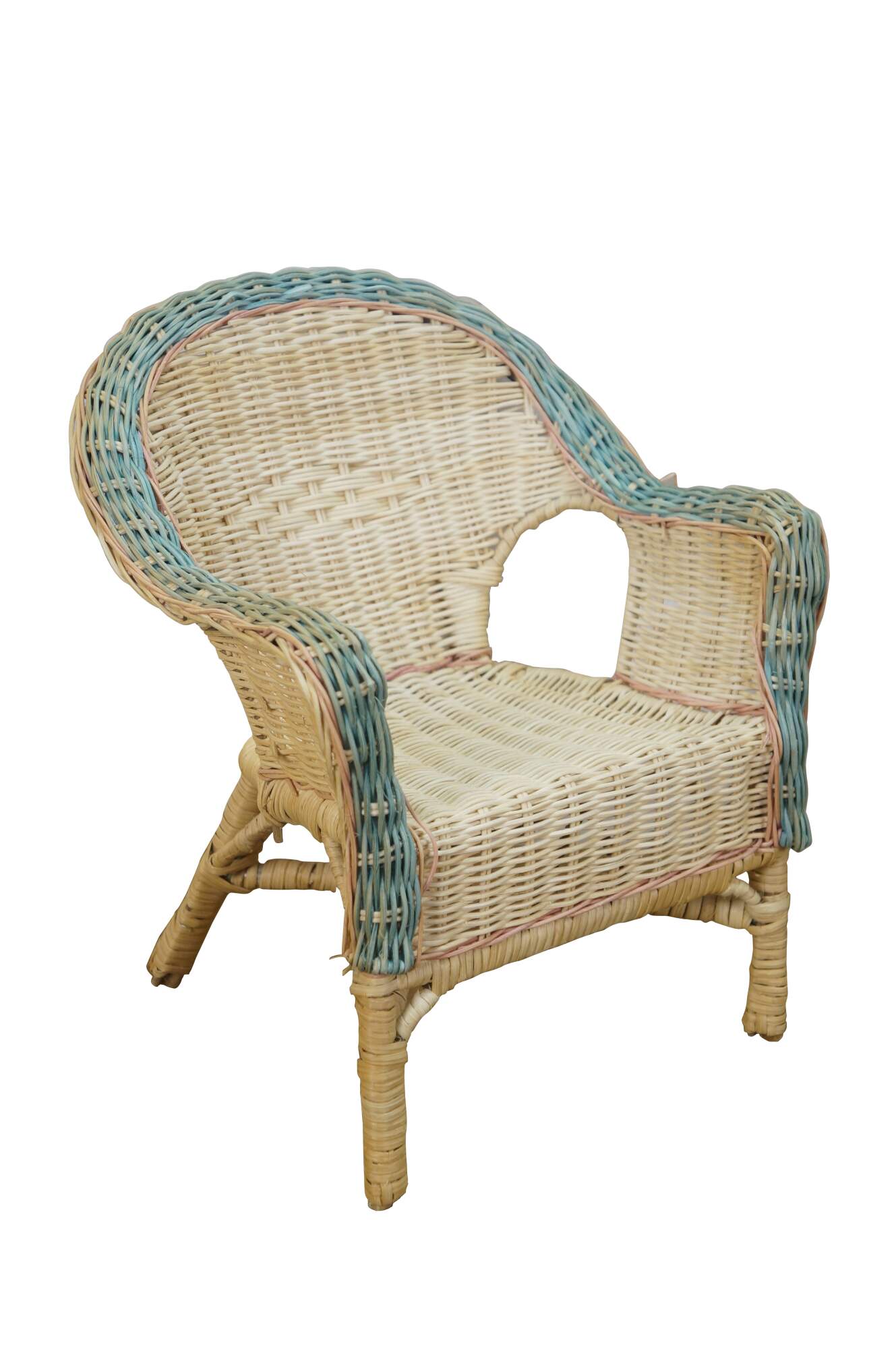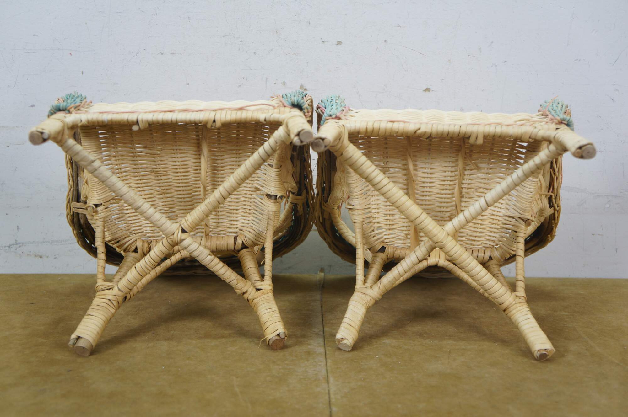 Pair of late 20th century doll sized woven wicker barrel back armchairs - white with pink and blue trim. Made in China.
