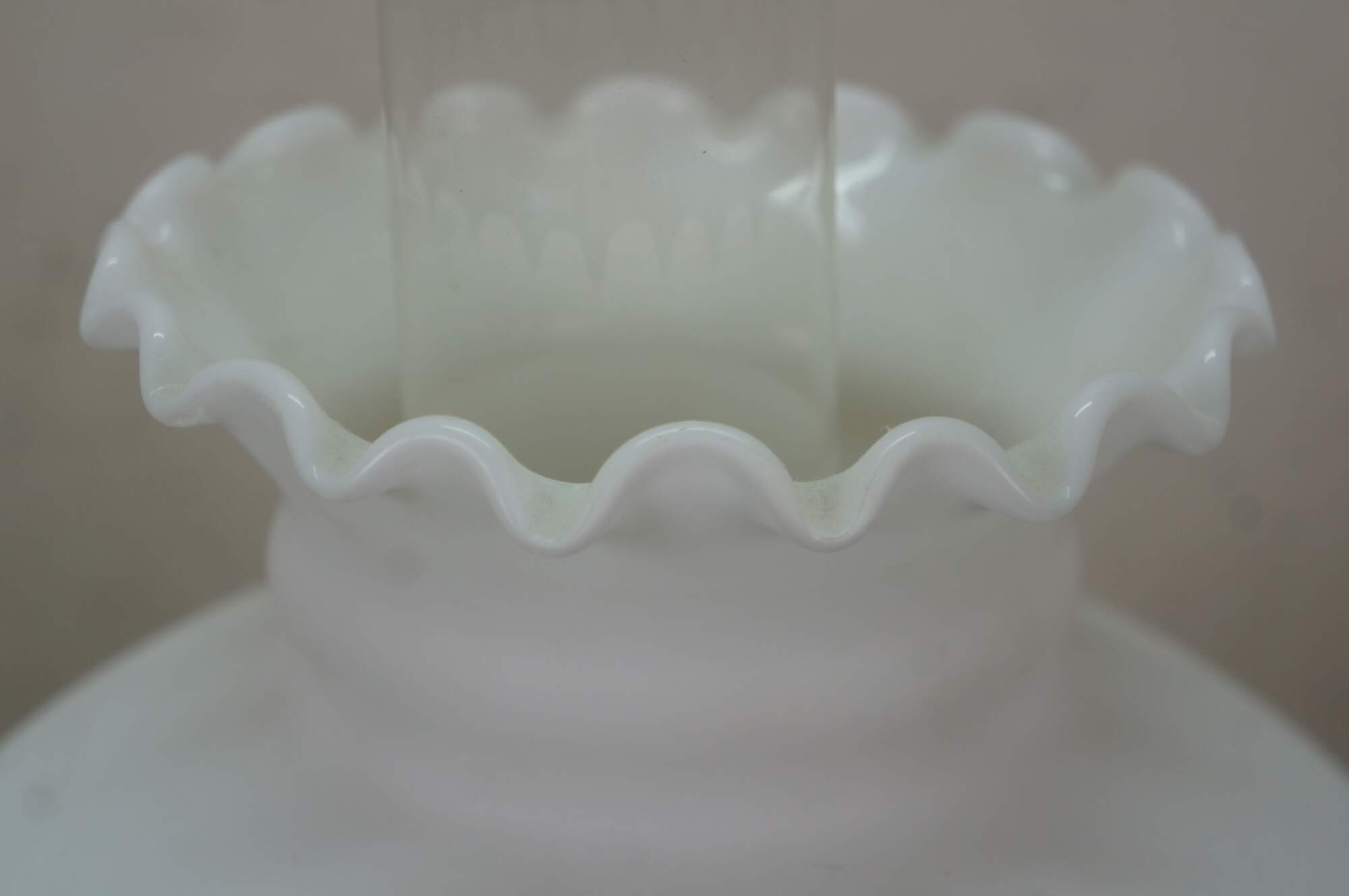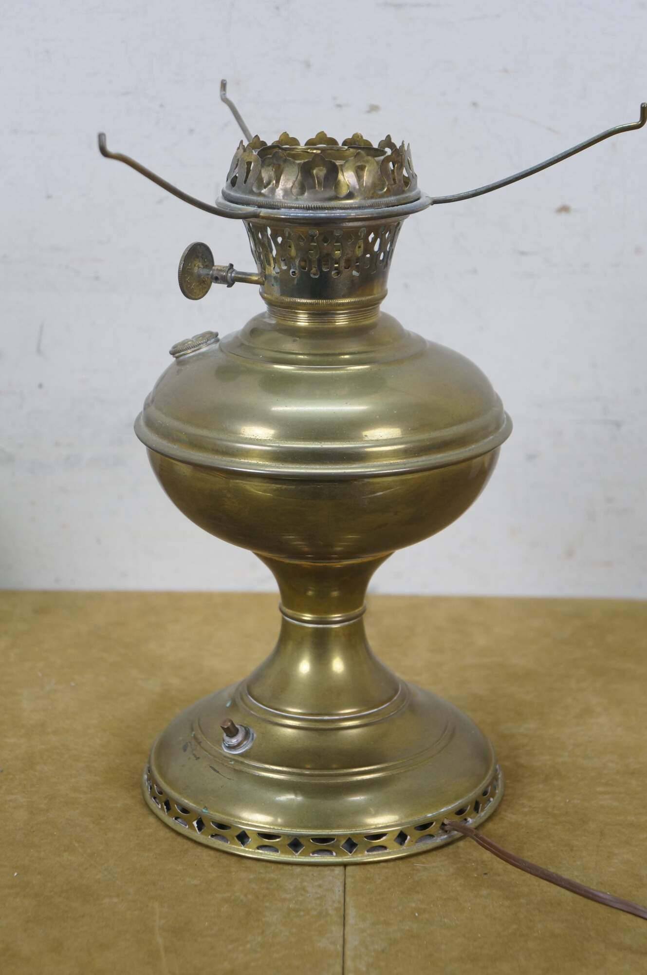 Early 20th century Mantle Lamp company Aladdin brass oil lamp with hurricane and matte milk glass shade with ruffled top. Converted to electric with push button switch.