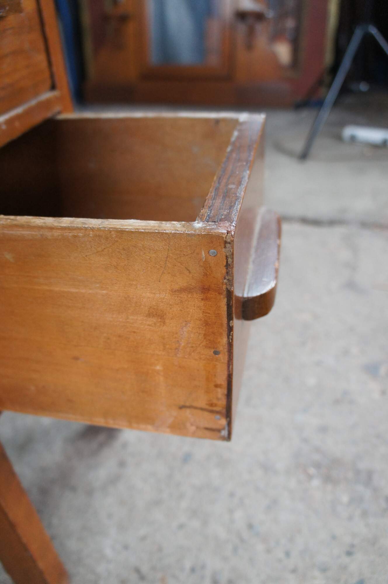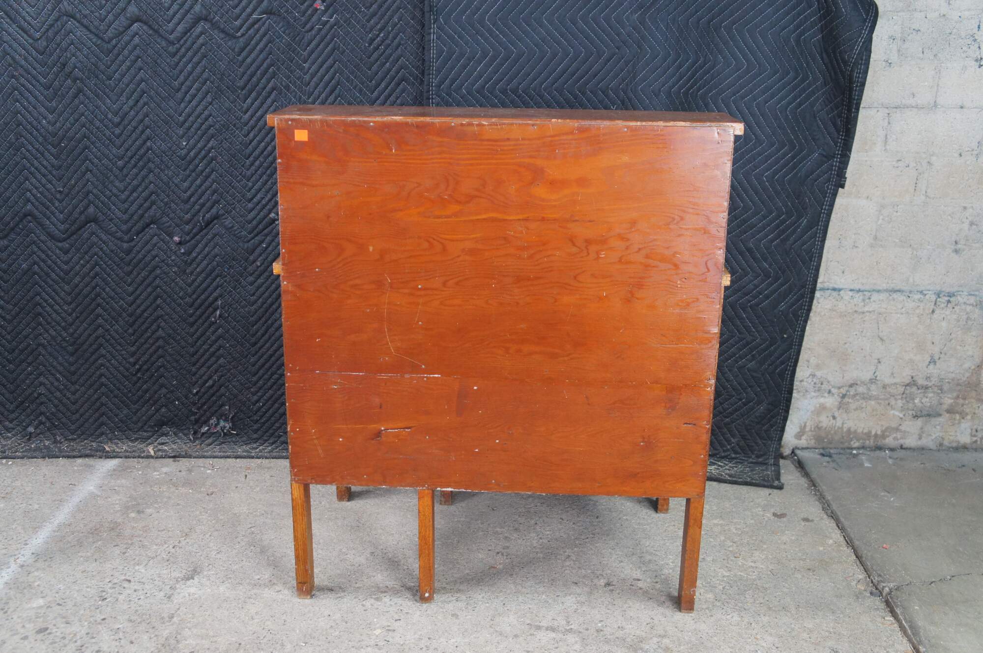 Victorian childs roll top writing desk featuring two drawers, a writing slide, a half cylinder roll top and interior cubbies.
