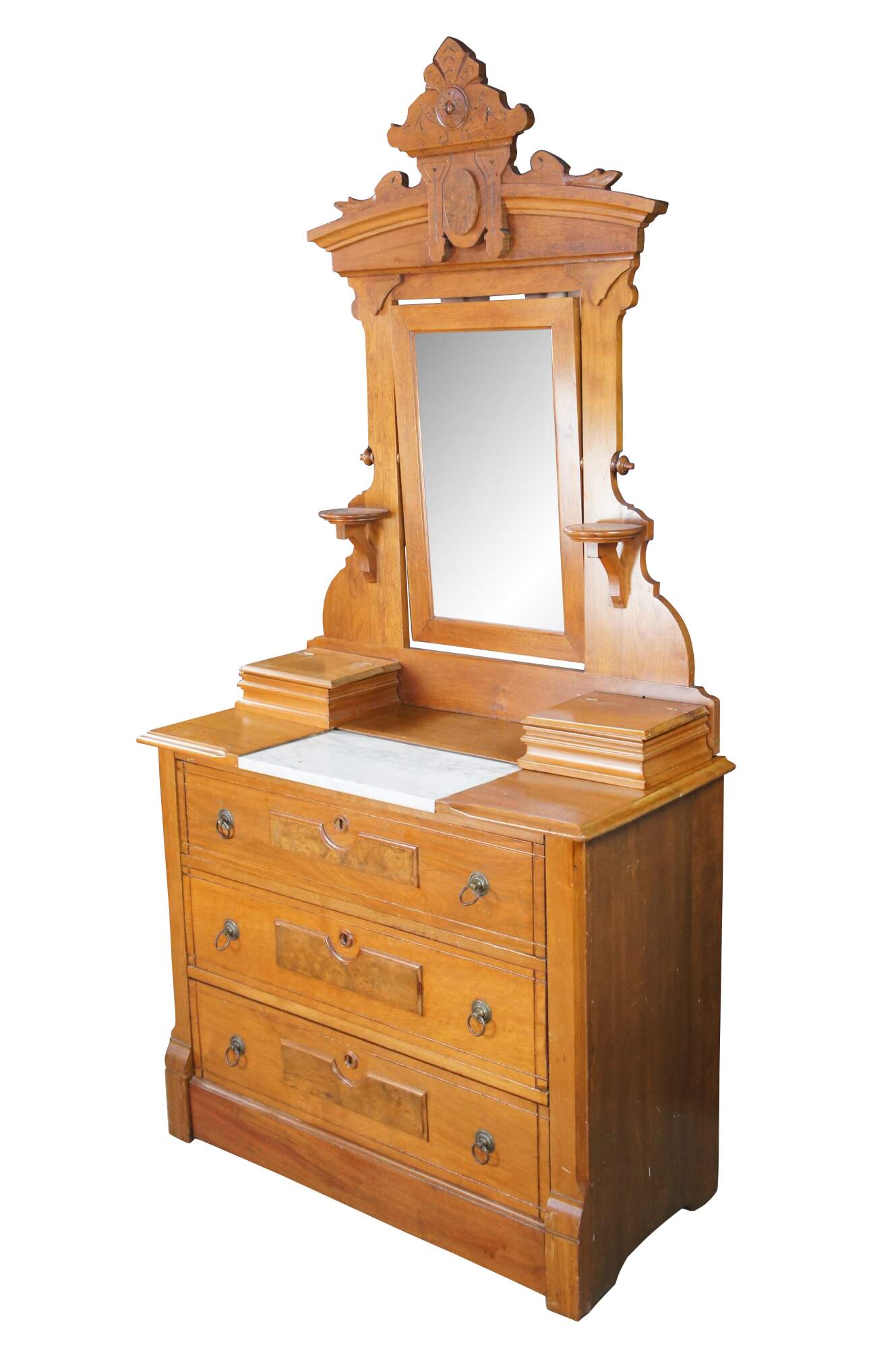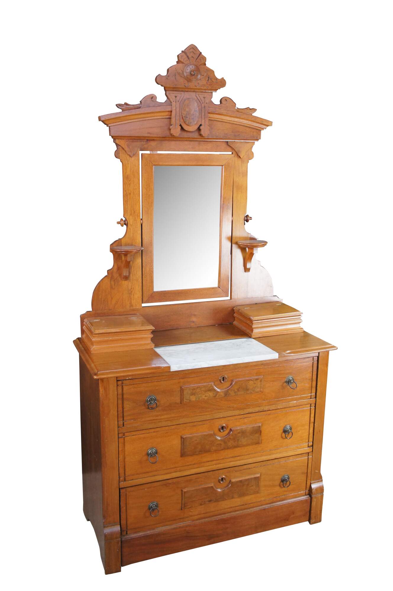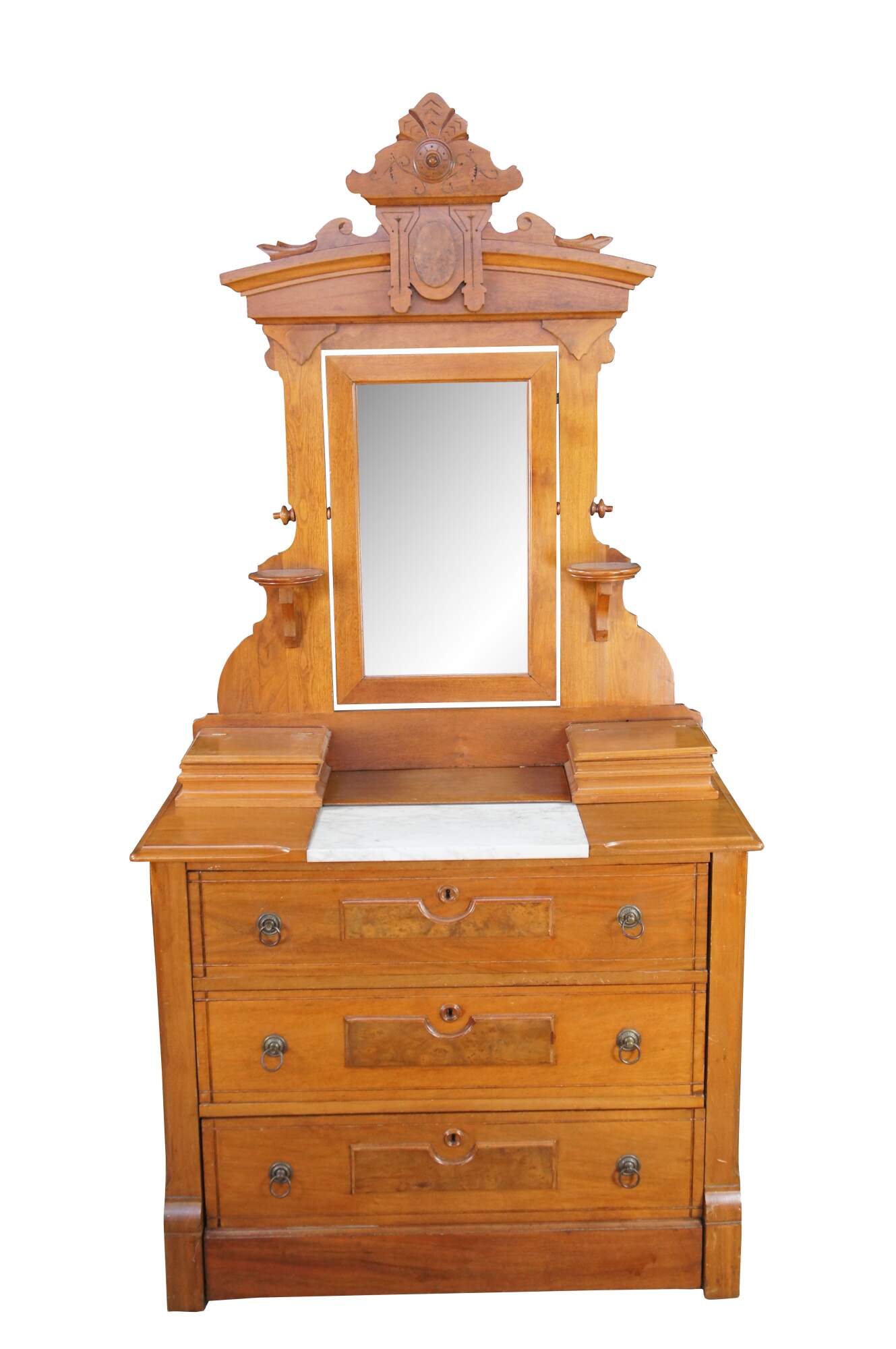 A beautiful Late Victorian Eastlake Dresser and Mirror, circa 1880. The case is made from walnut with three lower drawers featuring burled front molding, brass hardware and Charles Knapp Joinery. The mirror portion showcases beautiful Eastlake carved molding, an adjustable mirror flanked by corbel shelves and glove boxes set around a marble insert at the bases.