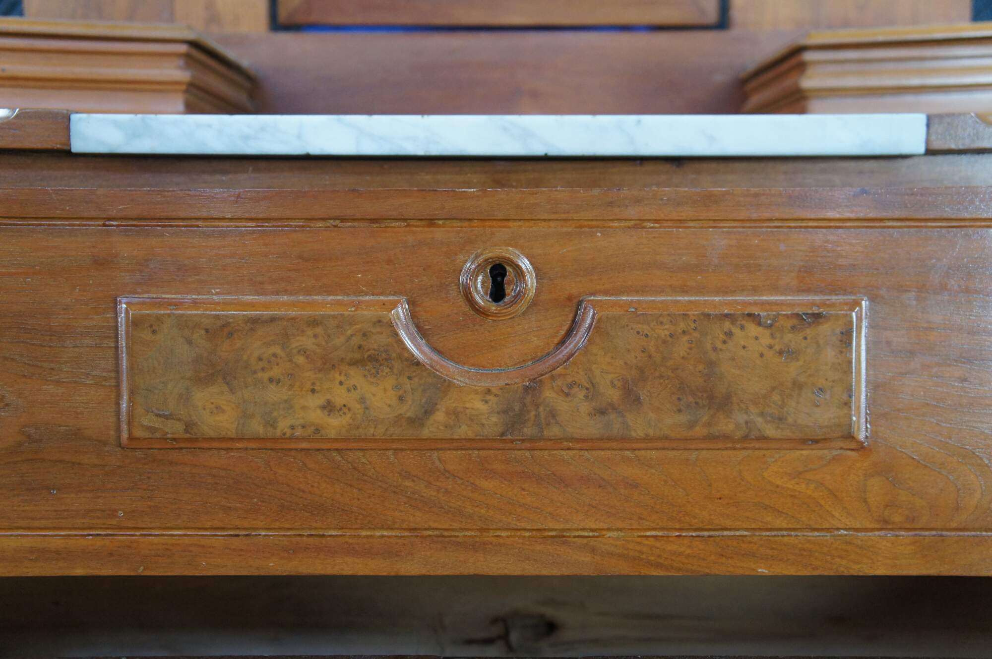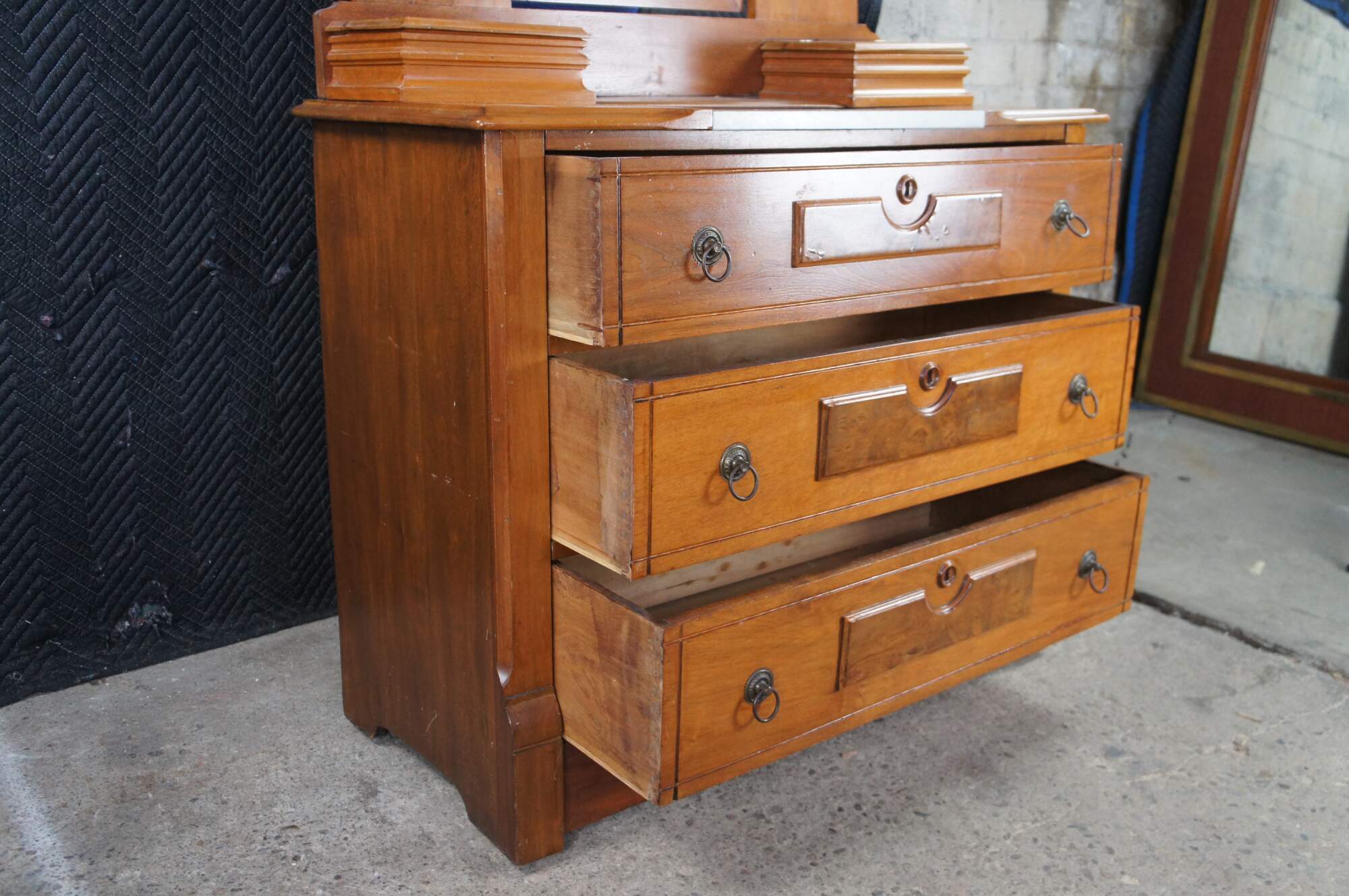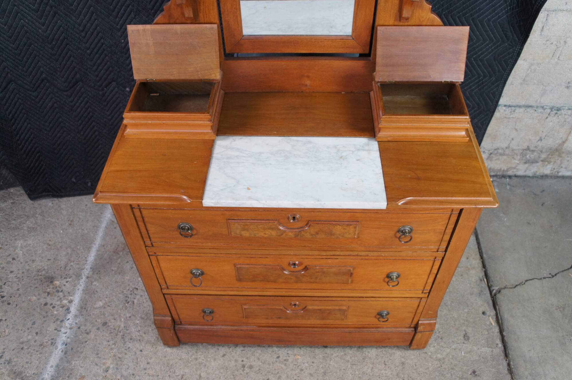 A beautiful Late Victorian Eastlake Dresser and Mirror, circa 1880. The case is made from walnut with three lower drawers featuring burled front molding, brass hardware and Charles Knapp Joinery. The mirror portion showcases beautiful Eastlake carved molding, an adjustable mirror flanked by corbel shelves and glove boxes set around a marble insert at the bases.