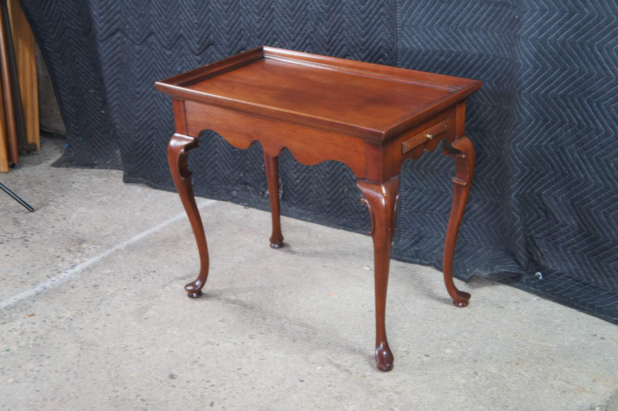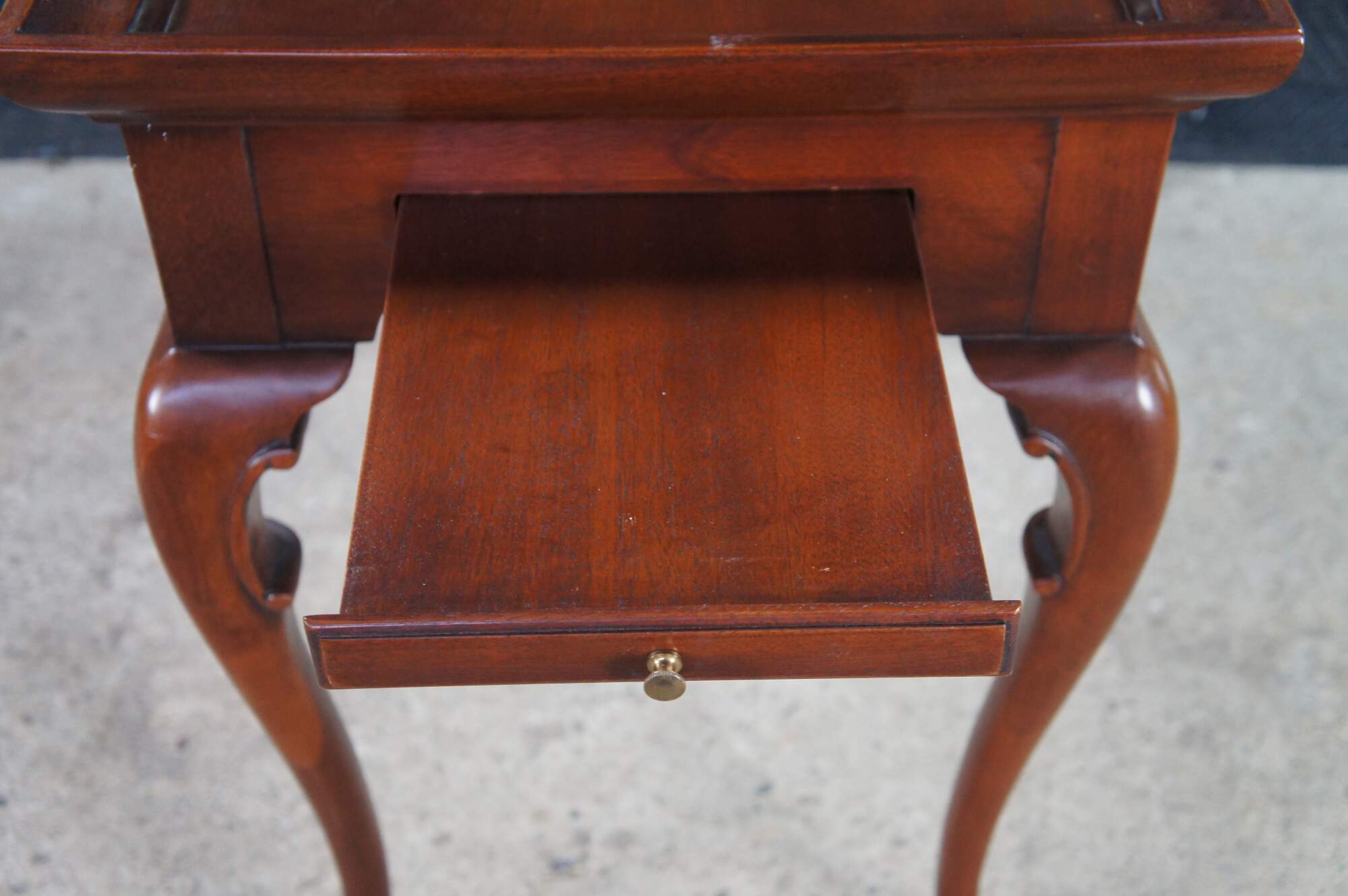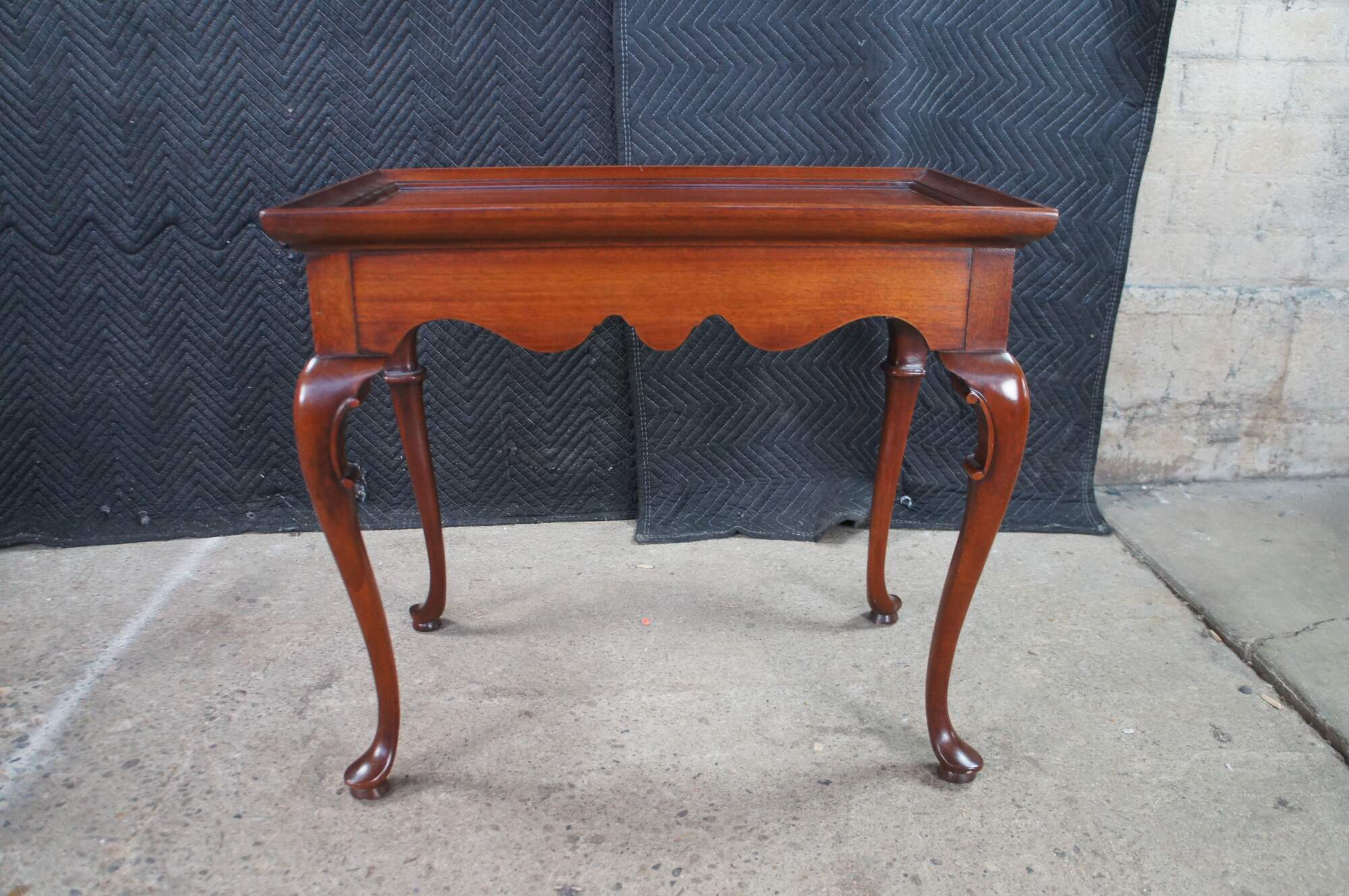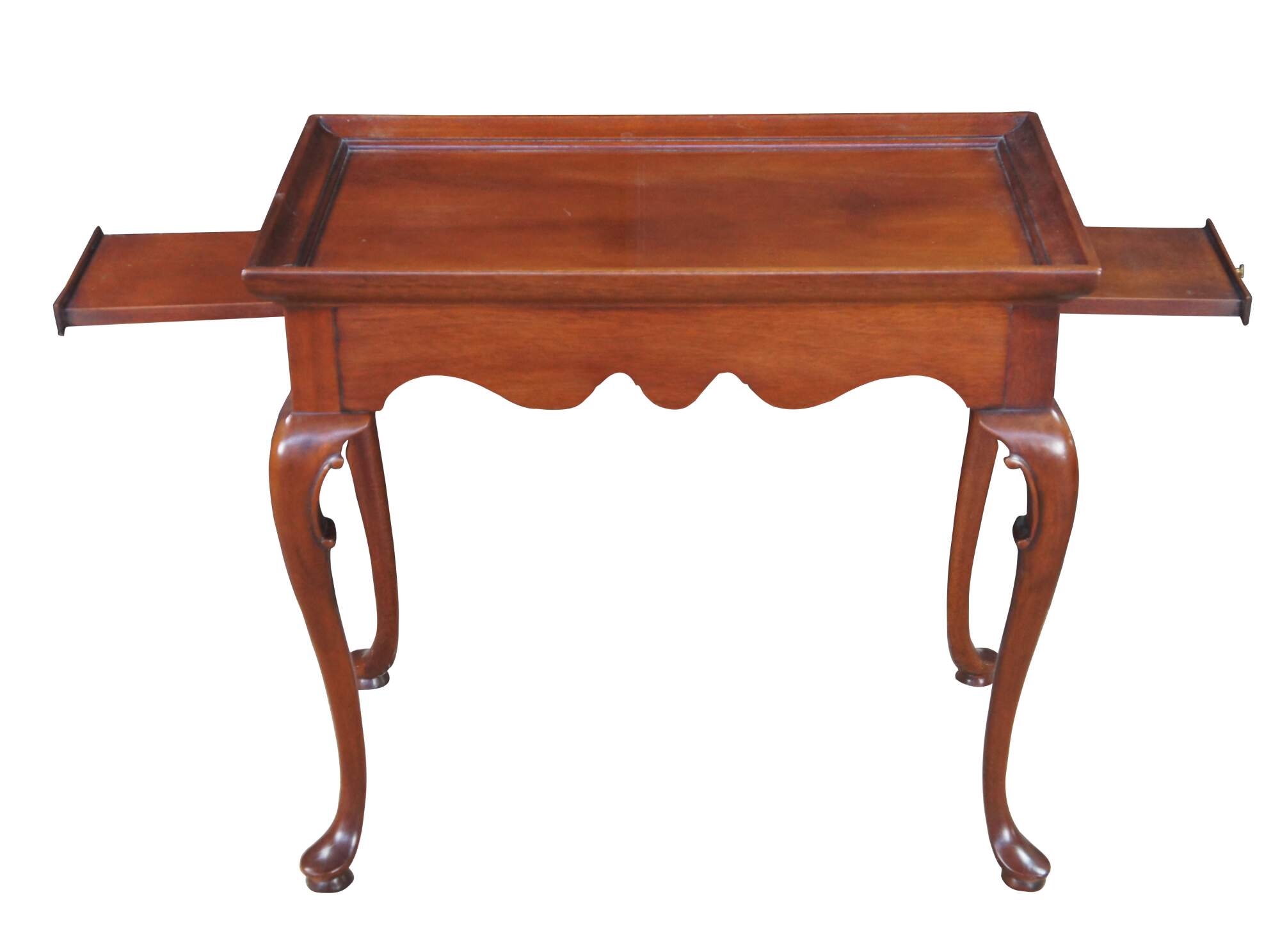 Vintage solid mahogany Queen Anne style tea table or side table, including graceful cabriole legs with slipper feet, serpentine apron and a raised gallery top. The table includes two pull out trays (often called candle slides).