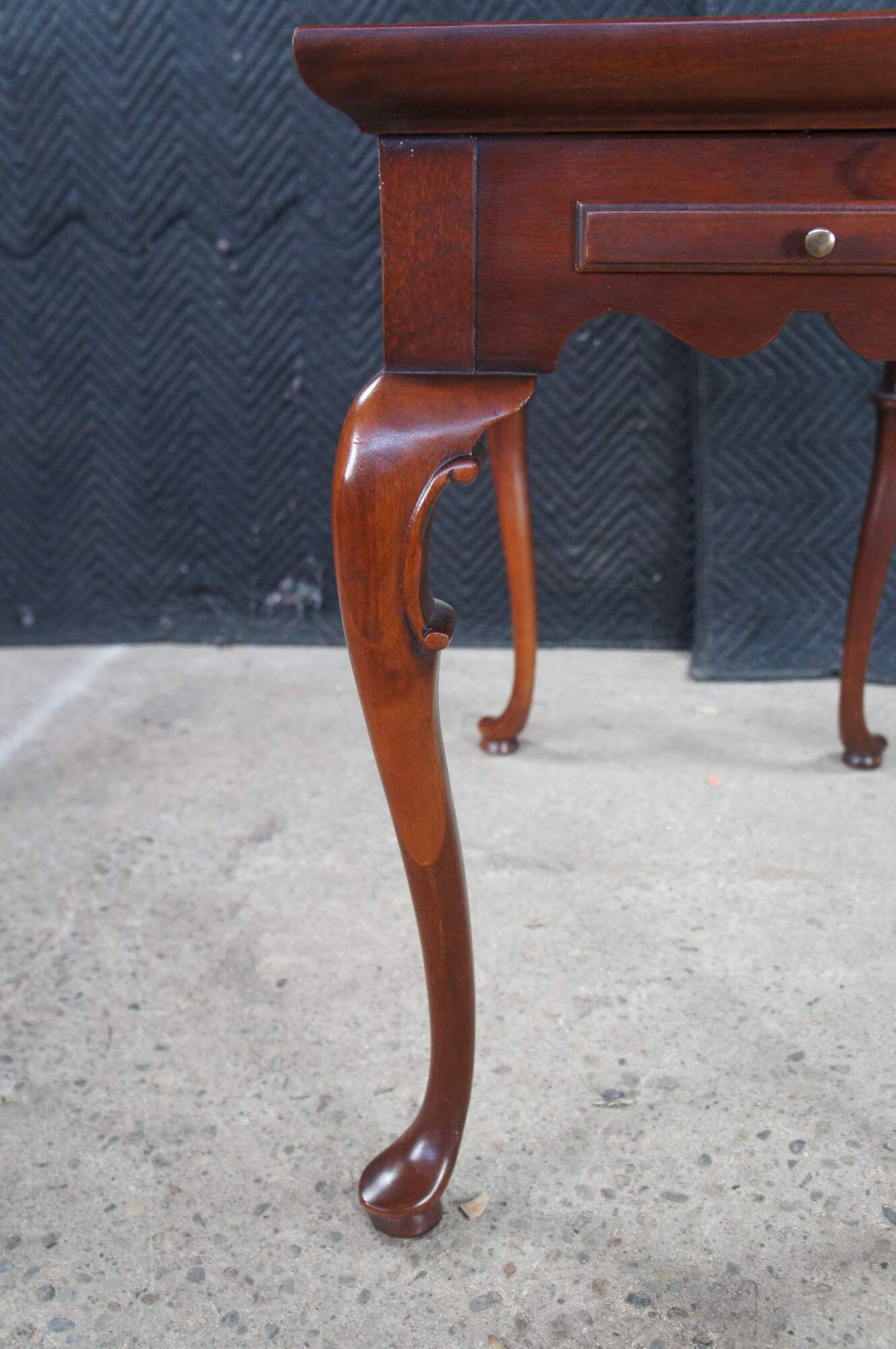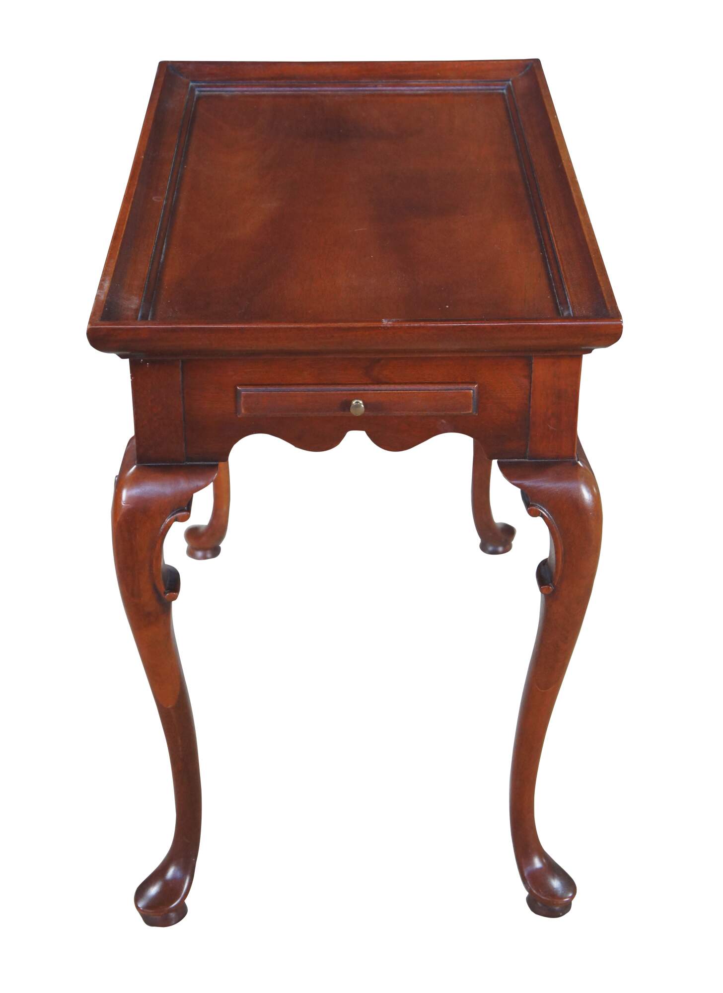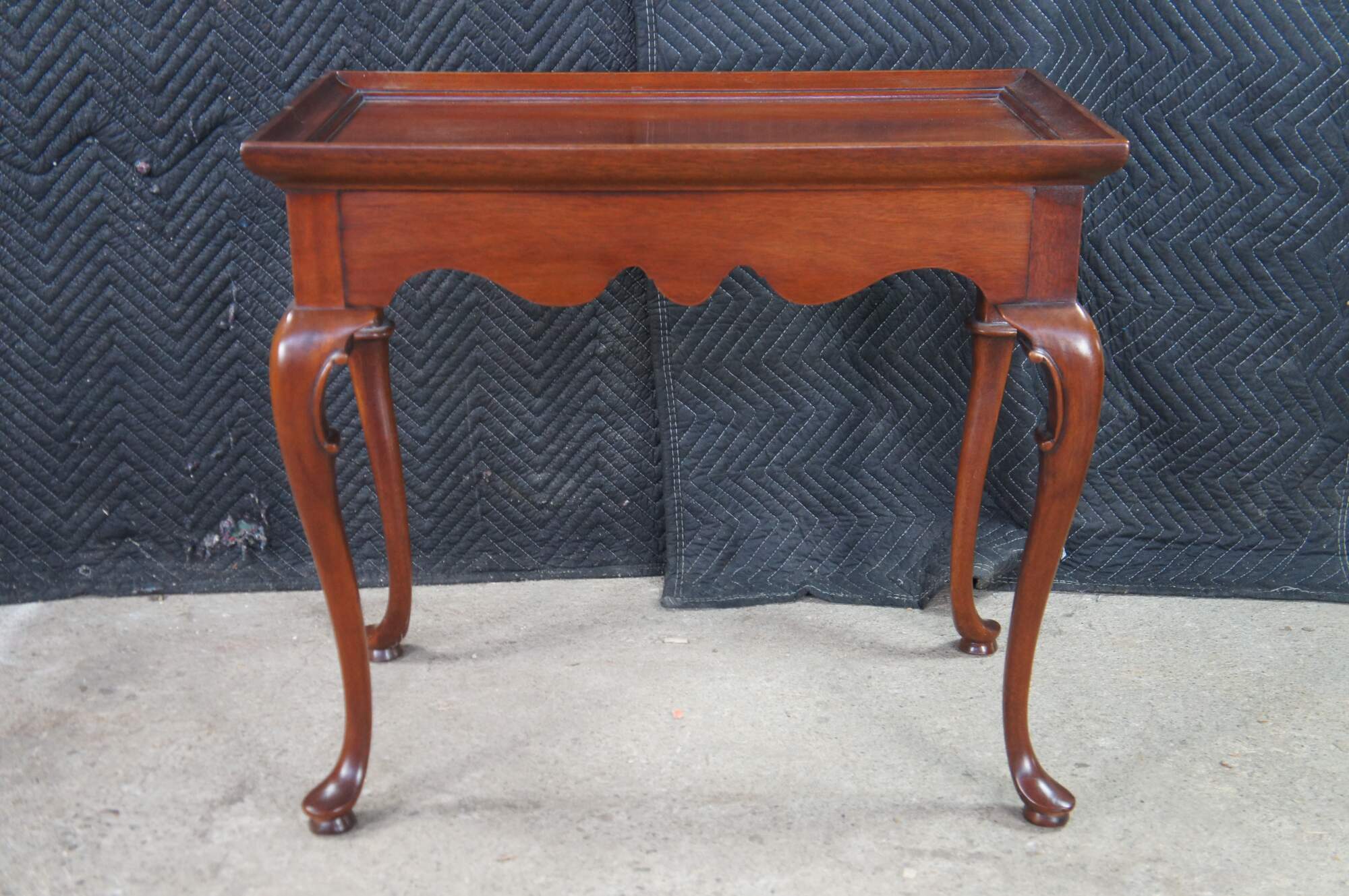 Vintage solid mahogany Queen Anne style tea table or side table, including graceful cabriole legs with slipper feet, serpentine apron and a raised gallery top. The table includes two pull out trays (often called candle slides).