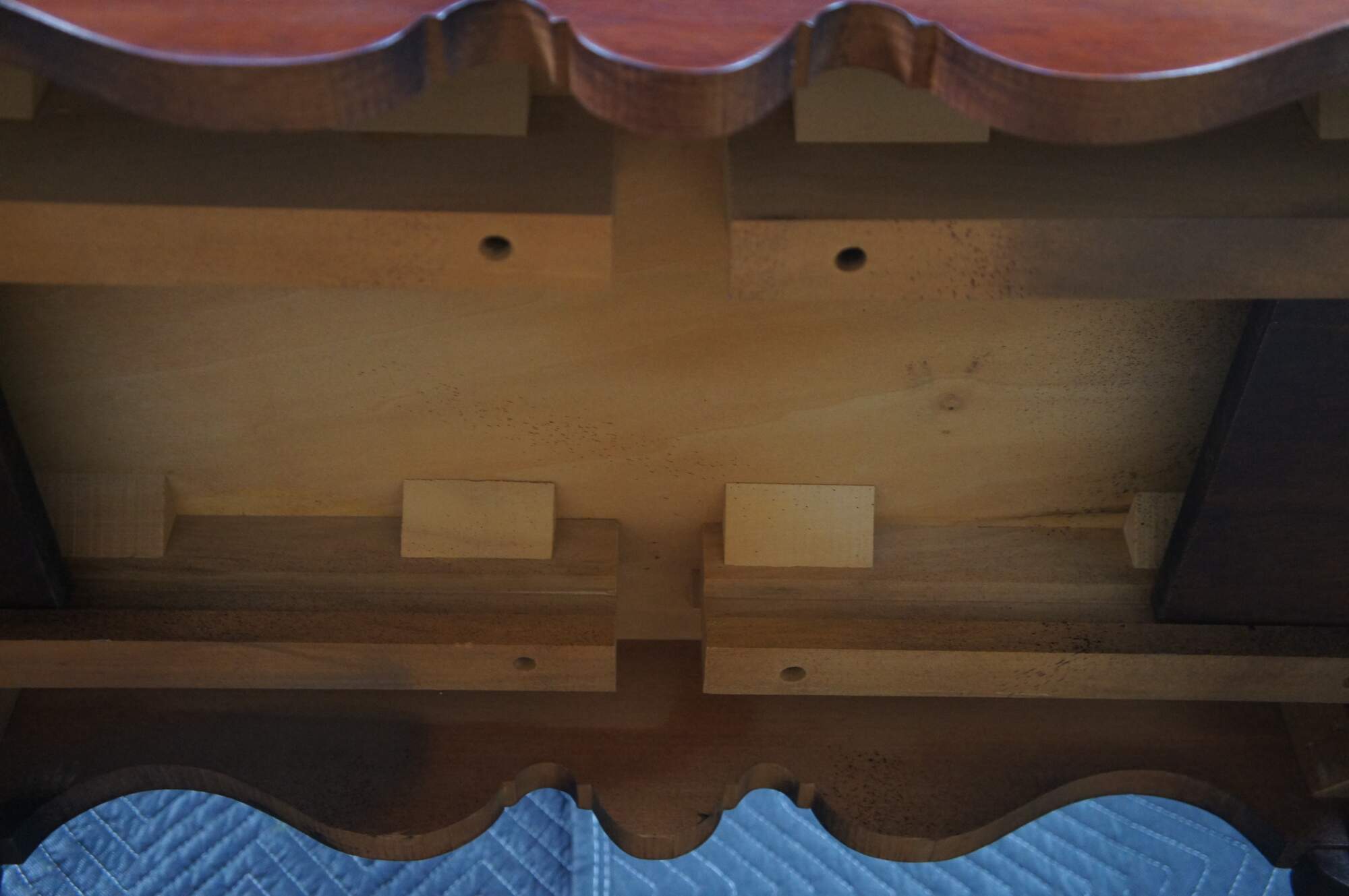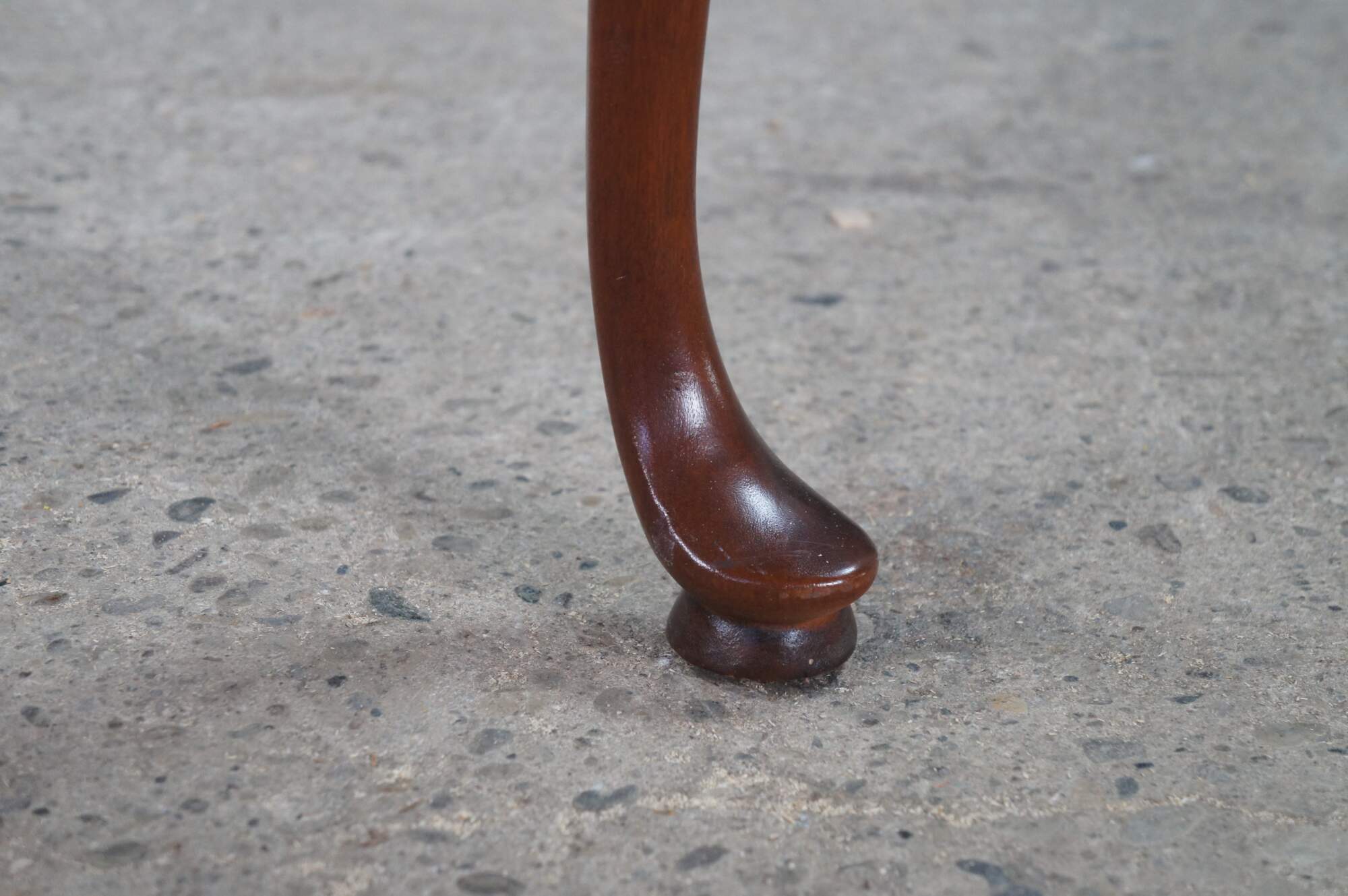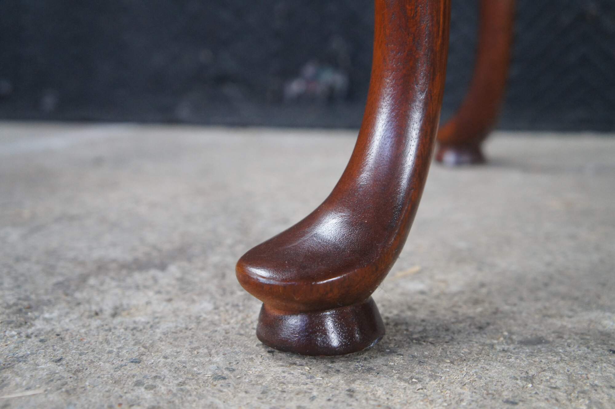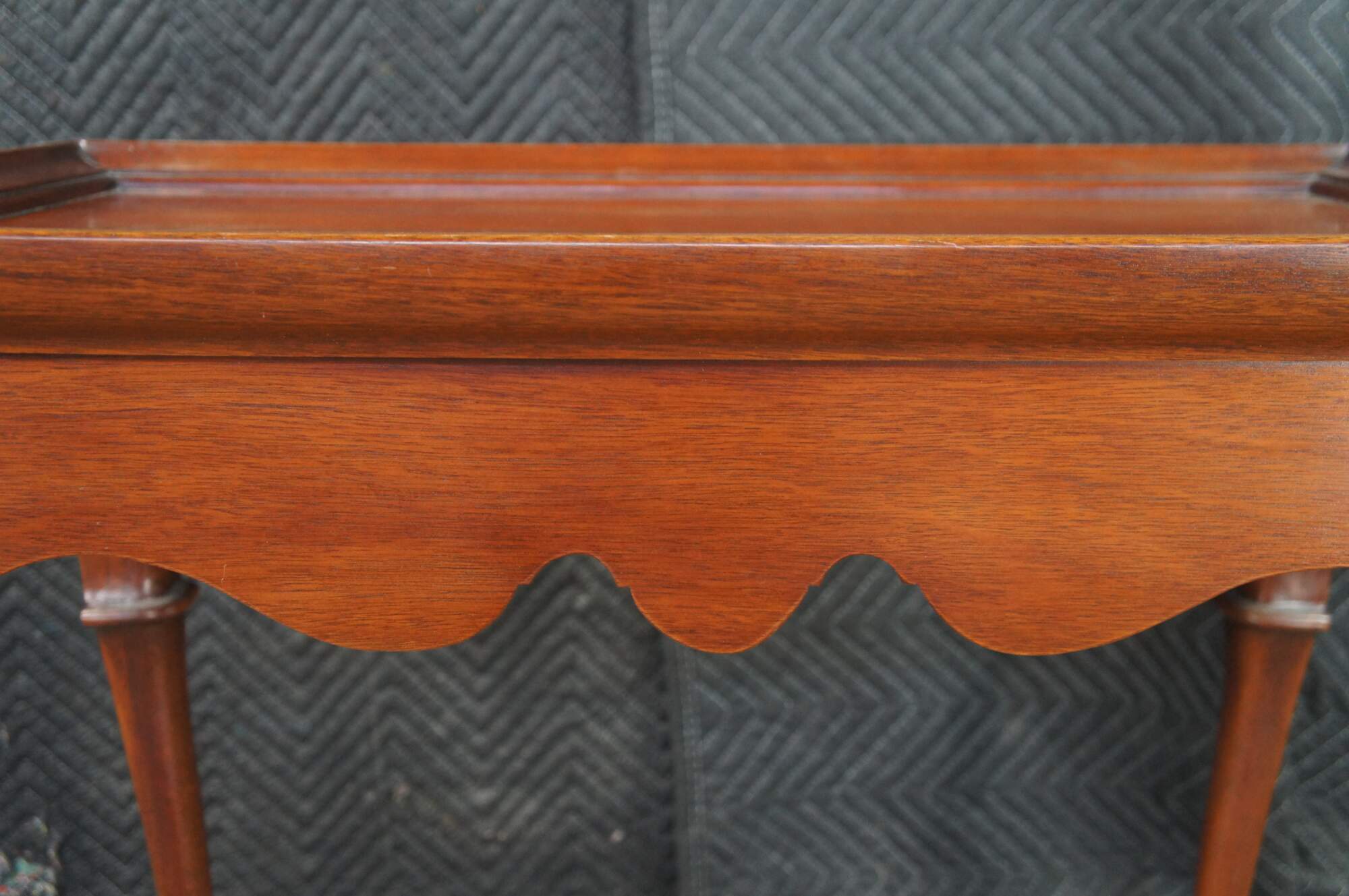 Vintage solid mahogany Queen Anne style tea table or side table, including graceful cabriole legs with slipper feet, serpentine apron and a raised gallery top. The table includes two pull out trays (often called candle slides).