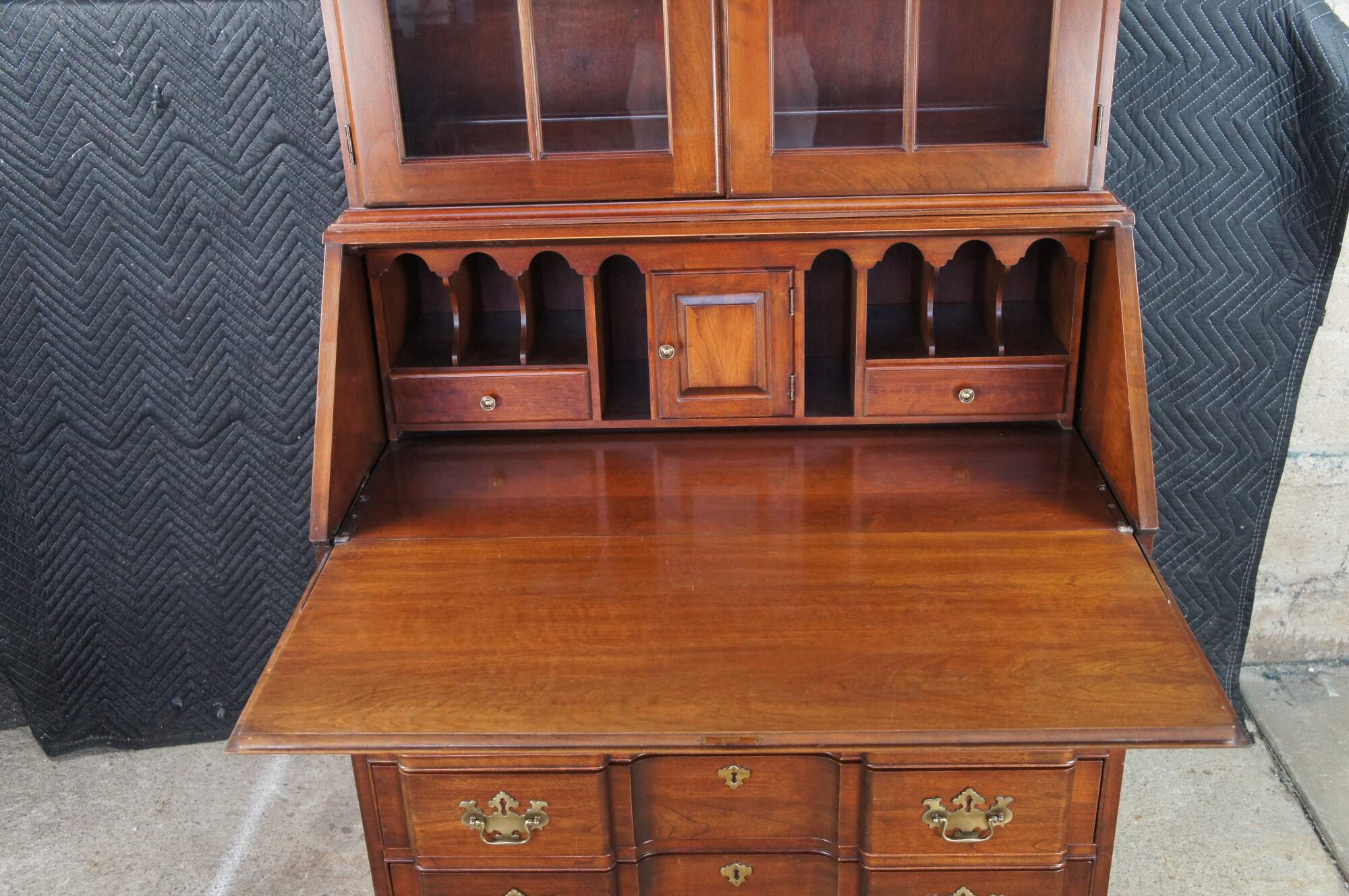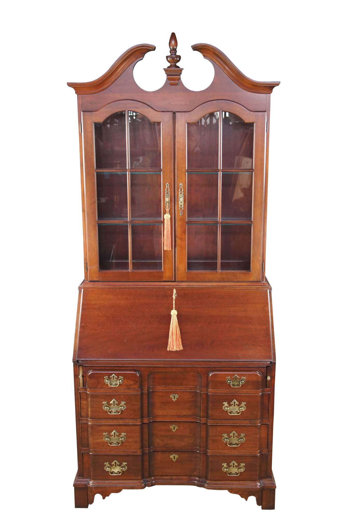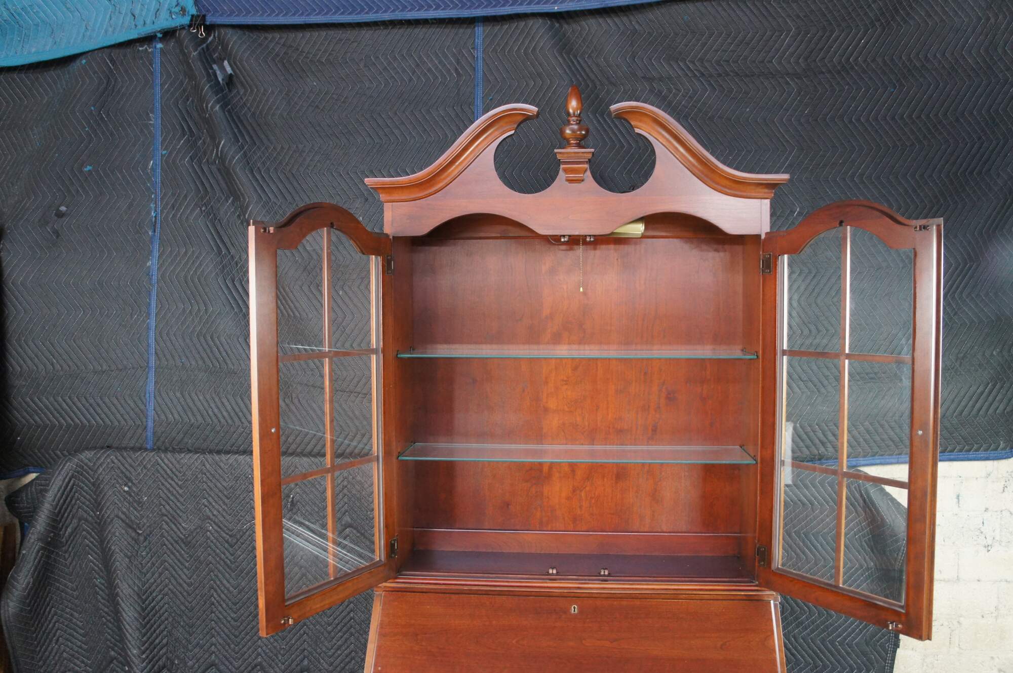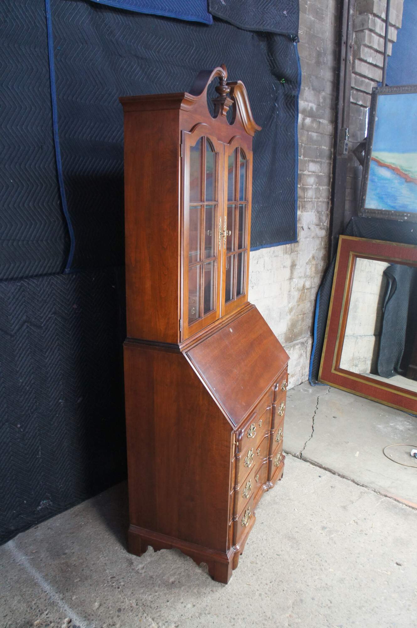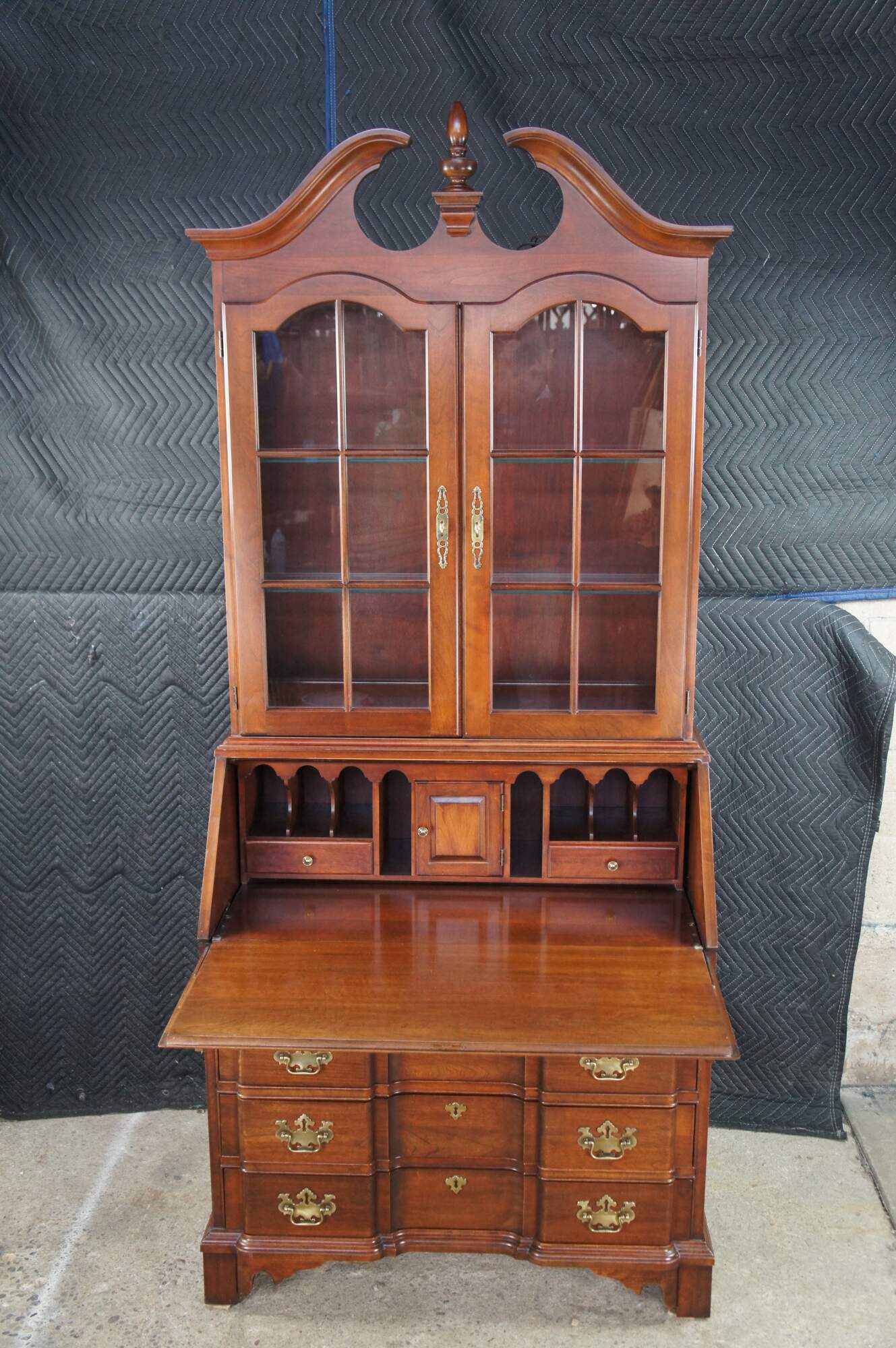 1970s Vintage Pennsylvania House English Chippendale style cherry block front secretary desk with curio bookcase. The desk features a slant or drop front writing surface that opens to multiple storage compartments, cubbies and mail slots. The top hutch features arched glass doors and open pediment with trophy final. Drawers showcase Federal brass brass batwin hardware and escutcheon plates. The case is supported by bracket feet.