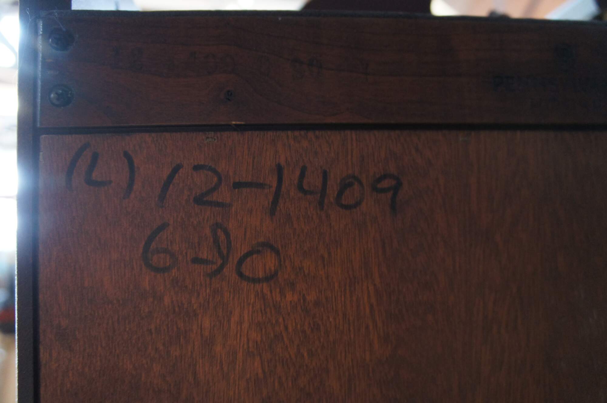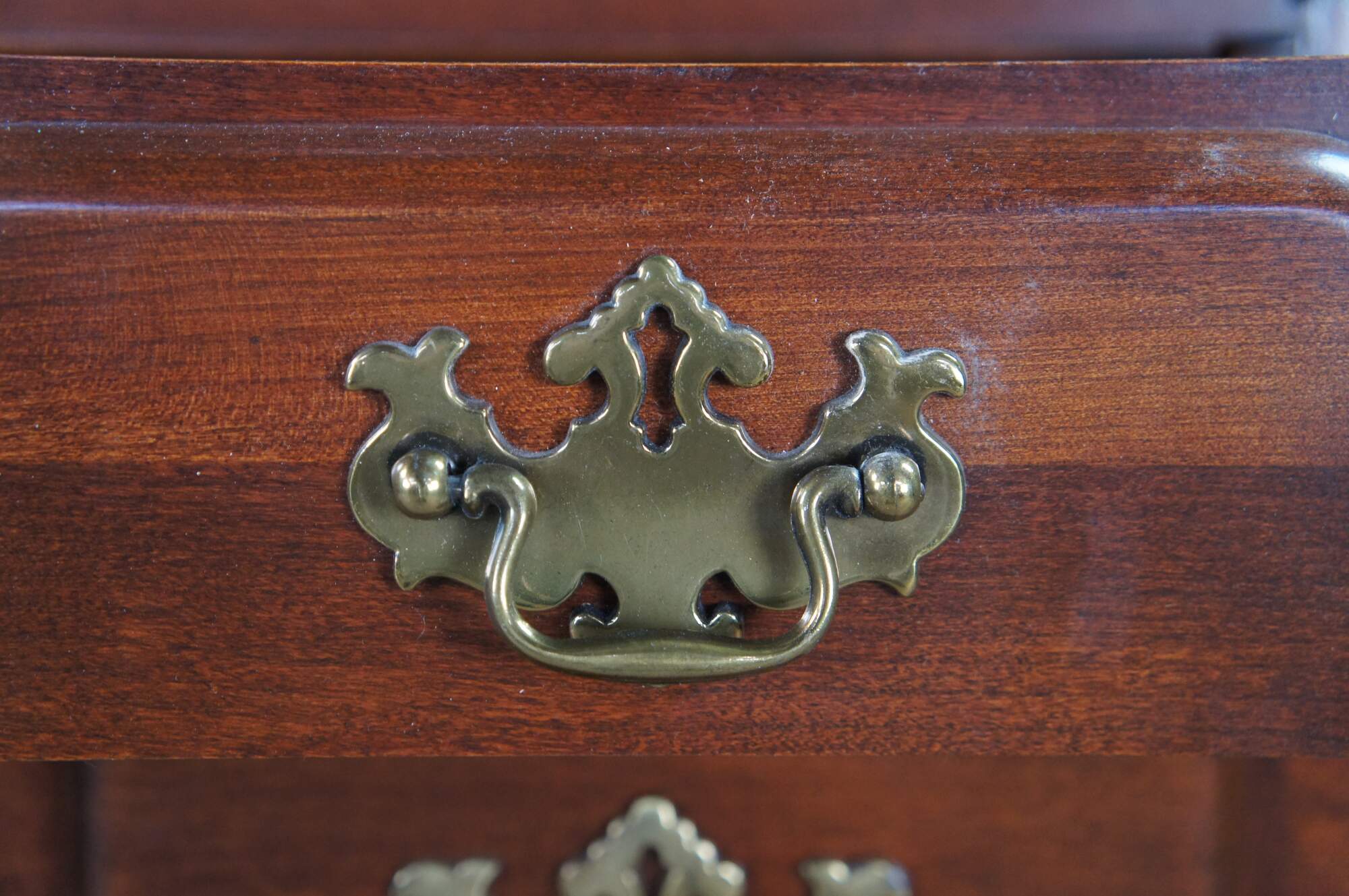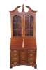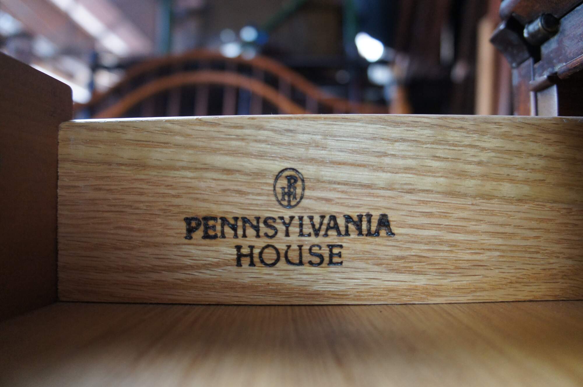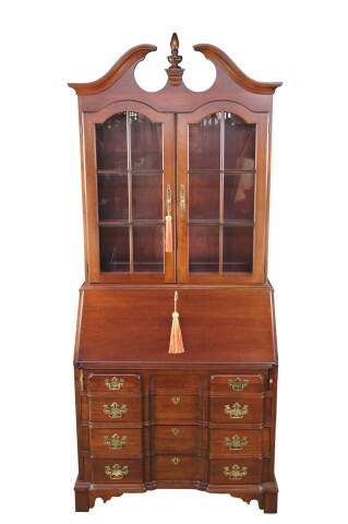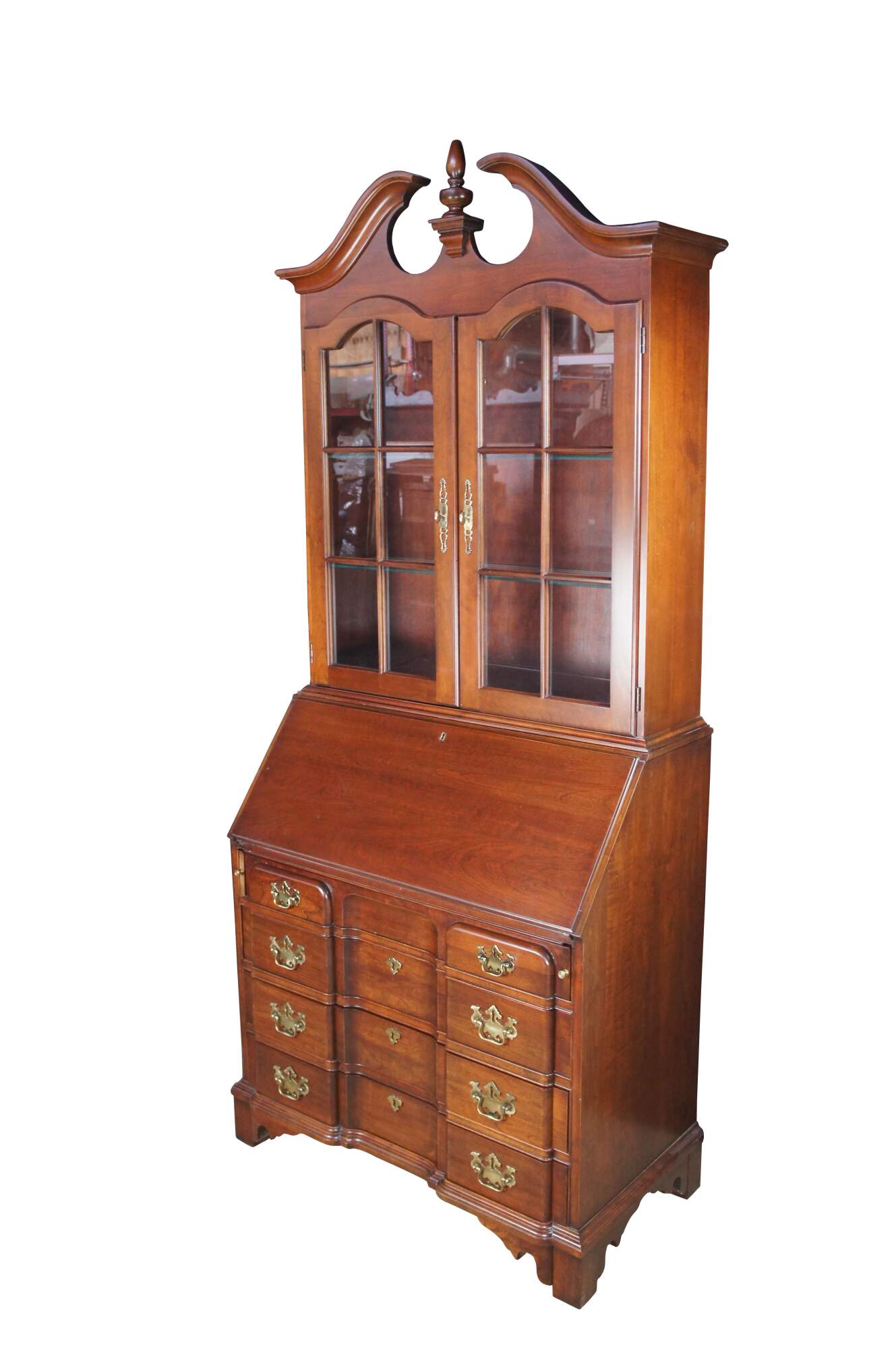 1970s Vintage Pennsylvania House English Chippendale style cherry block front secretary desk with curio bookcase. The desk features a slant or drop front writing surface that opens to multiple storage compartments, cubbies and mail slots. The top hutch features arched glass doors and open pediment with trophy final. Drawers showcase Federal brass brass batwin hardware and escutcheon plates. The case is supported by bracket feet.