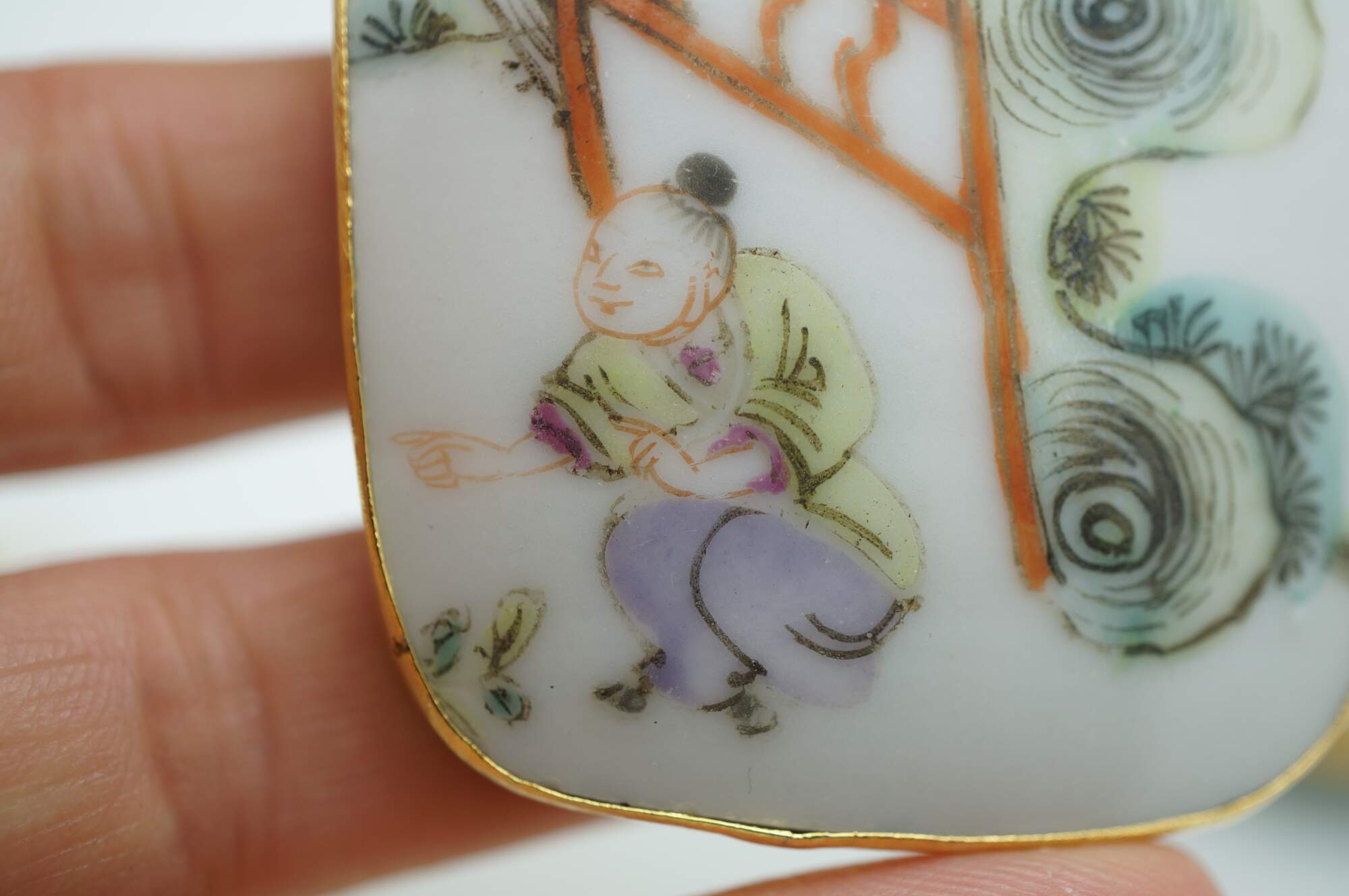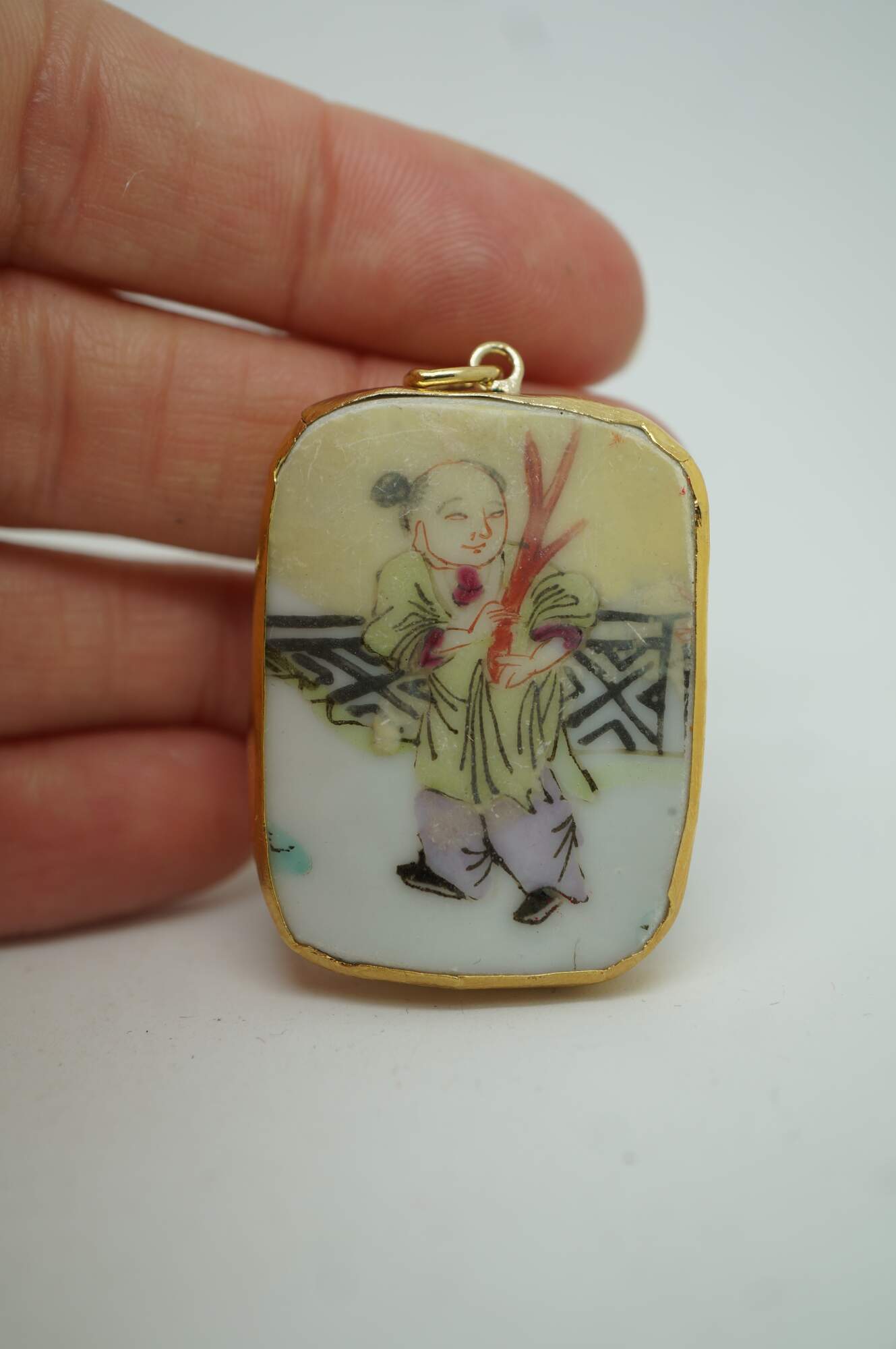 Antique 19th century Chinese porcelain shard amulet pendants, dating from the Qing Dynasty, set in 8k gold setting. The pendants are created from fragments (shards) of antique Chinese Famille Rose porcelain, which were highly valued and often repurposed into jewelry or decorative items. The hand-painted scenes depict figures in various garden / courtyard settings.