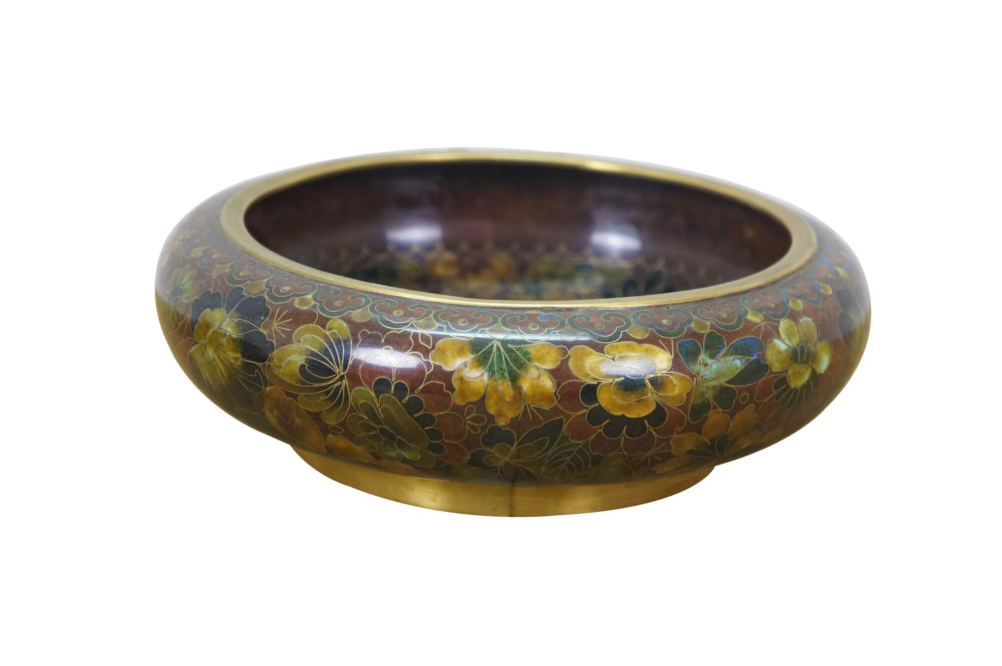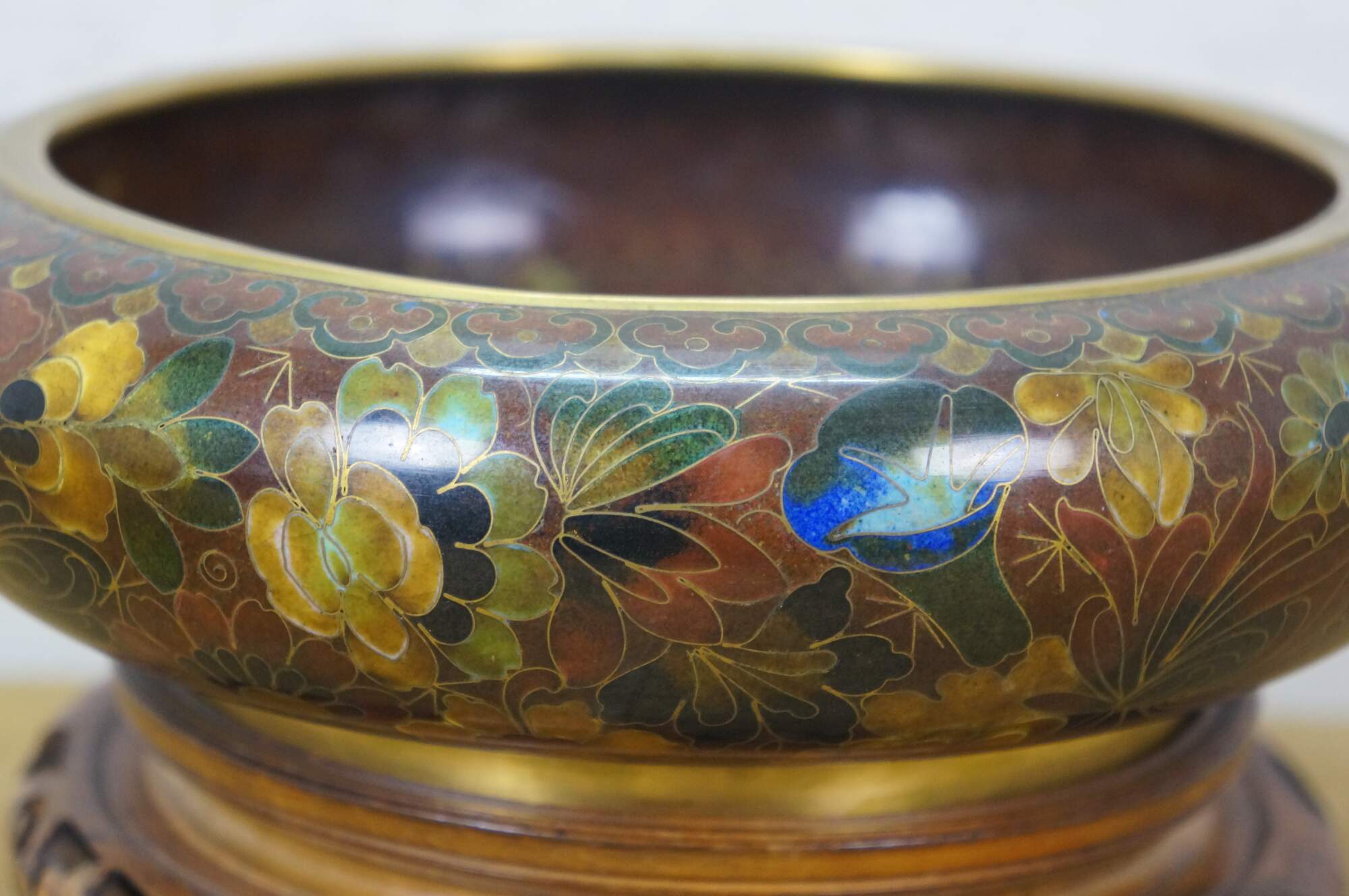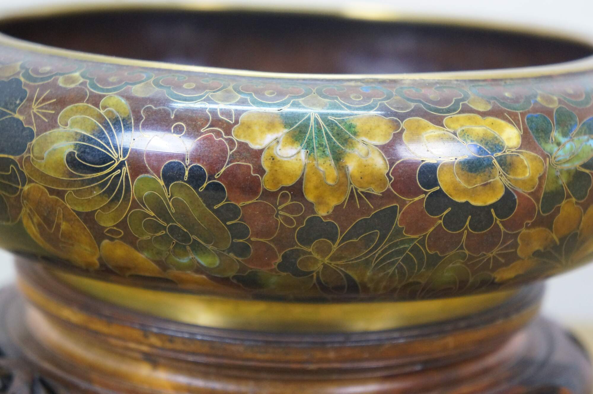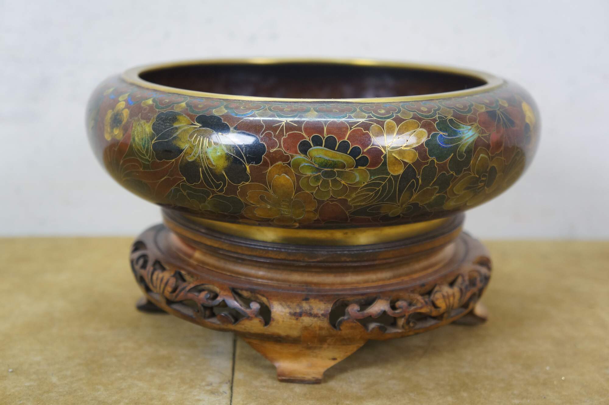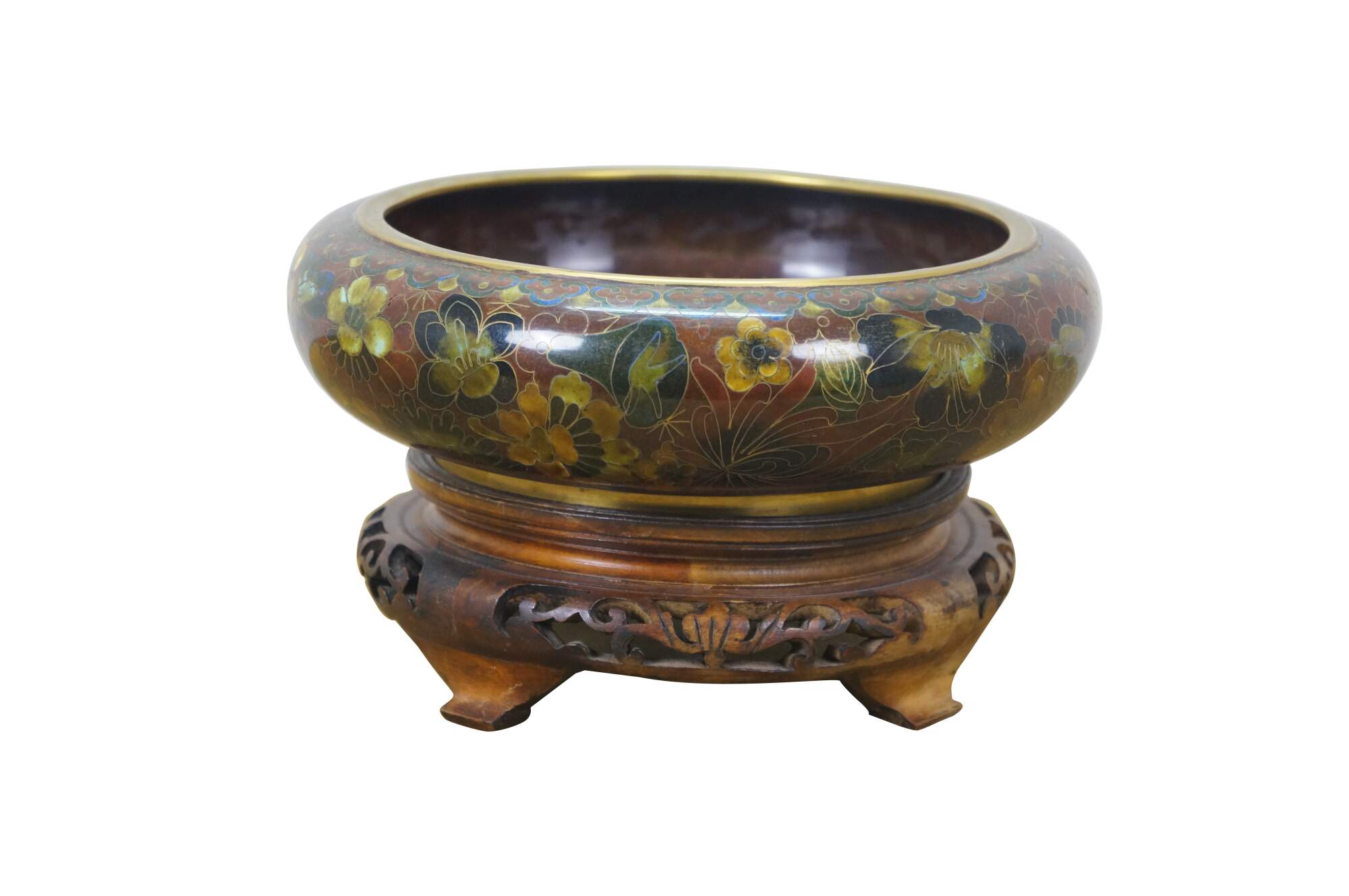 Vintage Chinese enameled brass brush bowl featuring a thousand flowers floral theme paired with a carved elm wood stand.