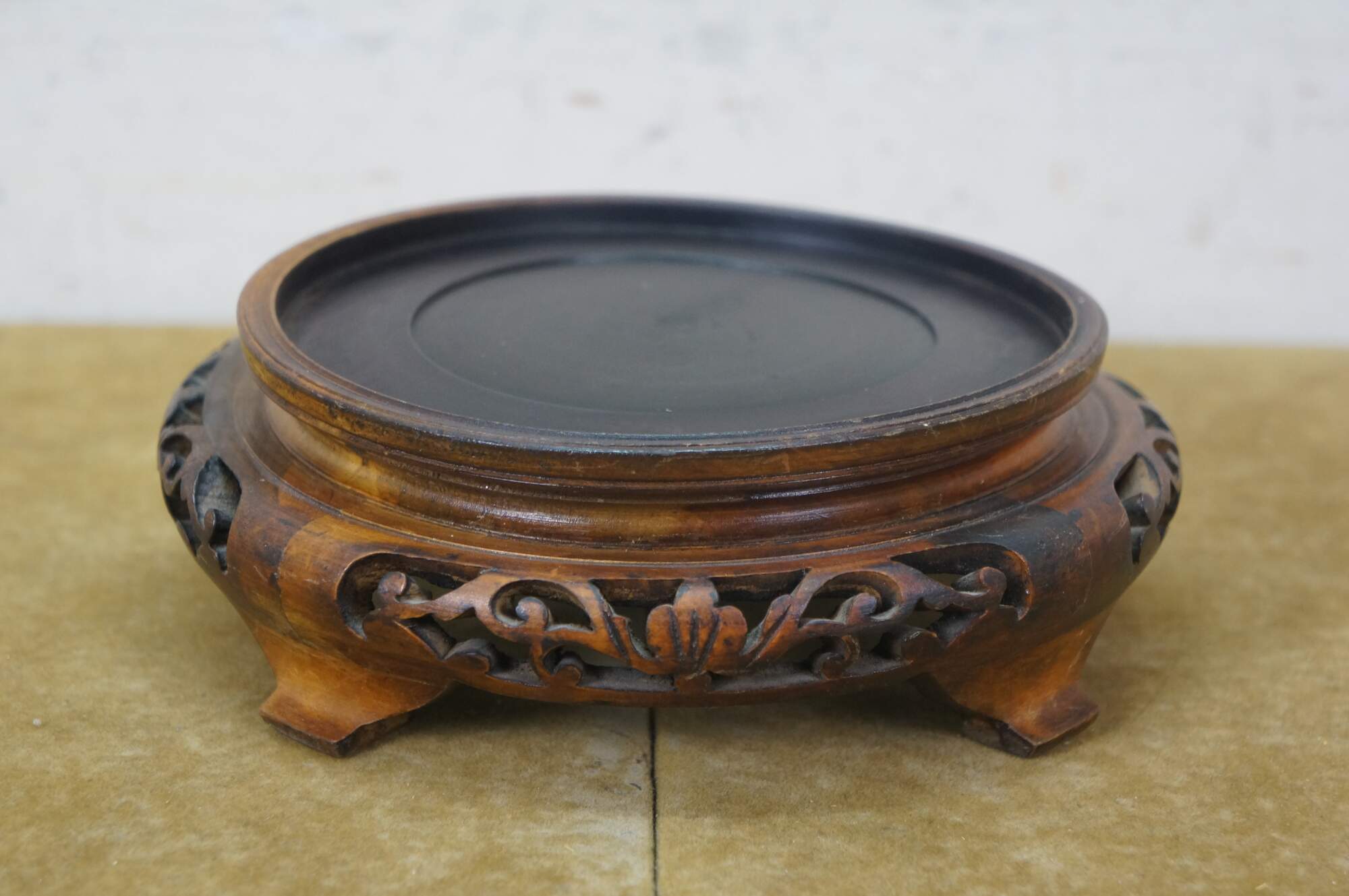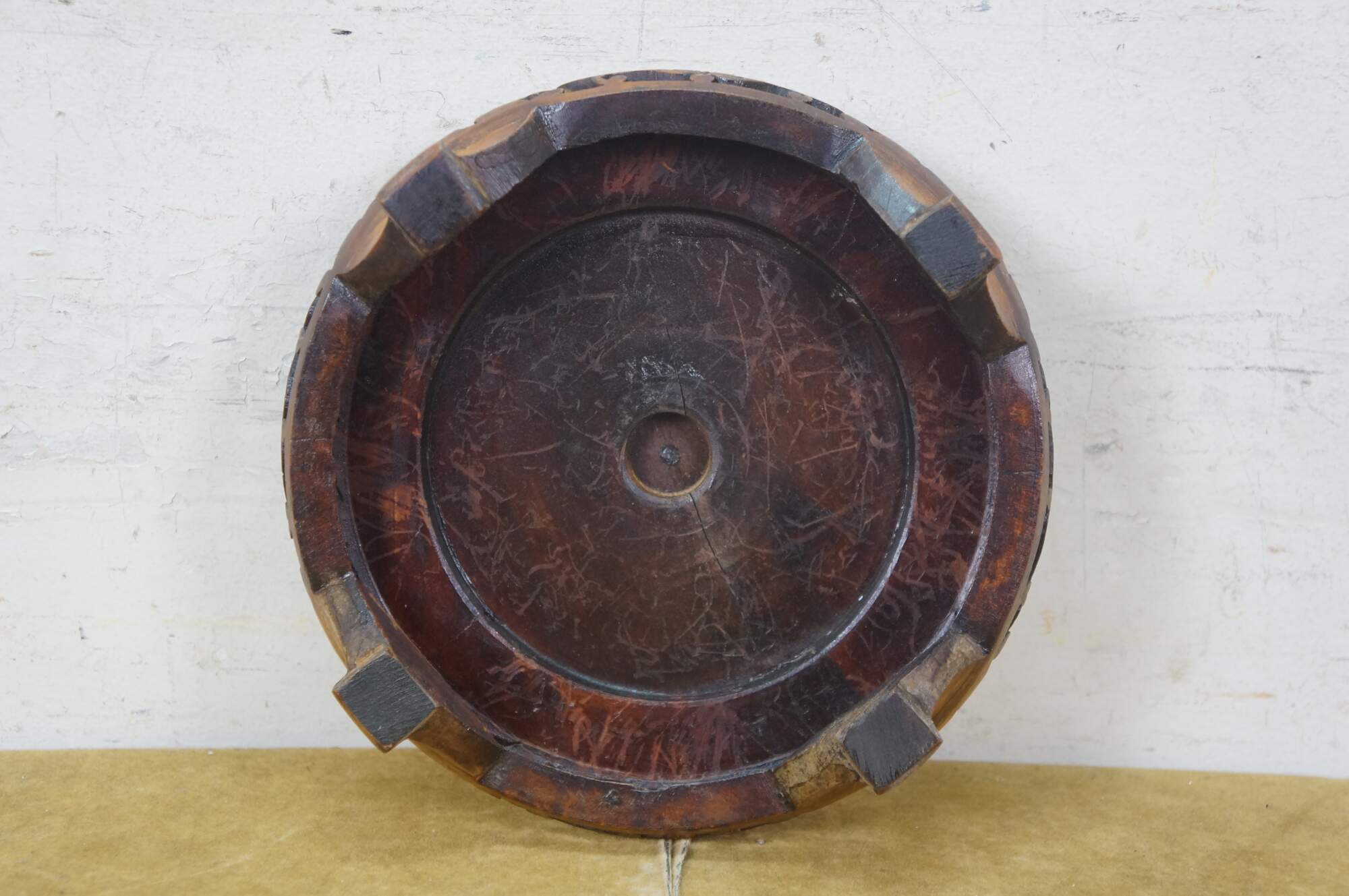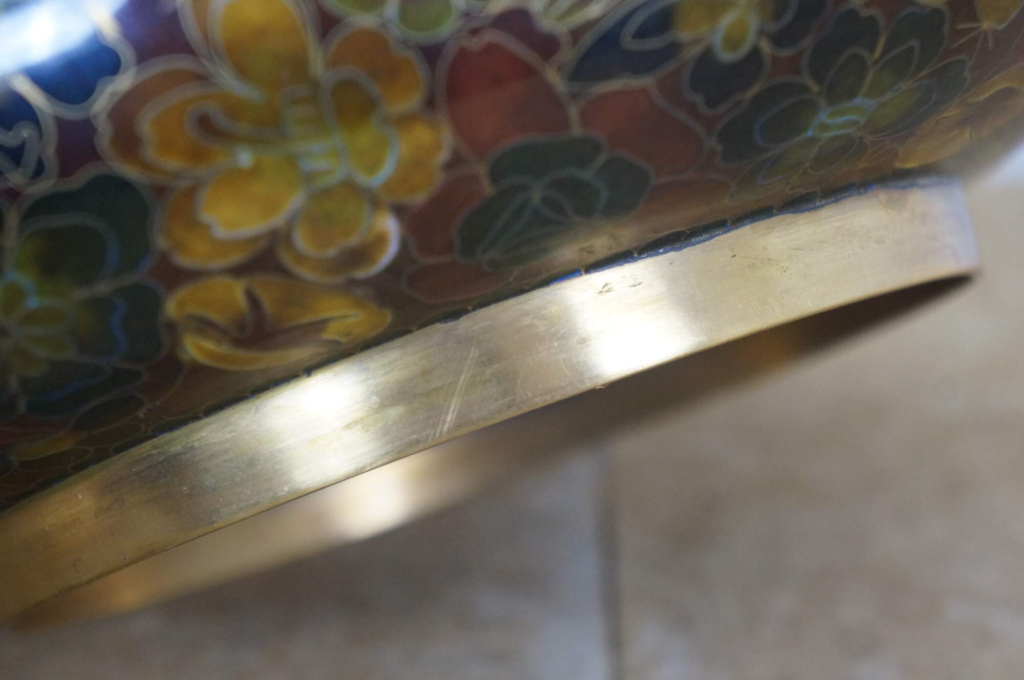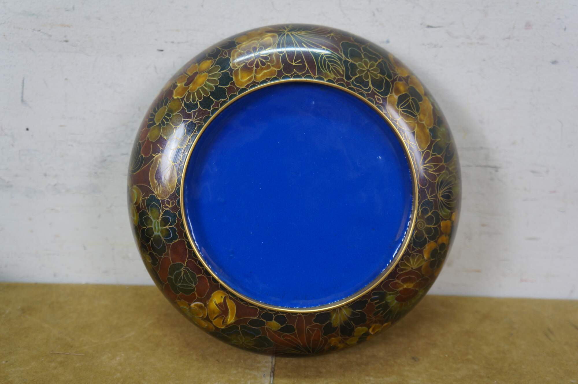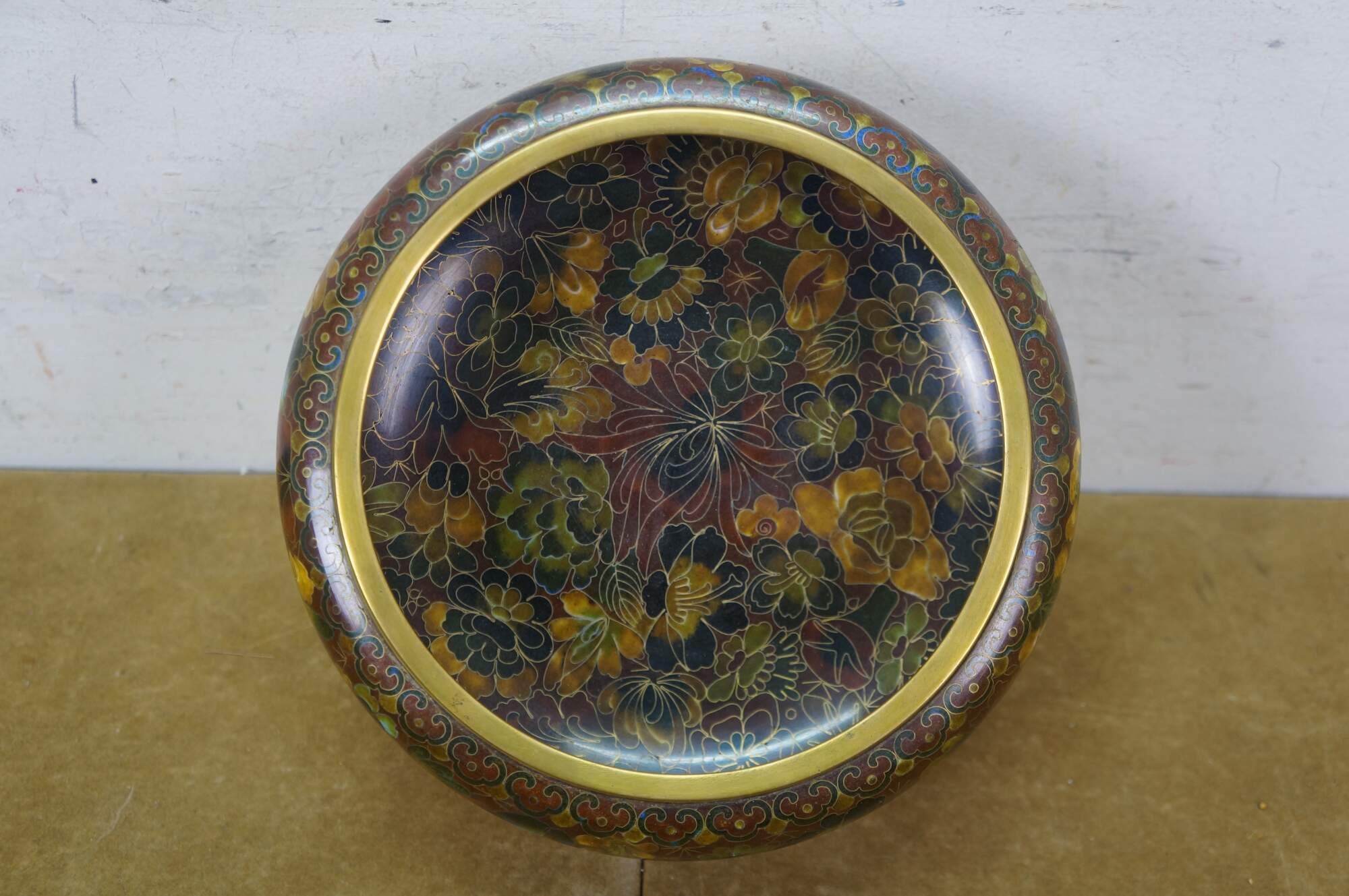Vintage Chinese enameled brass brush bowl featuring a thousand flowers floral theme paired with a carved elm wood stand.