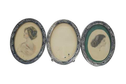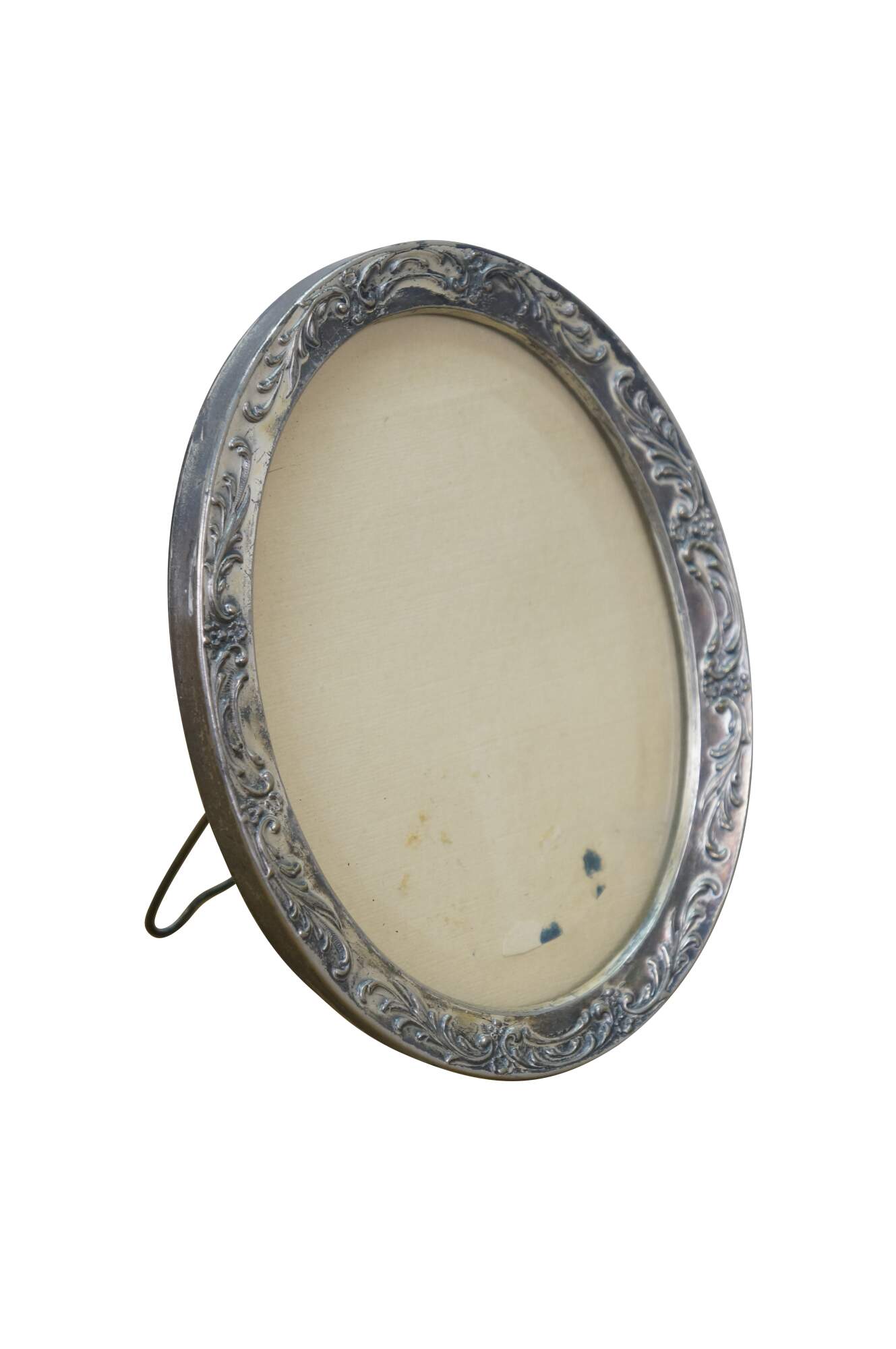 Vintage set of three antique silverplated floral acanthus picture frames. Two wall hanging, one tabletop.