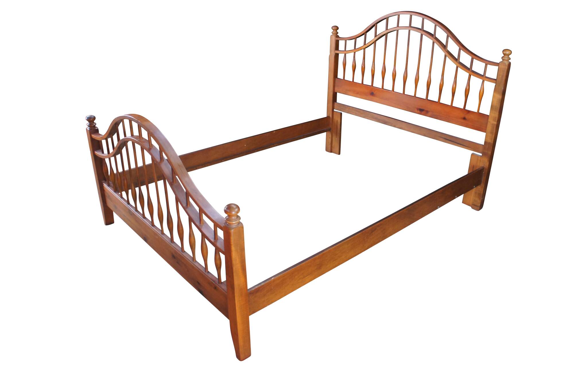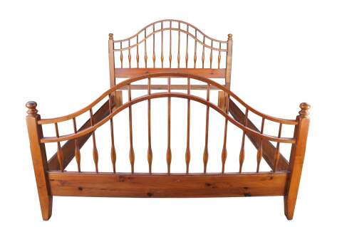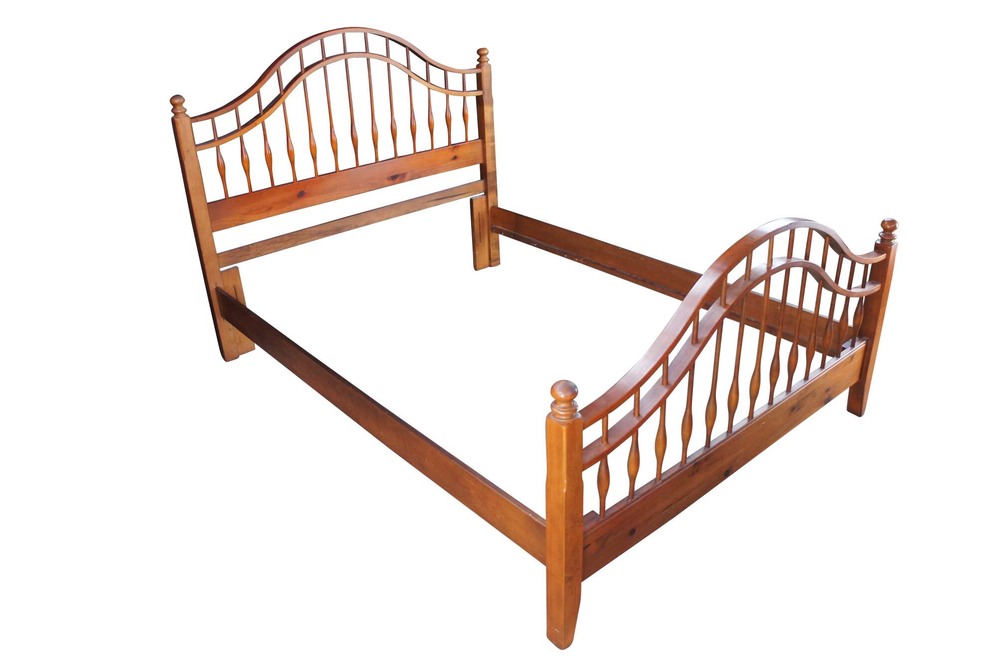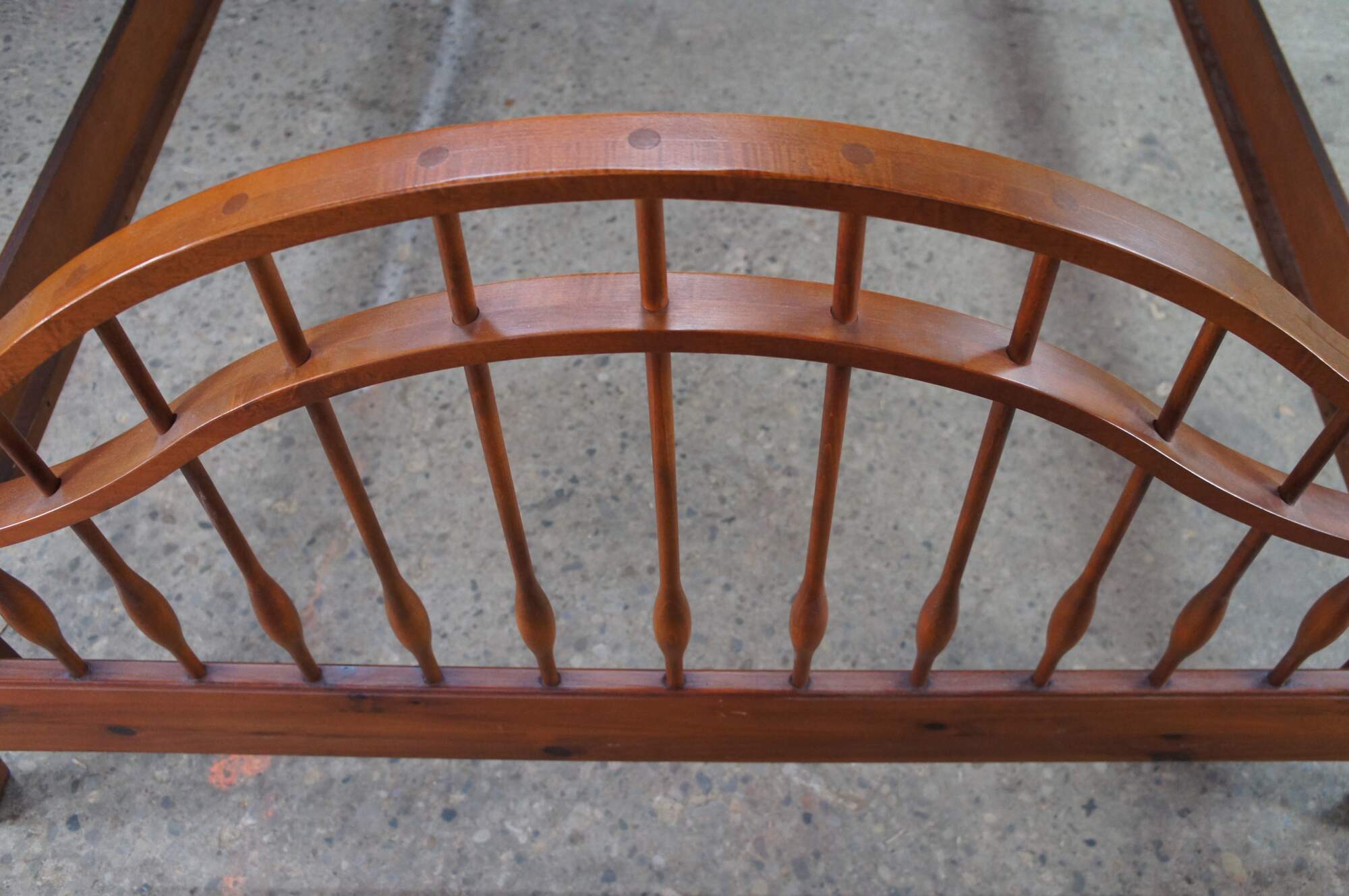 Vintage Ethan Allen Country Craftsman windsor queen or full size bed. Made of pine featuring Early American / Colonial styling with a curved spindled / slatted headboard and footboard. 303-020.