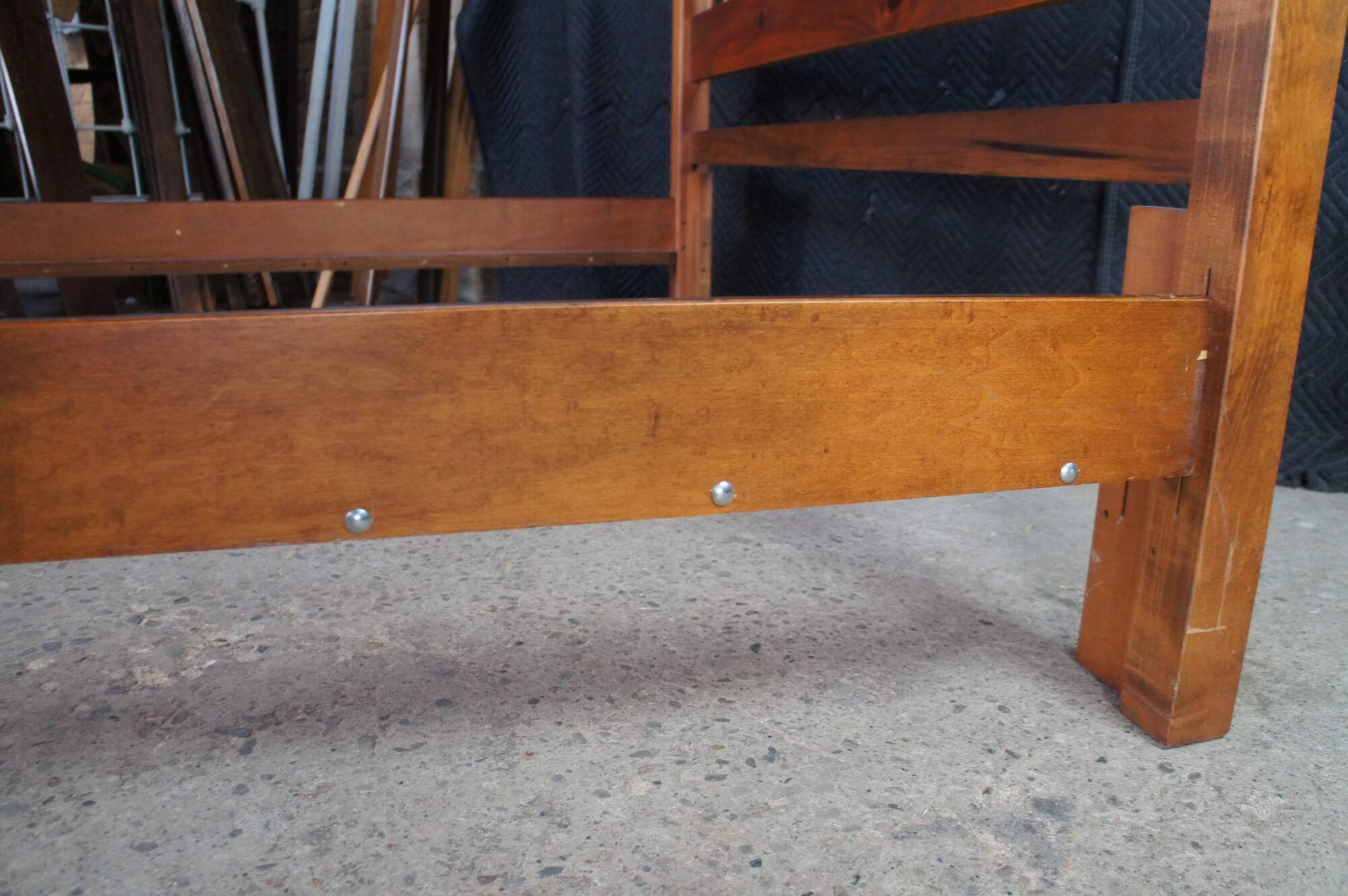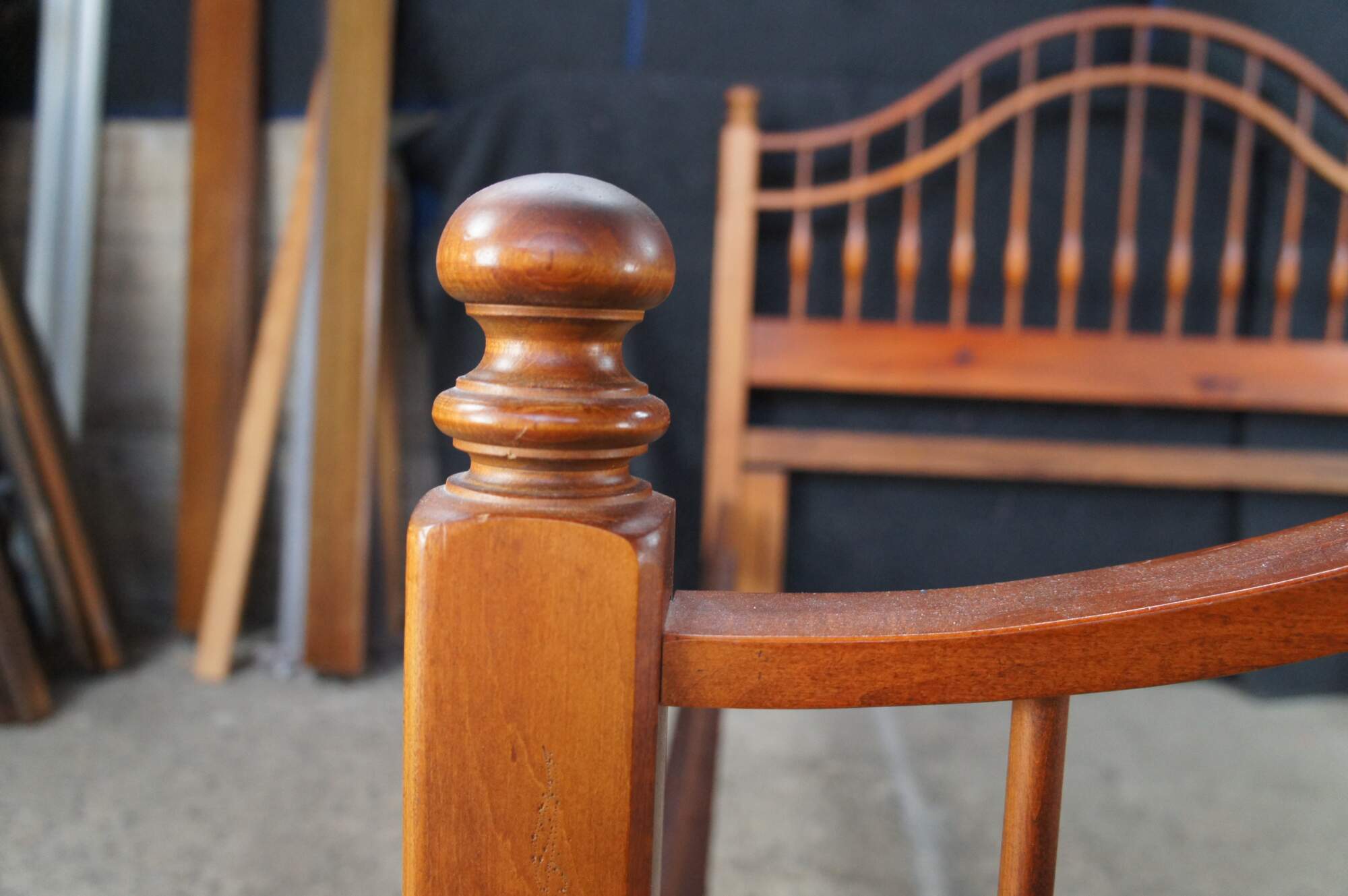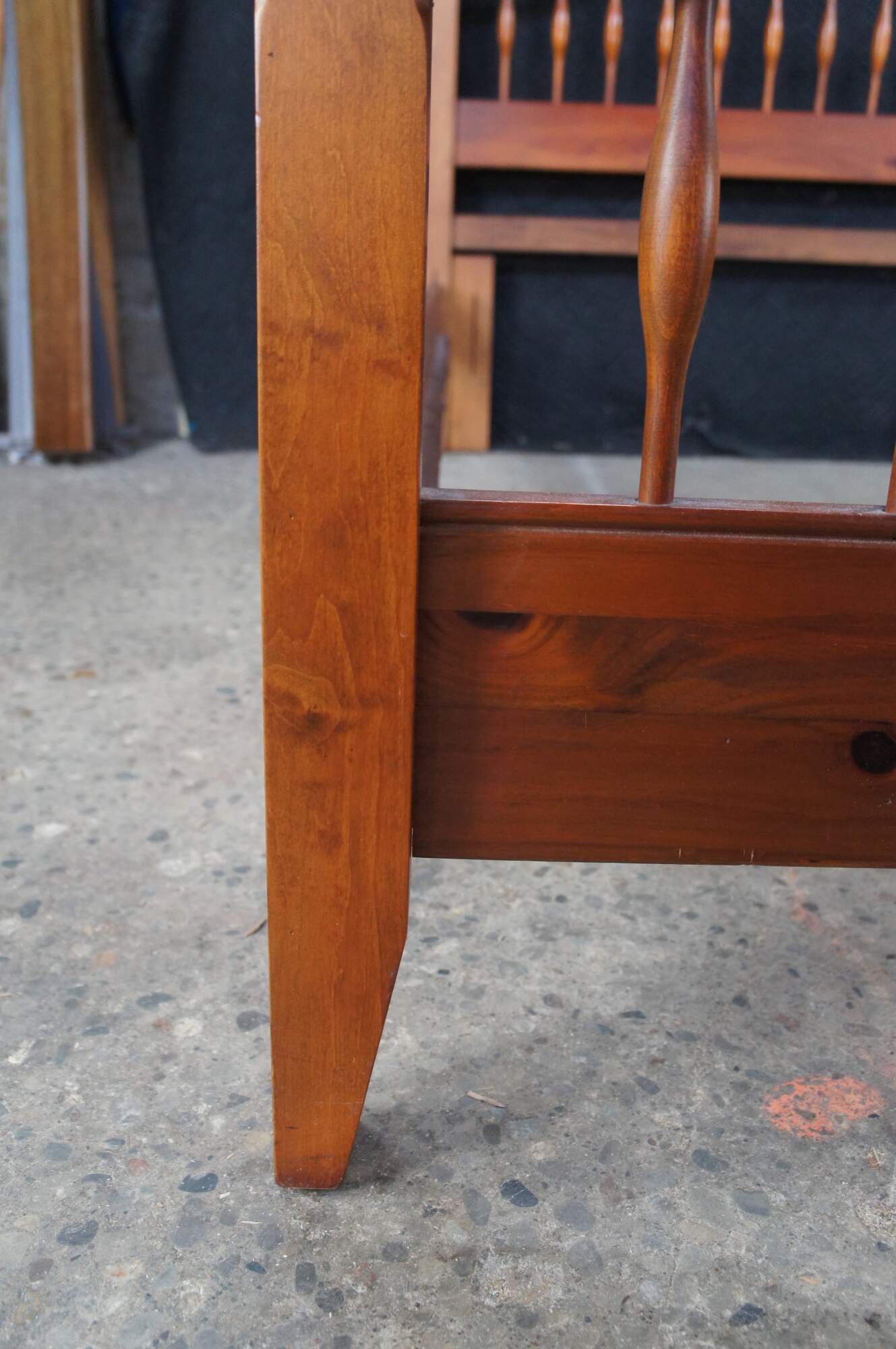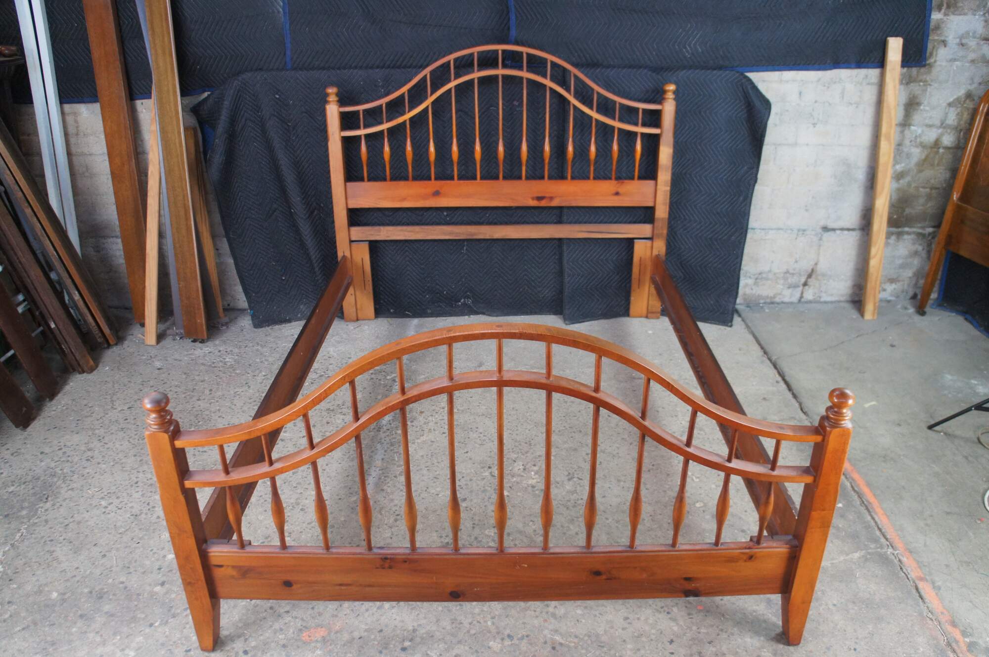 Vintage Ethan Allen Country Craftsman windsor queen or full size bed. Made of pine featuring Early American / Colonial styling with a curved spindled / slatted headboard and footboard. 303-020.
