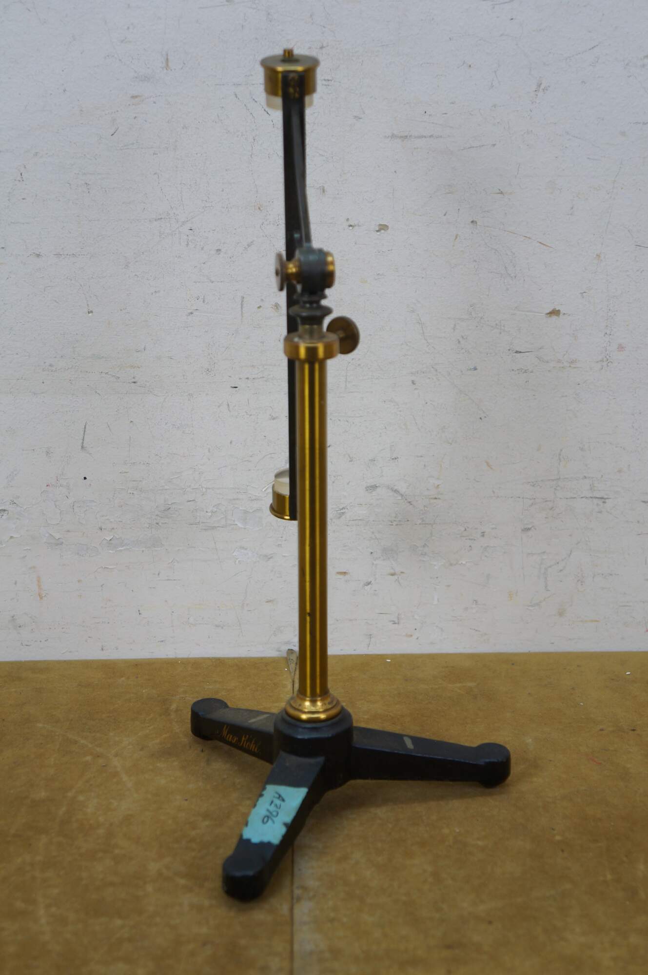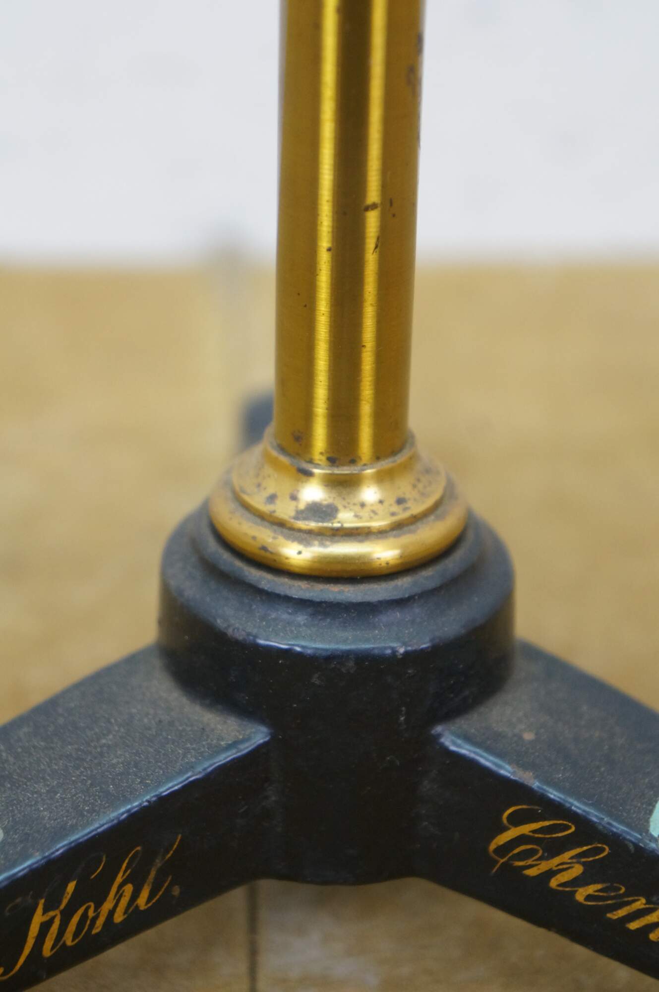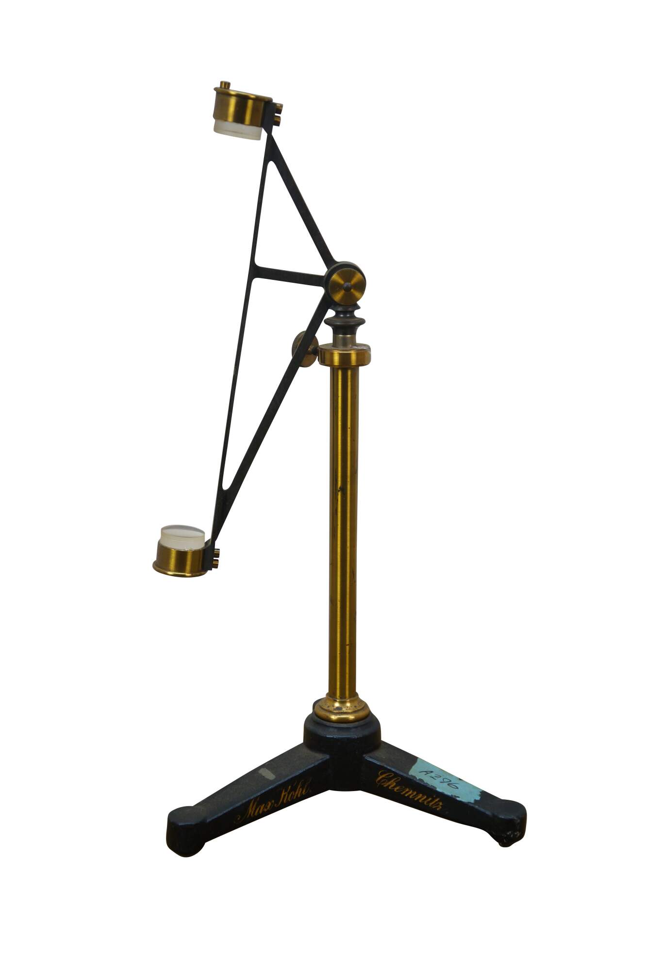 Rare antique Max Kohl, Chemnitz, Germany, microscope / polariscope. Made of brass and cast iron with tripod base and two lenses. Circa 1900.