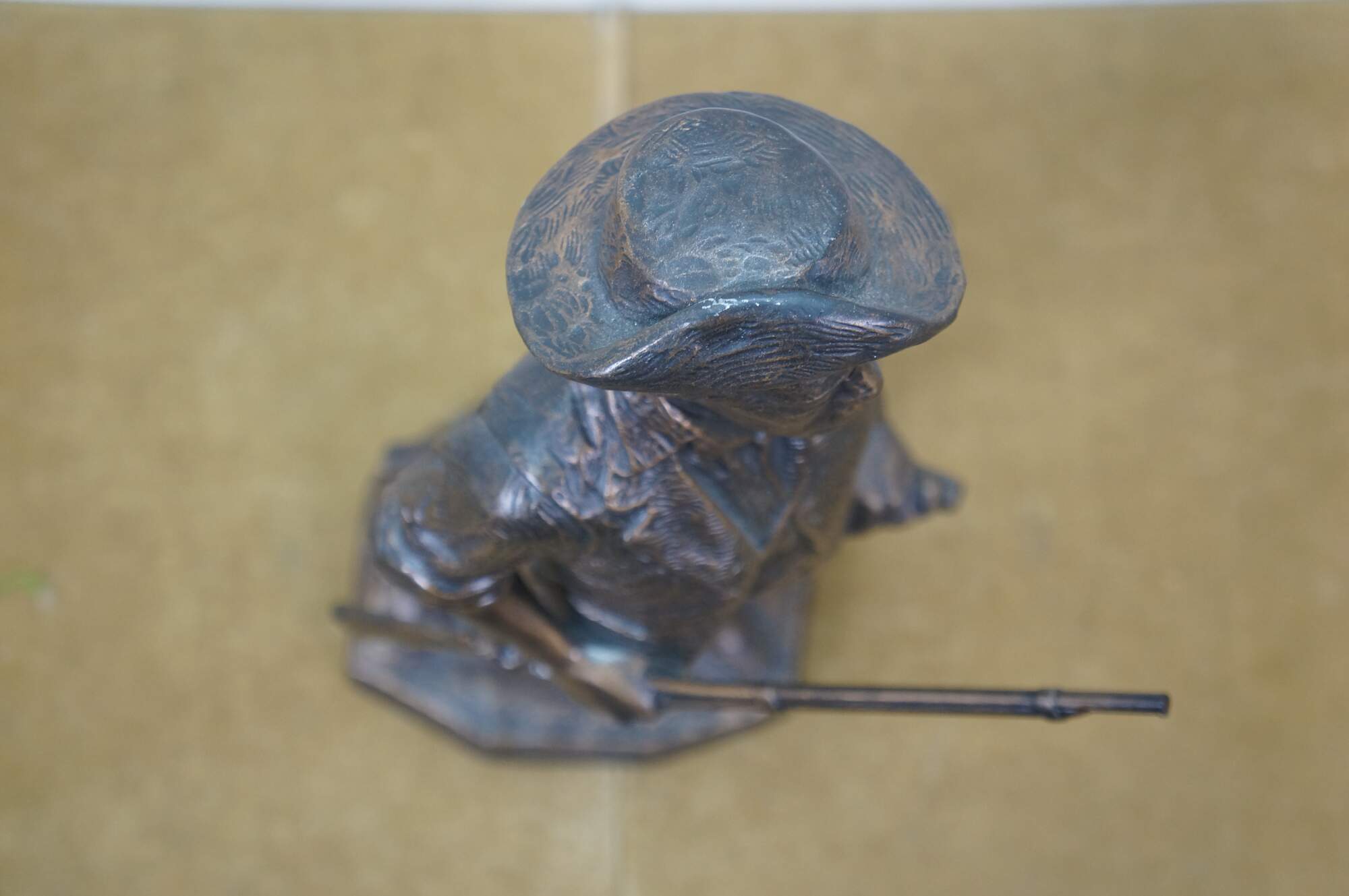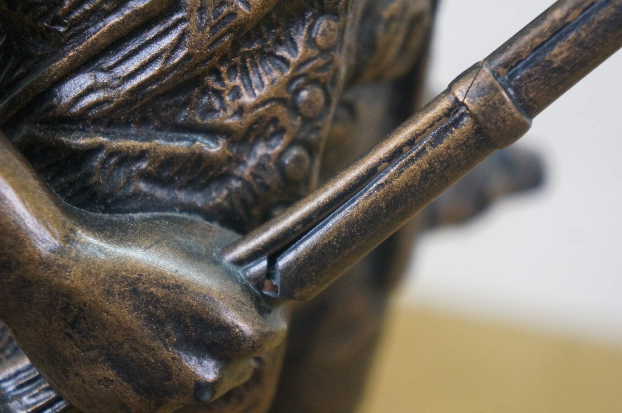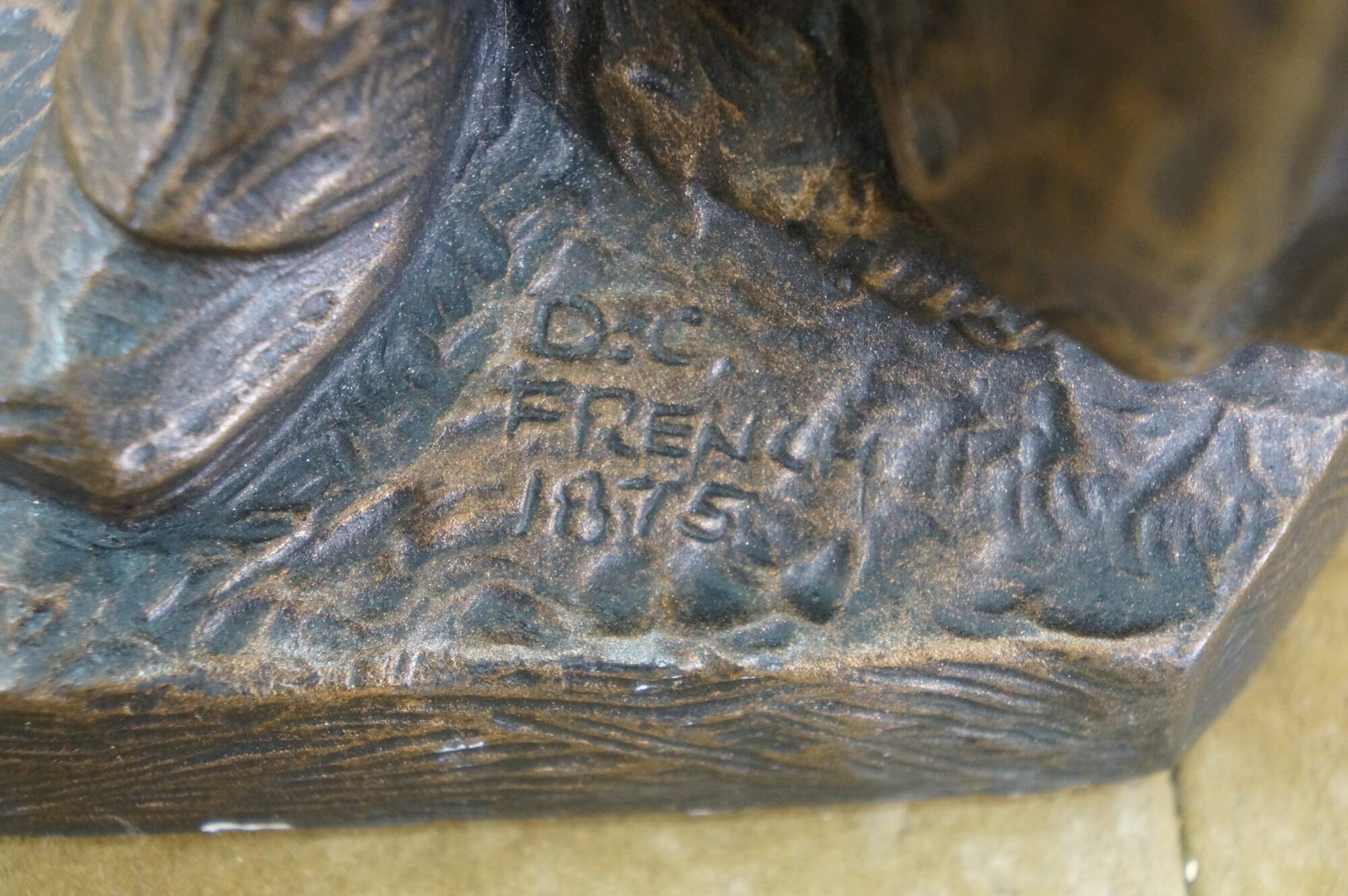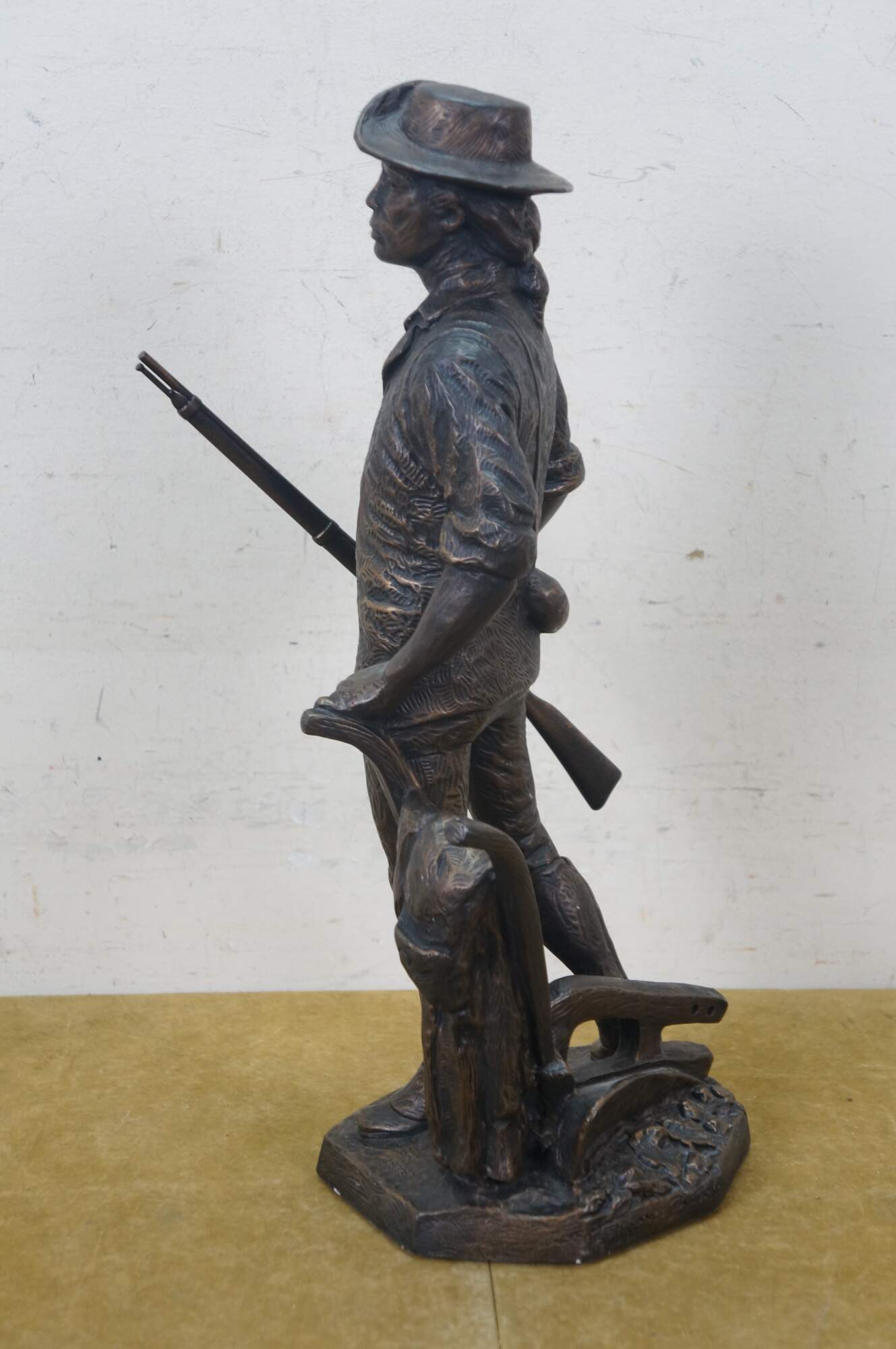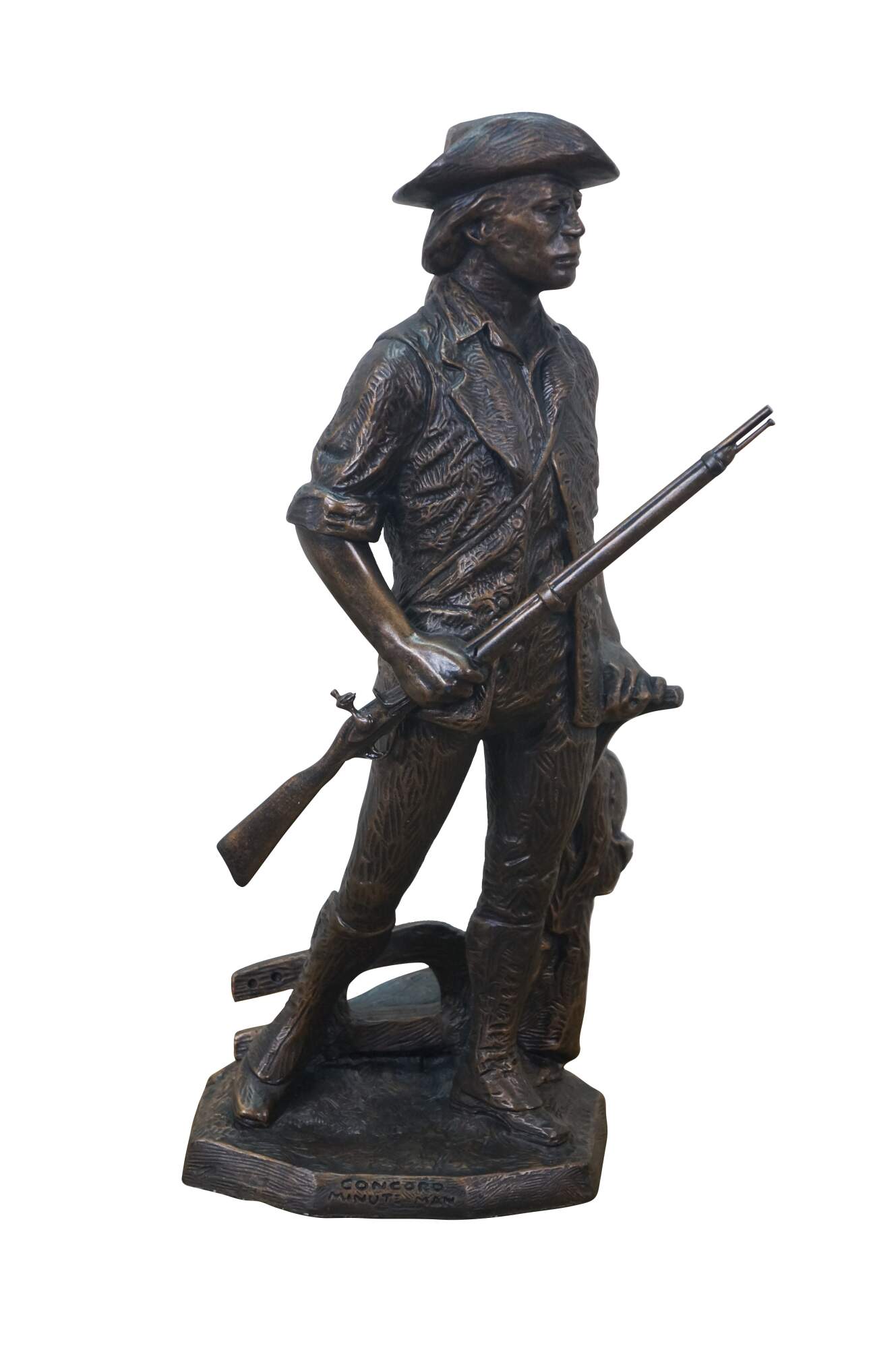 Large vintage 1987 patinated bronze terracotta Minute Man soldier holding rifle / gun by Terrance Patterson. Based on the monument by Daniel Chester French, created in 1875 and located in Minute Man National Historical Park, Concord, Massachusetts, the statue depicts a minuteman stepping away from his plow to join the Patriot forces at the Battle of Concord, at the start of the American Revolutionary War.
