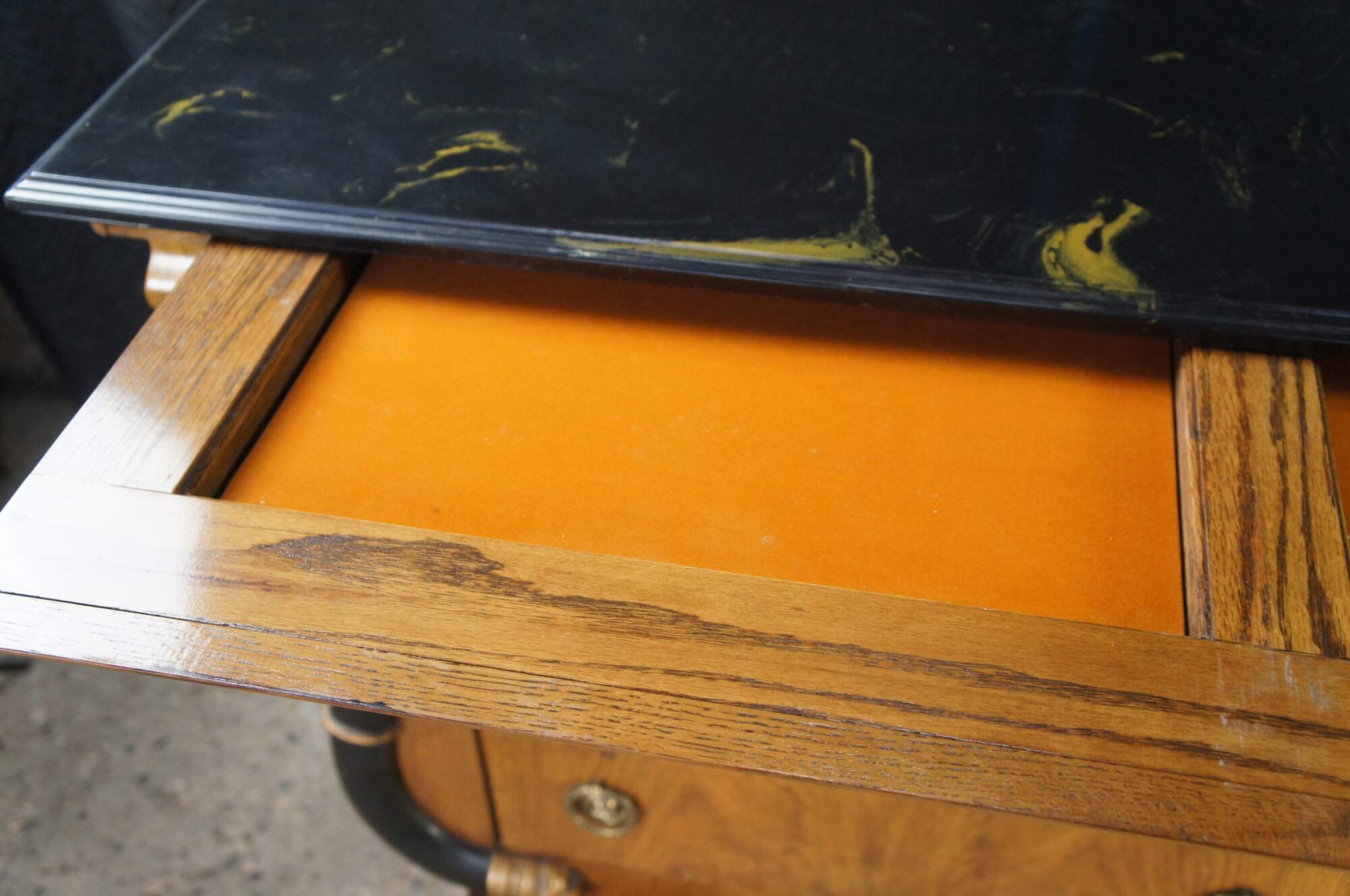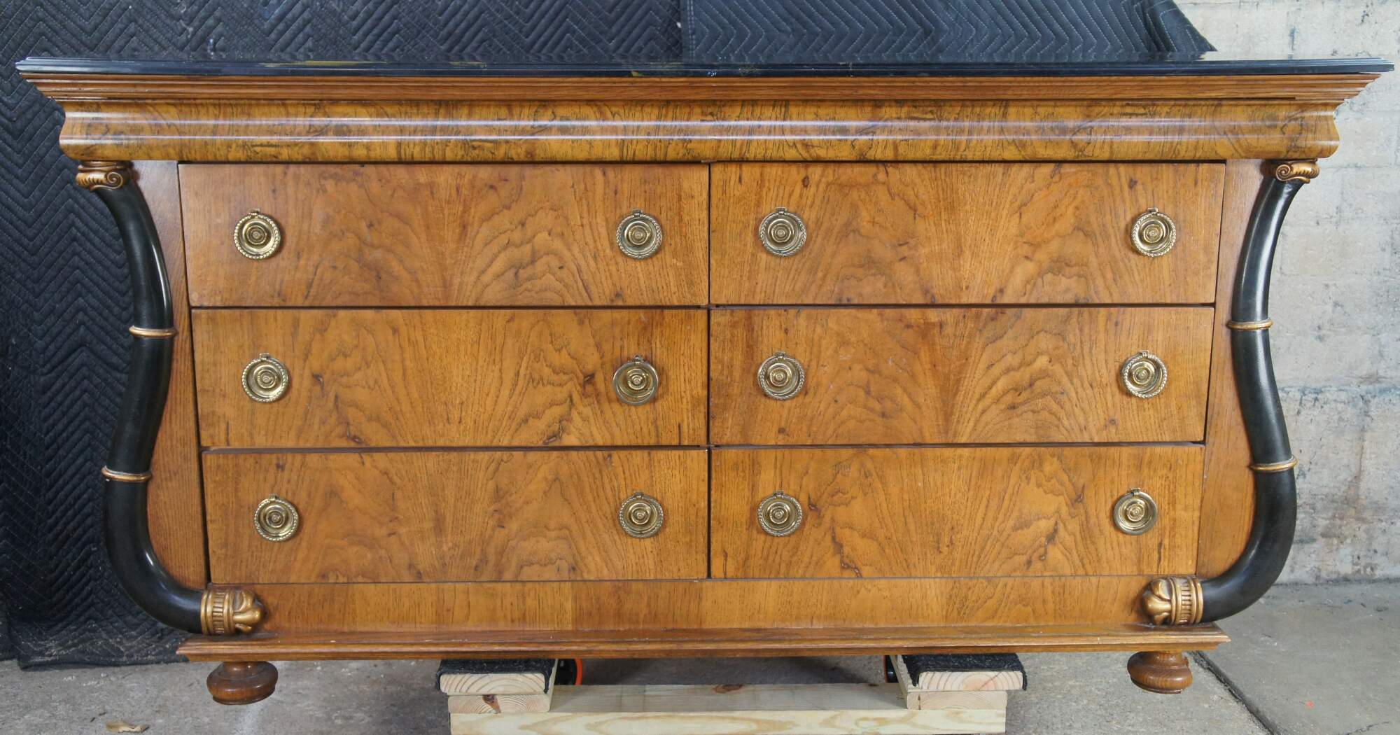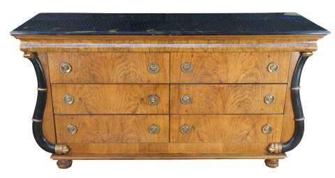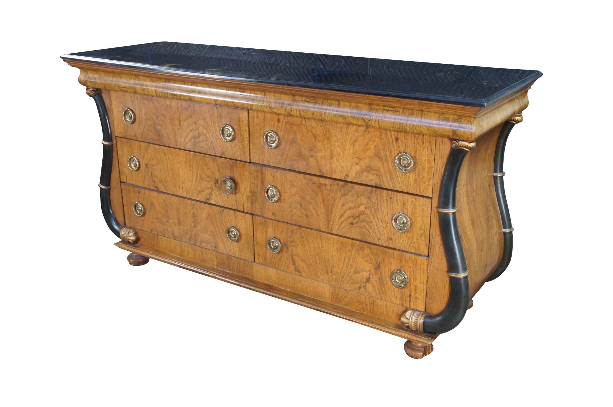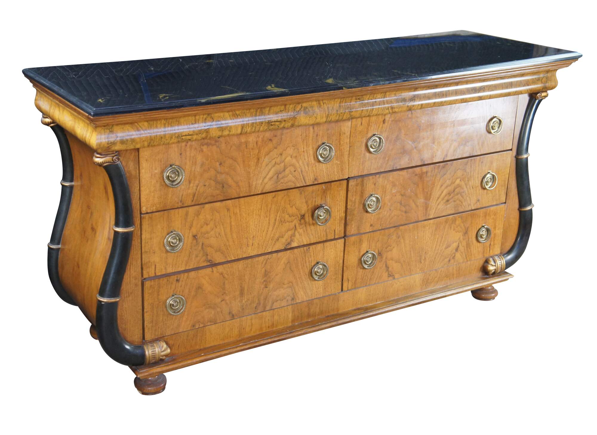 Vintage French Empire / Biedermeier style chest of drawers / dresser / commode. Made of matchboxes oak featuring a cello front and faux marble top over six dovetailed drawers with brass ring hardware framed by ebonized serpentine pilaster columns with gold trim. The upper apron conceals a unique felt lined hidden money / jewelry / valuable documents drawer. The dresser is supported by turned bun feet.