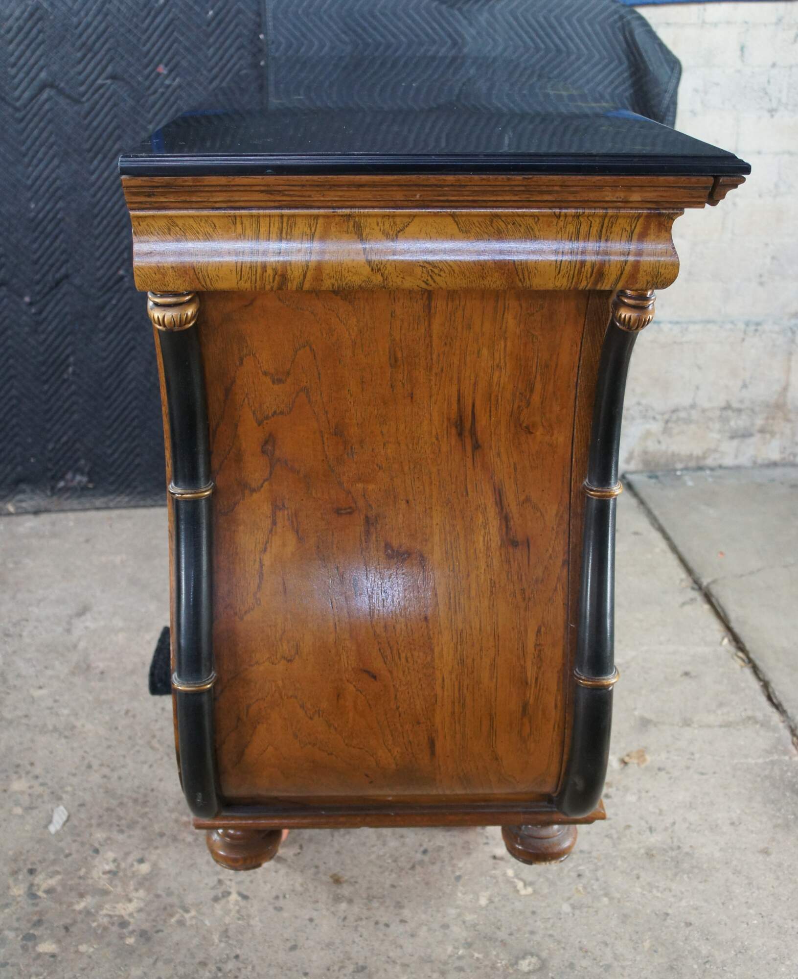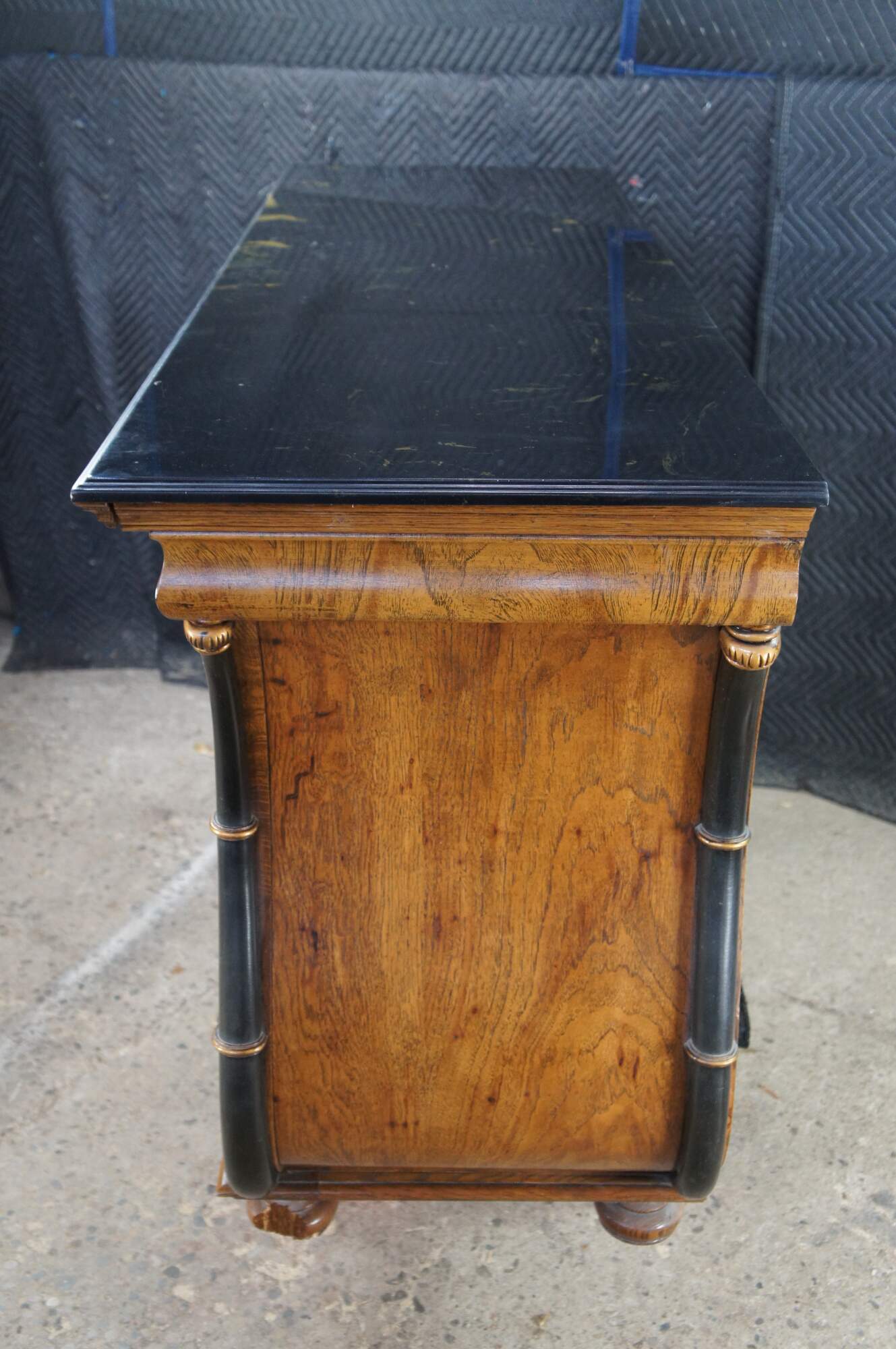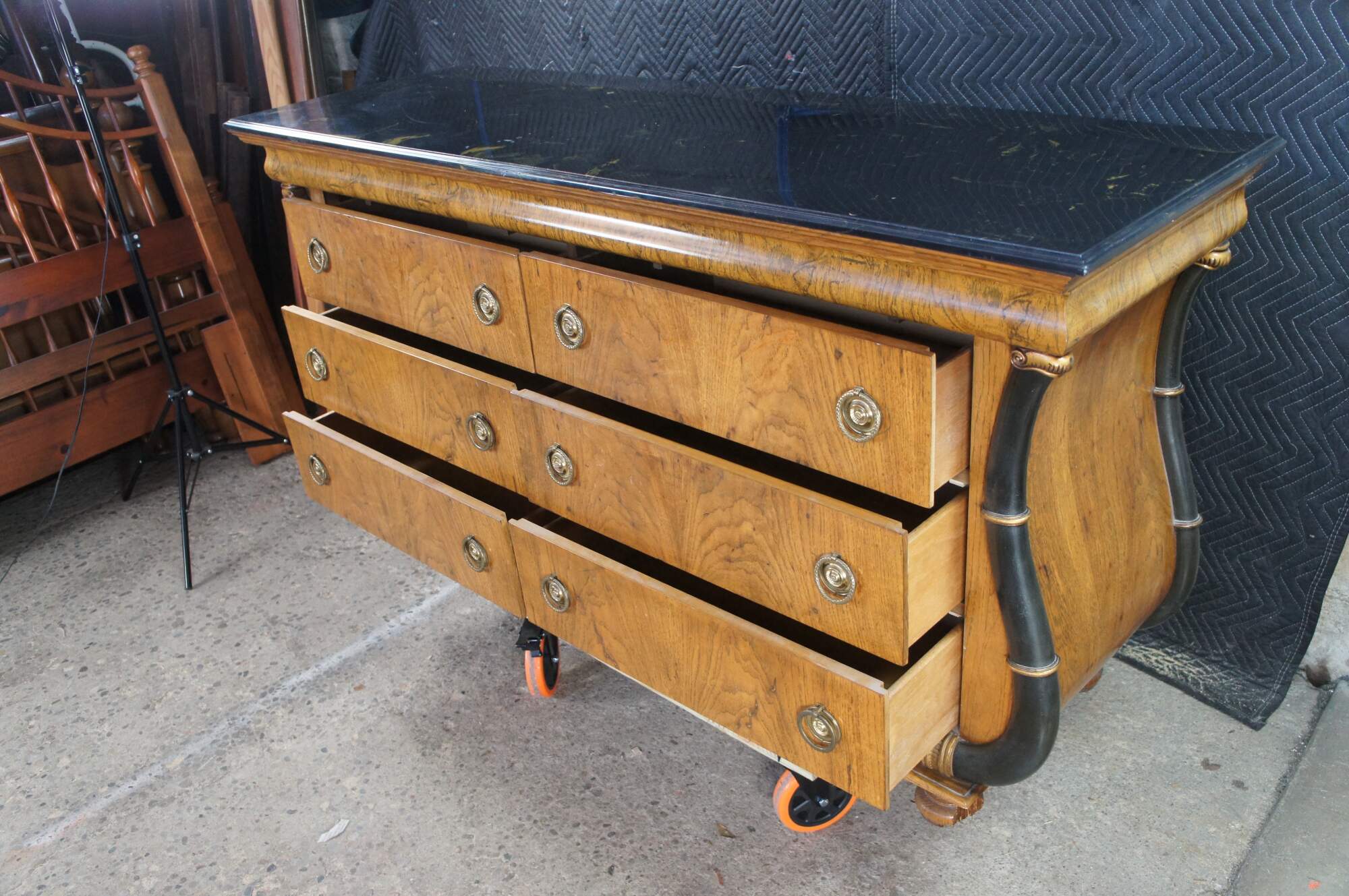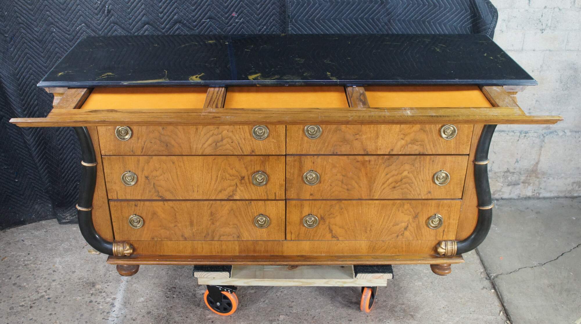 Vintage French Empire / Biedermeier style chest of drawers / dresser / commode. Made of matchboxes oak featuring a cello front and faux marble top over six dovetailed drawers with brass ring hardware framed by ebonized serpentine pilaster columns with gold trim. The upper apron conceals a unique felt lined hidden money / jewelry / valuable documents drawer. The dresser is supported by turned bun feet.