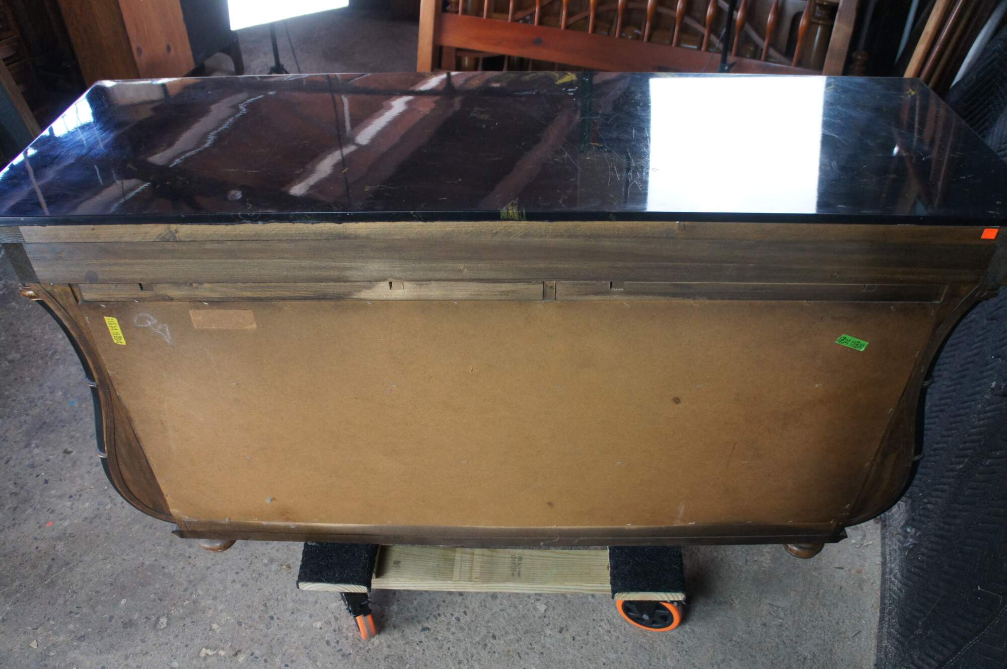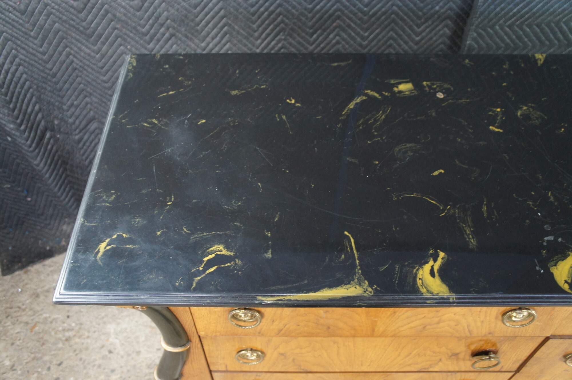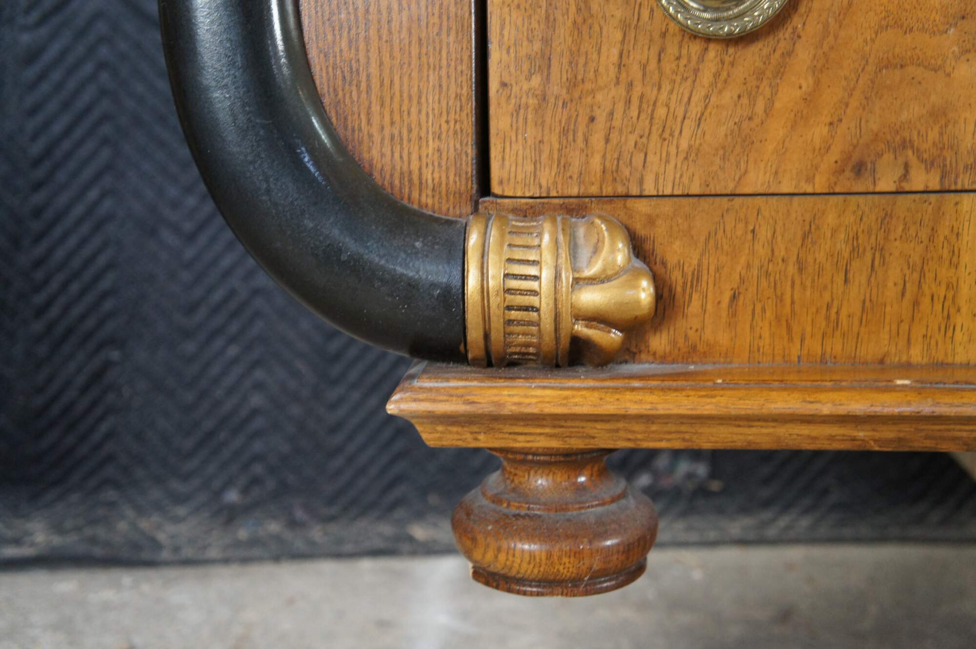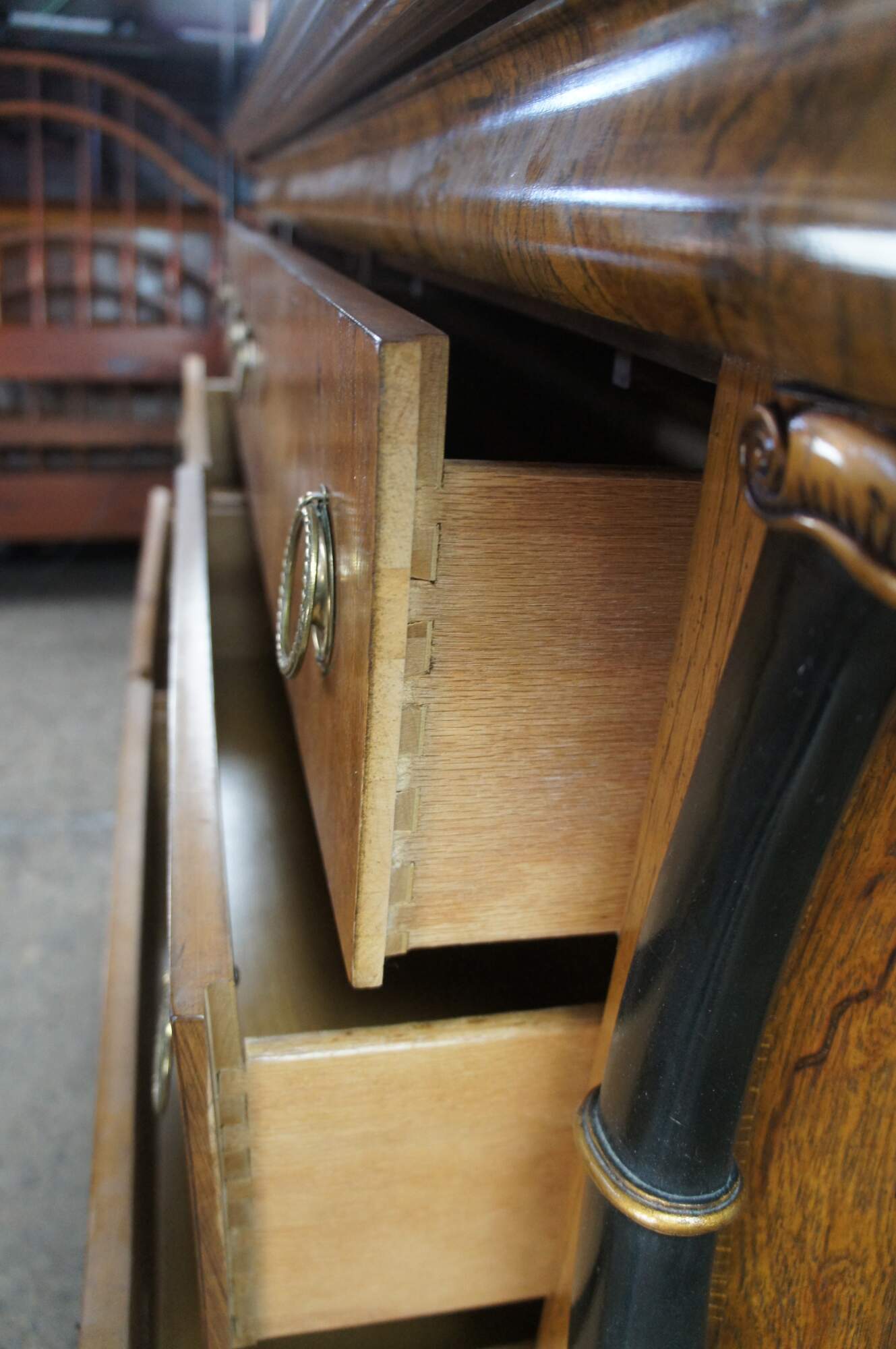 Vintage French Empire / Biedermeier style chest of drawers / dresser / commode. Made of matchboxes oak featuring a cello front and faux marble top over six dovetailed drawers with brass ring hardware framed by ebonized serpentine pilaster columns with gold trim. The upper apron conceals a unique felt lined hidden money / jewelry / valuable documents drawer. The dresser is supported by turned bun feet.