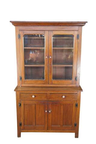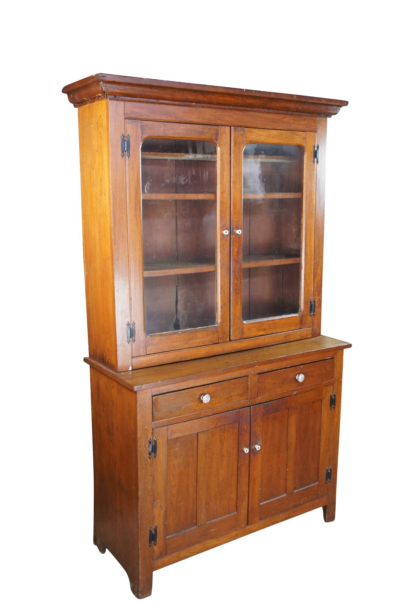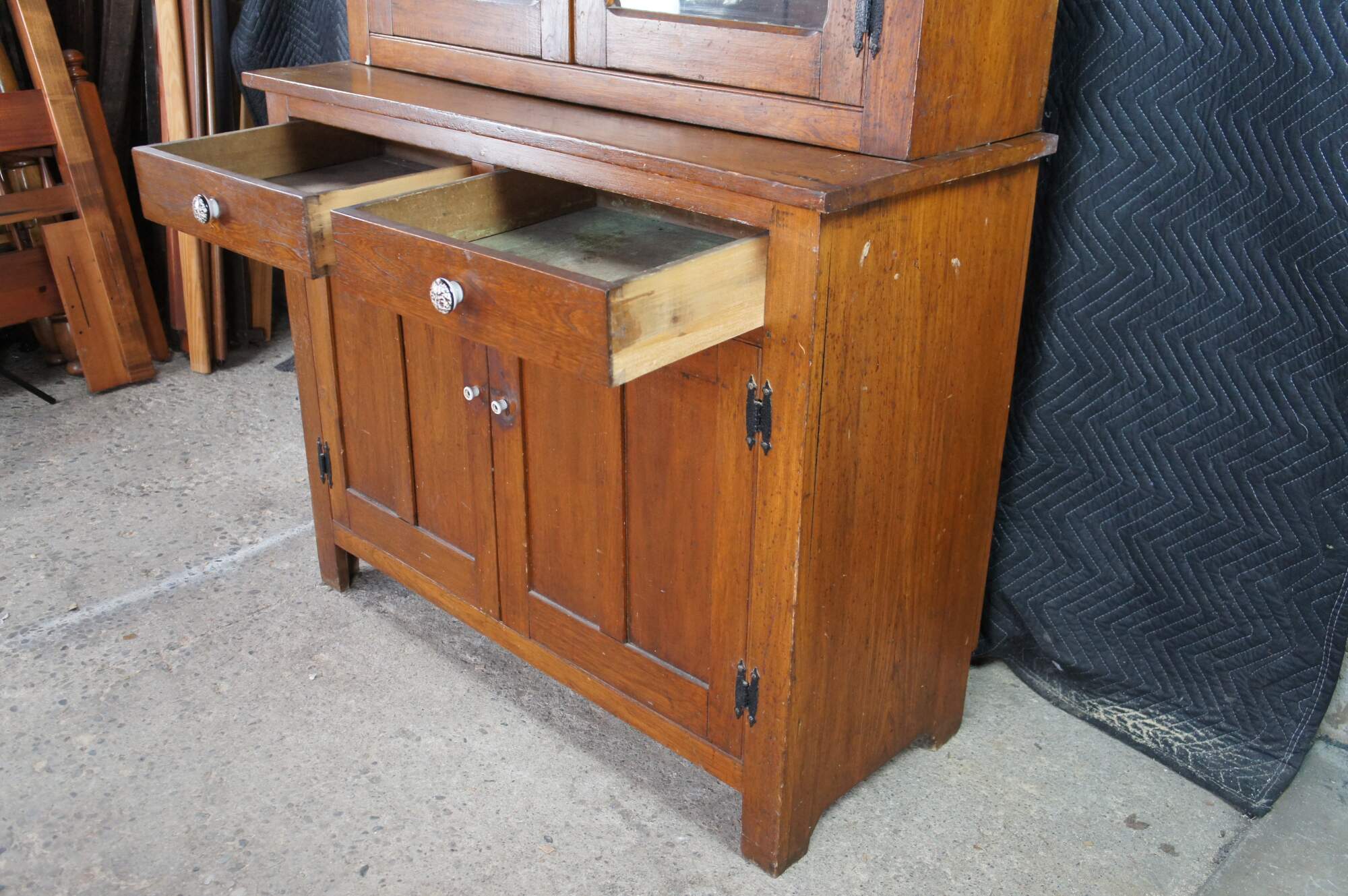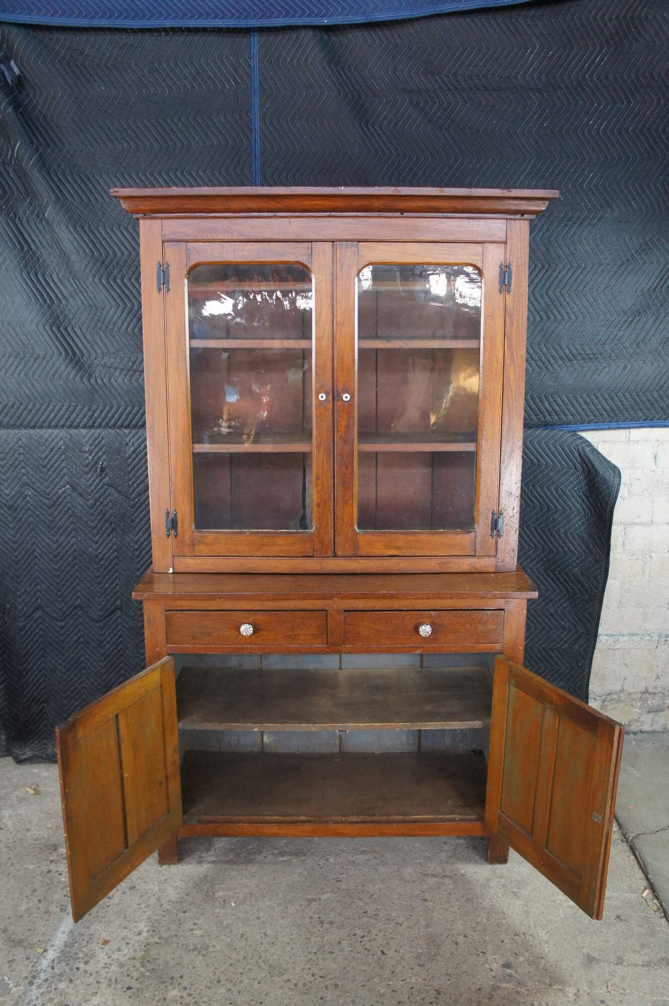 Primitive Antique Late 19th Century Stepback Cabinet. Made from oak with a glass double door Hutch opening to three shelves. Base features two hand dovetailed drawers over a lower cabinet with shelf for accessory storage. The cabinet has a paneled back, iron hinges and porcelain pulls.