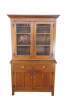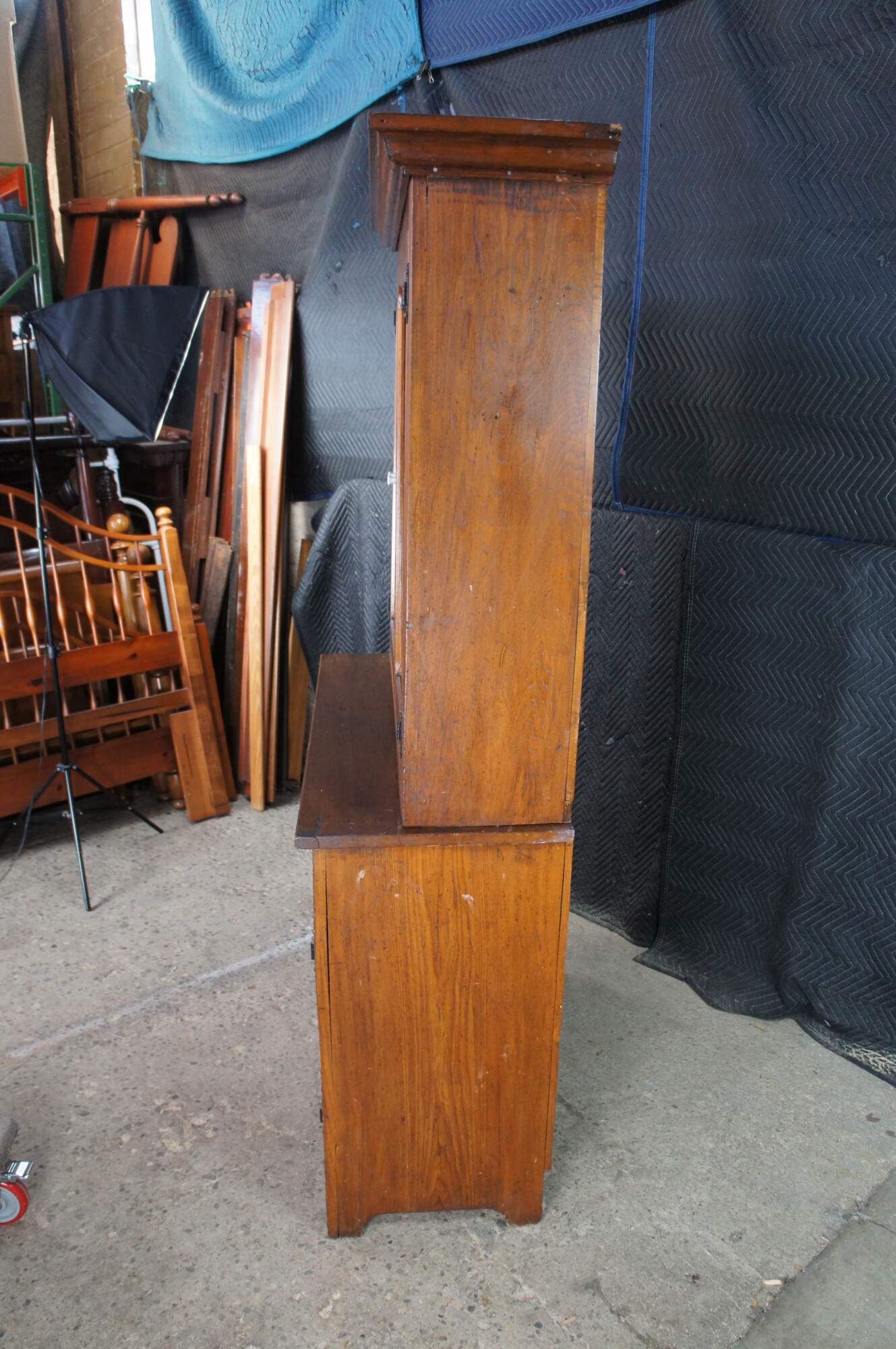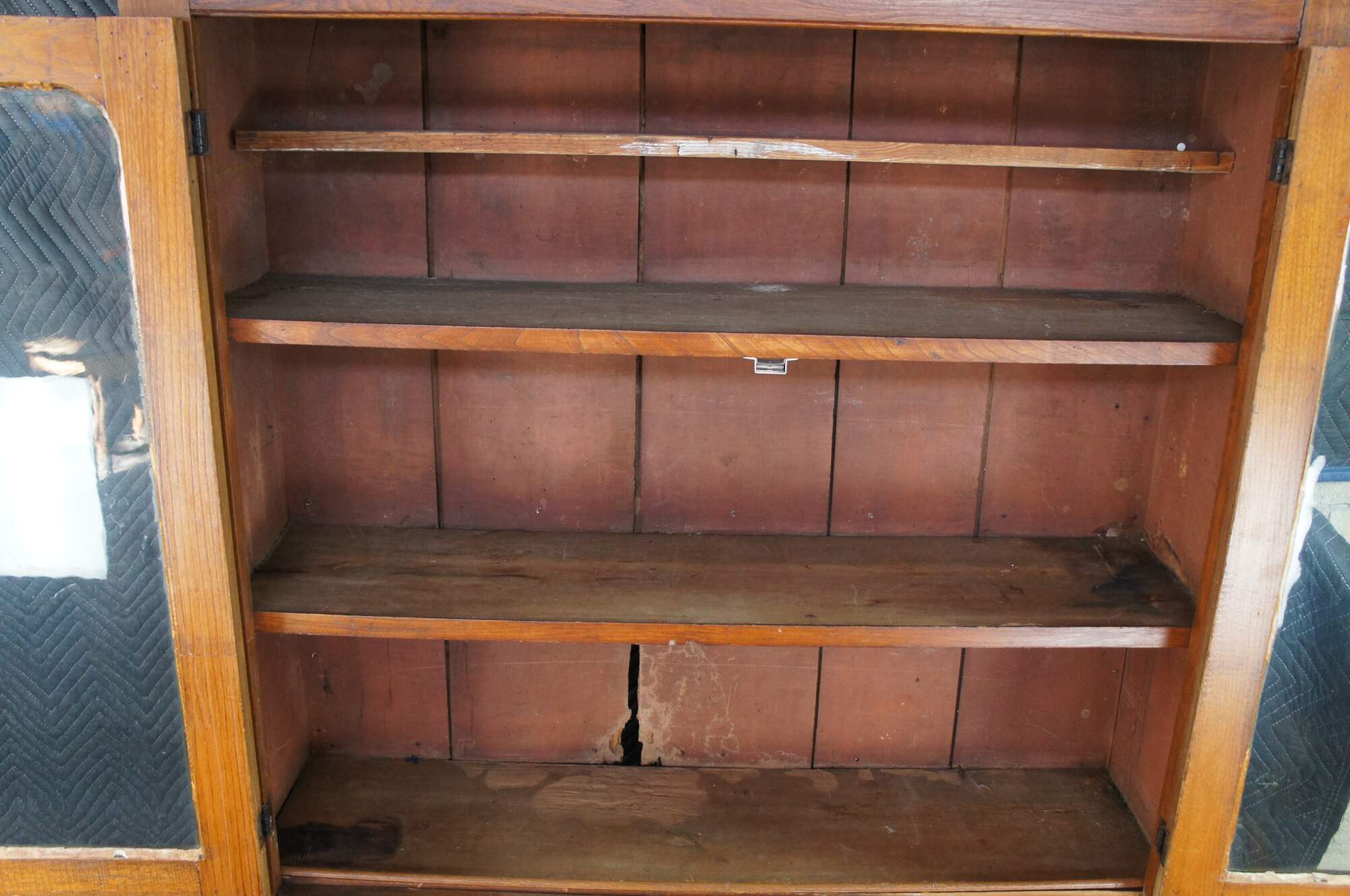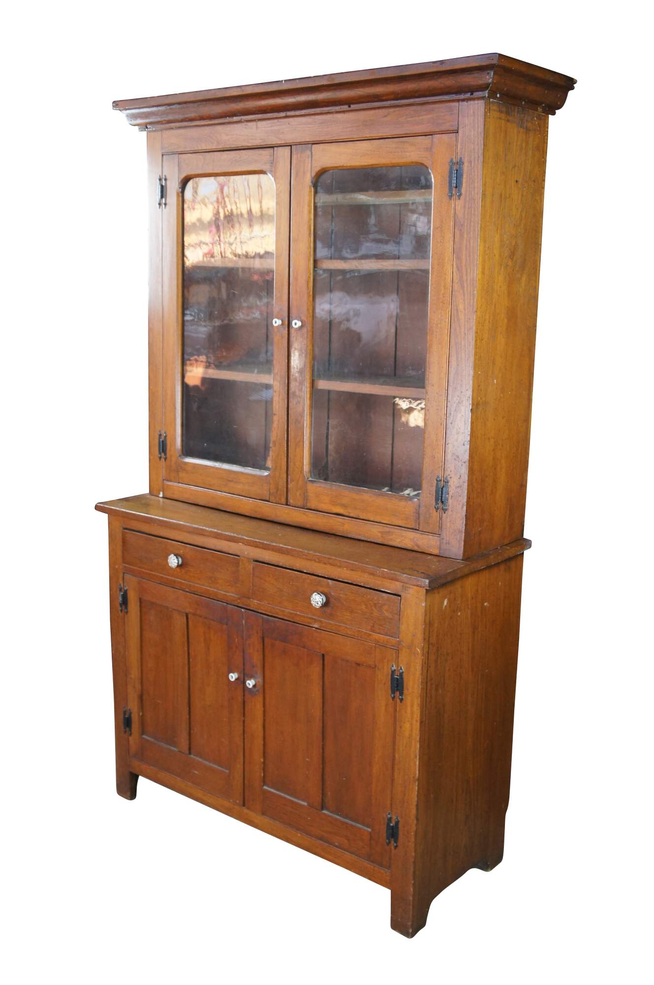 Primitive Antique Late 19th Century Stepback Cabinet. Made from oak with a glass double door Hutch opening to three shelves. Base features two hand dovetailed drawers over a lower cabinet with shelf for accessory storage. The cabinet has a paneled back, iron hinges and porcelain pulls.