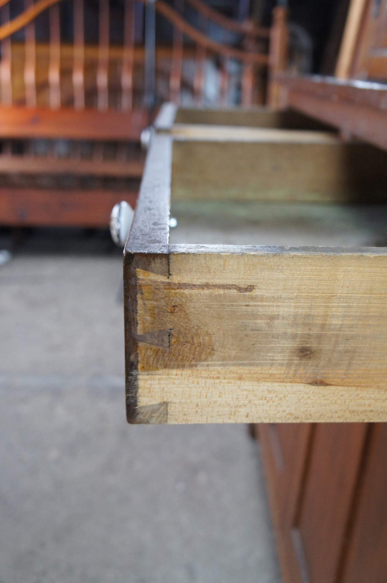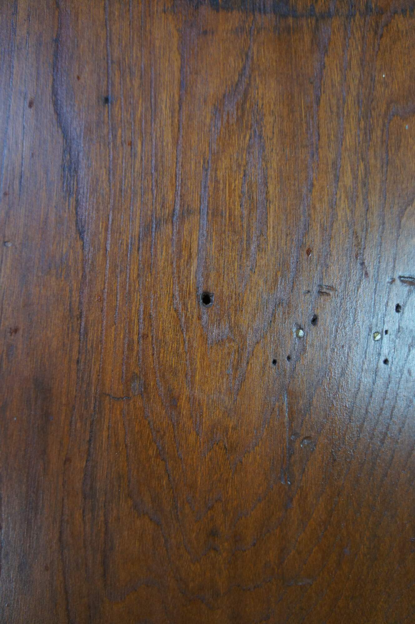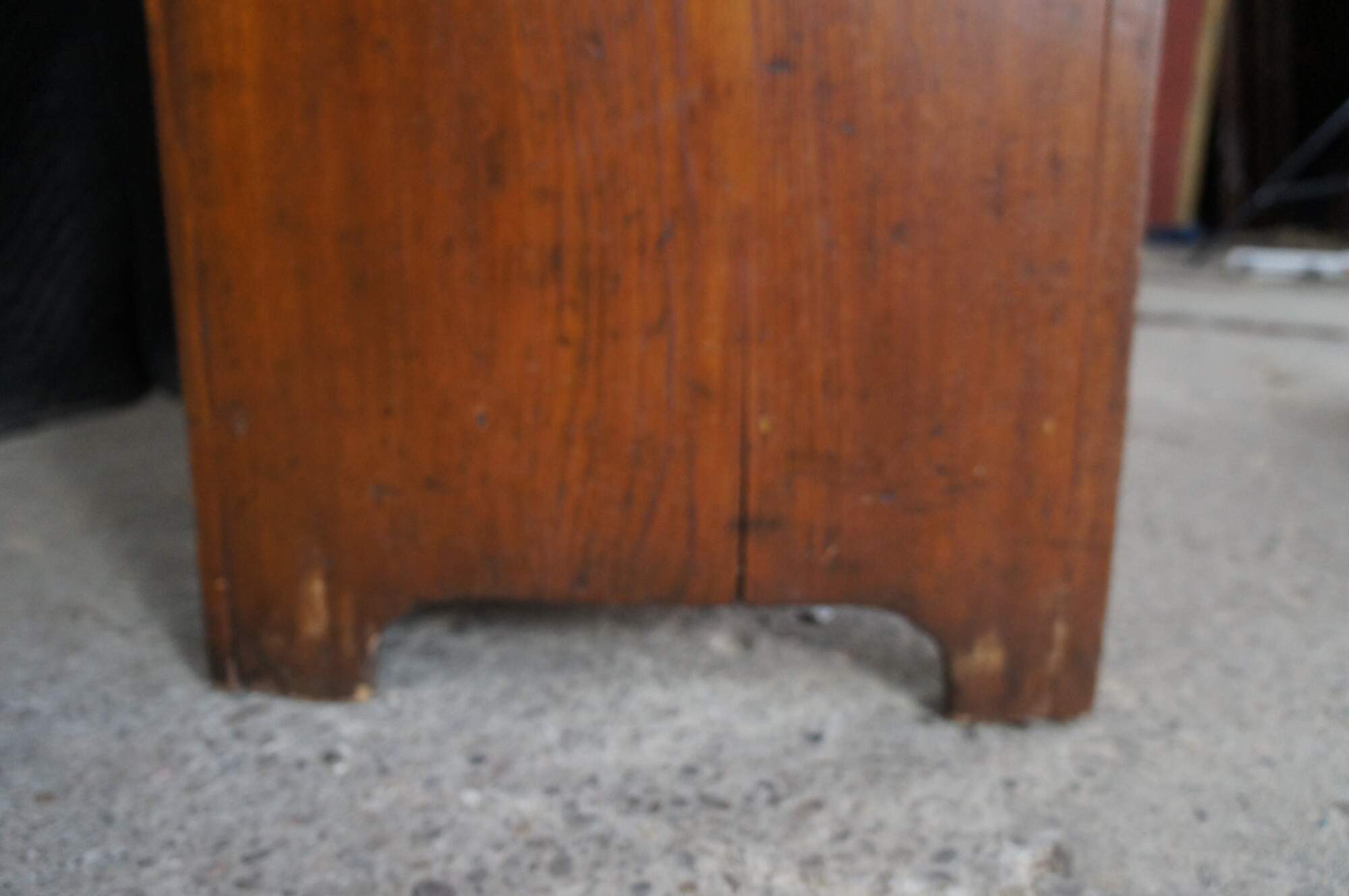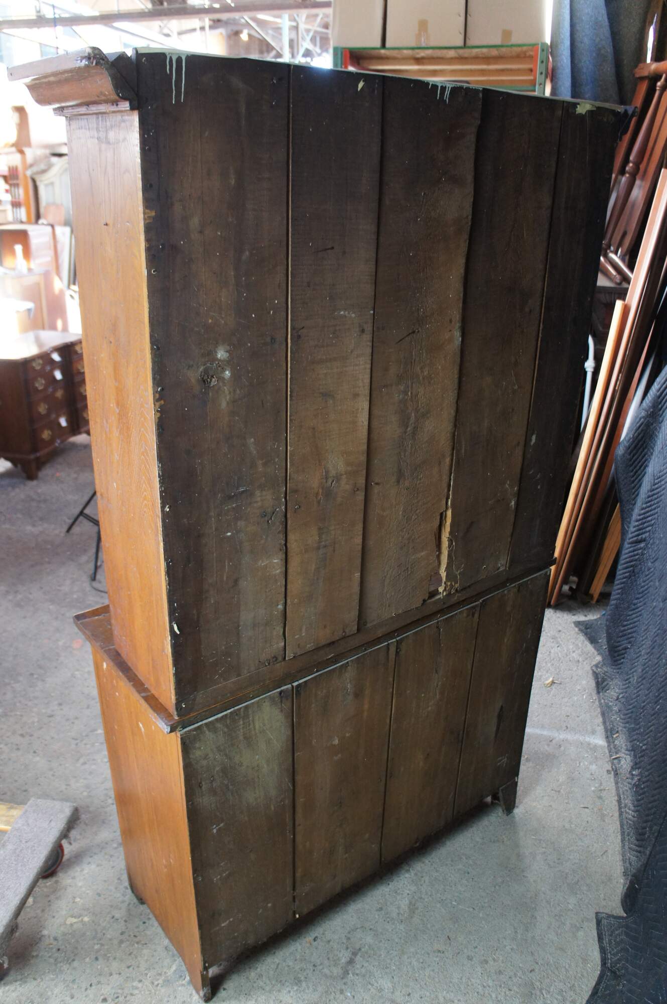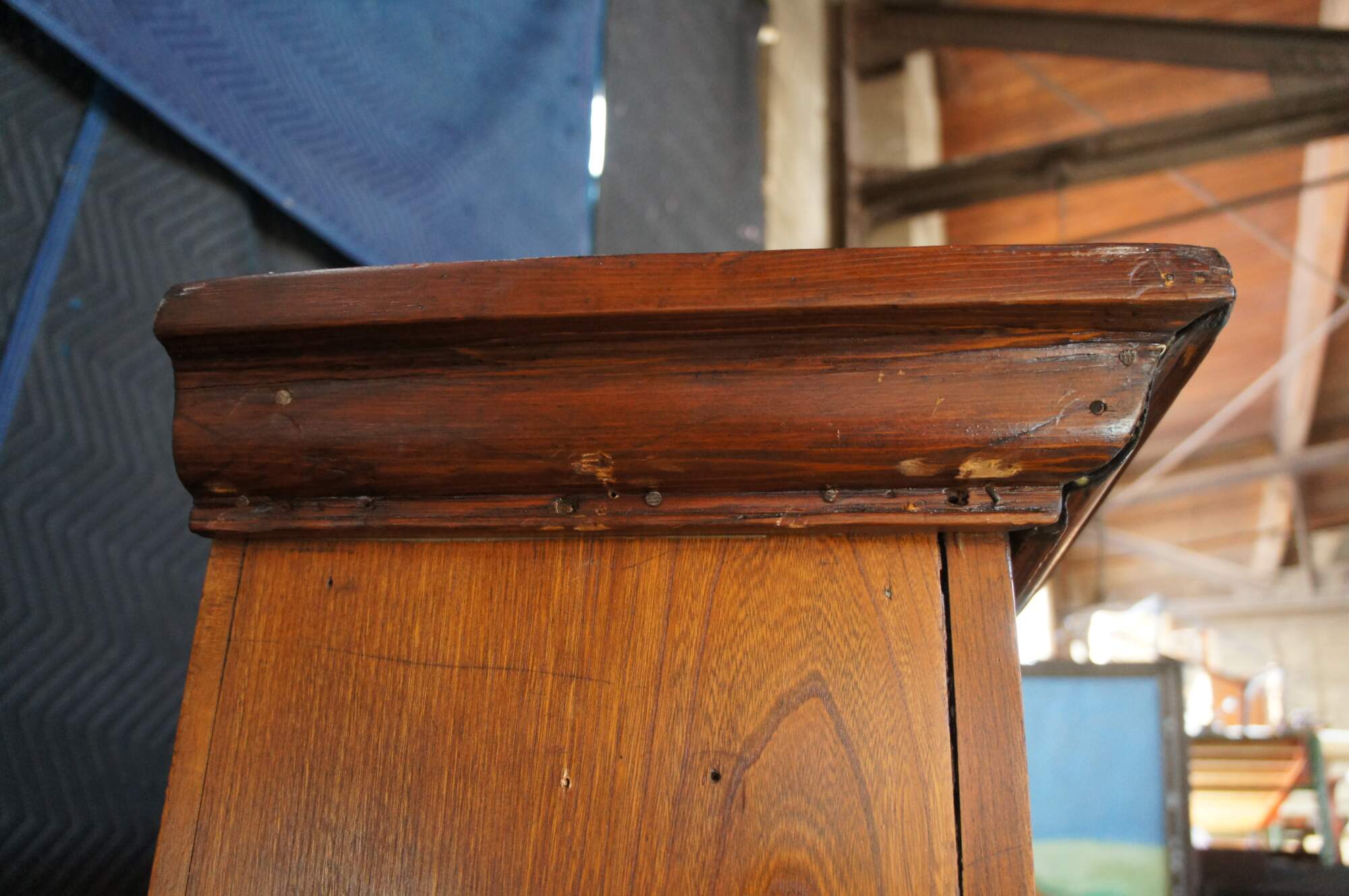 Good Antique Condition; General wear from use and age. Distressing and marking, old nail holes along side from where people hung pots, pans or towels. Some nails in the left side of the molding. Slight splitting along lower left edge of cabinet base. Separation / wear on backboard of hutch