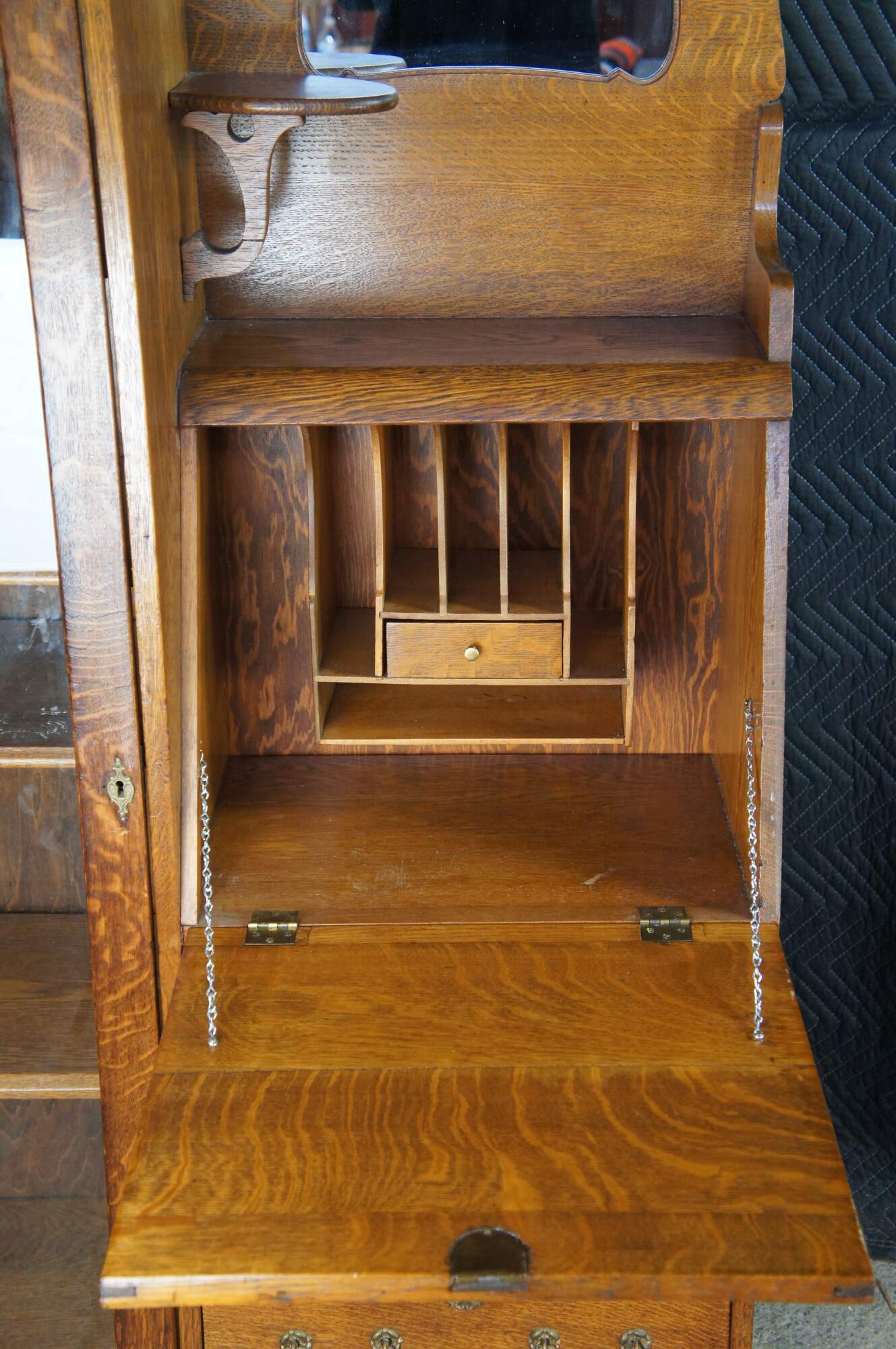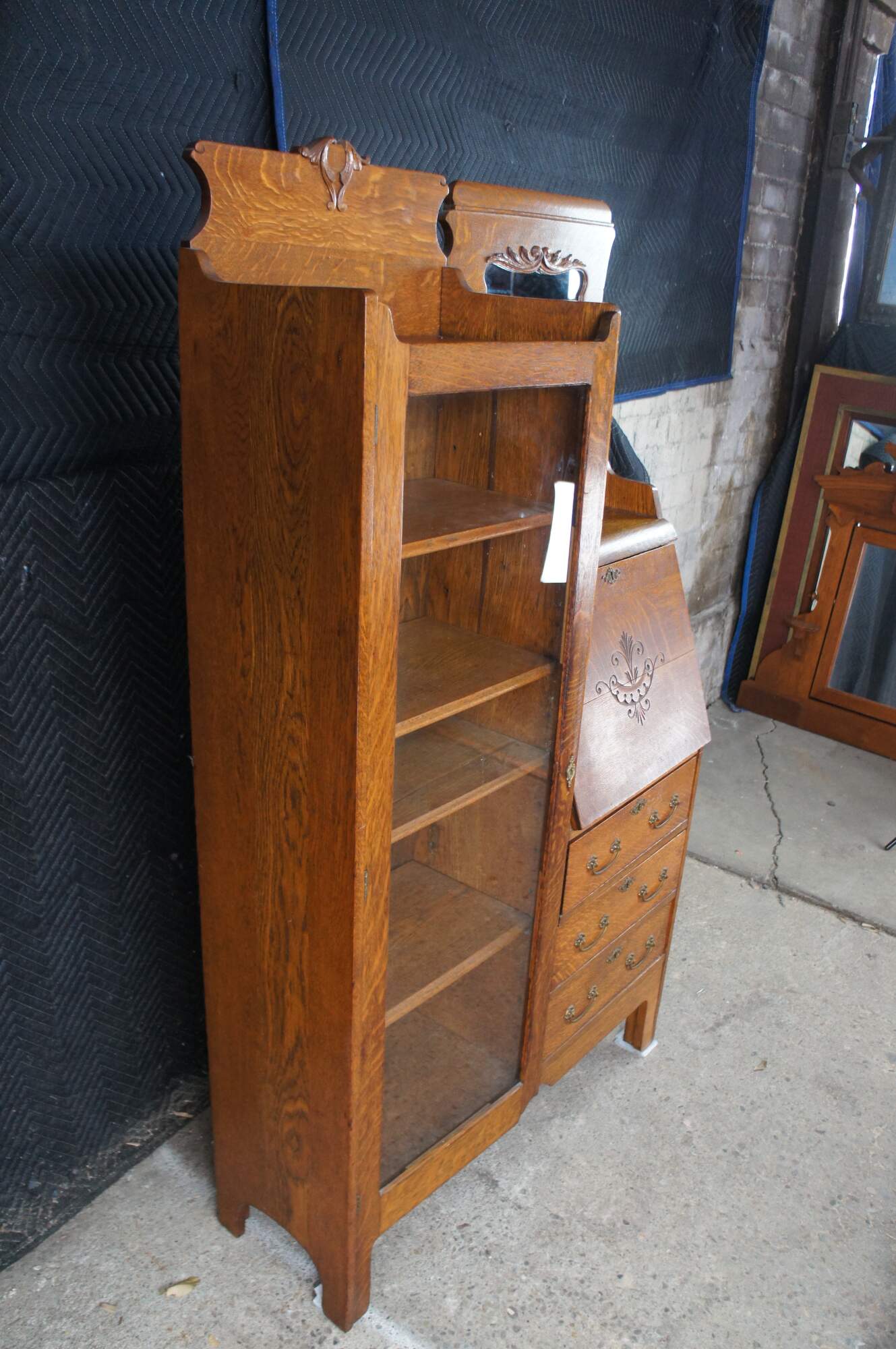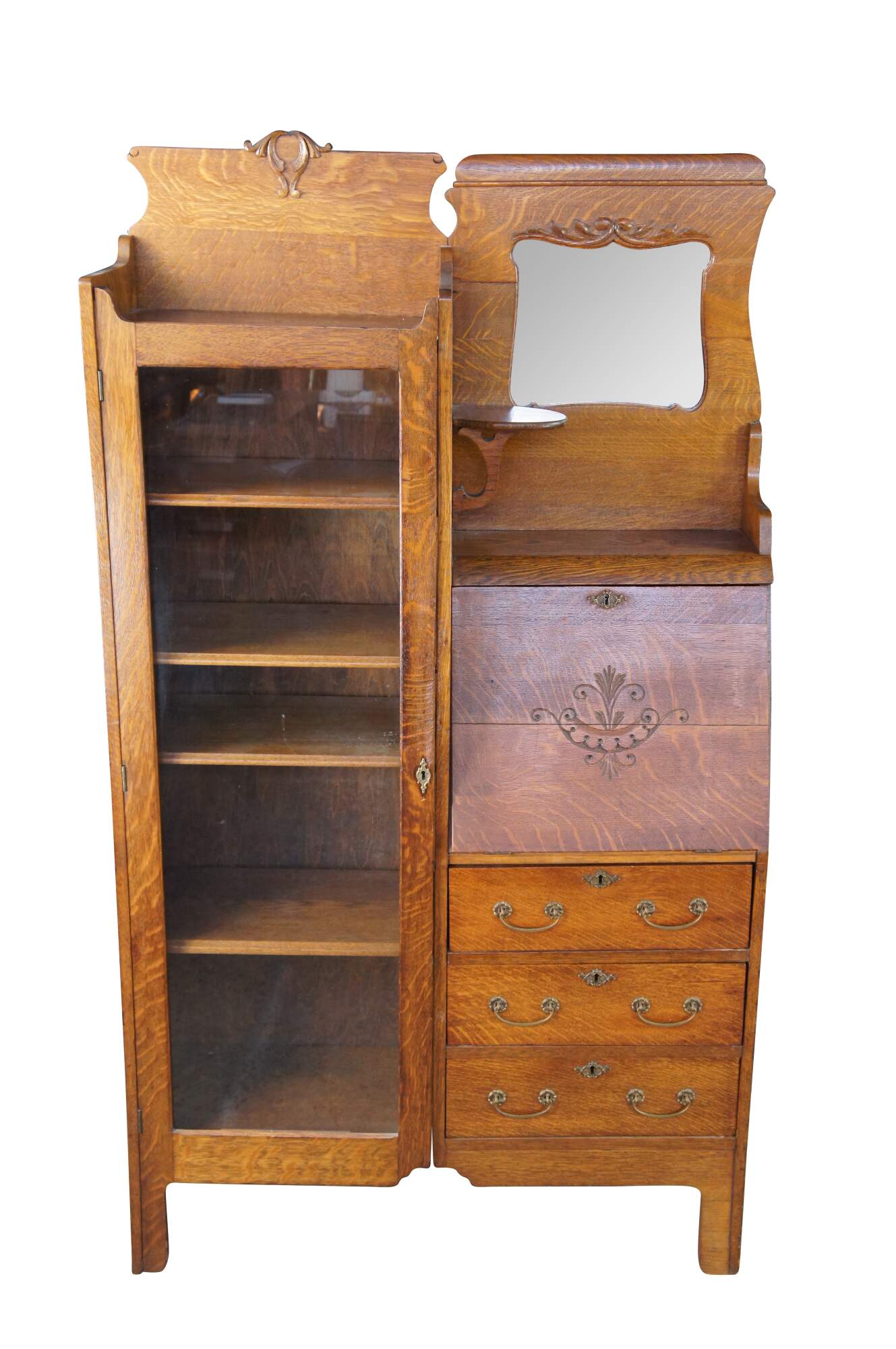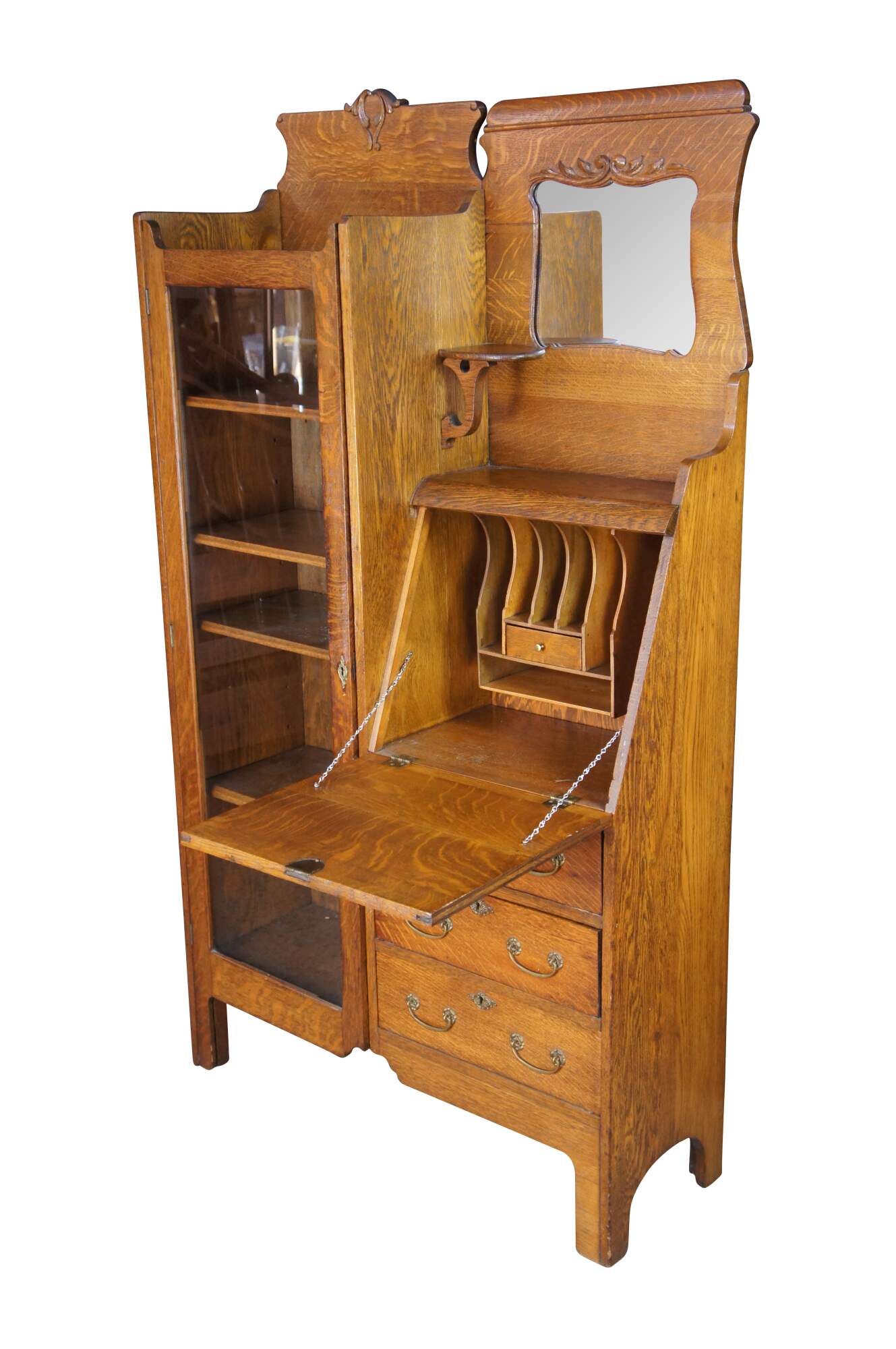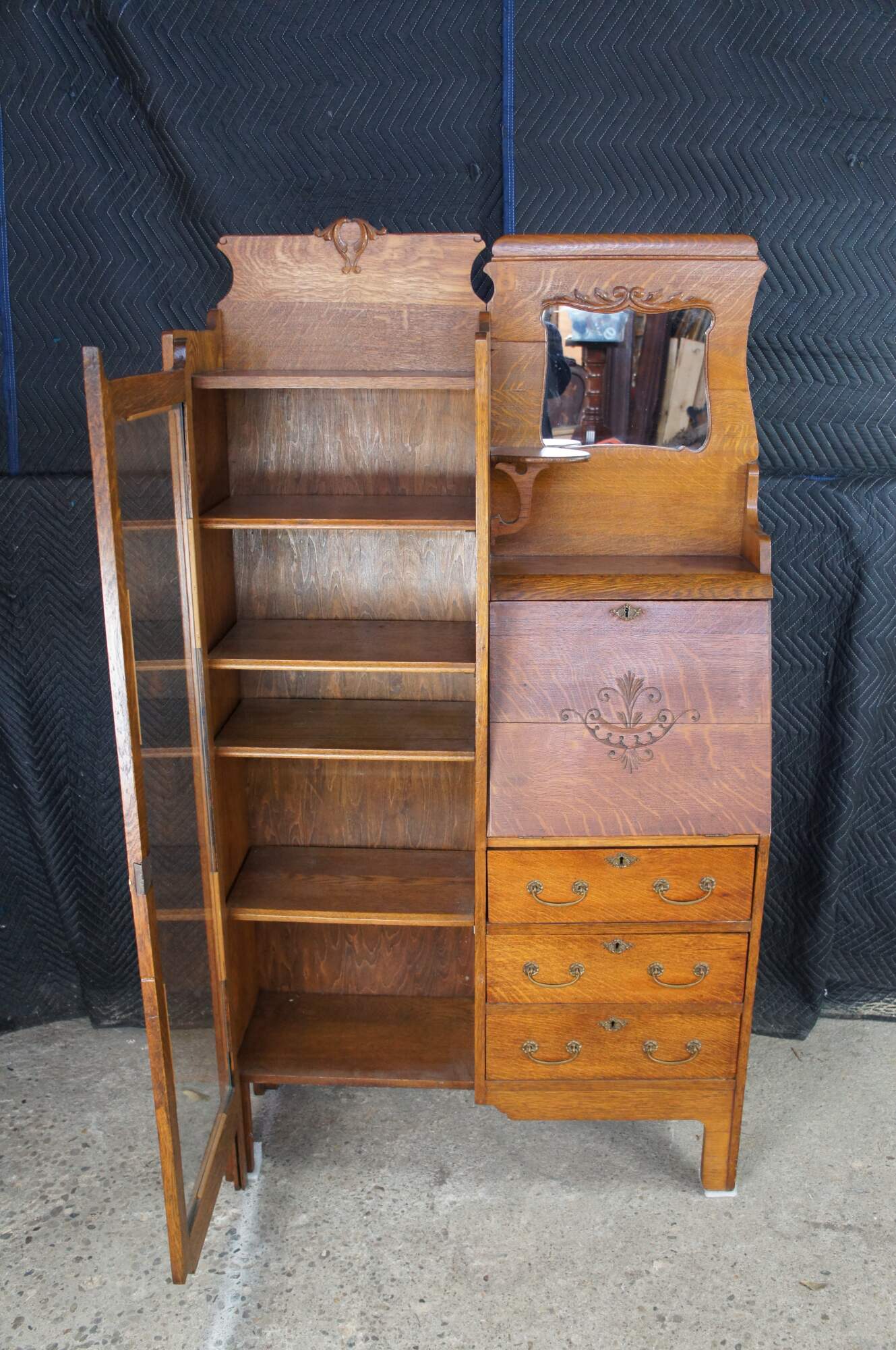 Antique Victorian side by side / secretary desk / bookcase / display case. Made of quartersawn oak featuring Art Nouveau styling with curio cabinet next to a drop front secretary over drawers that opens to writing surface with multiple cubbies and a drawer. Above the secretary, a sconce shelf sits below a mirror with carved acanthus accents.