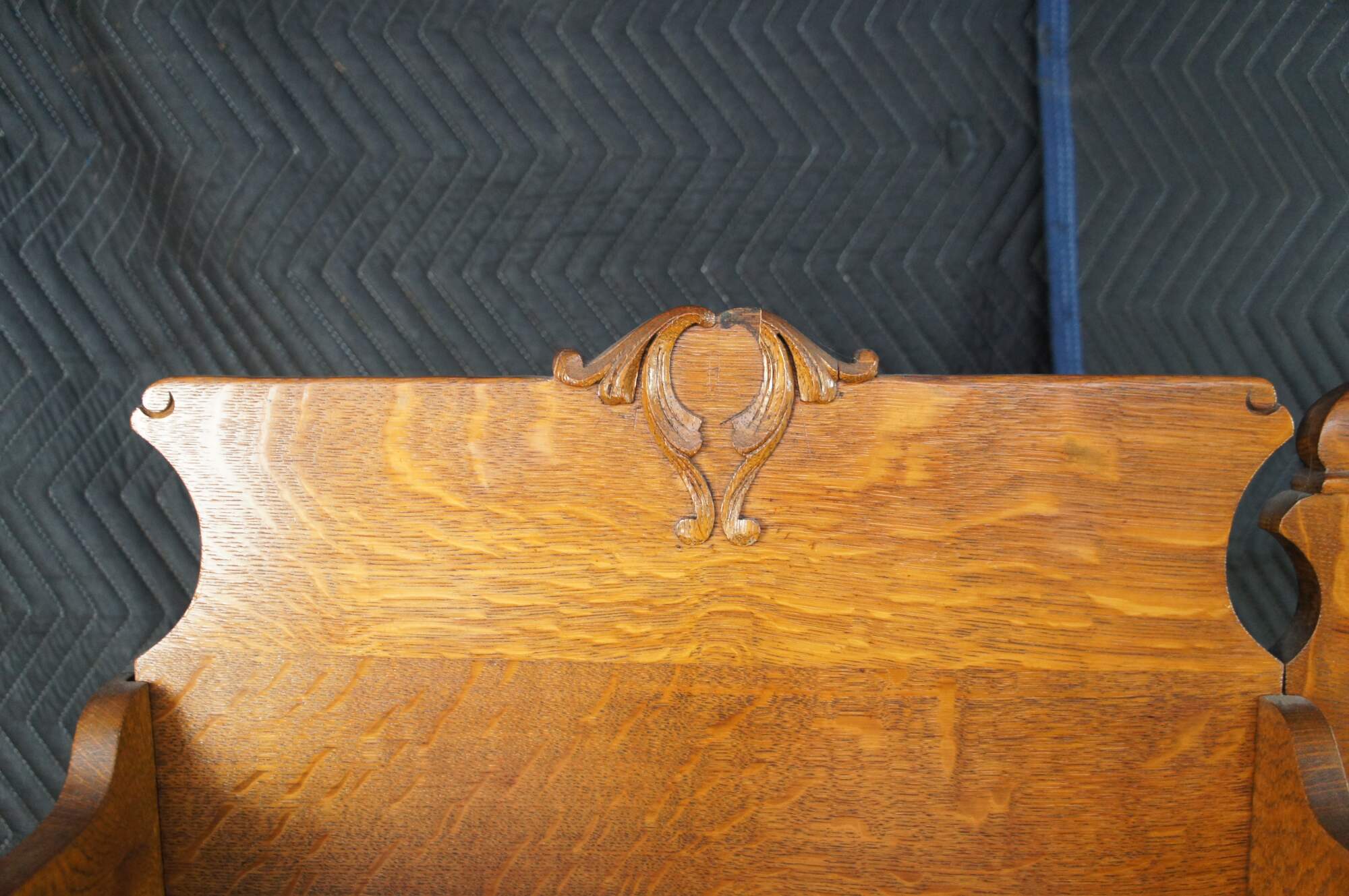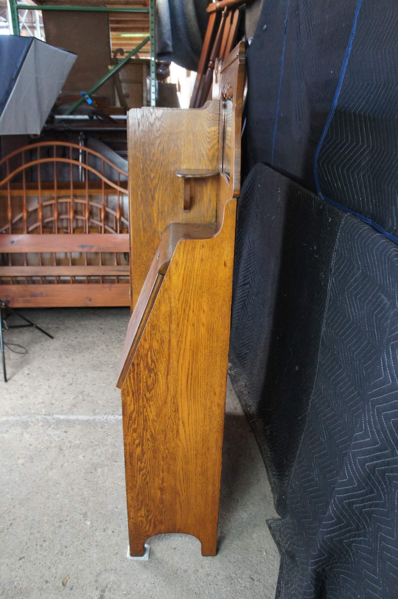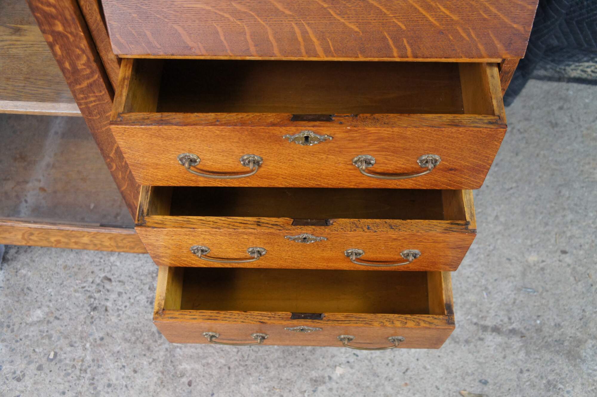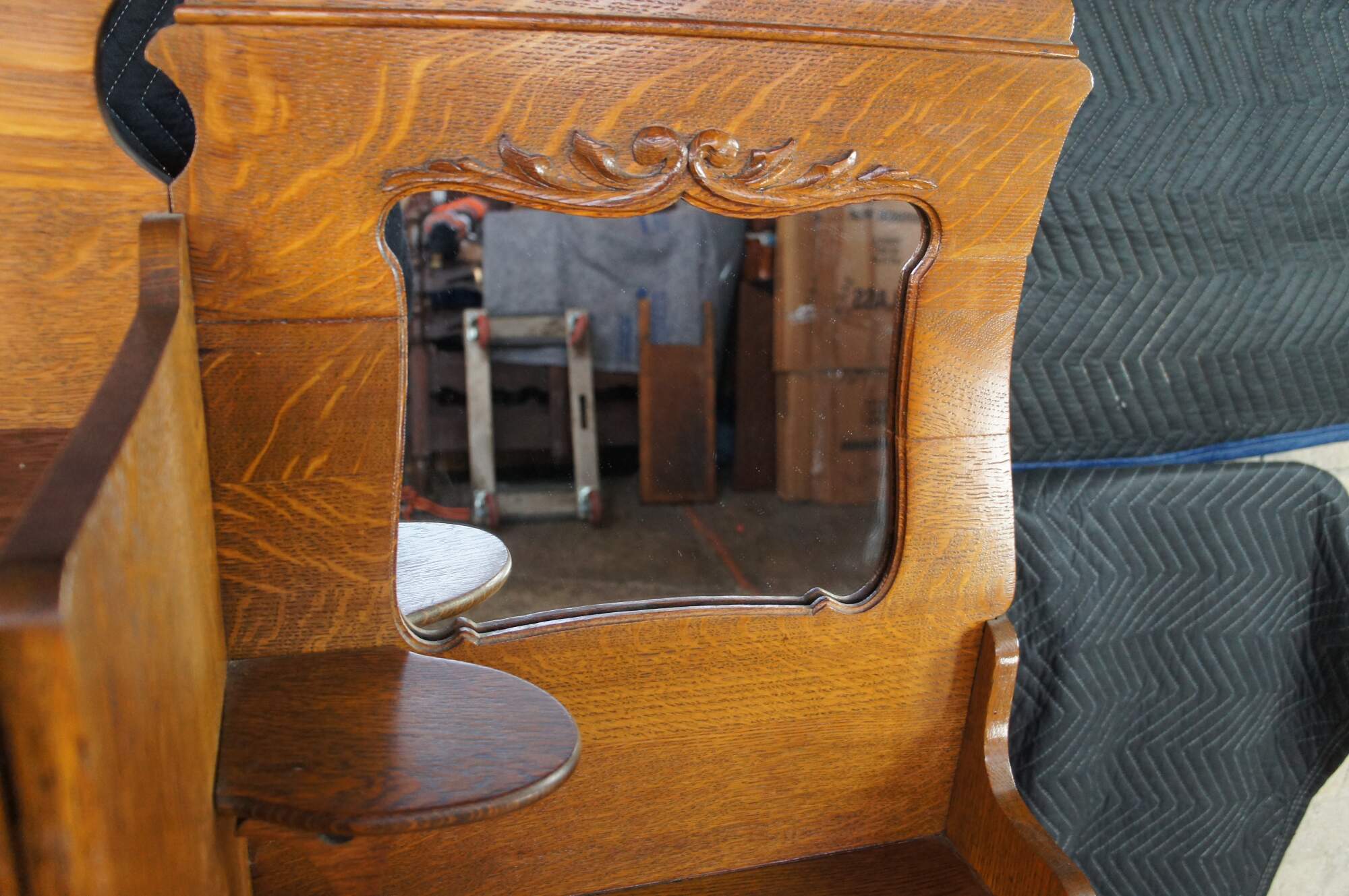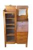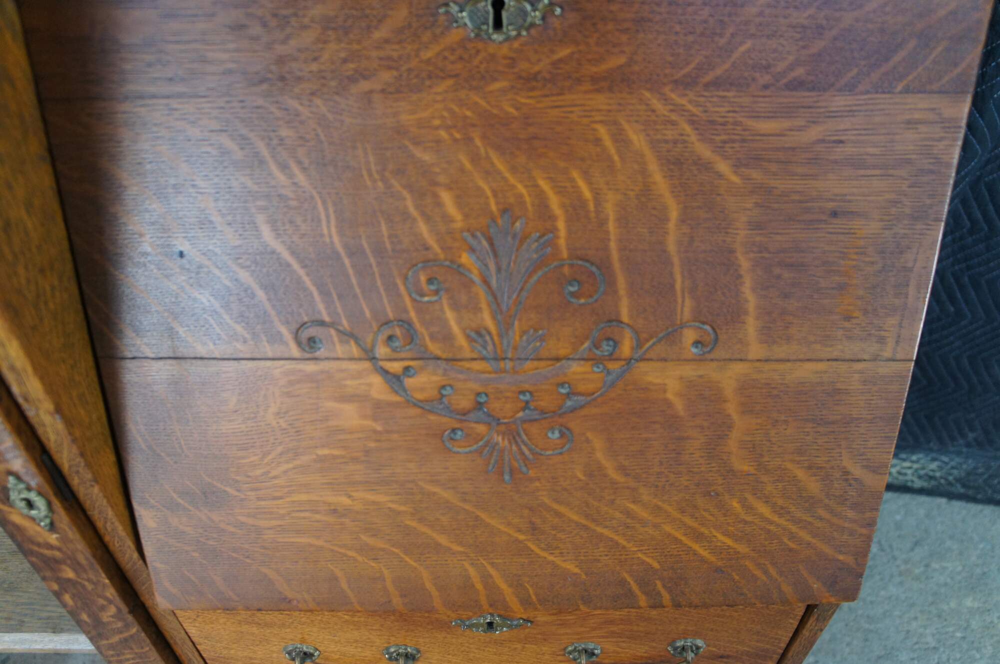 Antique Victorian side by side / secretary desk / bookcase / display case. Made of quartersawn oak featuring Art Nouveau styling with curio cabinet next to a drop front secretary over drawers that opens to writing surface with multiple cubbies and a drawer. Above the secretary, a sconce shelf sits below a mirror with carved acanthus accents.