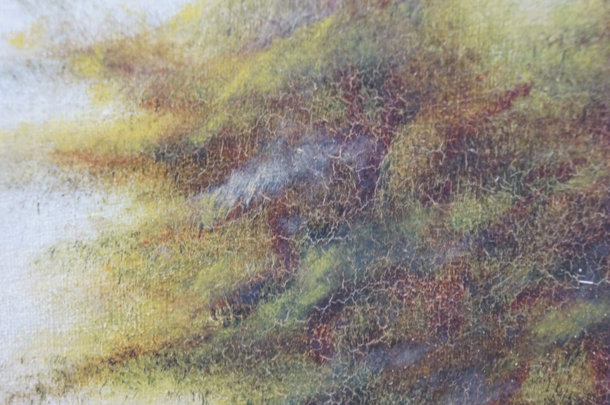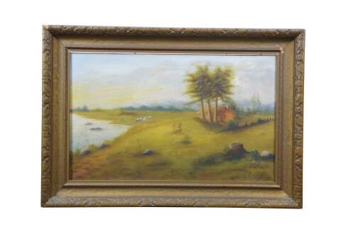 Antique 1916 William Edwin Fitzmaurice Impressionist country landscape oil painting on canvas, depicting a tranquil pastoral scene with river / lake, farmhouse and sheep. Signed lower right.