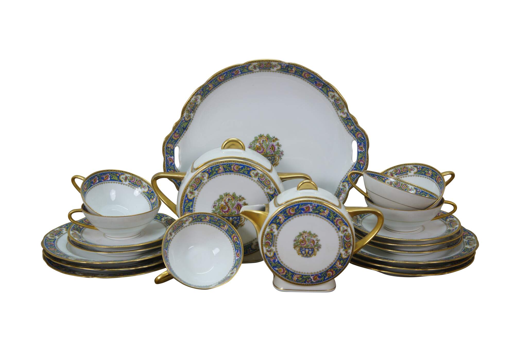 22 pieces of early 20th century Art Deco French Limoges porcelain plates by T.L.B. (Touze, Lemaître Frères & Blancher). White porcelain with gold gilt details and folk art style floral pattern in blue, pink, and yellow. Includes: 1 Serving Plate, 5 Bread Plates, 5 Saucers, Teapot with Lid, 6 Teacups, Dessert Plate, and Sugar / Waste Pot with Lid. Made in France.