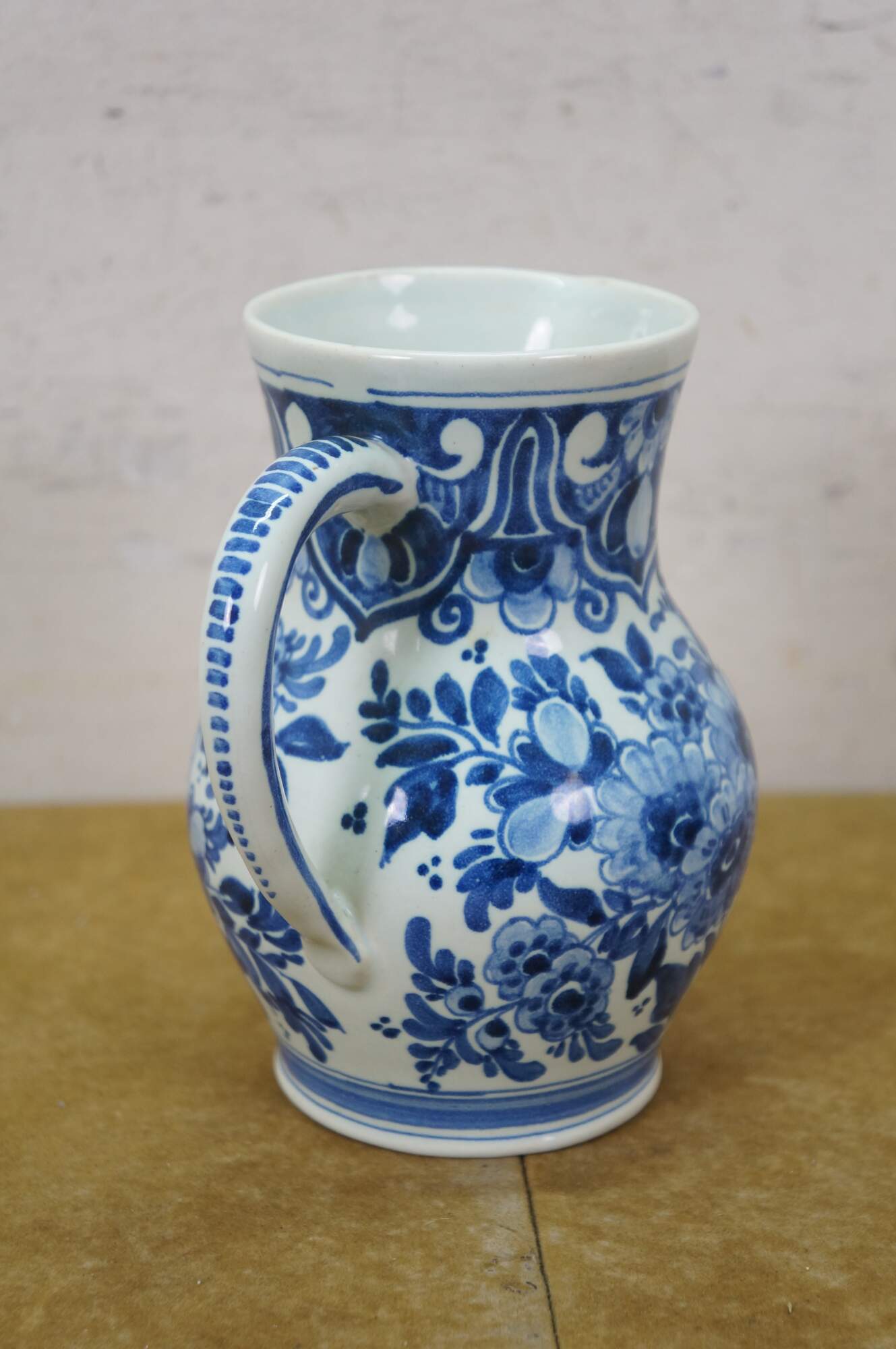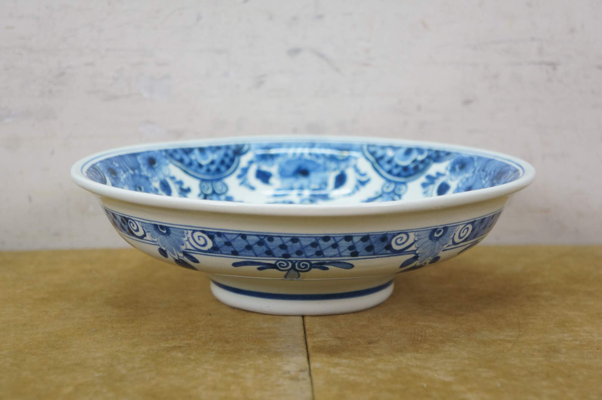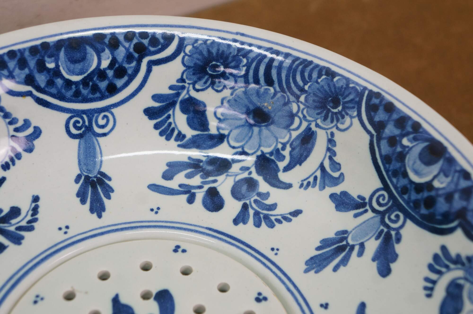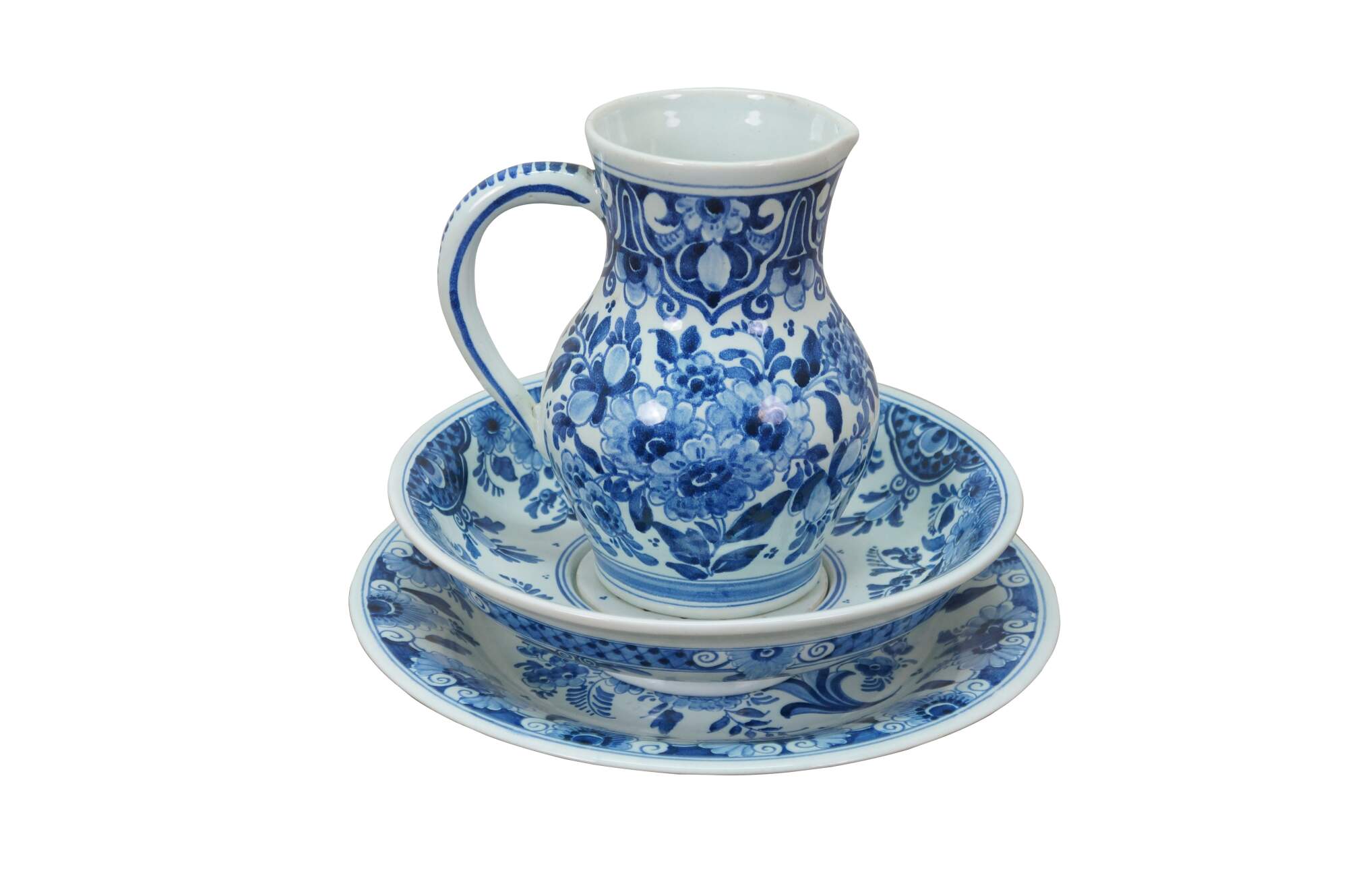 Vintage Dutch Holland Porceleyne Fles Royal Delft blue and white serving set. It features a plate, creamer pitcher / jug, and fruit / berry / vegetable bowl with reticulated drain basin.