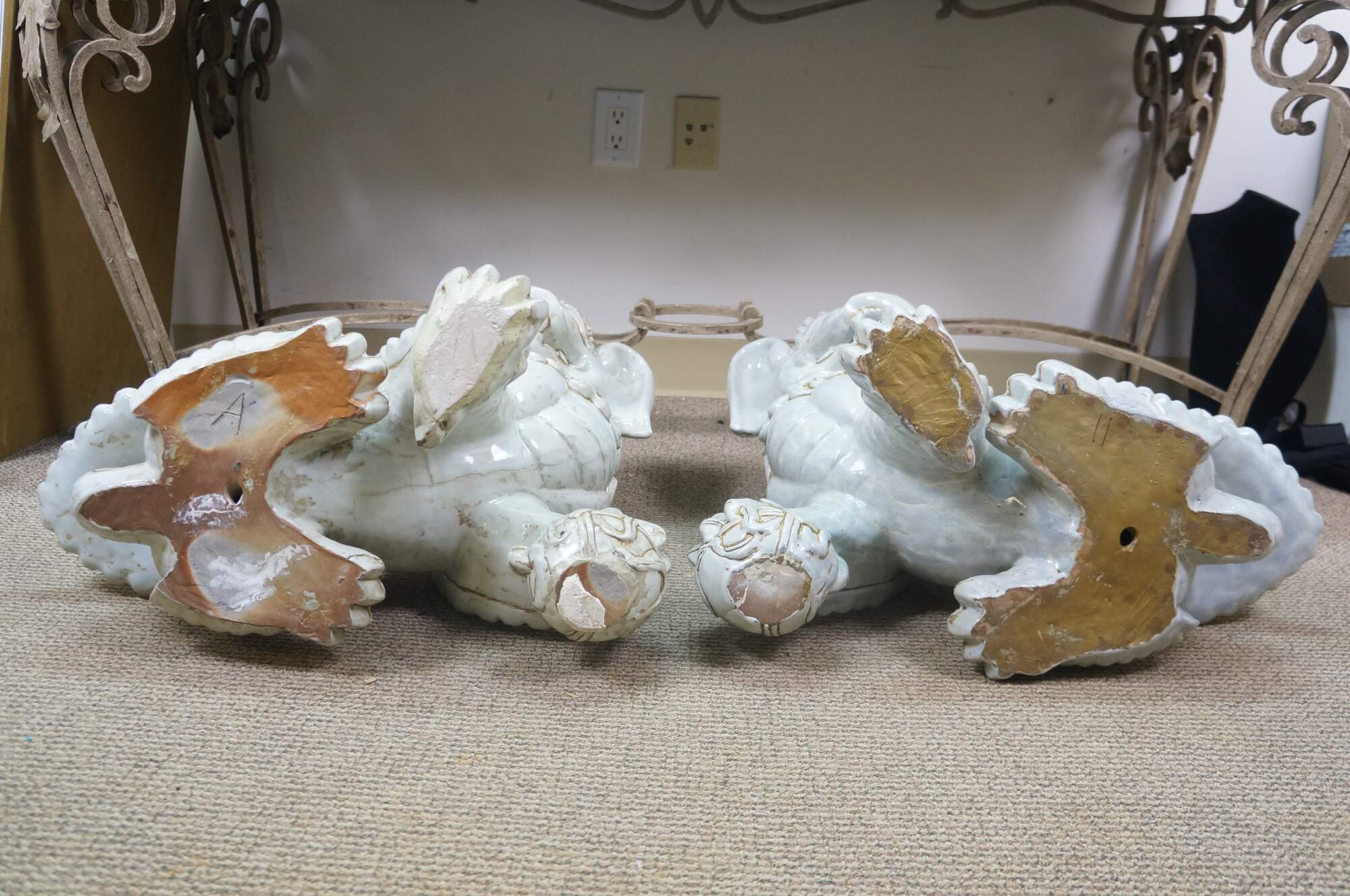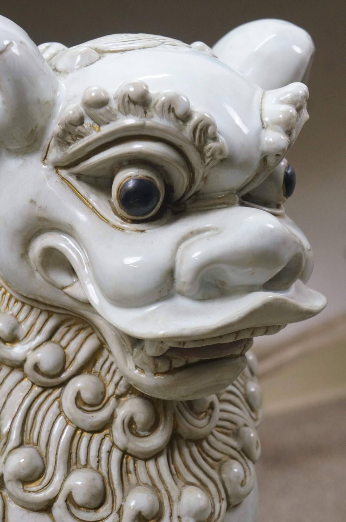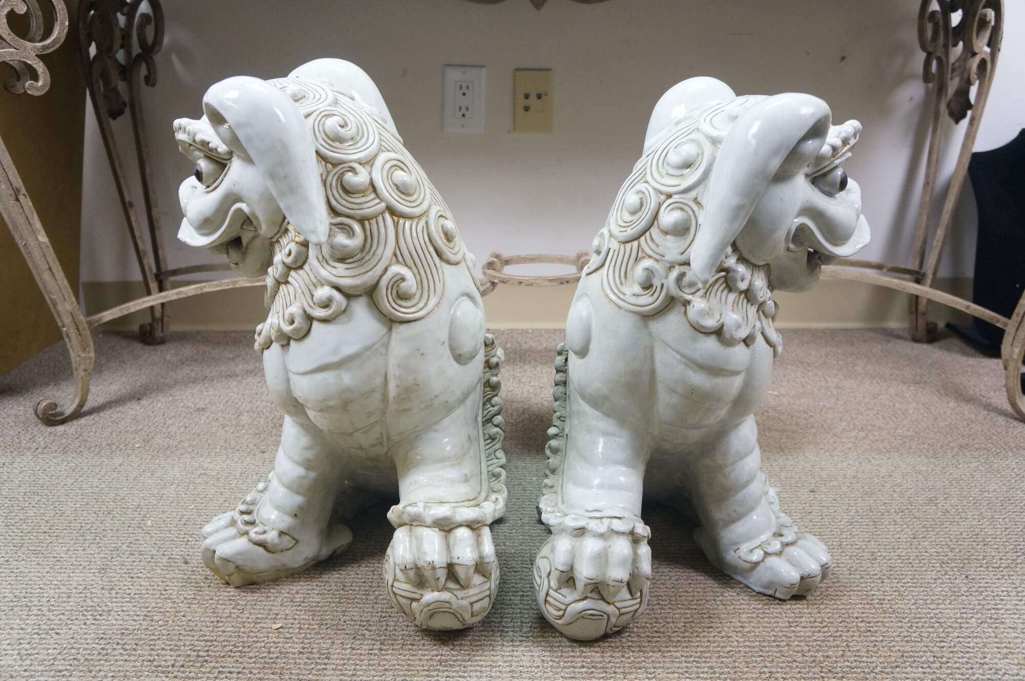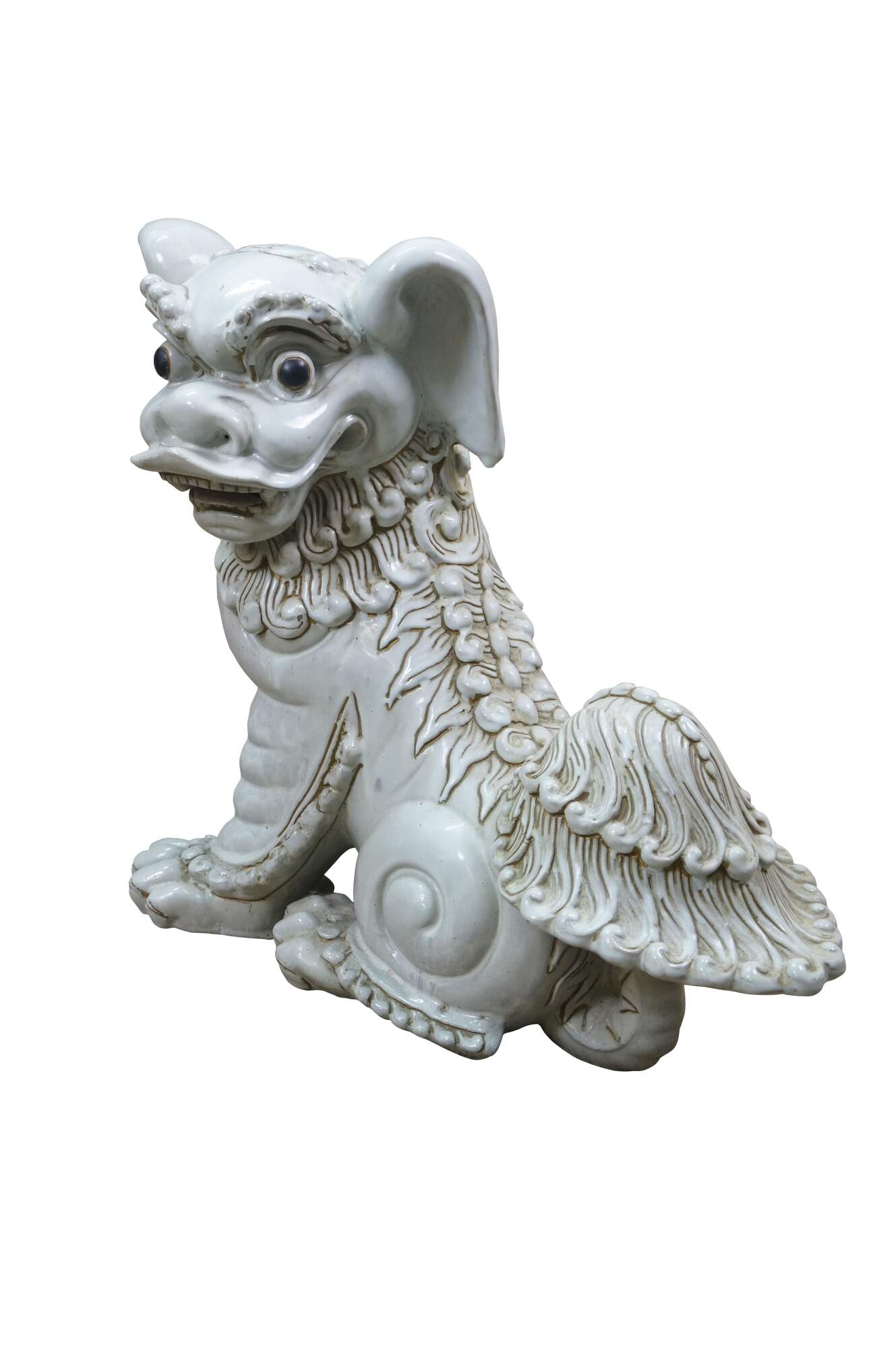 A large and impressive pair of blanc de chine porcelain Chinese guardian lions / Foo Dogs / Shishi. Made from high-quality kaolin clay and fired at high temperatures to achieve a lustrous, translucent white color. These mythical lion like statues represent protection and wealth - as protectors of temples, palaces, and homes, symbolizing power, prosperity, and warding off evil spirits, traditionally placed in pairs (left and right facing) to represent yin and yang.