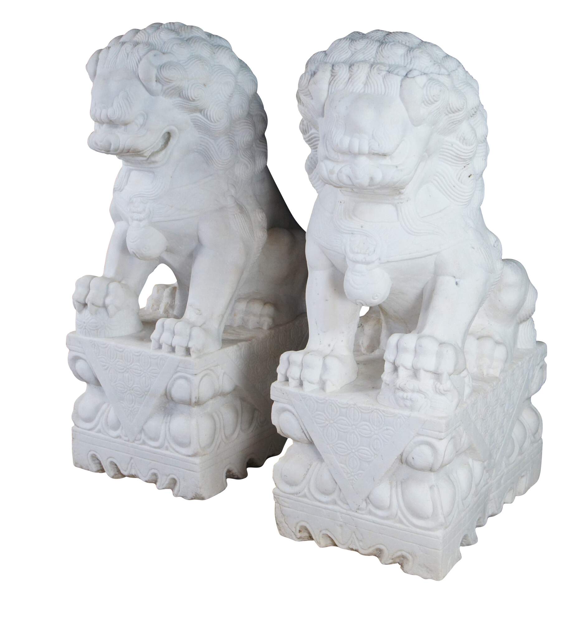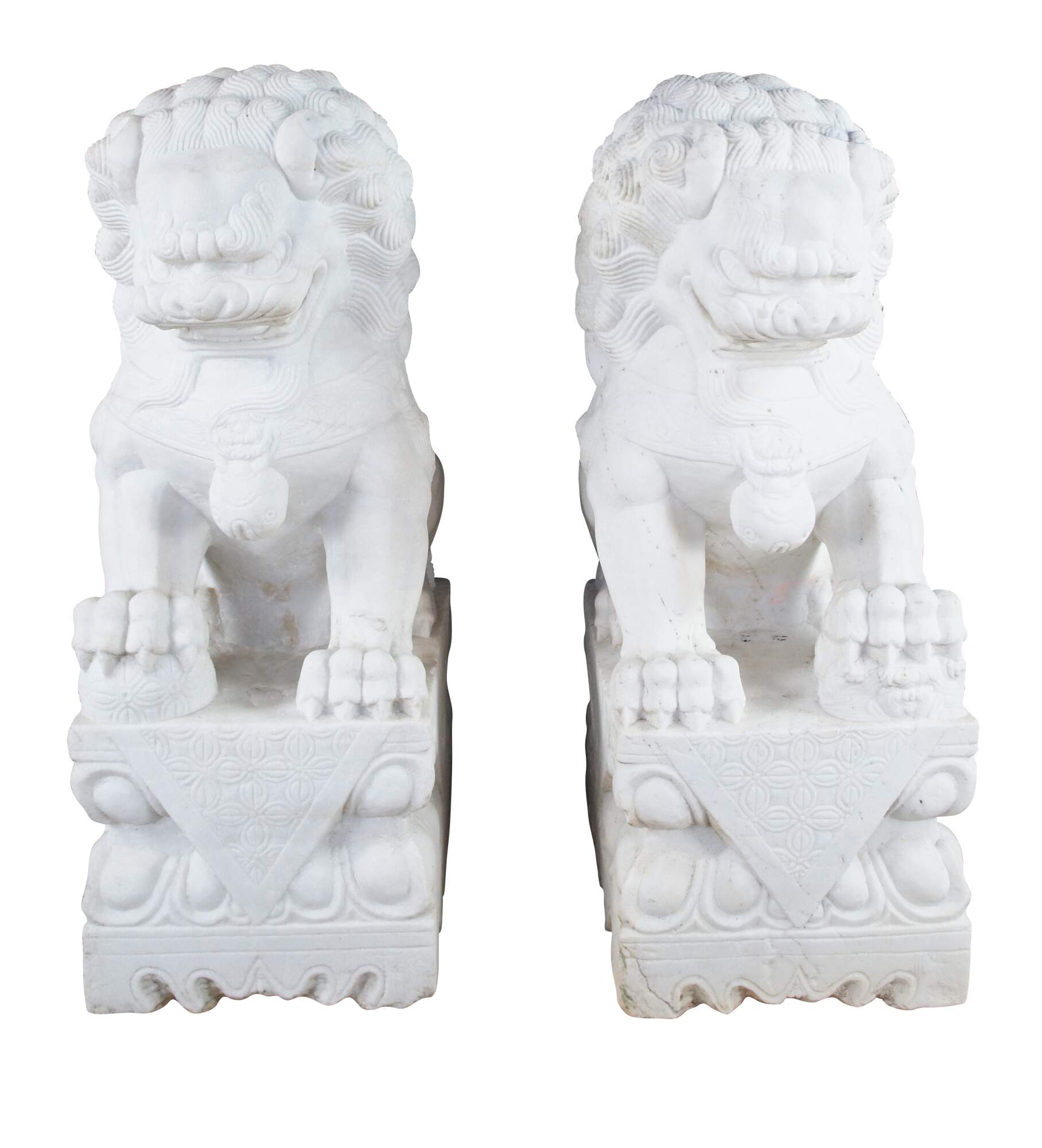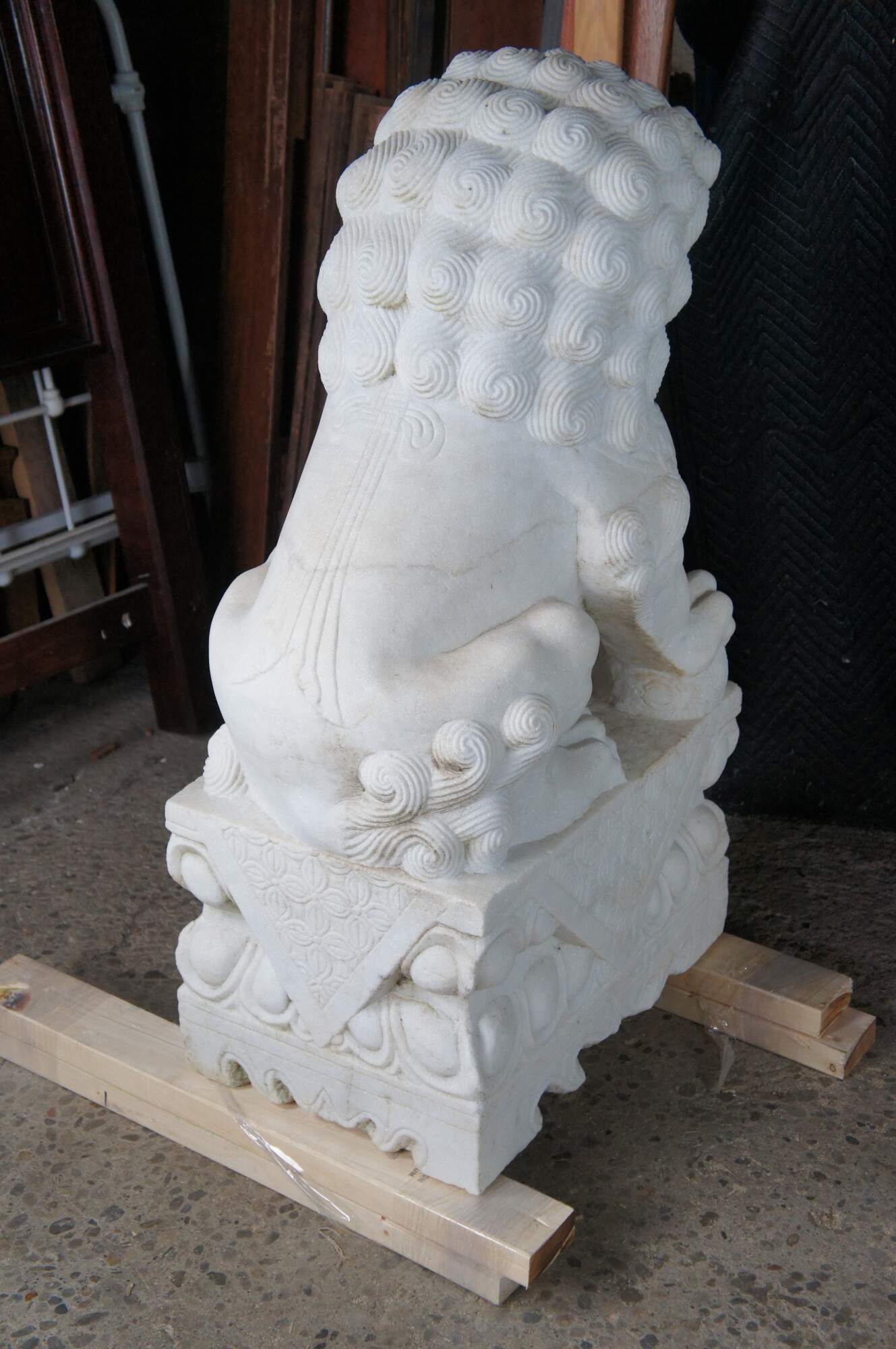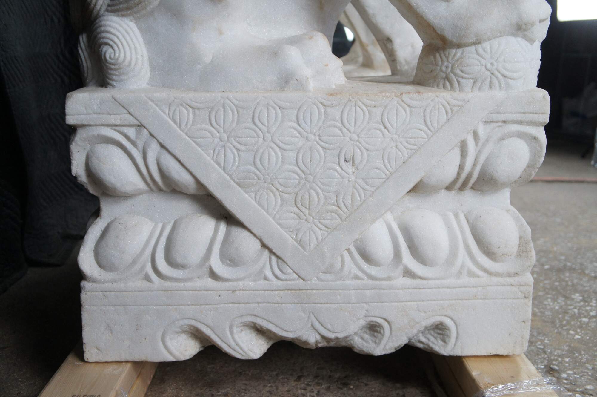 Two monumental antique Chinese Foo Dogs, circa mid 20th century. Made of white marble featuring meticulously carved detail. Each Guardian is set over a large plinth base with inverted gadrooning in the manner of repeating ball and claw feet centered by triangular sheilds with geometric floral motif.