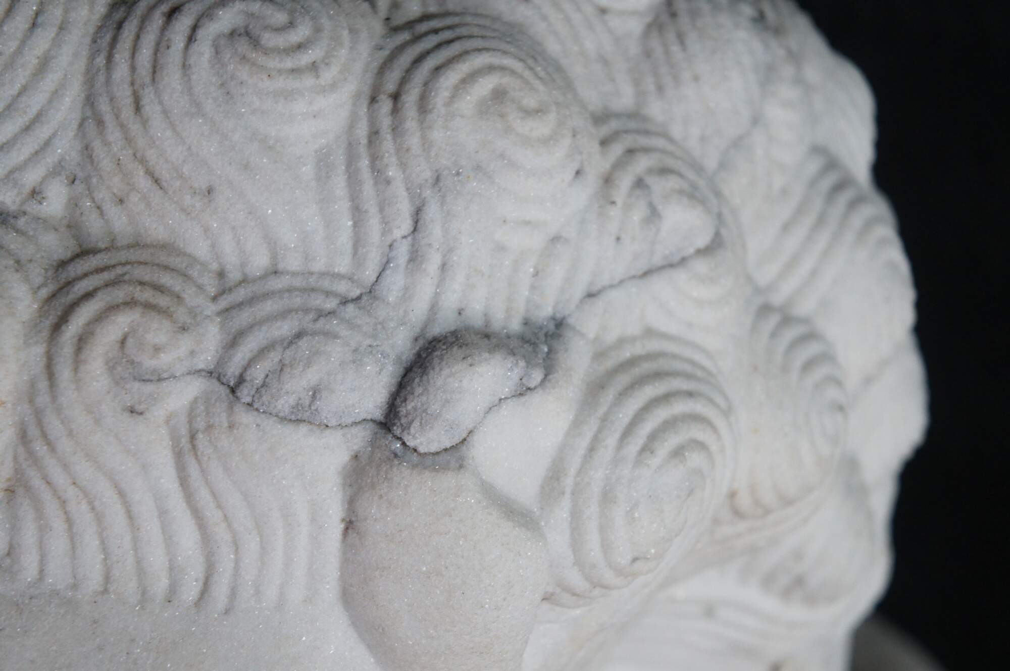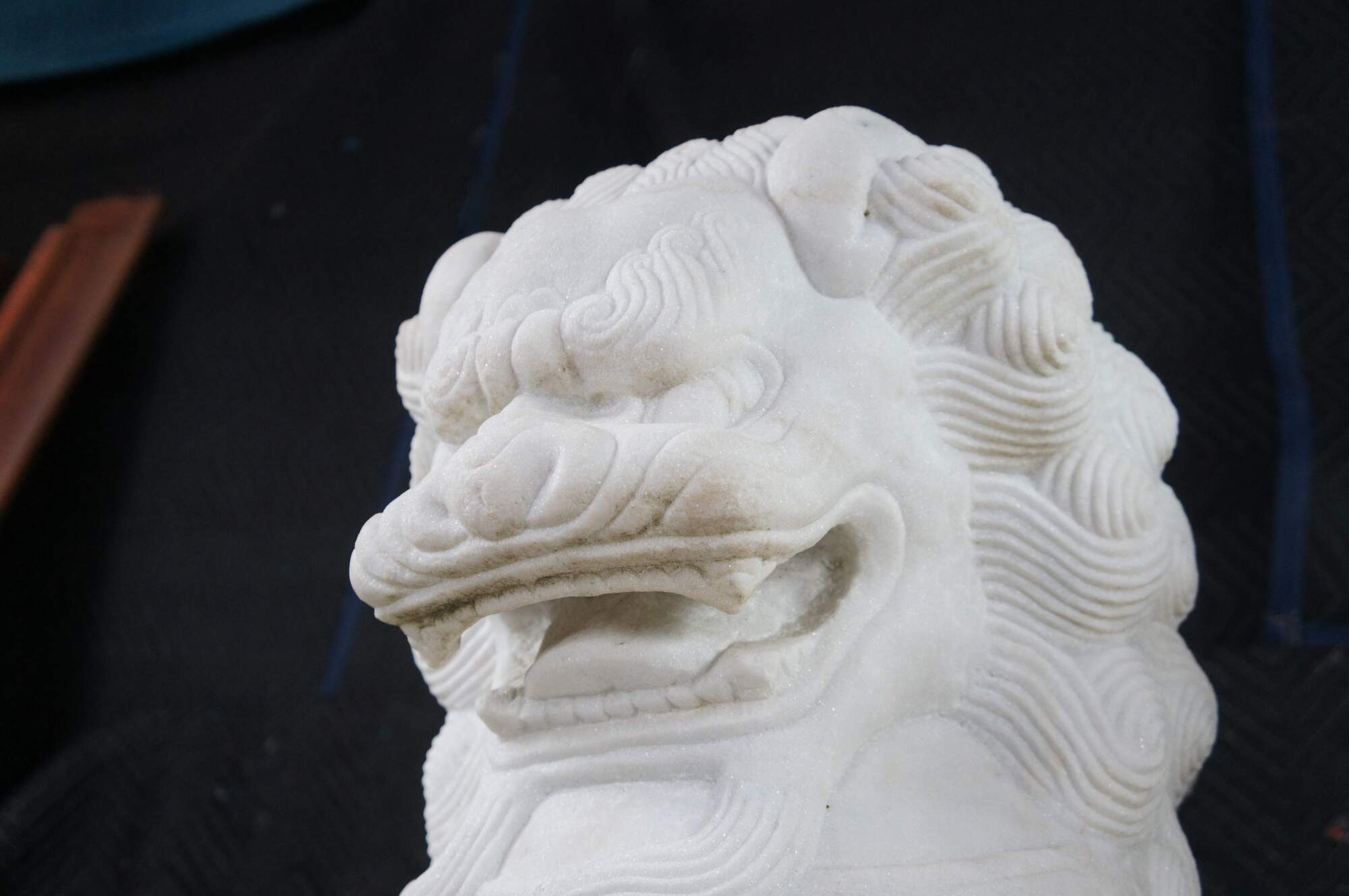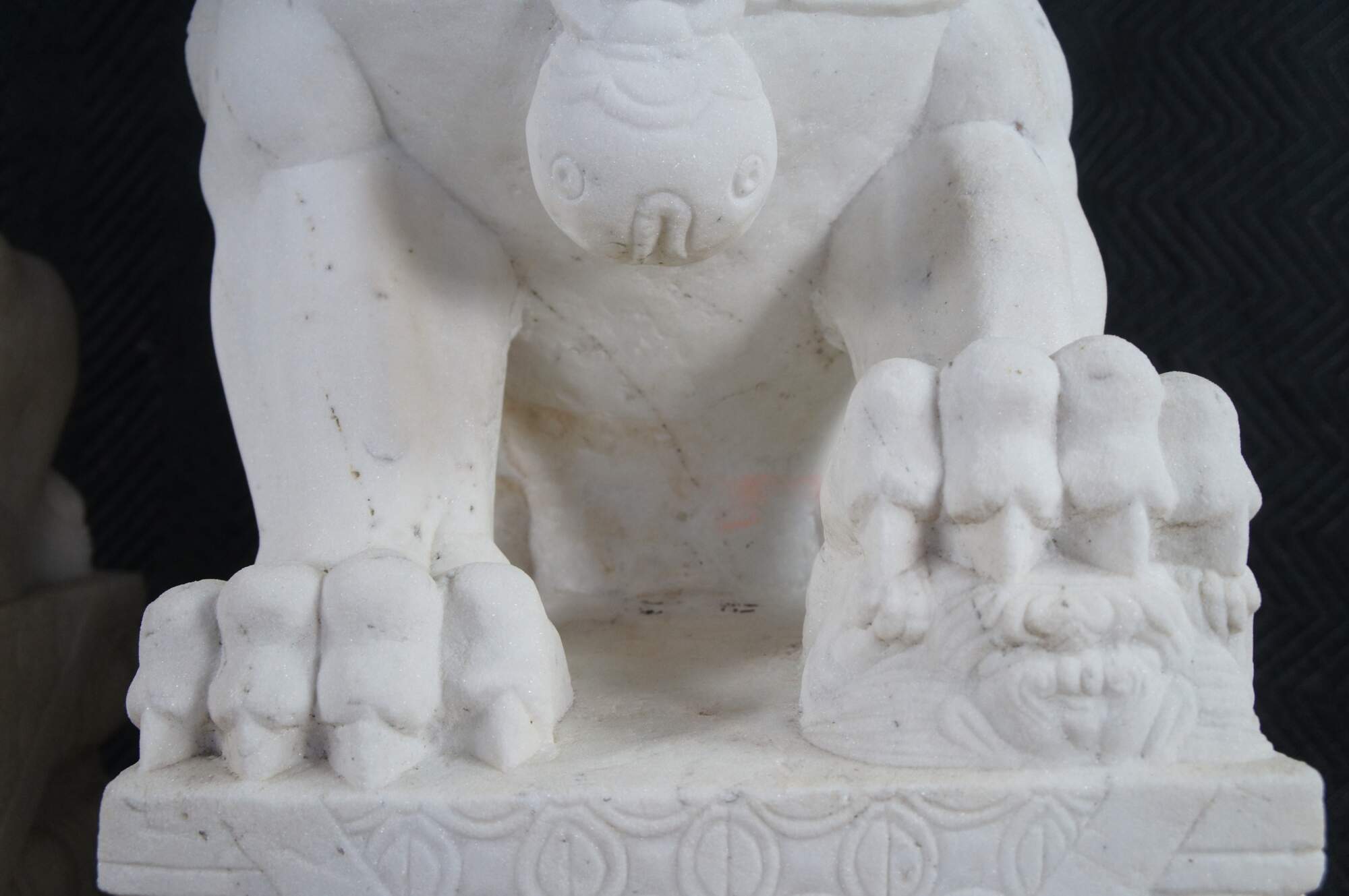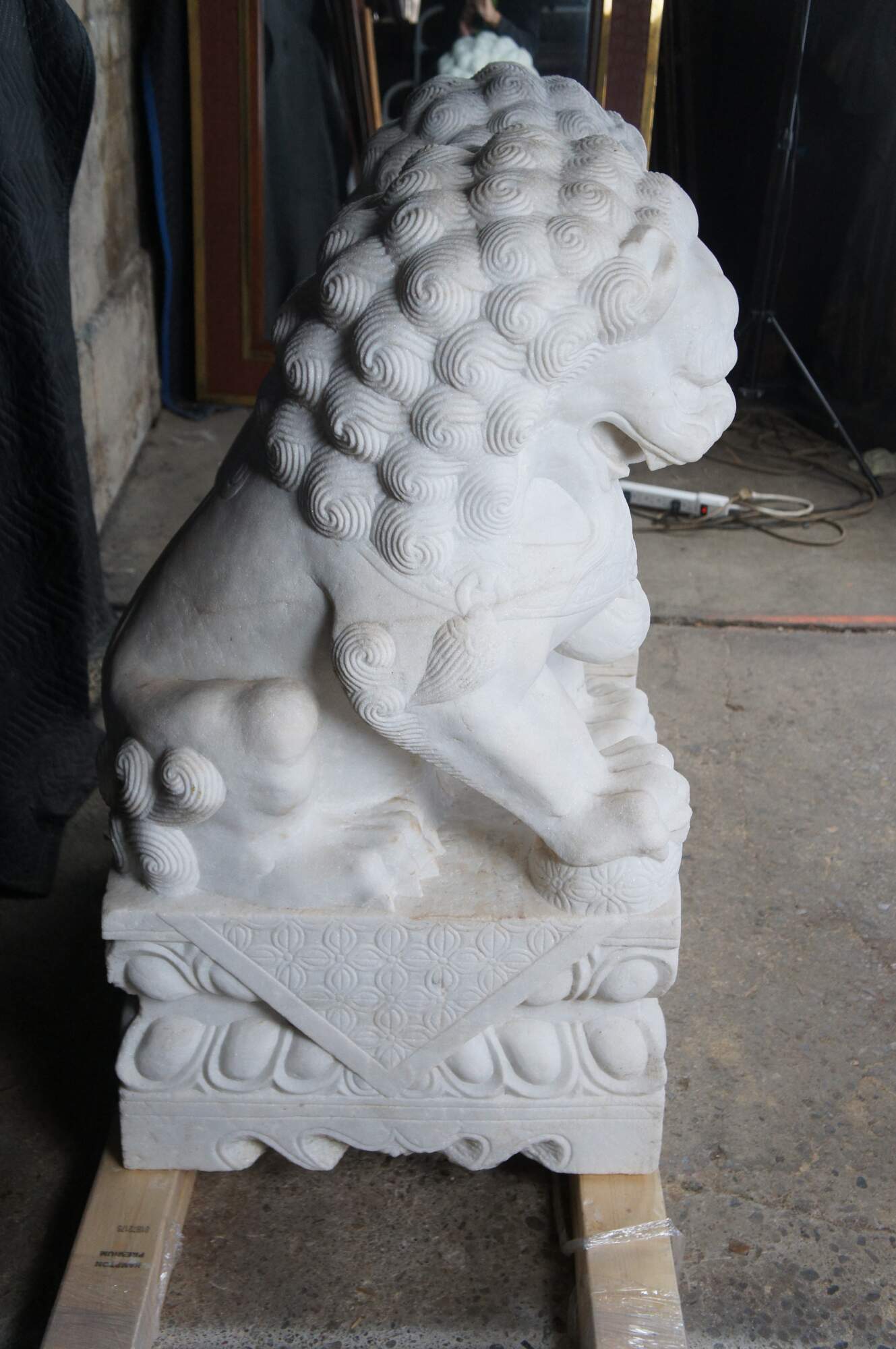 Two monumental antique Chinese Foo Dogs, circa mid 20th century. Made of white marble featuring meticulously carved detail. Each Guardian is set over a large plinth base with inverted gadrooning in the manner of repeating ball and claw feet centered by triangular sheilds with geometric floral motif.