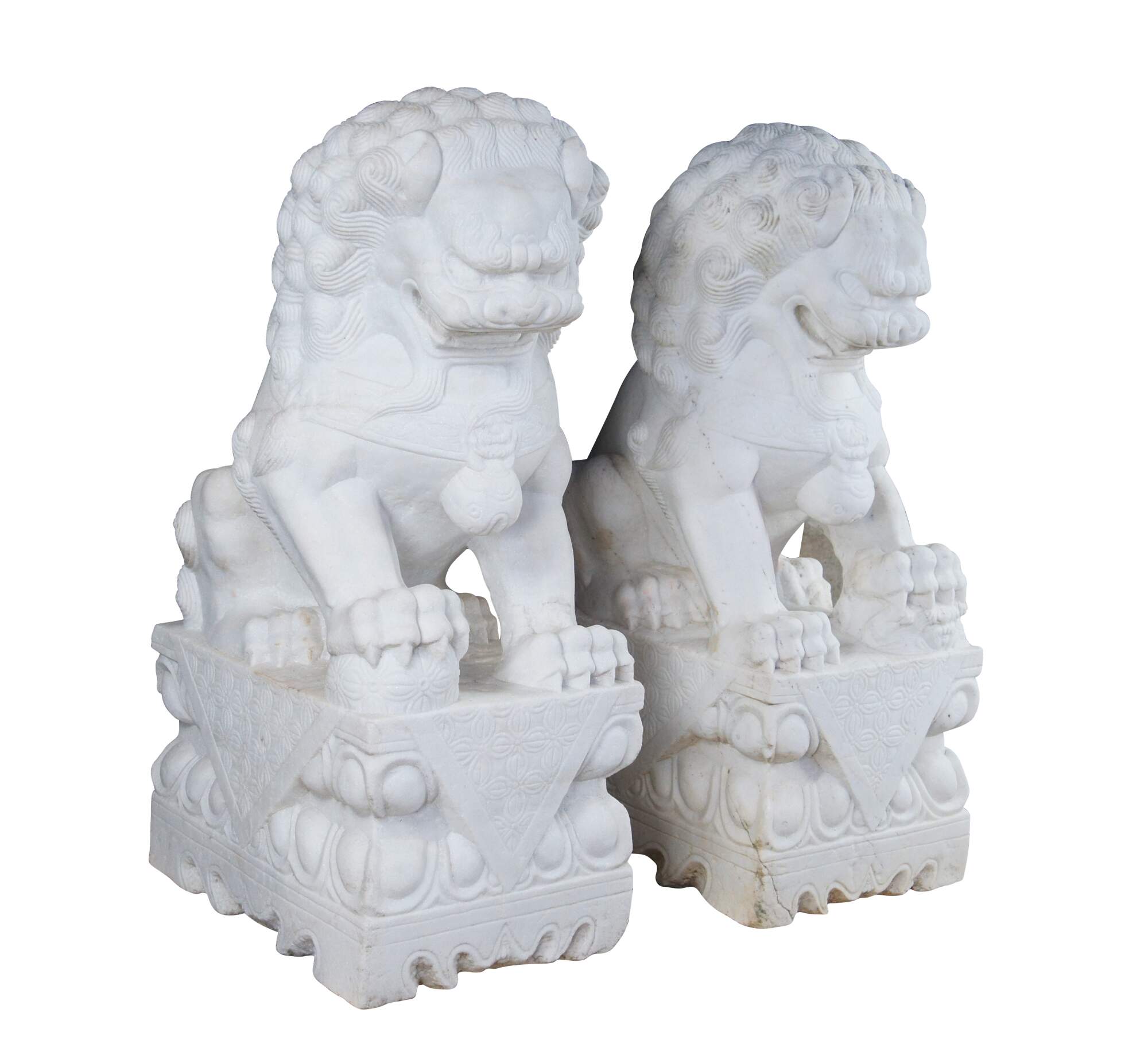Known as Chinese guardian lions, imperial guardian lions, stone lions, shishi, lion dogs or foo / fu dogs. The female represents yin, and symbolically protects the people dwelling inside the home, while the male statue, representing yang, protects the structure itself. The male is recognized as the one resting his paw on the ball, which represents the world, and the female is shown with one paw on a cub.