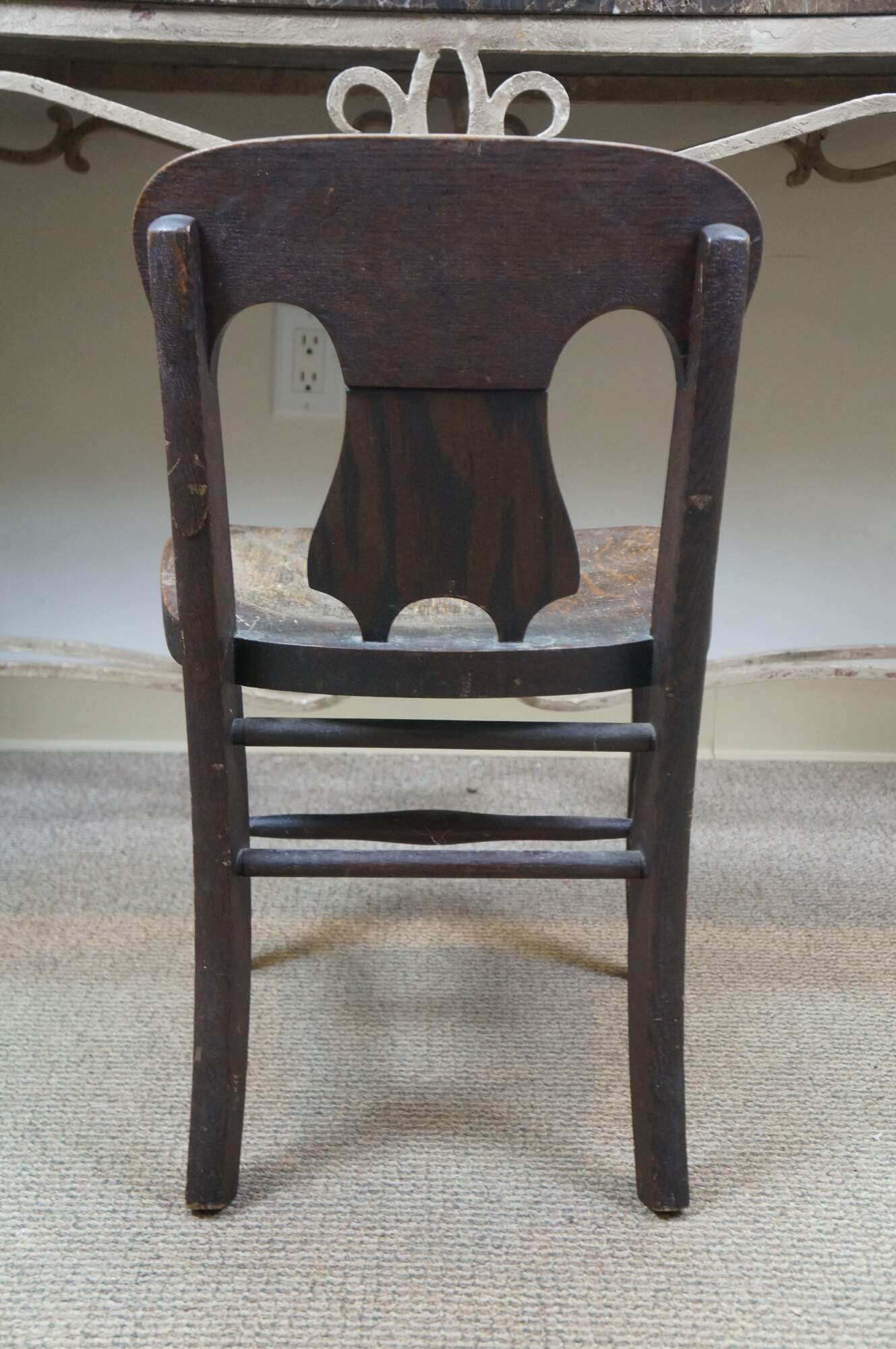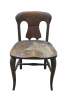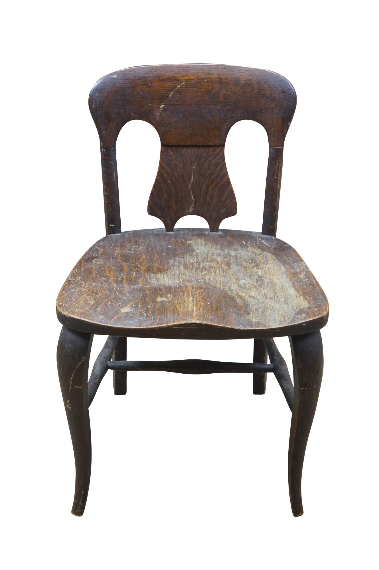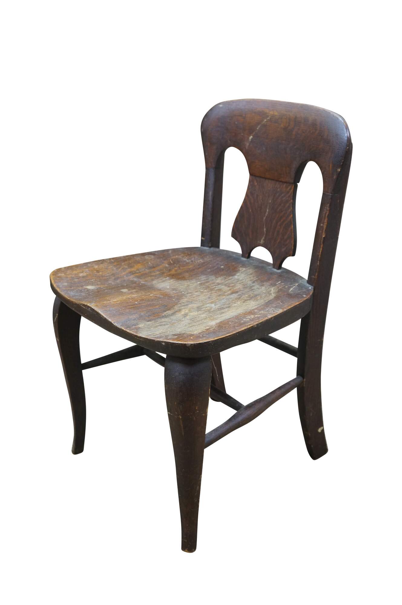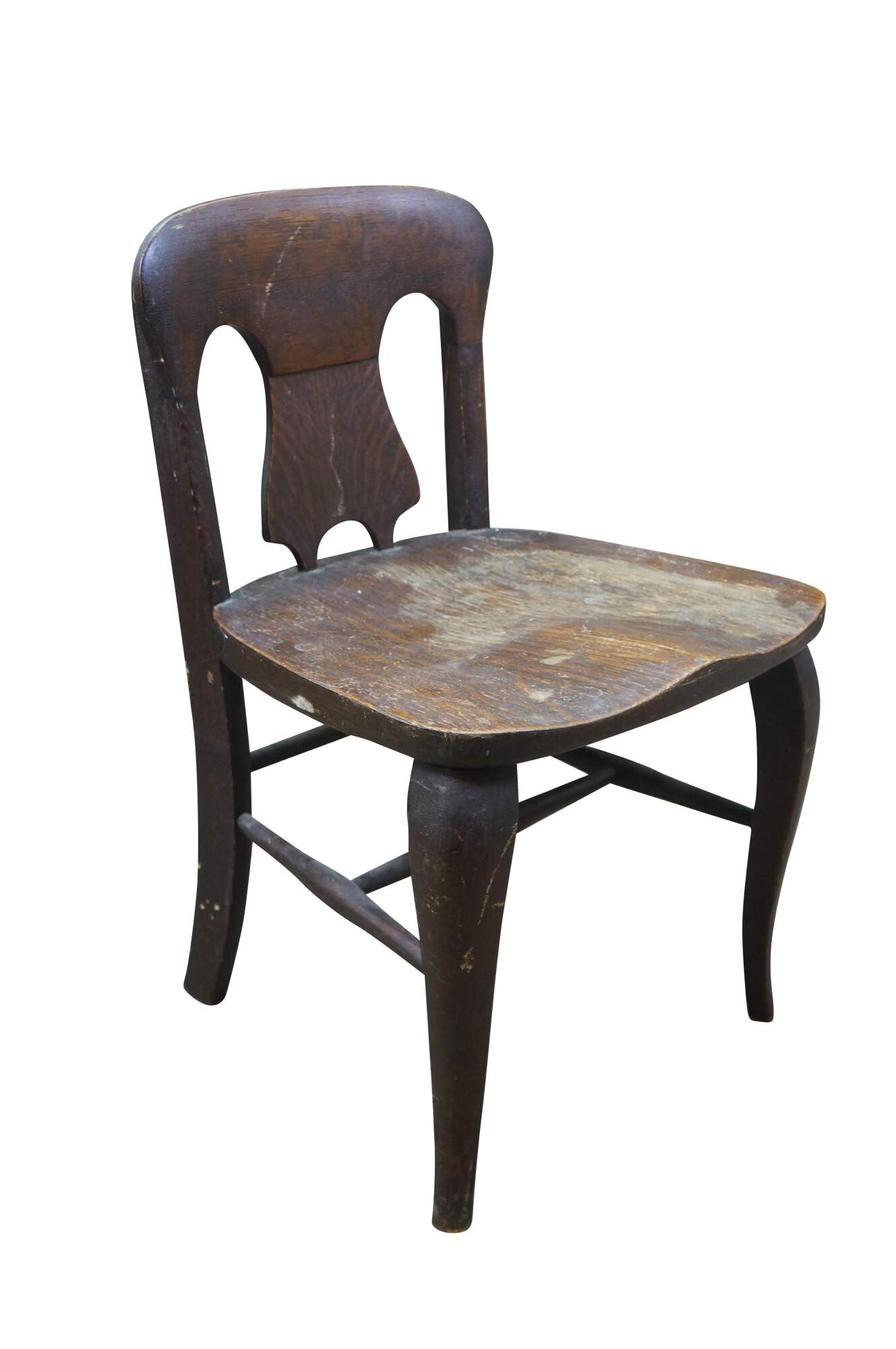 Antique Victorian child or doll sized chair. Made of quartersawn oak featuring a unique splat back design with formed seat and serpentine legs connected by turned stretchers.