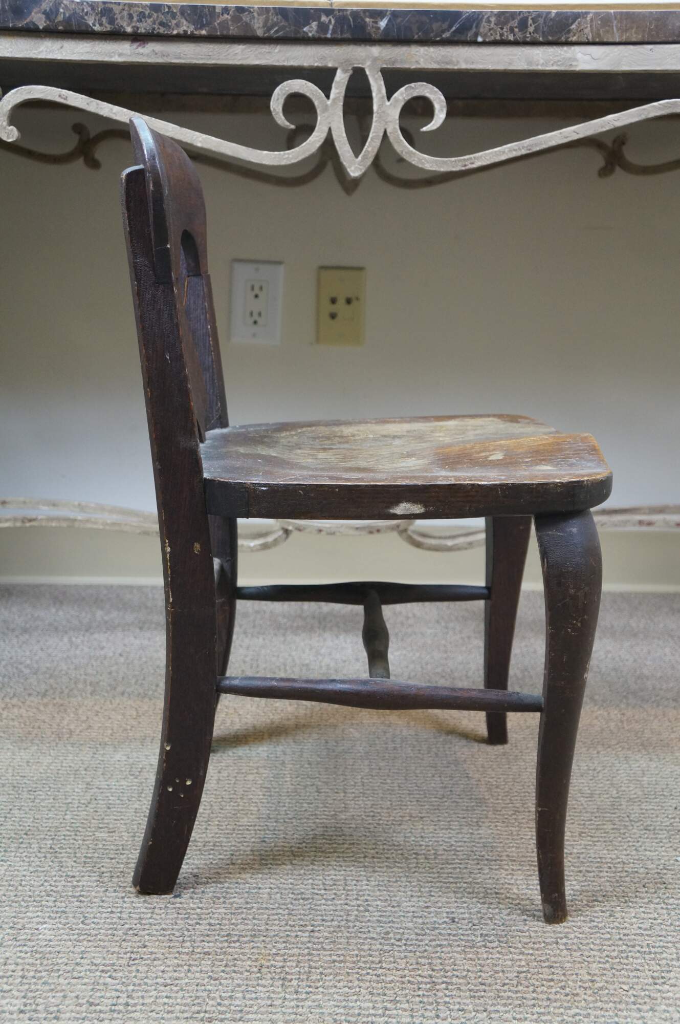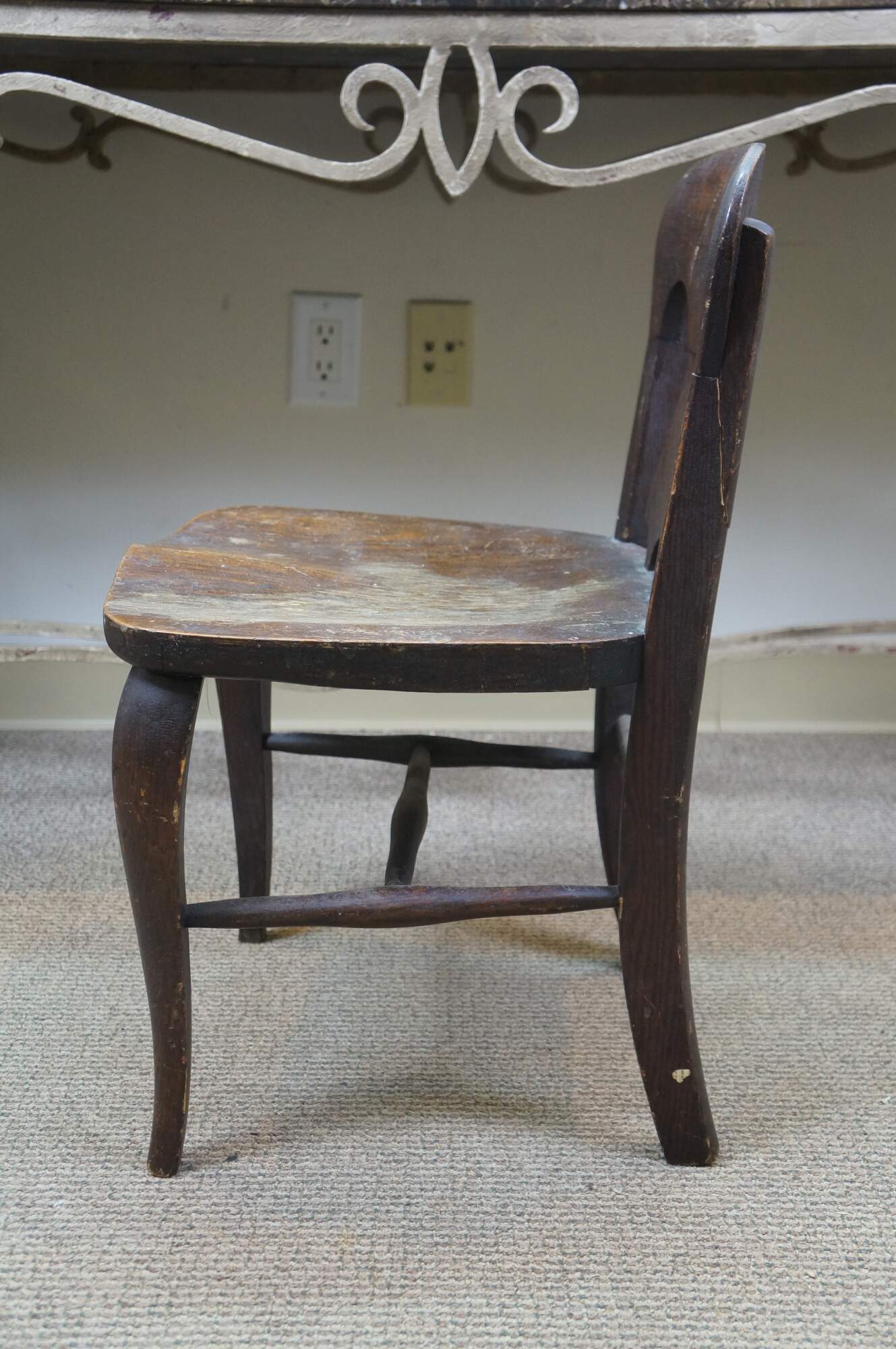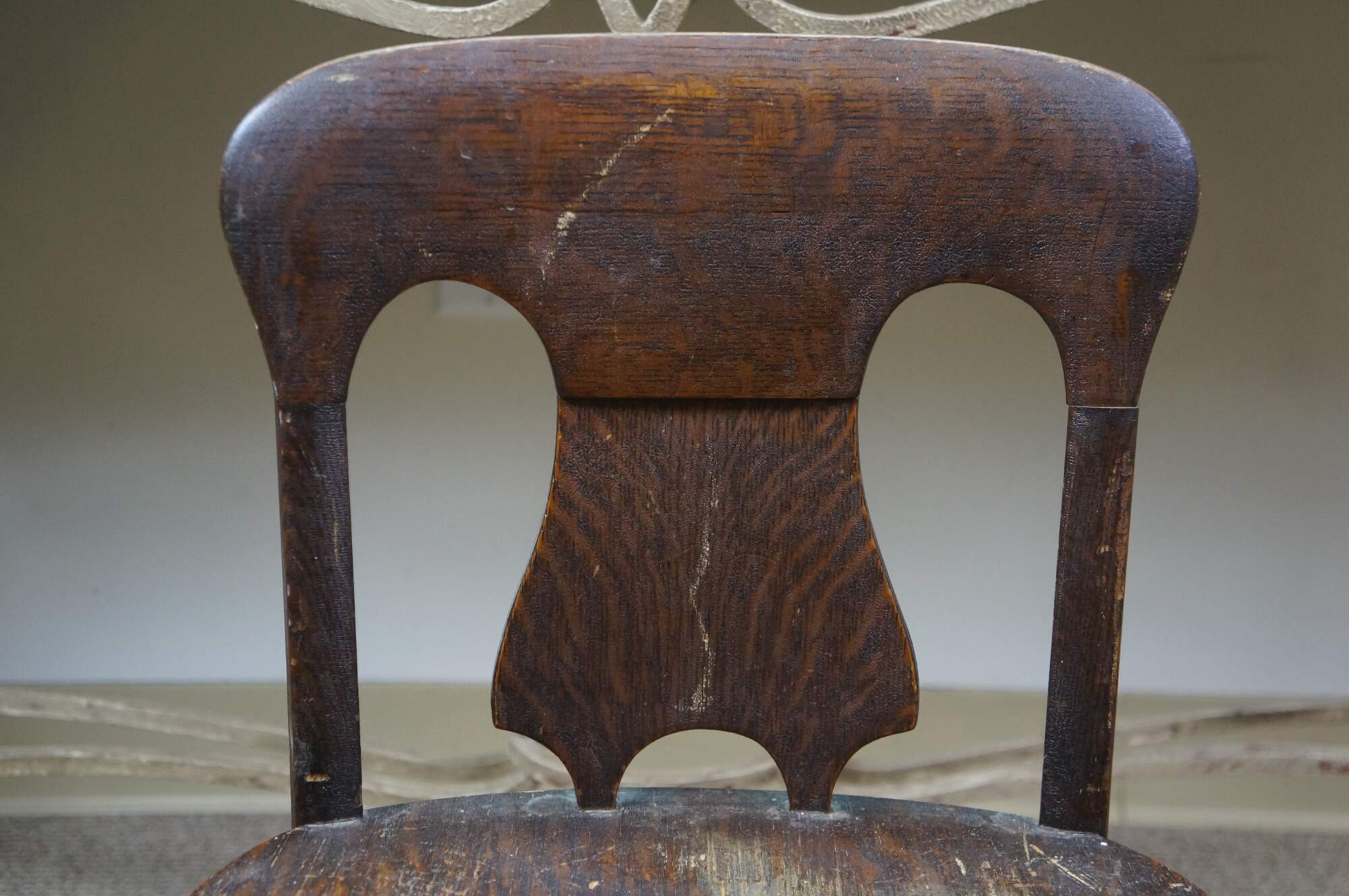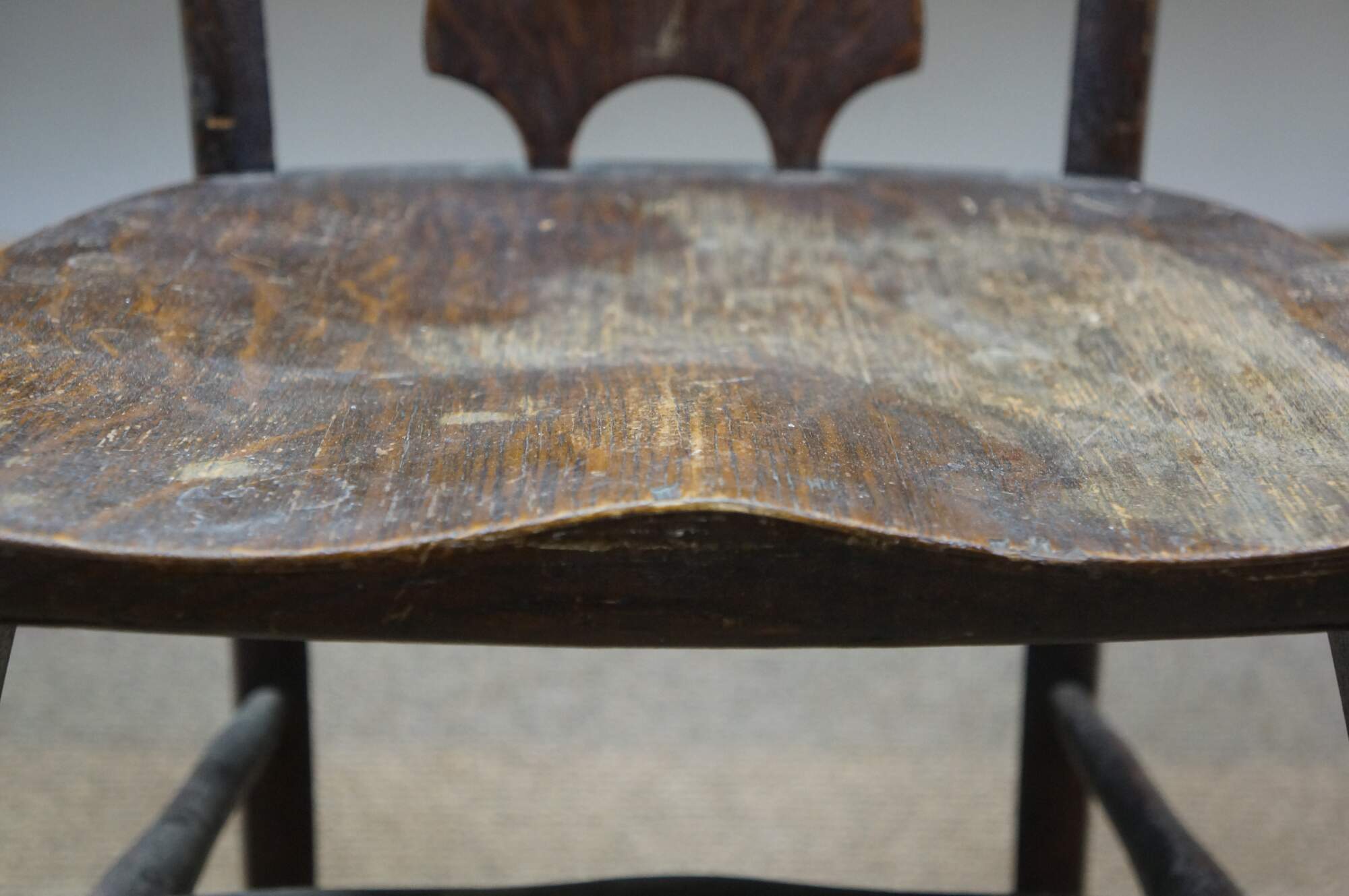 Antique Victorian child or doll sized chair. Made of quartersawn oak featuring a unique splat back design with formed seat and serpentine legs connected by turned stretchers.