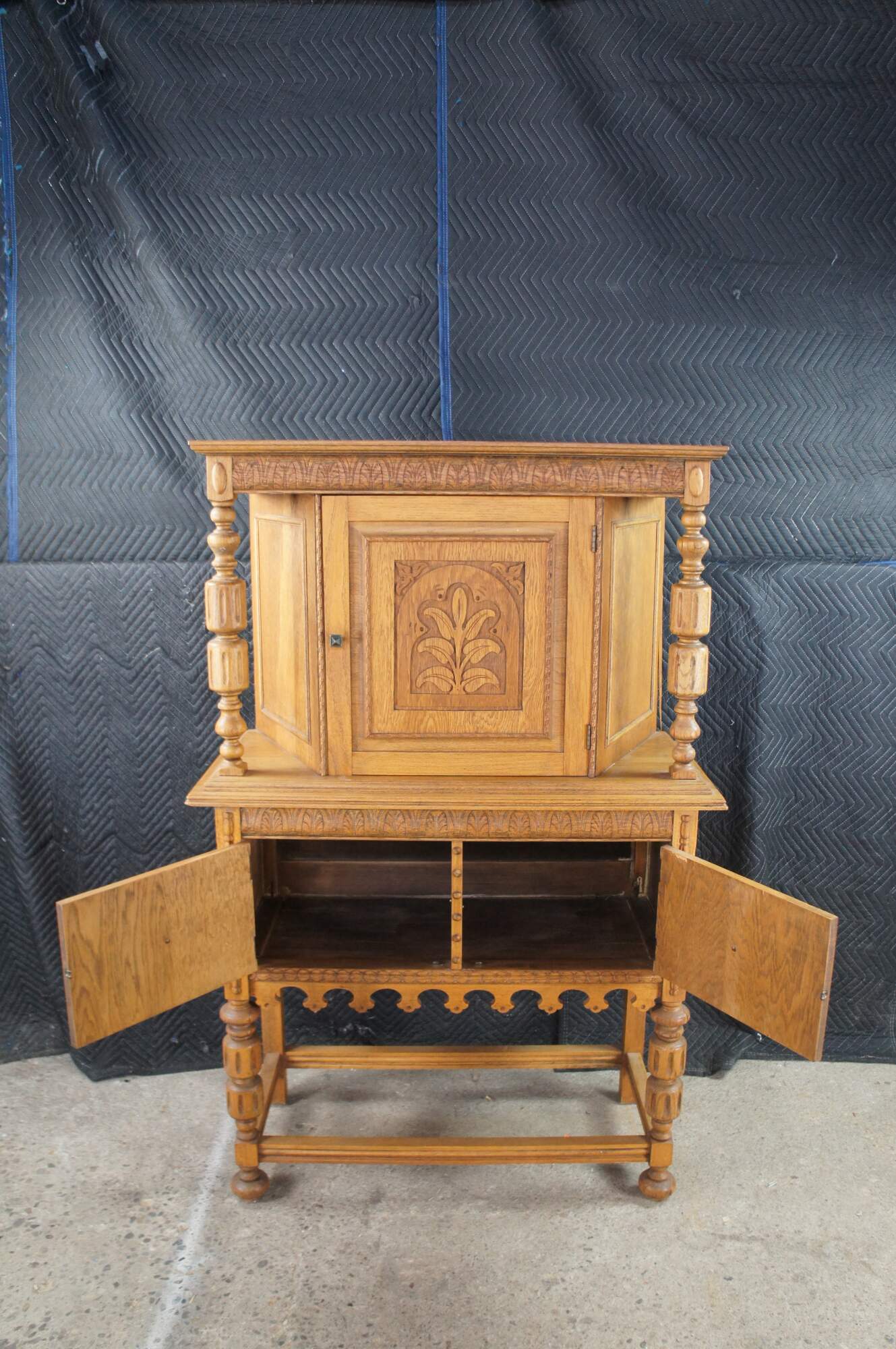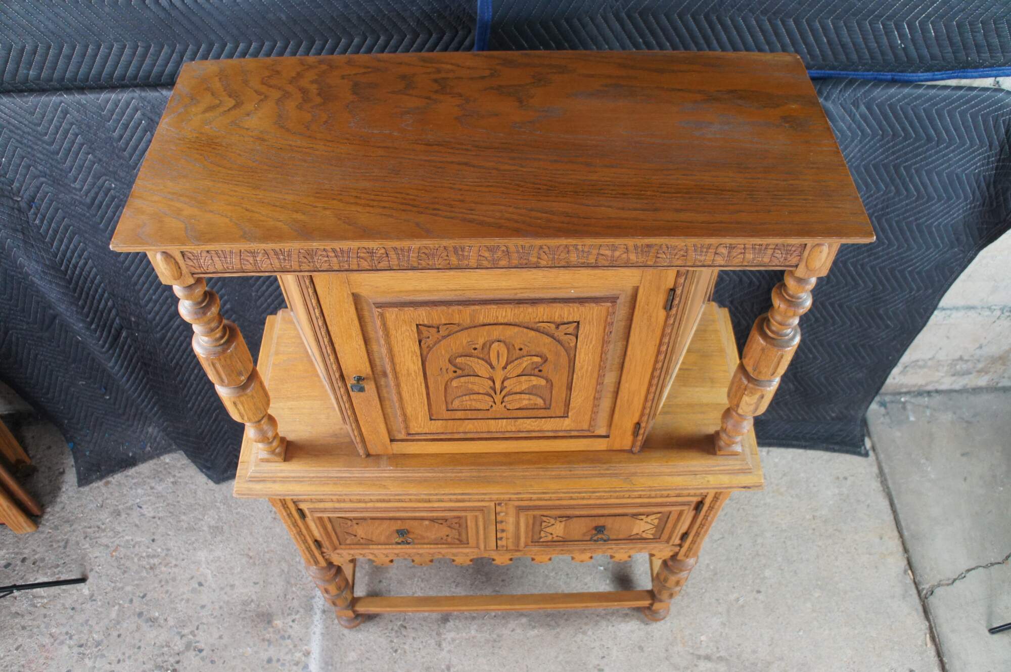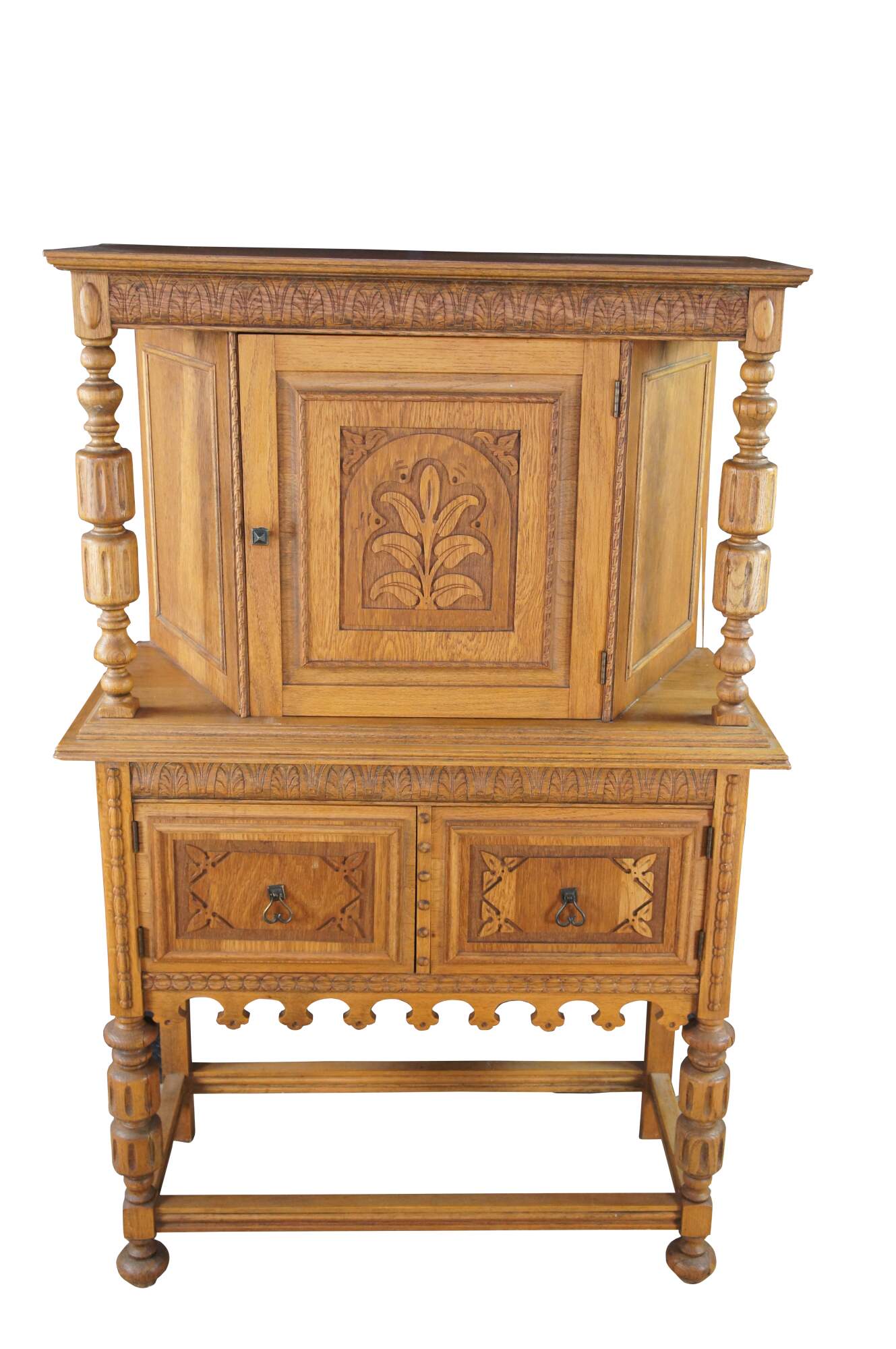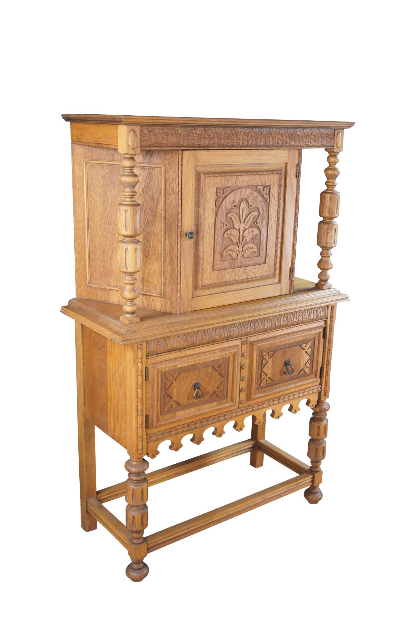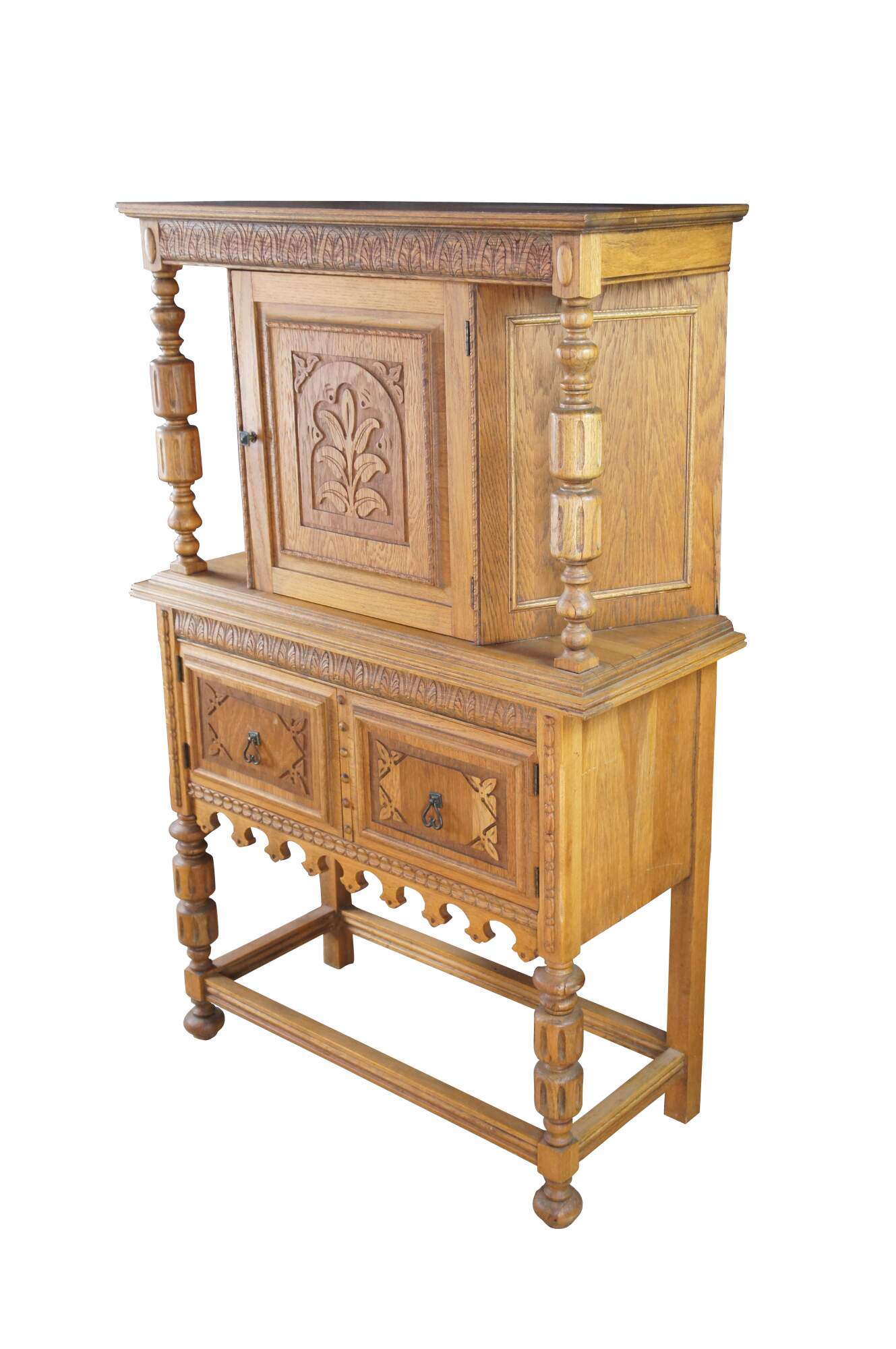 Vintage Jacobean revival court cupboard. Made from quartersawn oak with an upper hutch mounted between two beautifully turned baluster supports. Features low relief foliate / floral / acanthus carved doors and a large lower storage area. The rectangular frame is supported by baluster turned legs connected by stretcher.