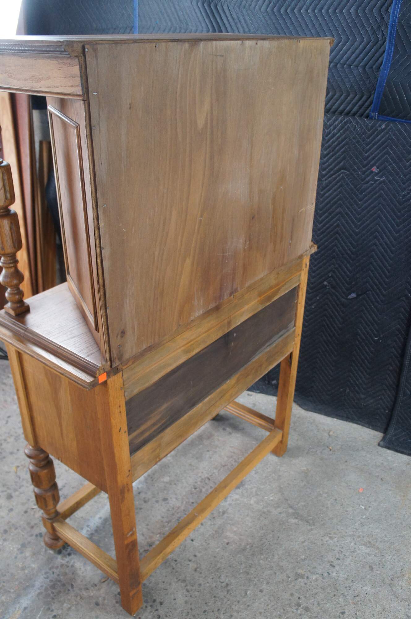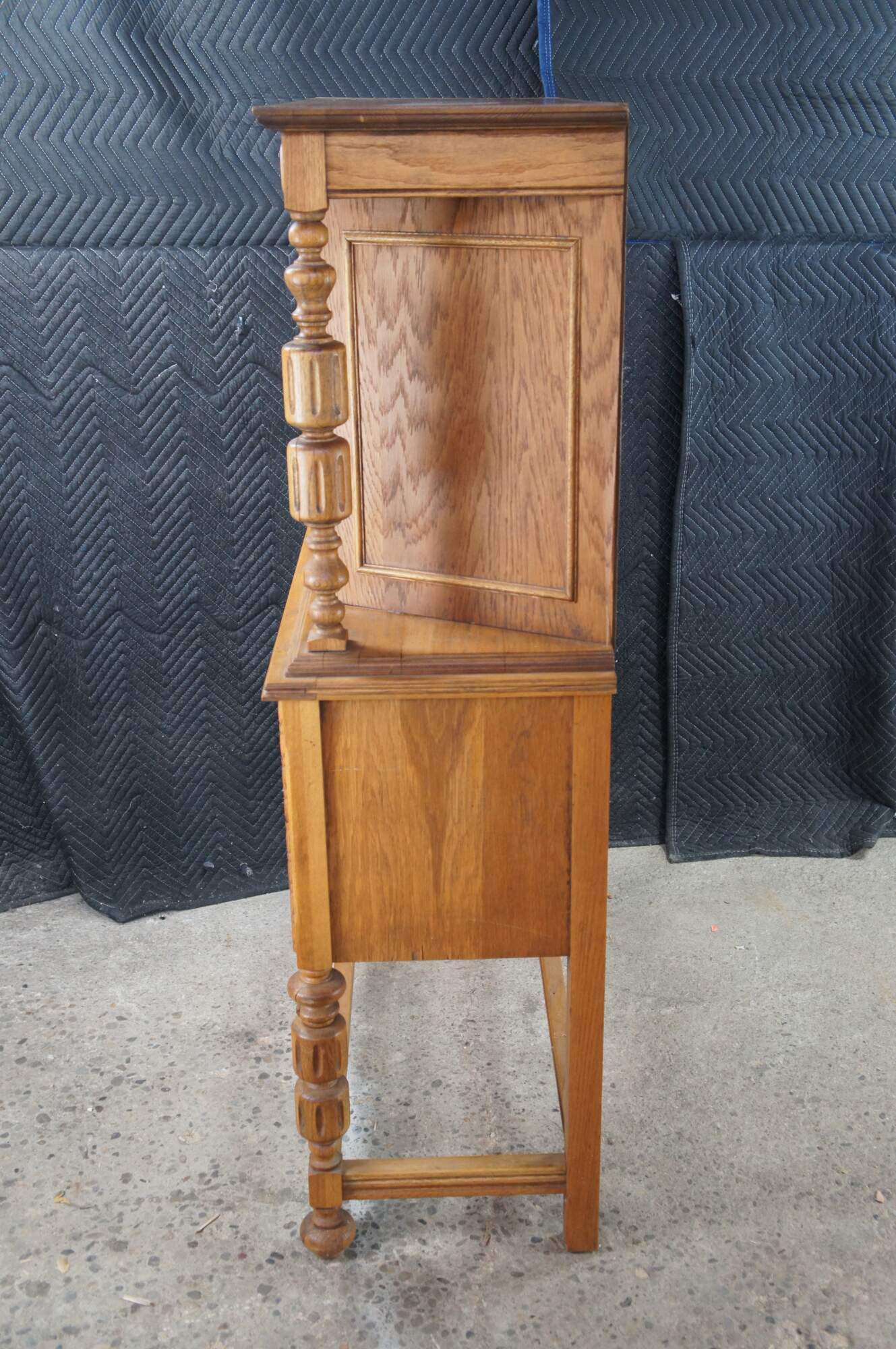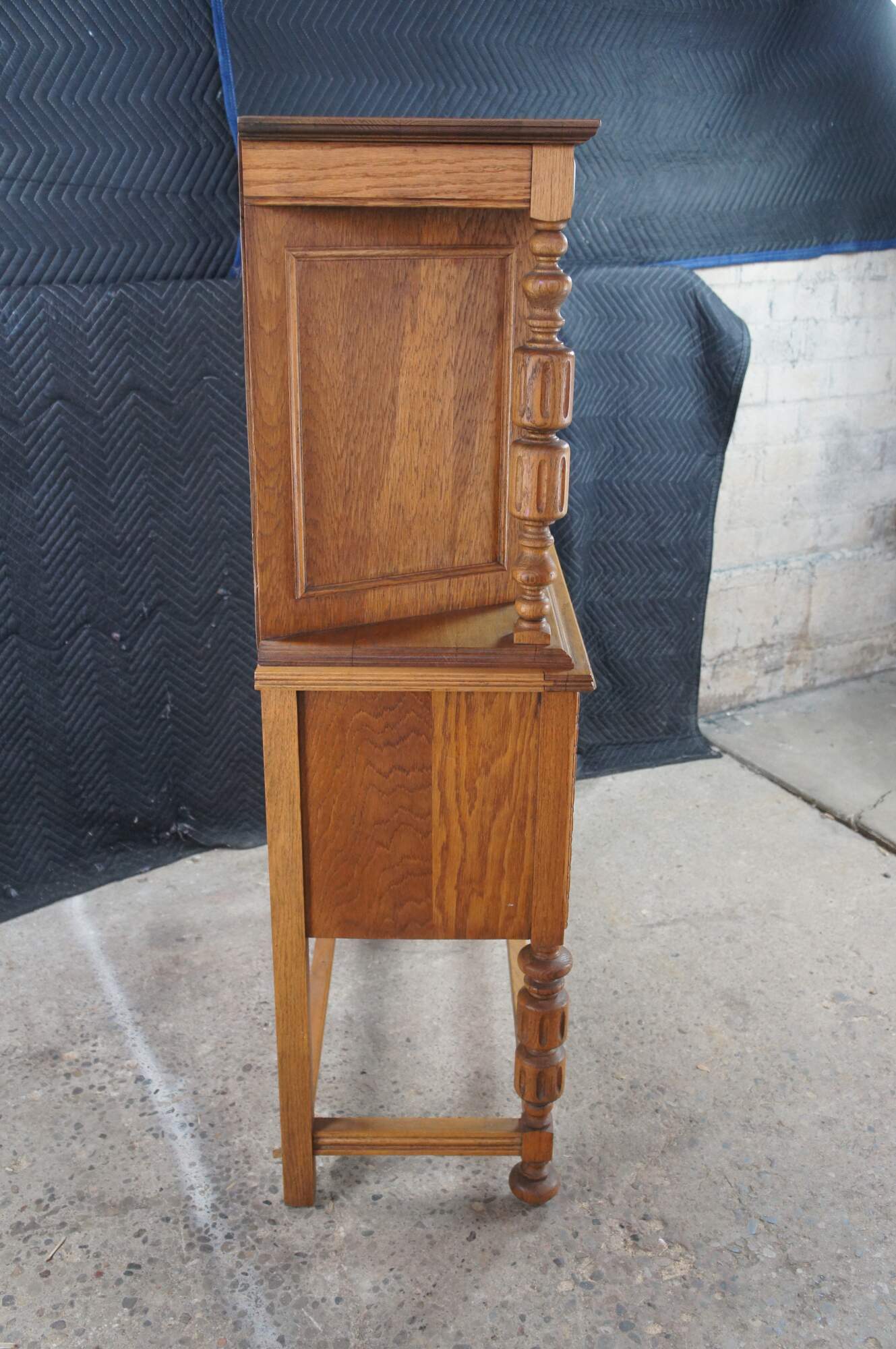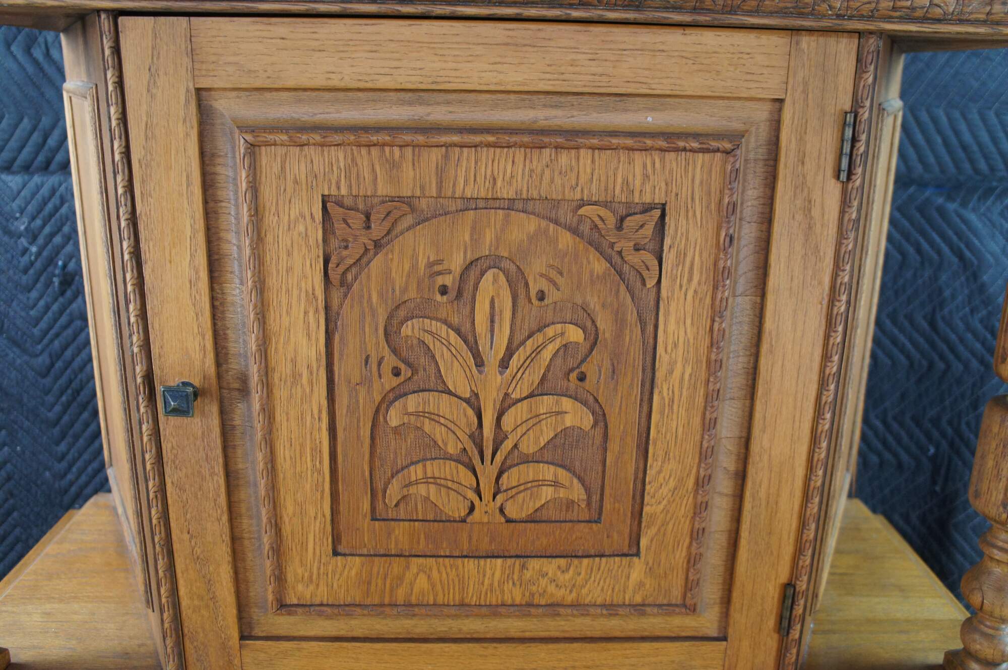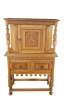 Vintage Jacobean revival court cupboard. Made from quartersawn oak with an upper hutch mounted between two beautifully turned baluster supports. Features low relief foliate / floral / acanthus carved doors and a large lower storage area. The rectangular frame is supported by baluster turned legs connected by stretcher.